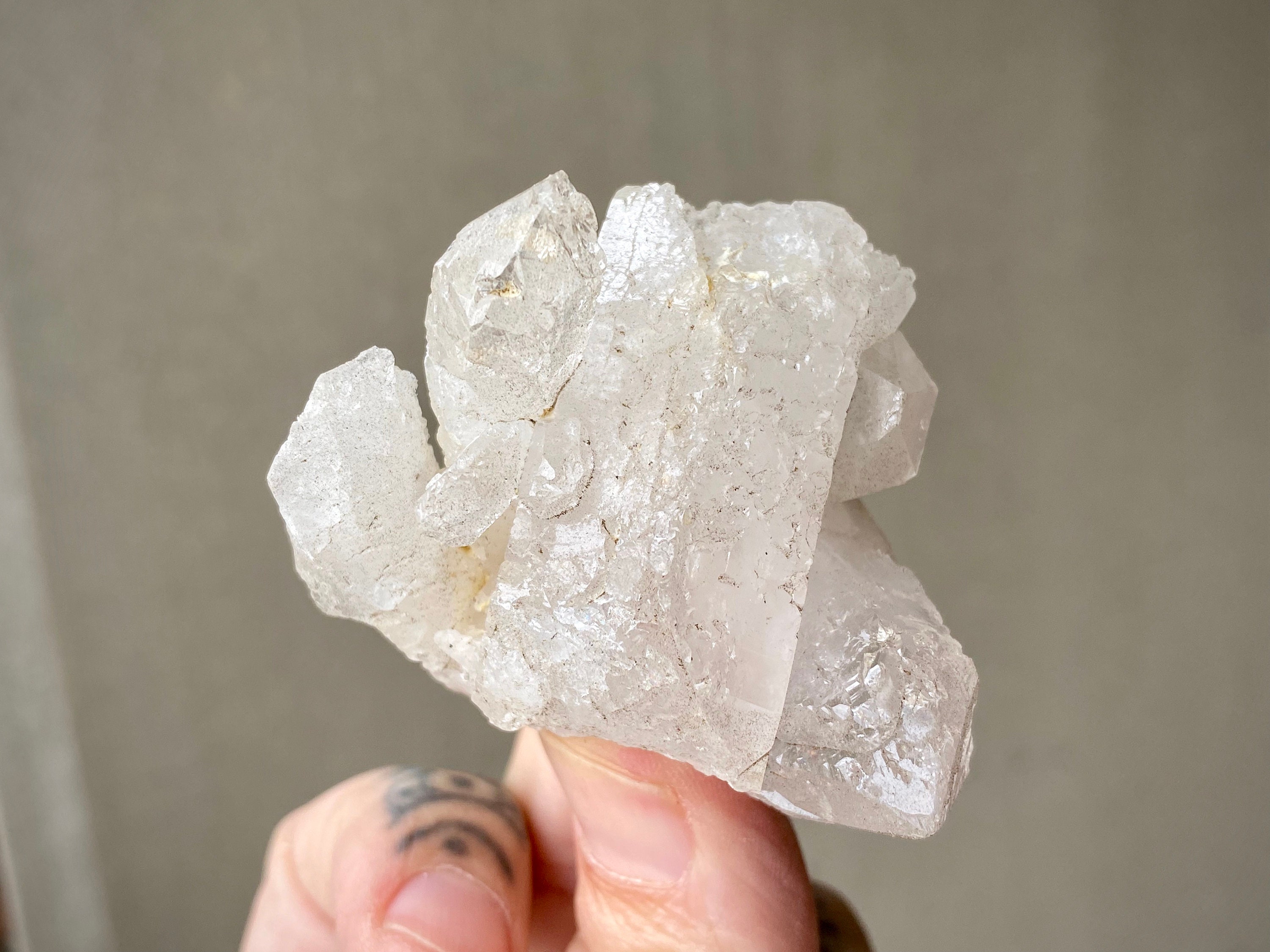 This is a beautiful Dissolution Quartz crystal cluster with lots of sparkle and beautiful textures throughout. The large crystal that lies across this cluster does not have a complete termination, though it does not appear to be damage, it appears that this was something that happened in the pocket (judging by its healed termination area). Nice terminations on the other crystals though! And a naturally flat base allows this one to sit nicely.