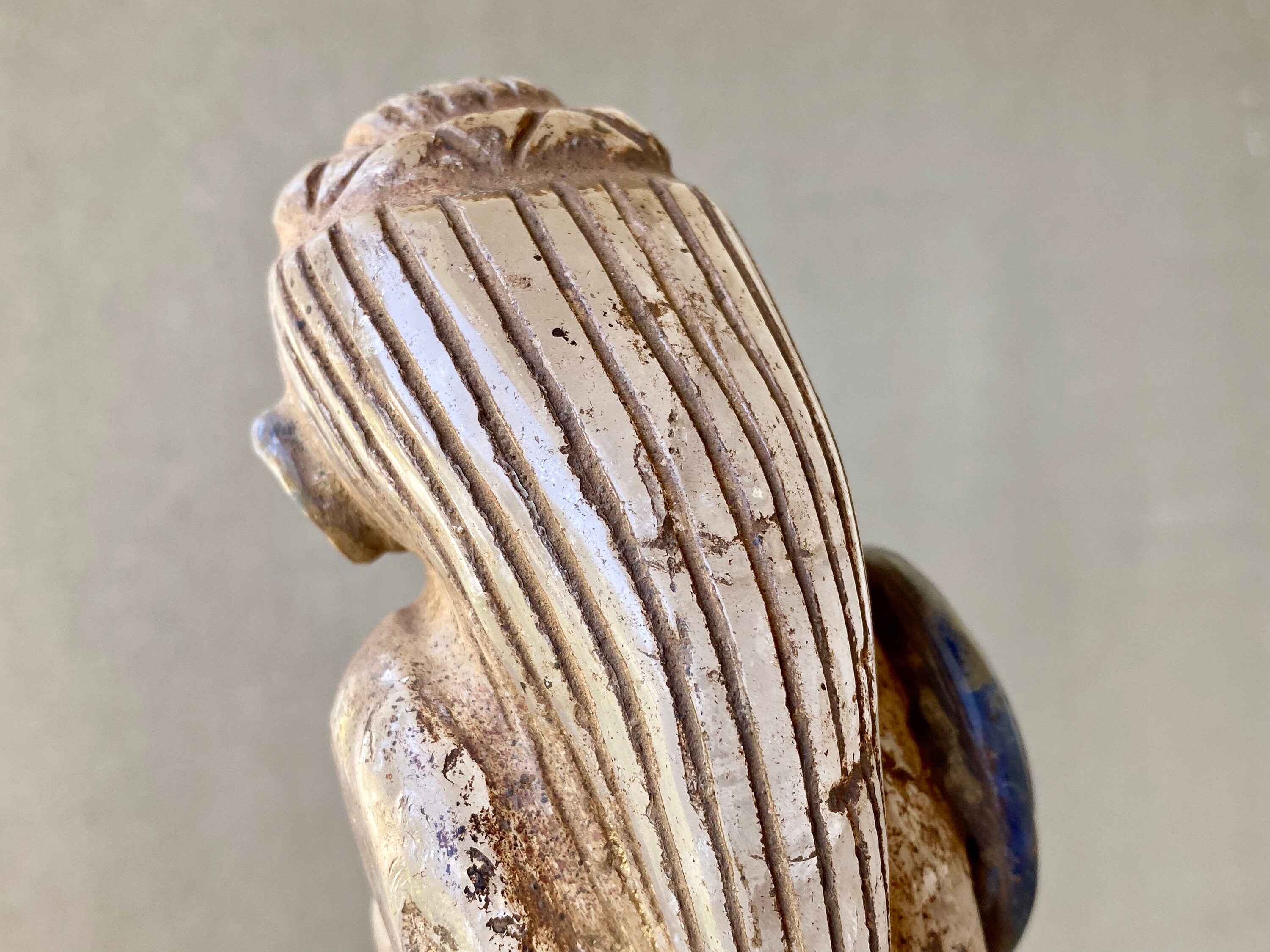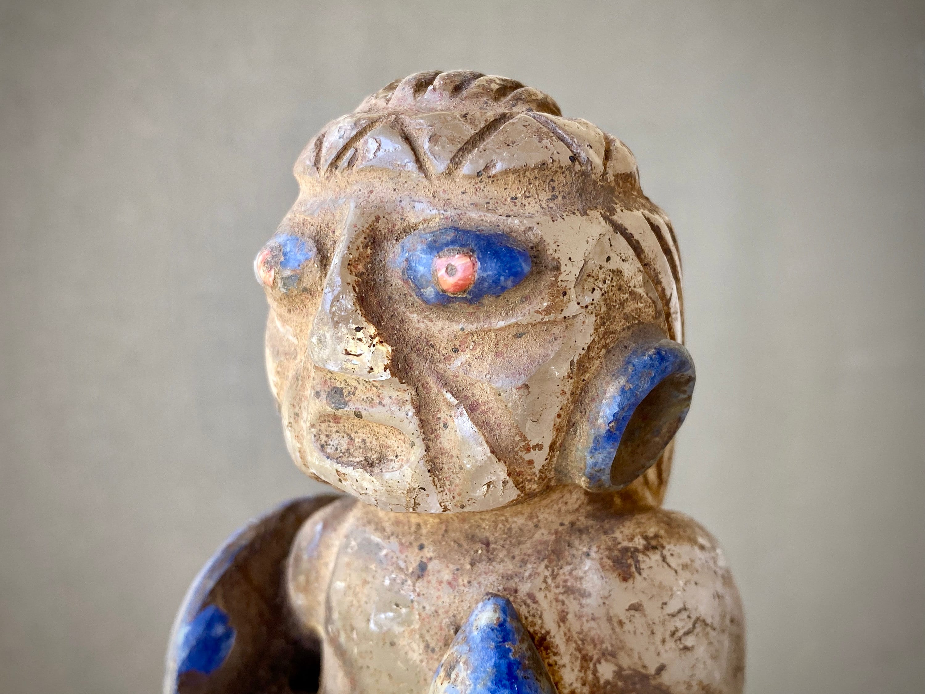 This statue is masterfully carved from solid Quartz with Sodalite adornments, and weathered to perfection to give it an ancient patina. It is a charming and magical characterization, he really comes to life in the details here. This statue stands perfectly upright on its own natural base and would make a powerful statement piece for home, meditation room or plant medicine altar.