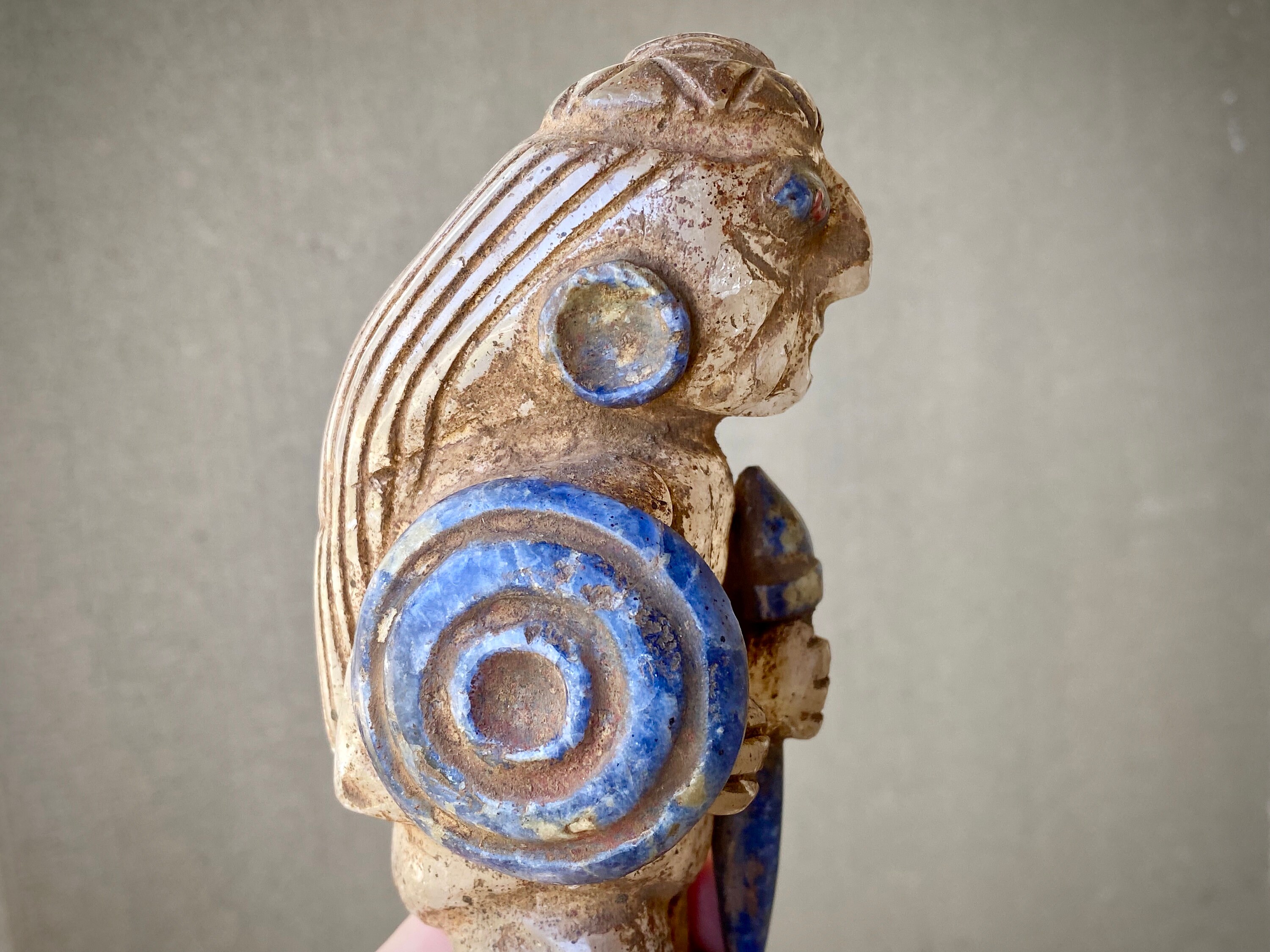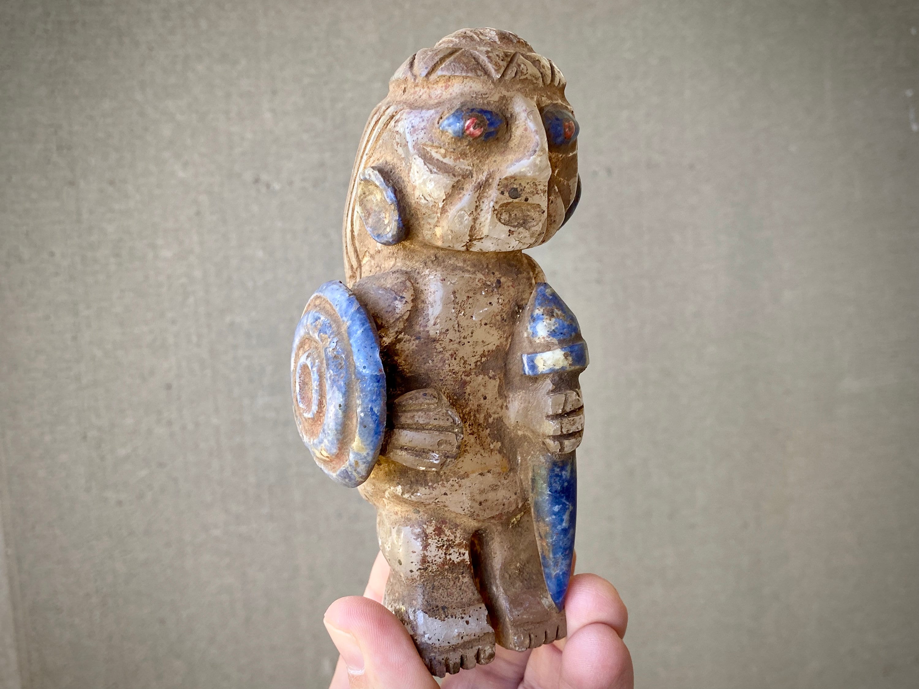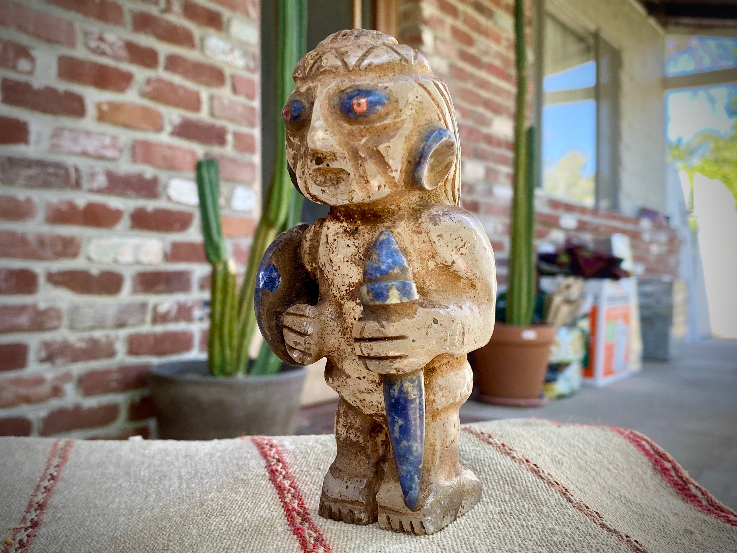 Such a powerful depiction of this fierce Incan warrior, holding a shield and scepter, and donning a crown atop his head of long hair. The scepter and crown may point to this figure being an elder or community leader. It's a really striking representation, based on actual Incan artifacts. This piece is intended to be a protector or guardian for a household or ceremony space.