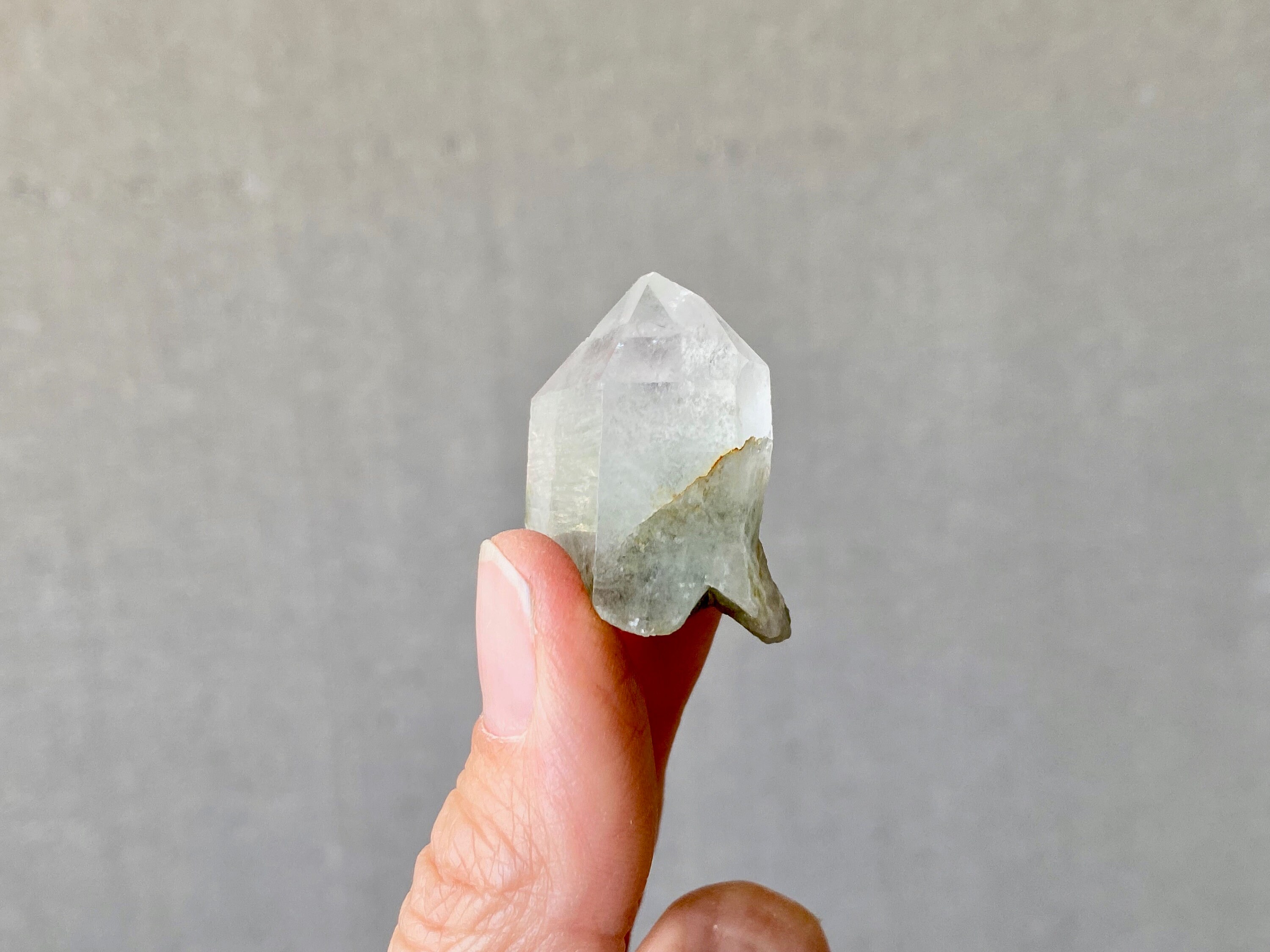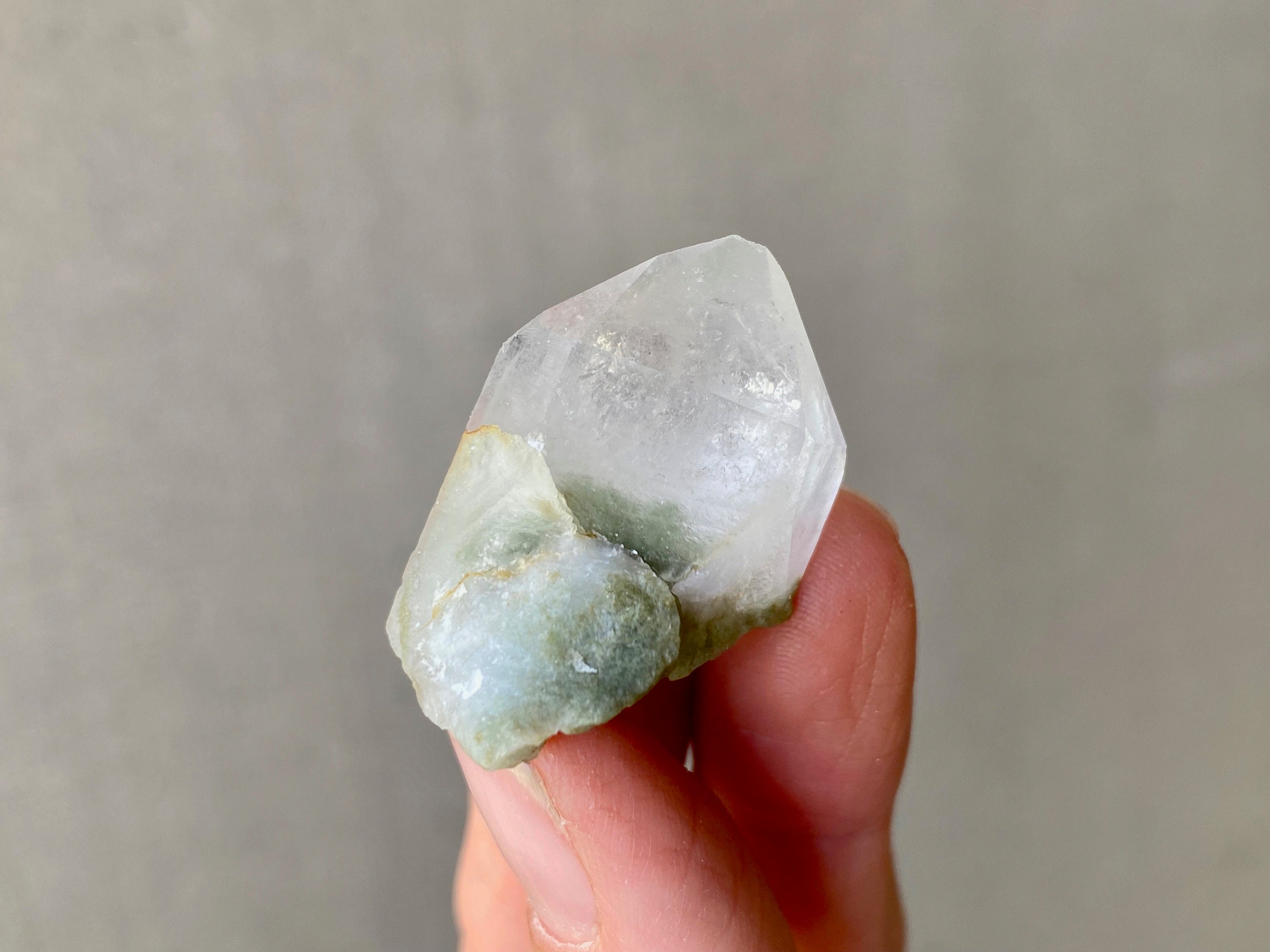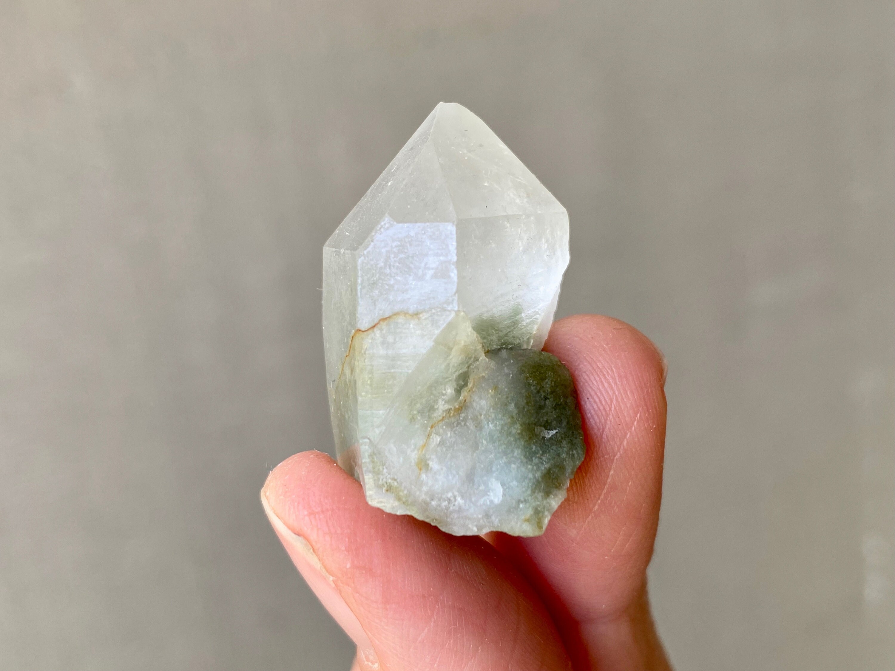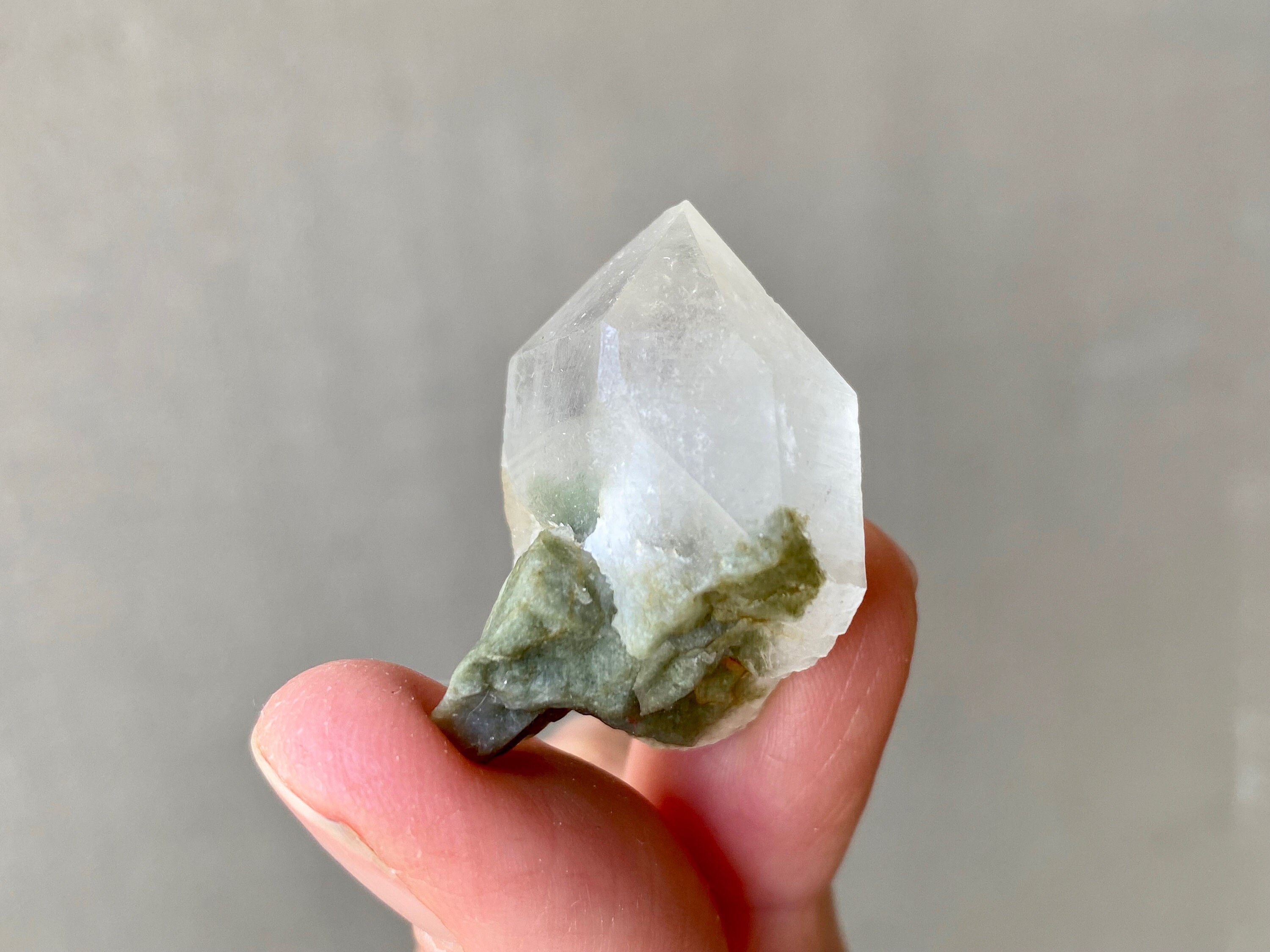 This crystal has a tiny Green Chlorite tail! The inclusion not only creates a small phantom inside the crystal point, but extends outside as well. Crystal is a bit frosty/opaque, and has an excellent termination.