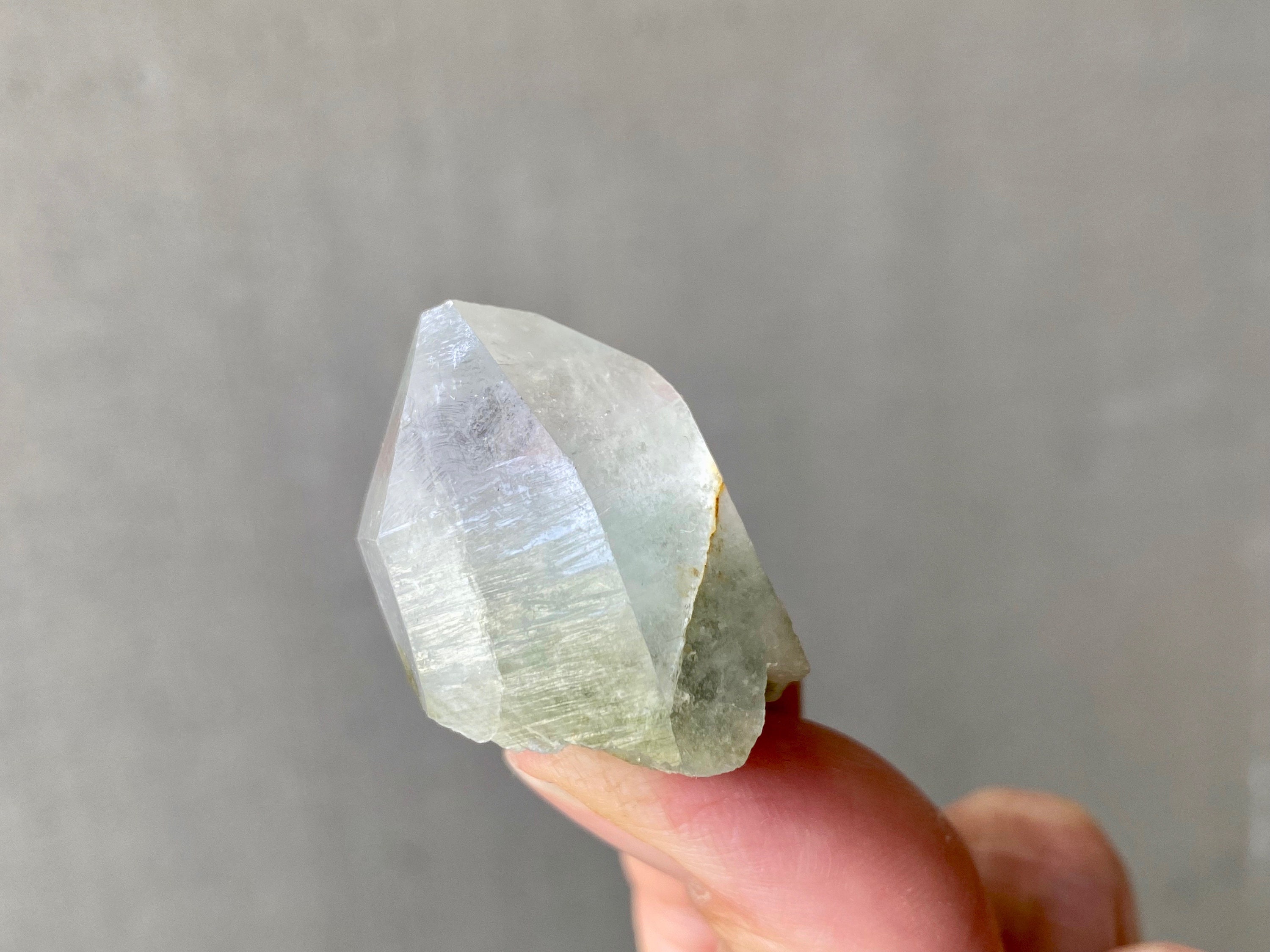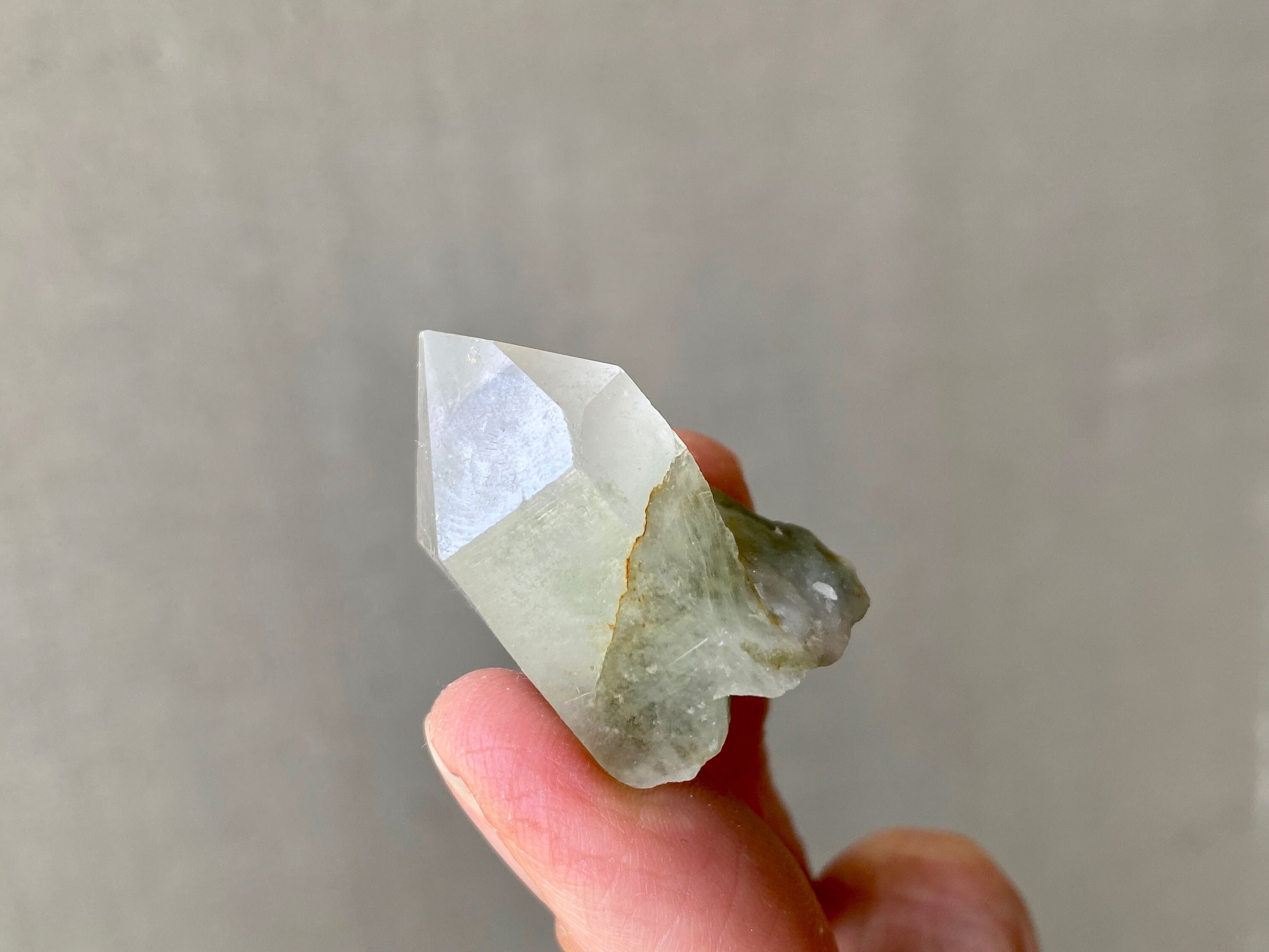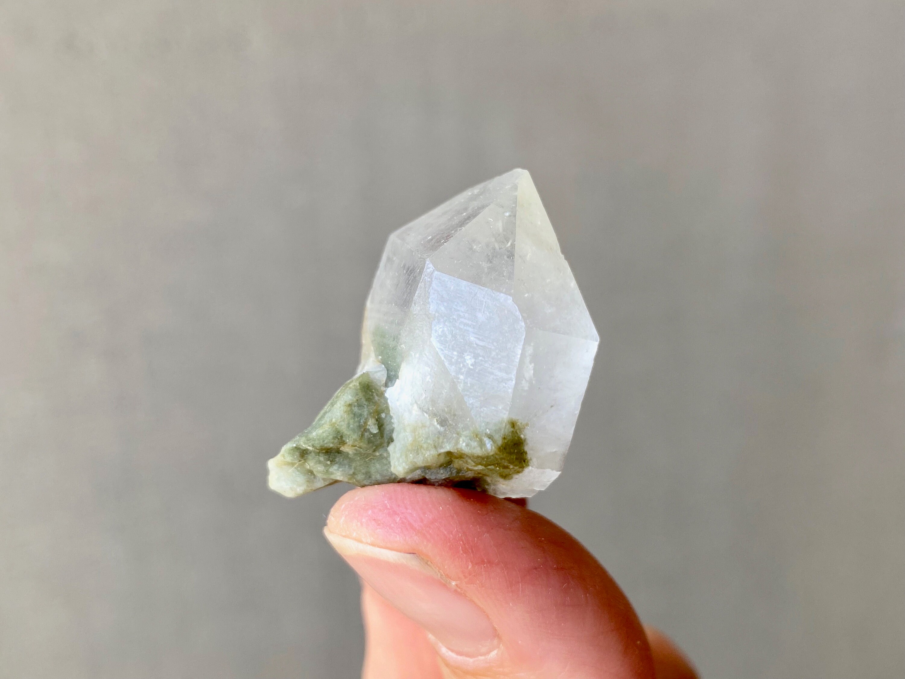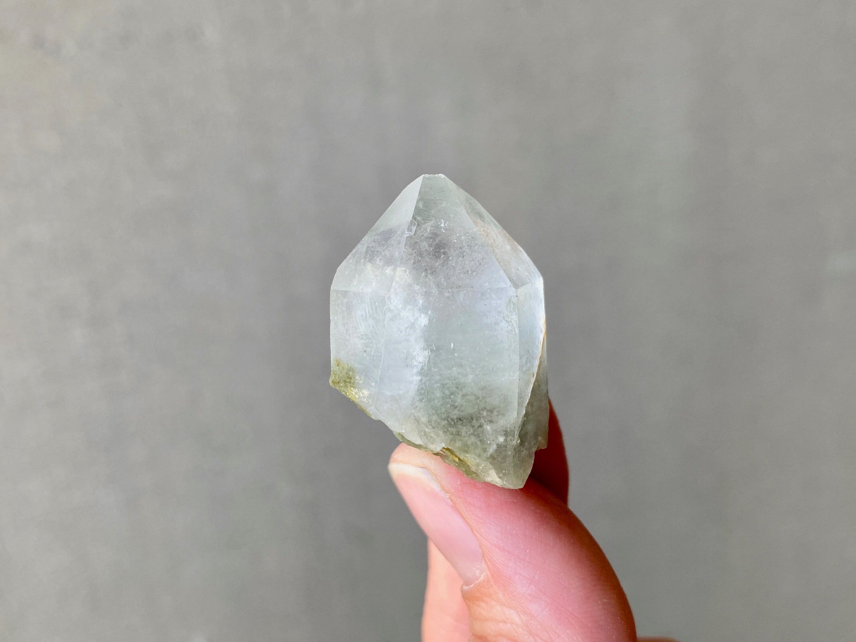 This crystal has a tiny Green Chlorite tail! The inclusion not only creates a small phantom inside the crystal point, but extends outside as well. Crystal is a bit frosty/opaque, and has an excellent termination.