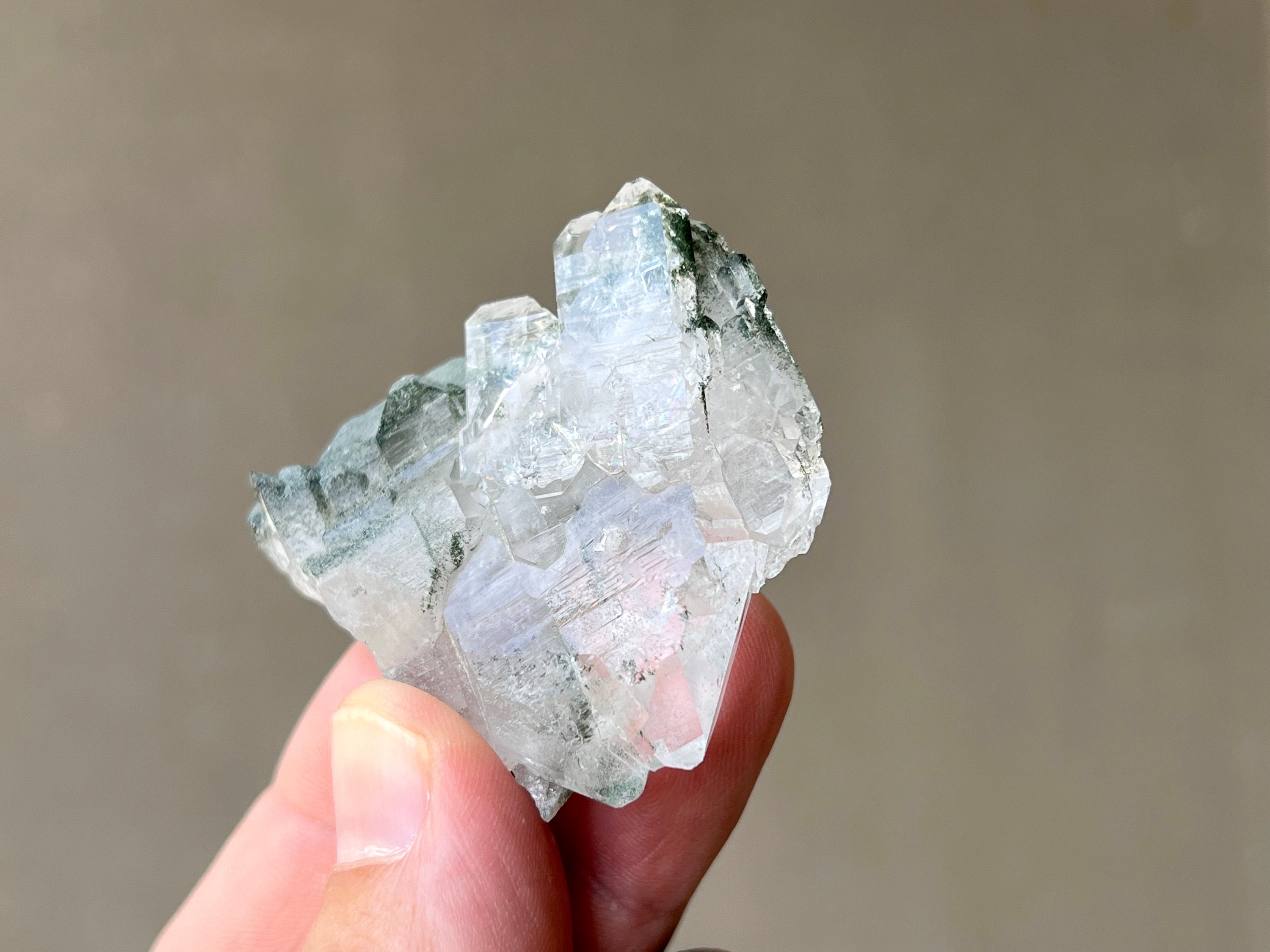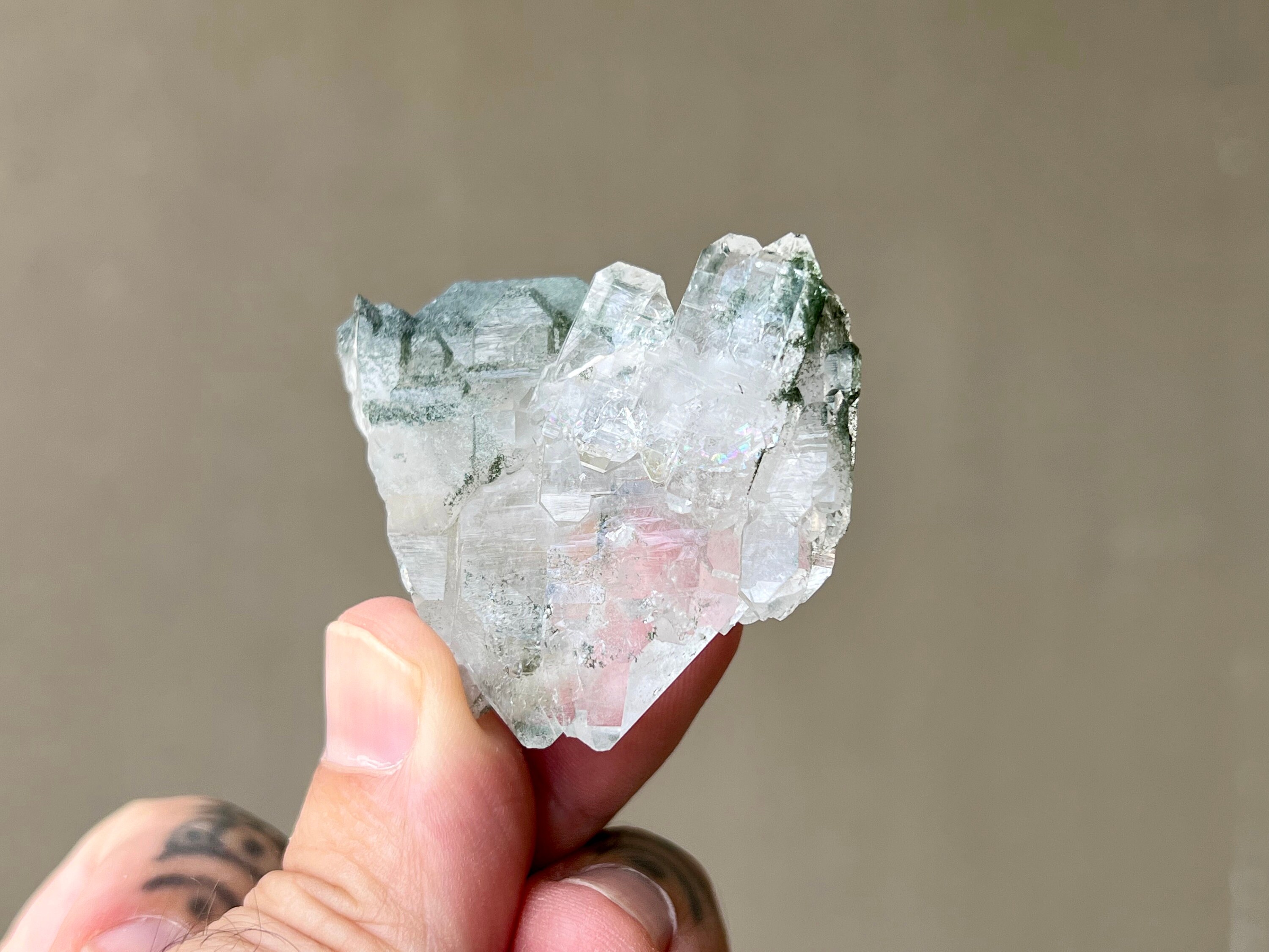 Such an awesome and unique crystal! This is an unusually shaped tabular ("tabby") crystal with a cloudy, but distinctive, Faden Line running through it. The quartz itself has marvelous clarity and luster, and you may even see a mild rainbow here as well! The Green Chlorite is included within the crystal and in some areas "frosted" on the exterior. Beautifully double terminated with excellent terminations all around.