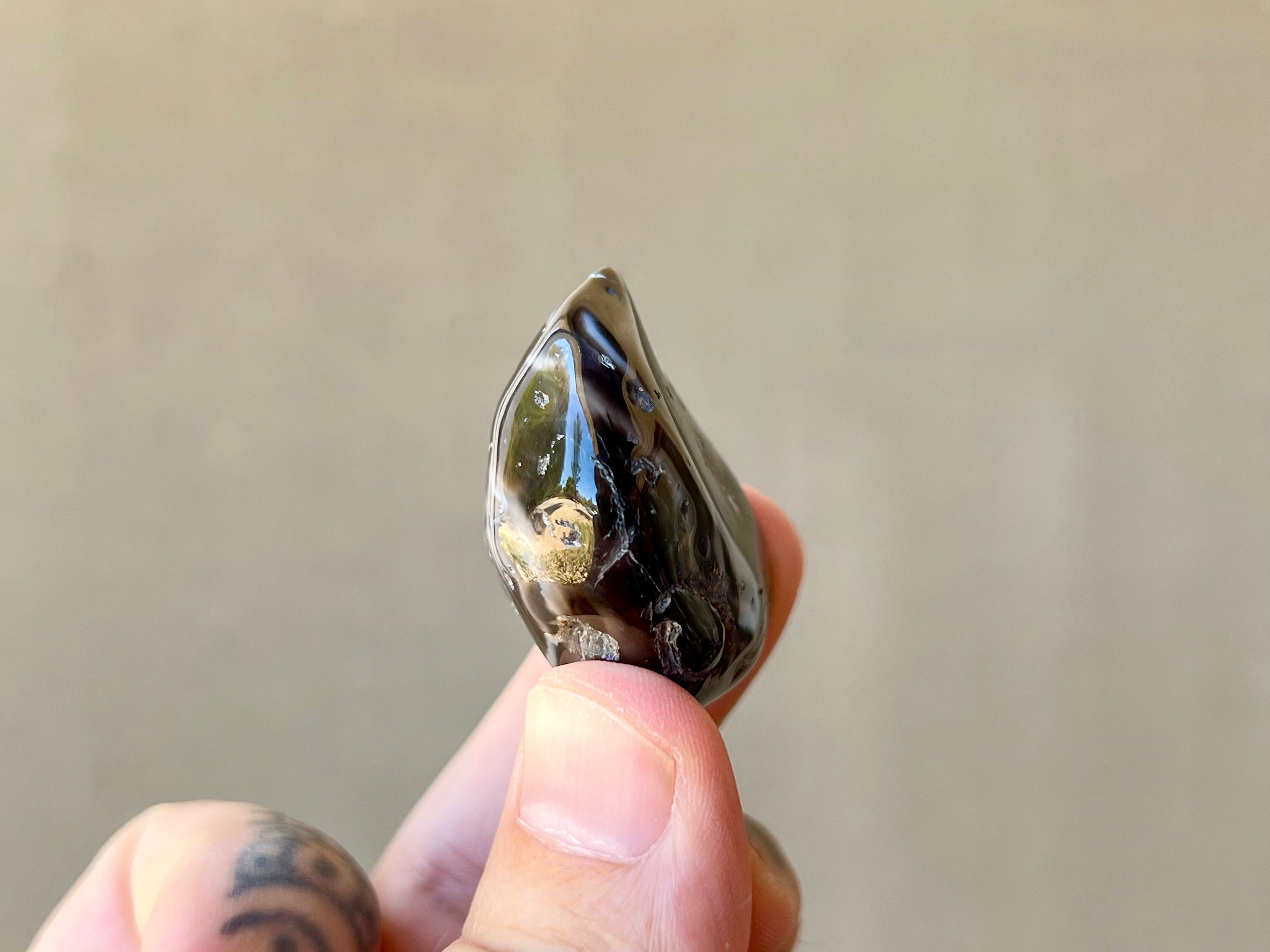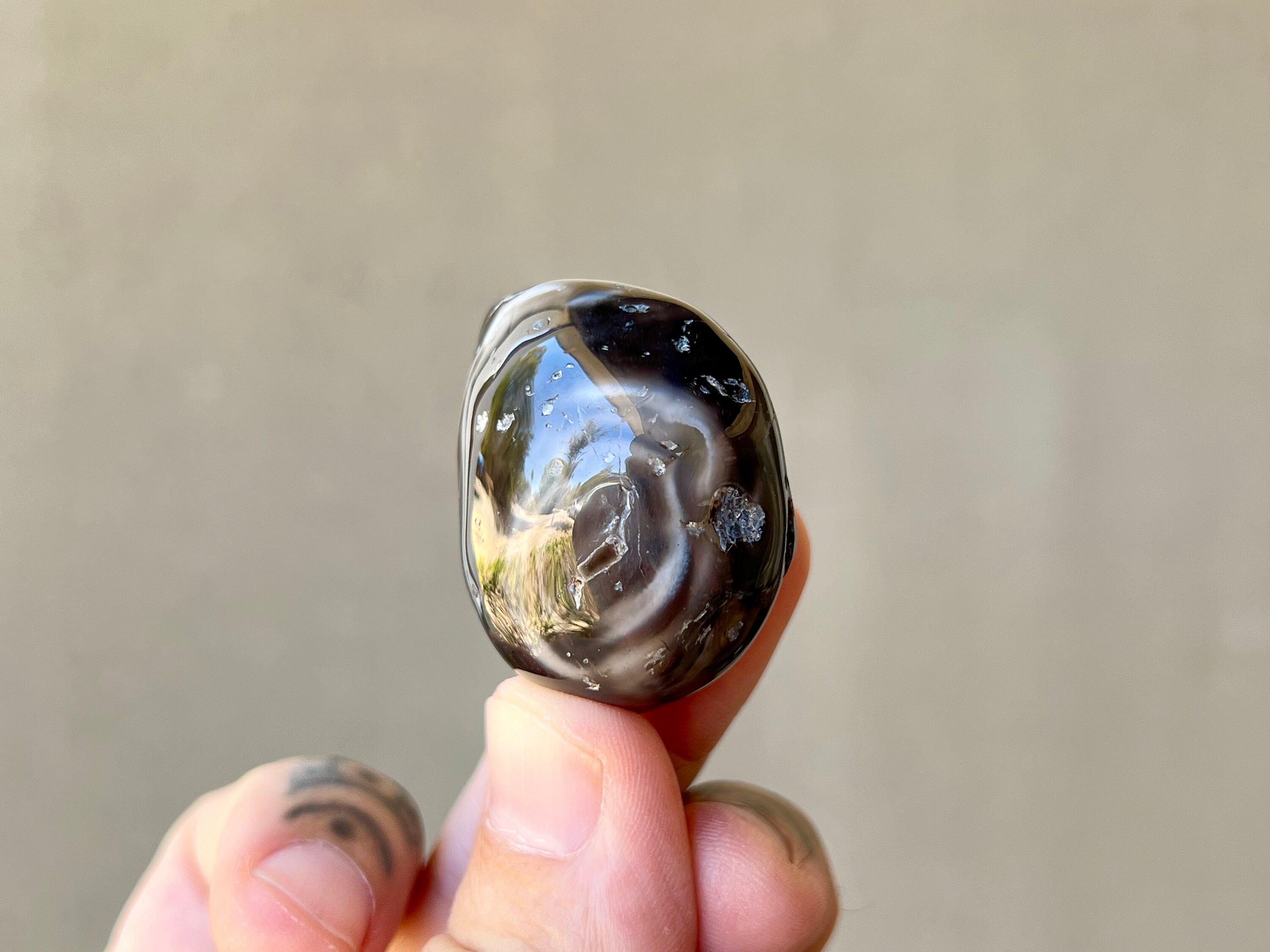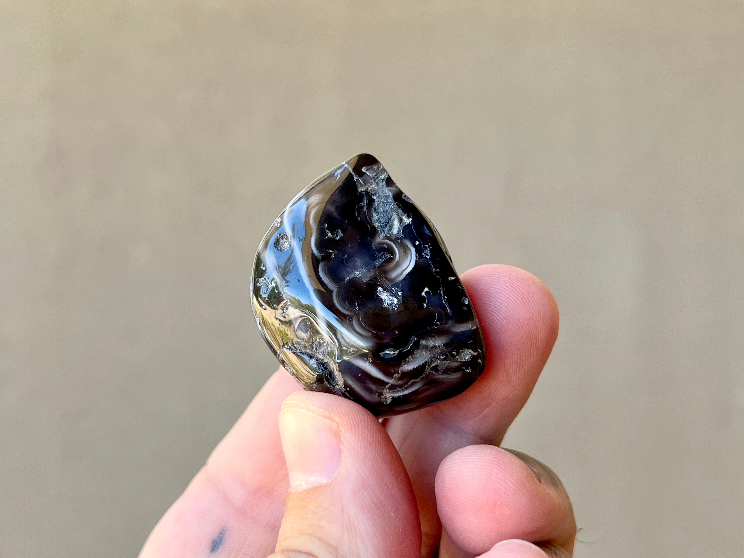 So super sweet! This is one of the few black Enhydro Agates we have from this collection, with lovely swirling white marbled patterning. This aquatic Agate is absolutely FULL of water, and when backlit you can see the water movement (the video doesn't capture it too well -- it will be much more evident in person). Very pretty and so unique.