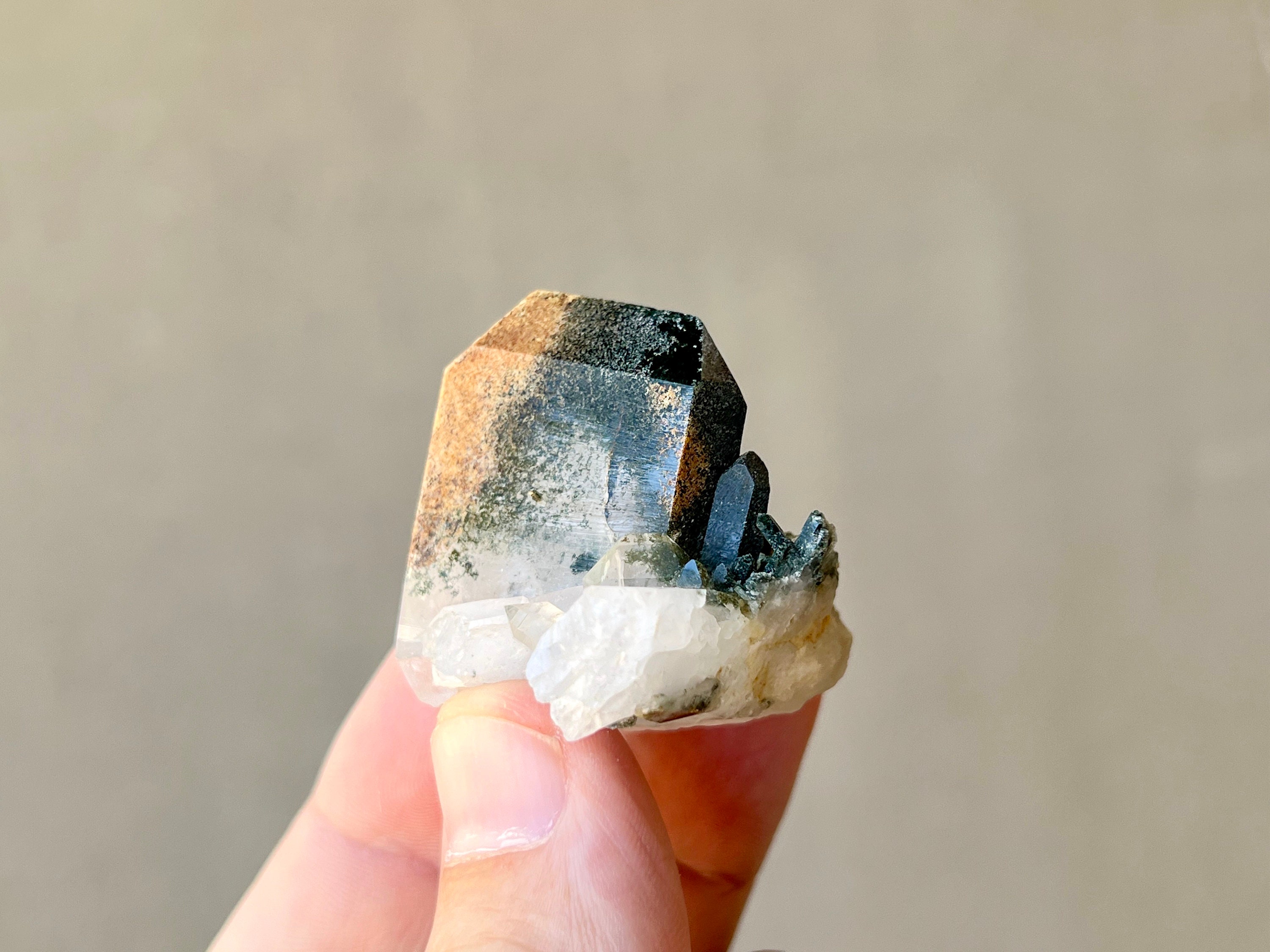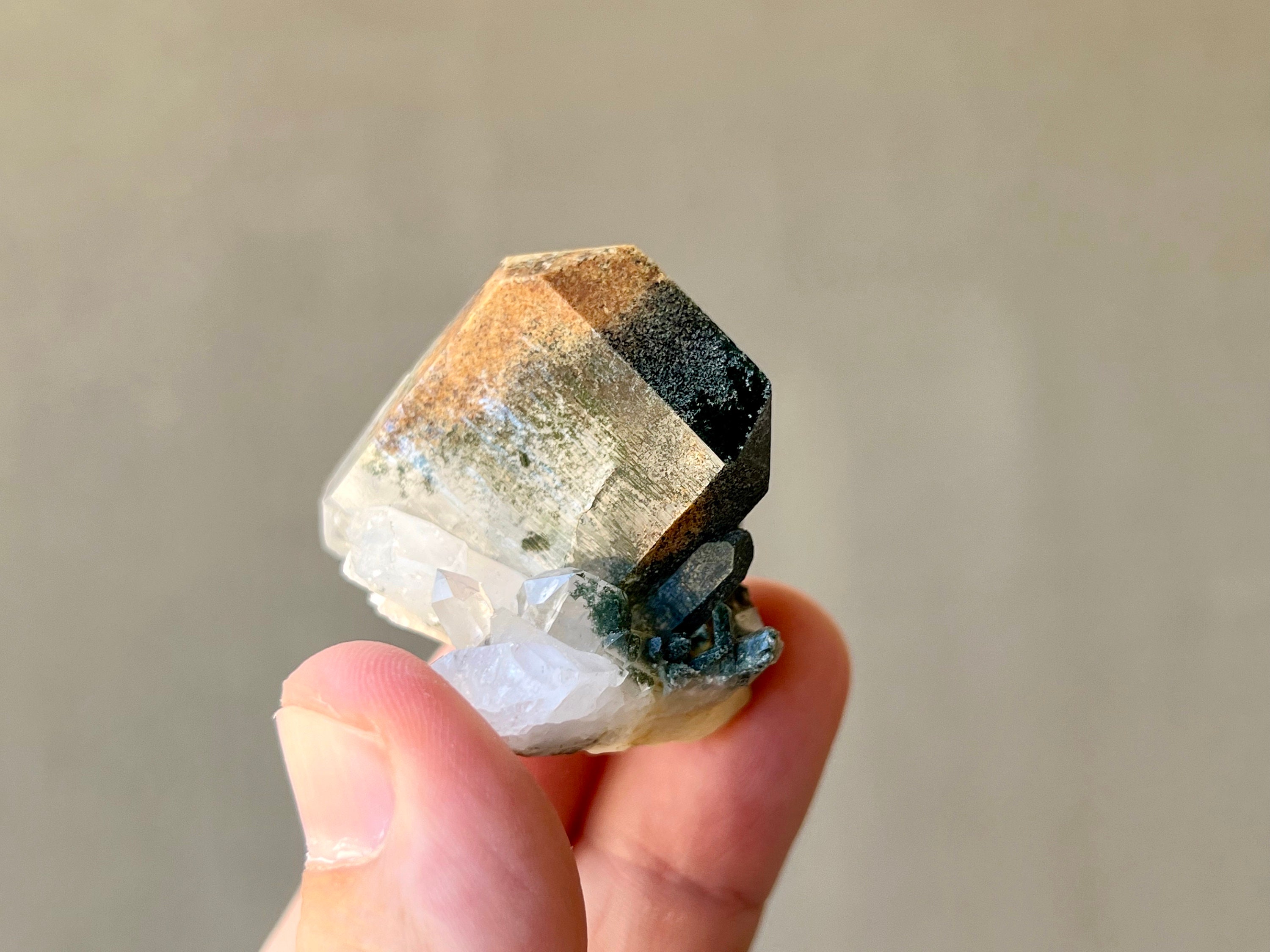 Such an awesome and unique crystal! This is a superb Tabby (Tabular) Quartz crystal with a very dark inclusion of Green Chlorite in the termination area. Amazing luster to this piece, and it also has a bit of a natural quartz "platform" attached at the base that allows this piece to sit upright on its own. Excellent quality and awesome termination.