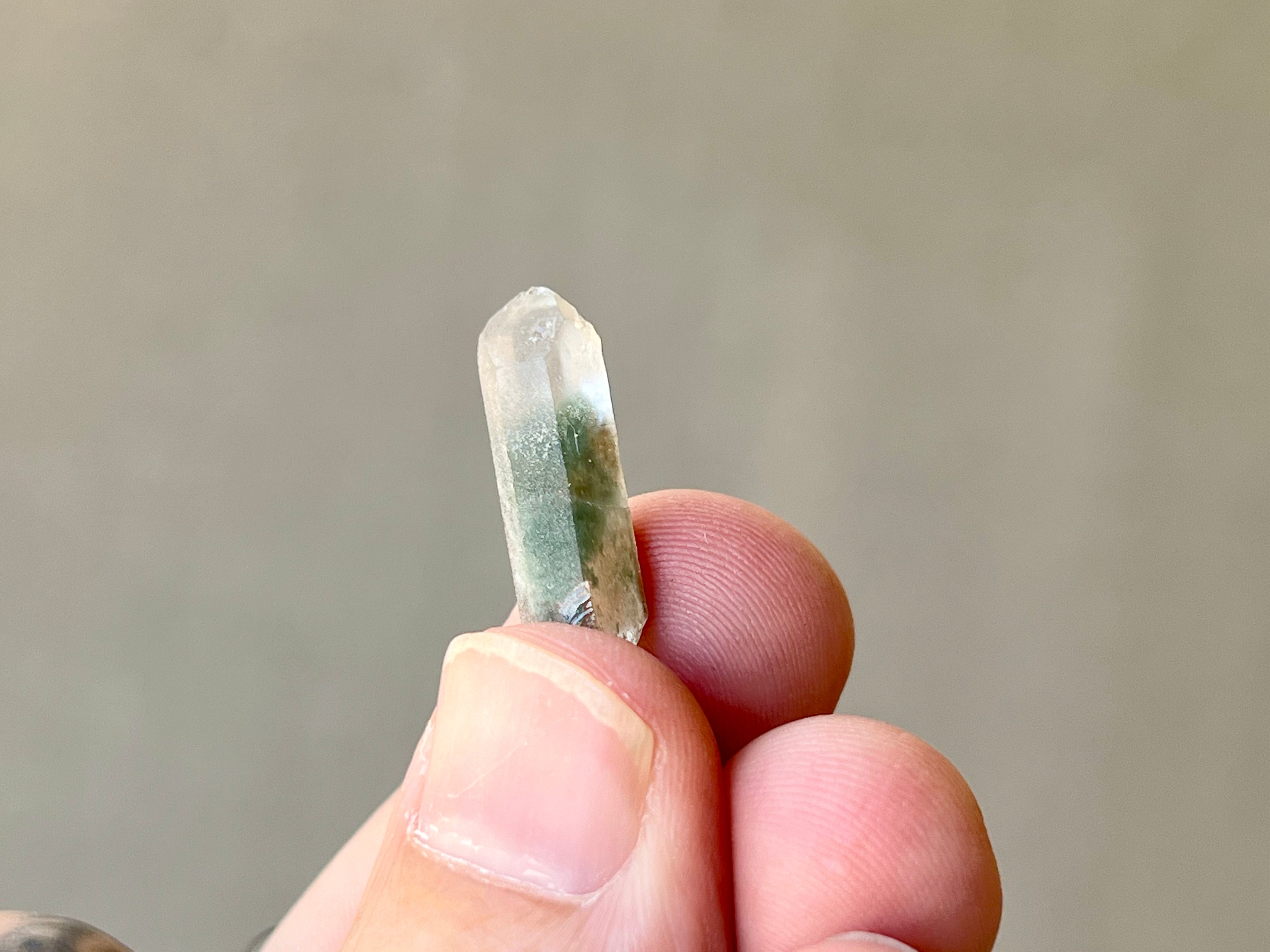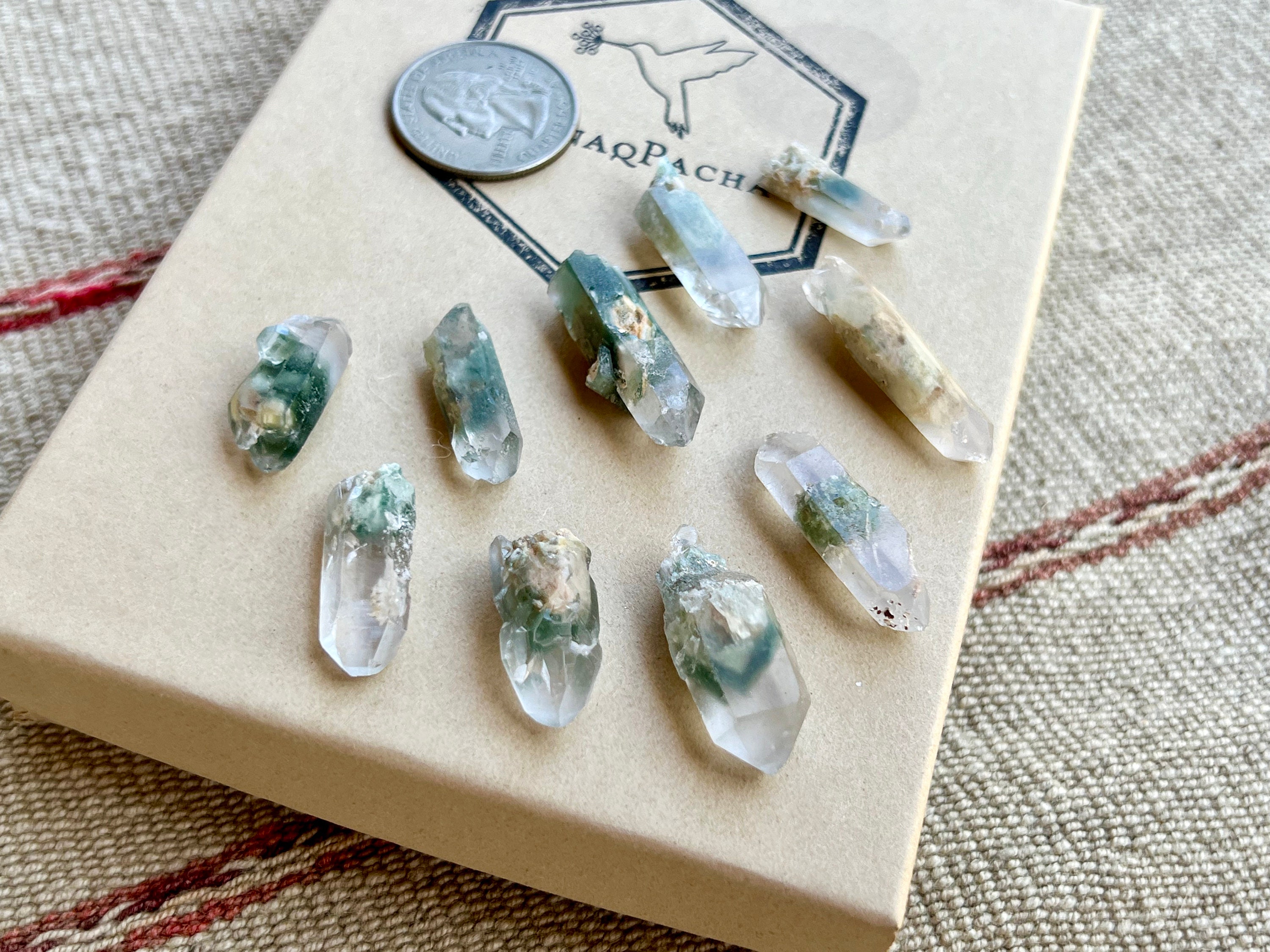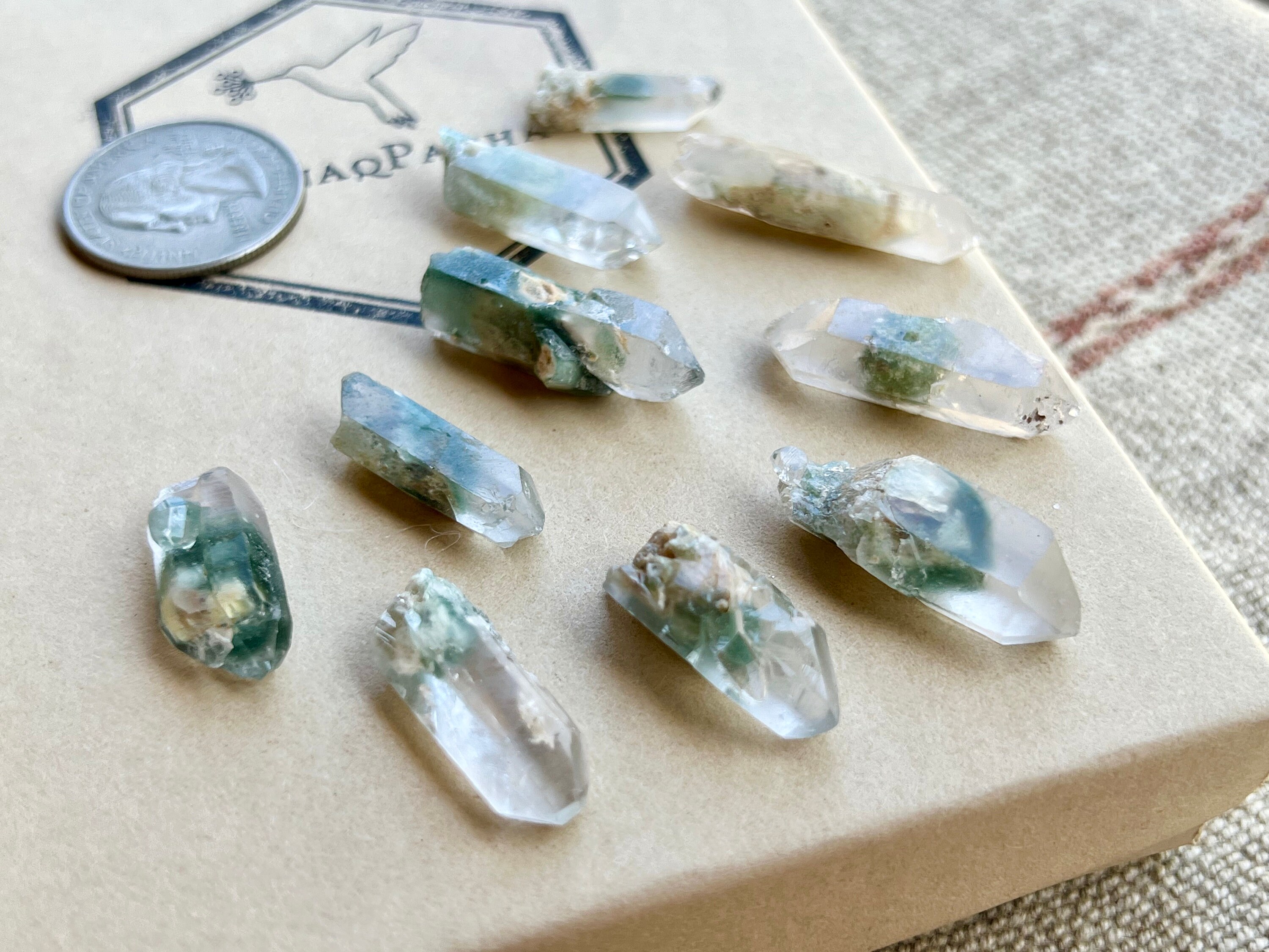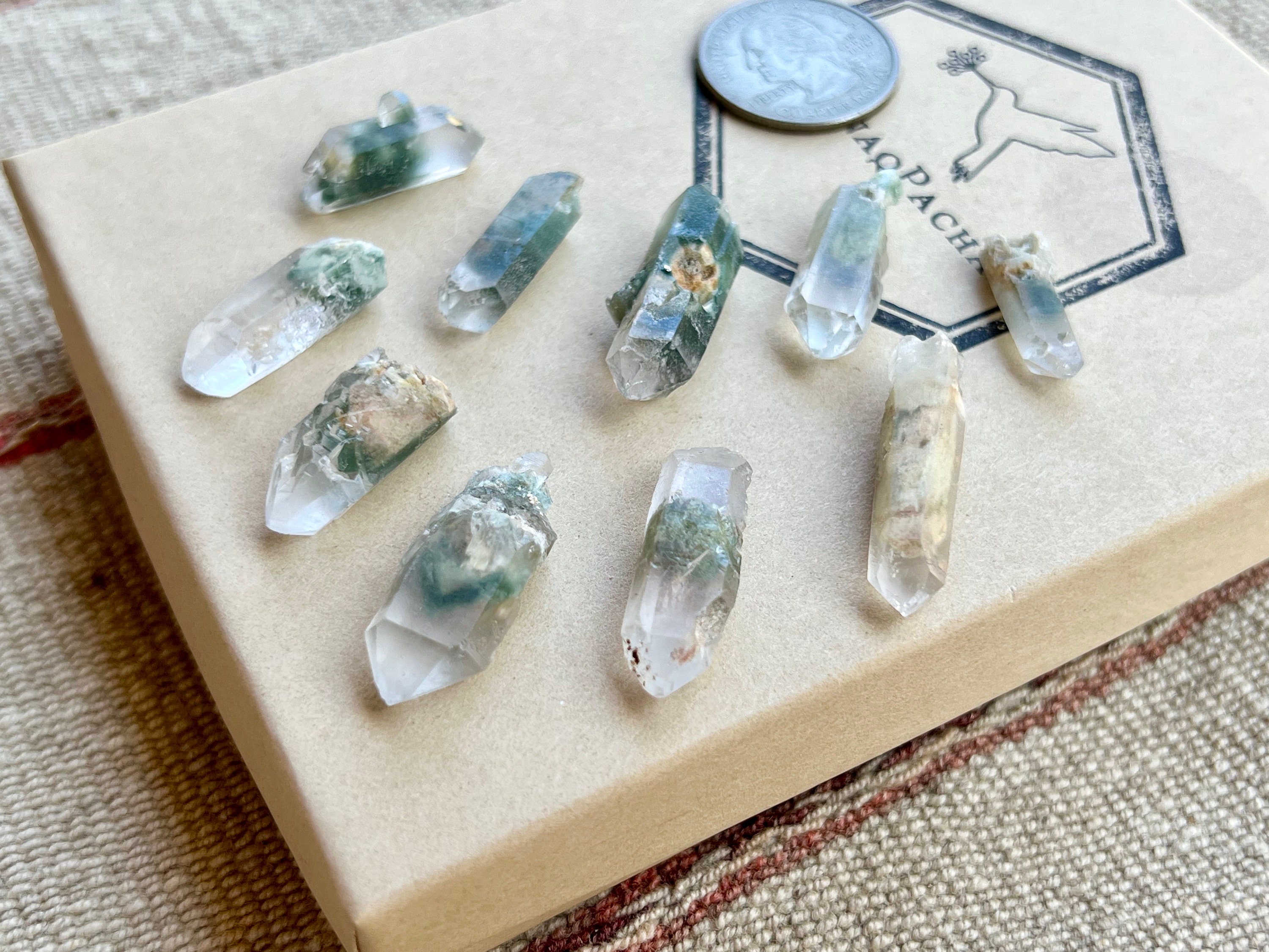 We had thought these were all gone, but then we found a small amount of these crystals in our inventory, so this is a rarity! This is a great set. All crystals have very lovely inclusions of deep Green Chlorite, and a few also have snowy inclusions of Kaolinite. The formations are all traditional "points" with nice terminations. These crystals are smaller in size and would be ideal for use in jewelry, crystal grids, etc.