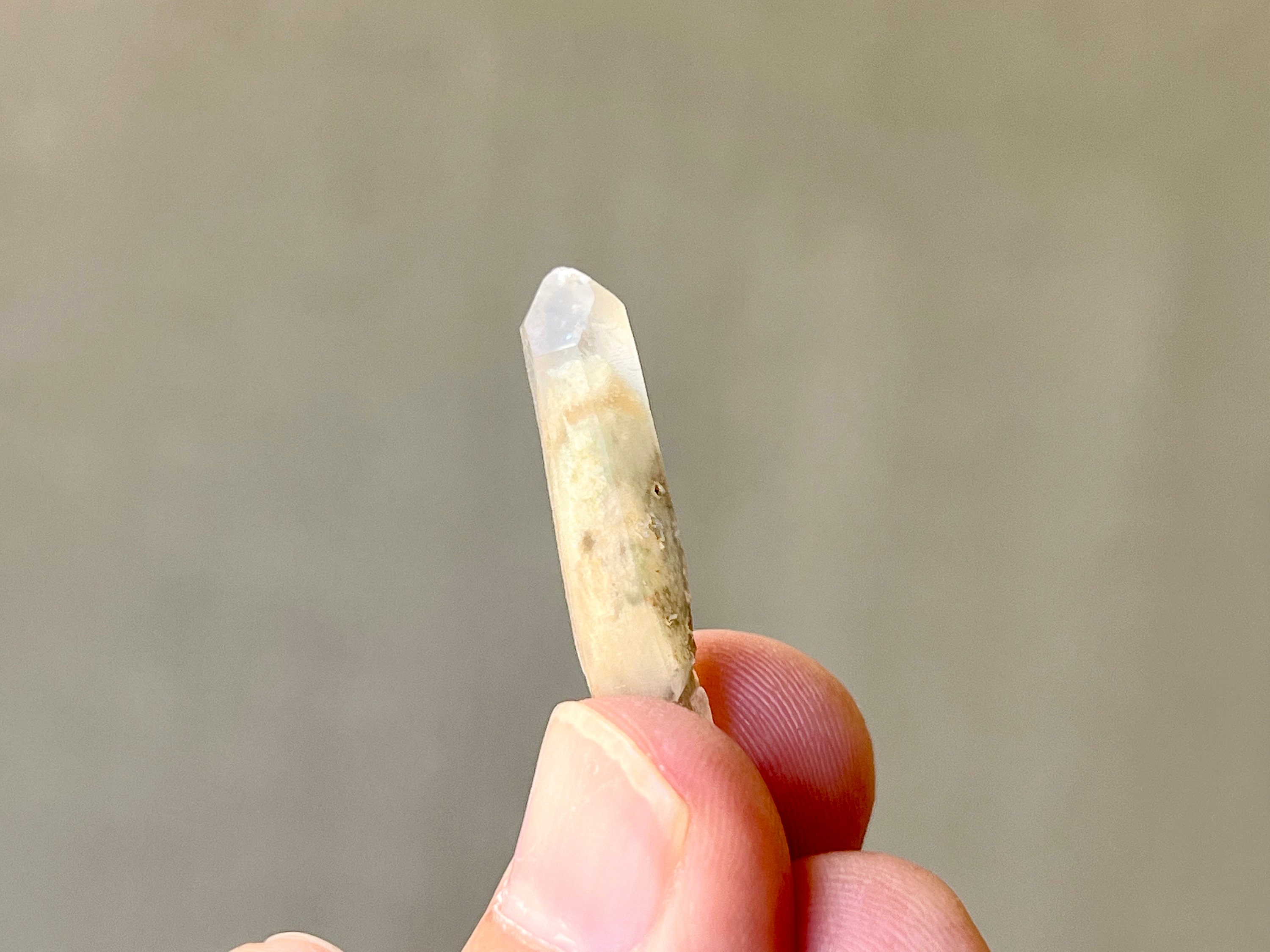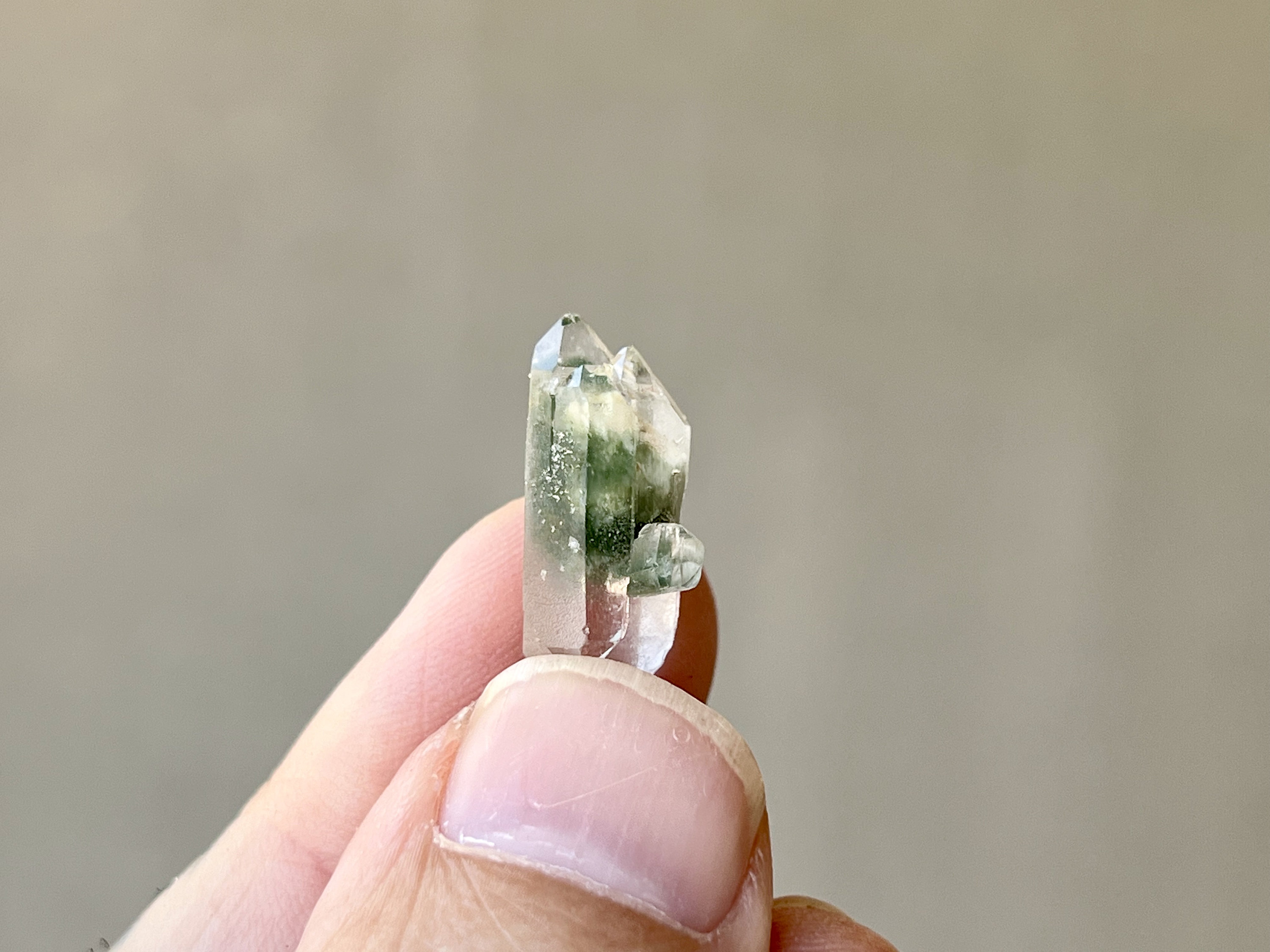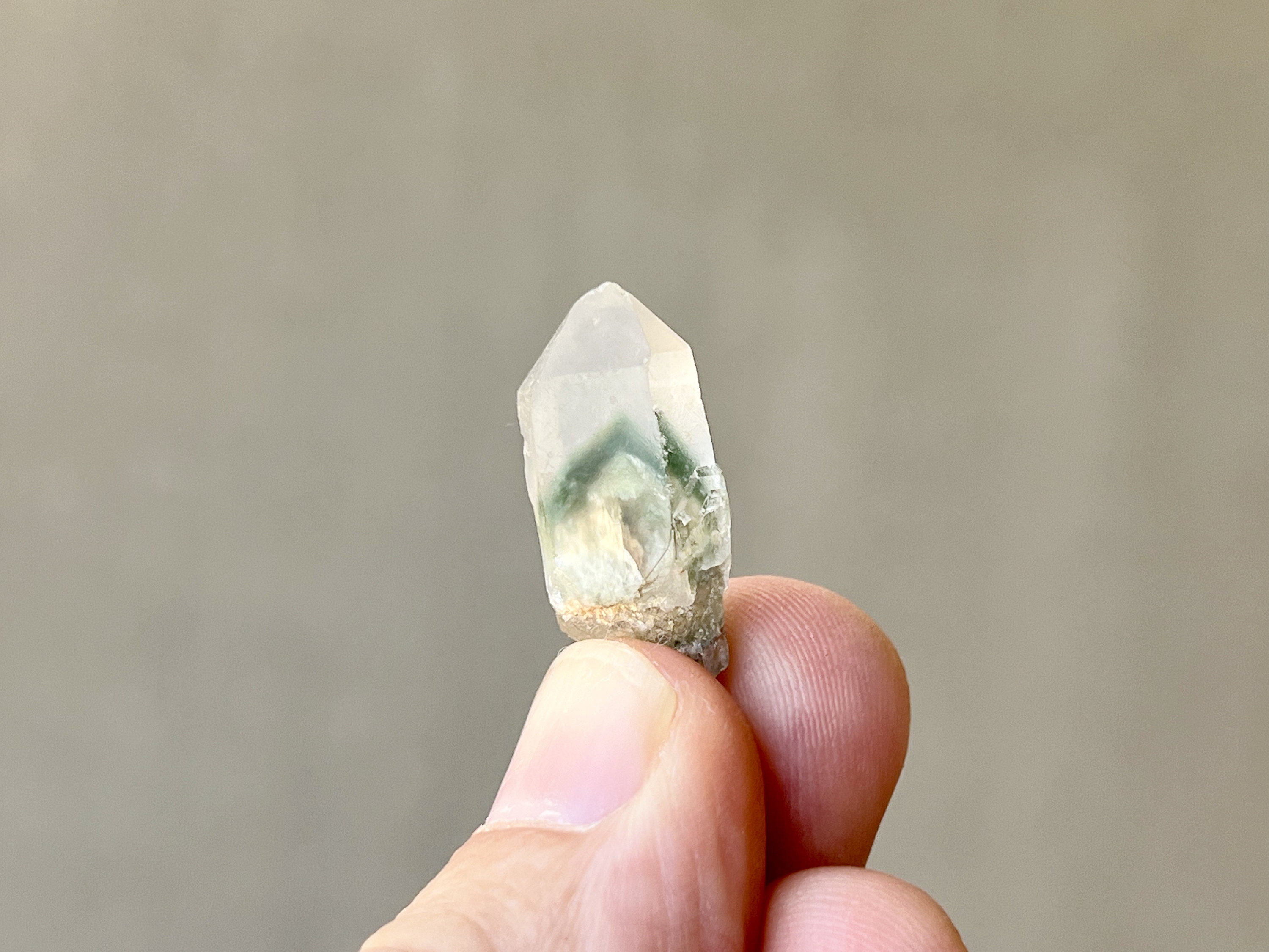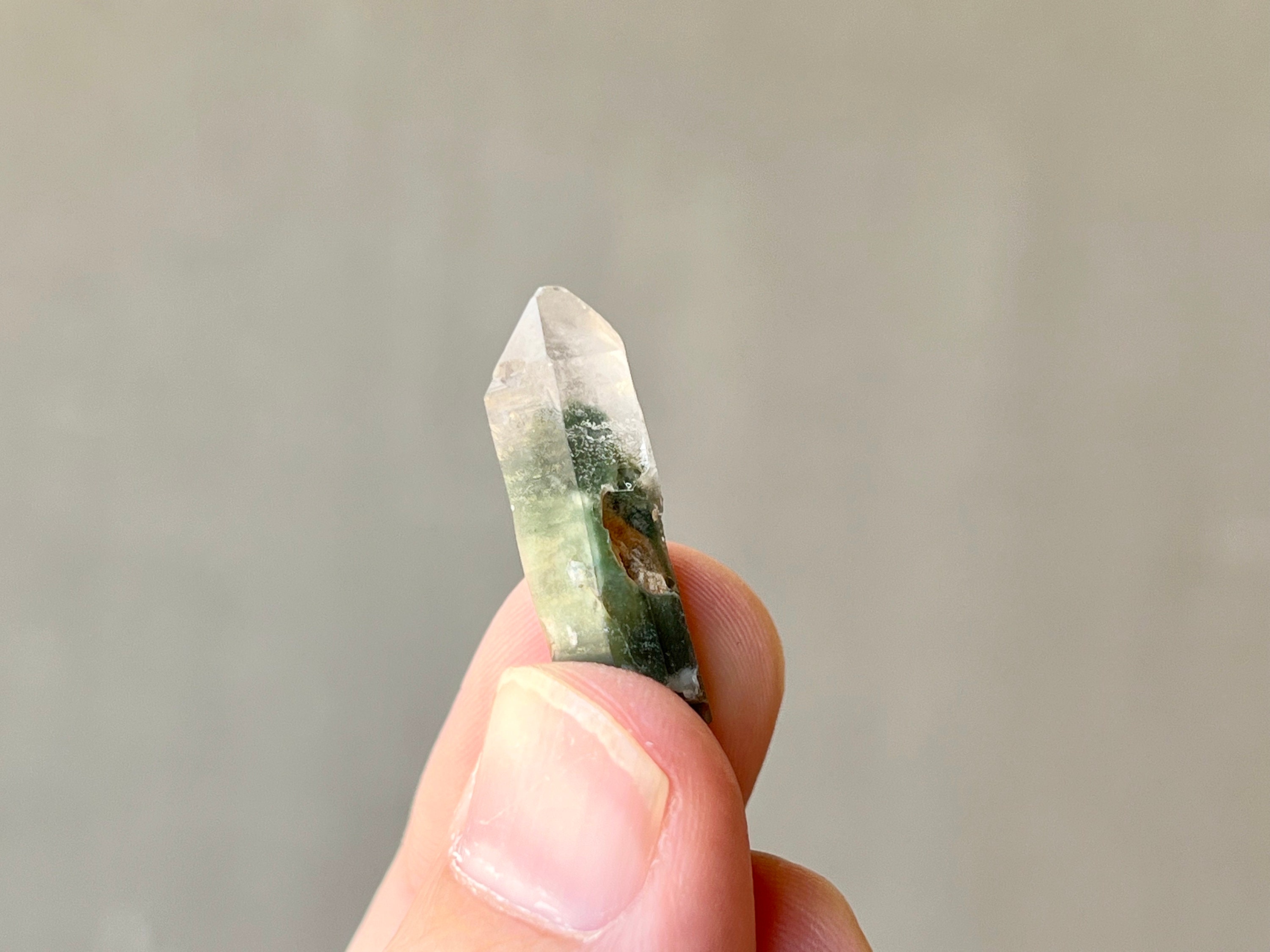 We had thought these were all gone, but then we found a small amount of these crystals in our inventory, so this is a rarity! This is a great set. All crystals have very lovely inclusions of deep Green Chlorite, and a few also have snowy inclusions of Kaolinite. The formations are all traditional "points" with nice terminations. These crystals are smaller in size and would be ideal for use in jewelry, crystal grids, etc.