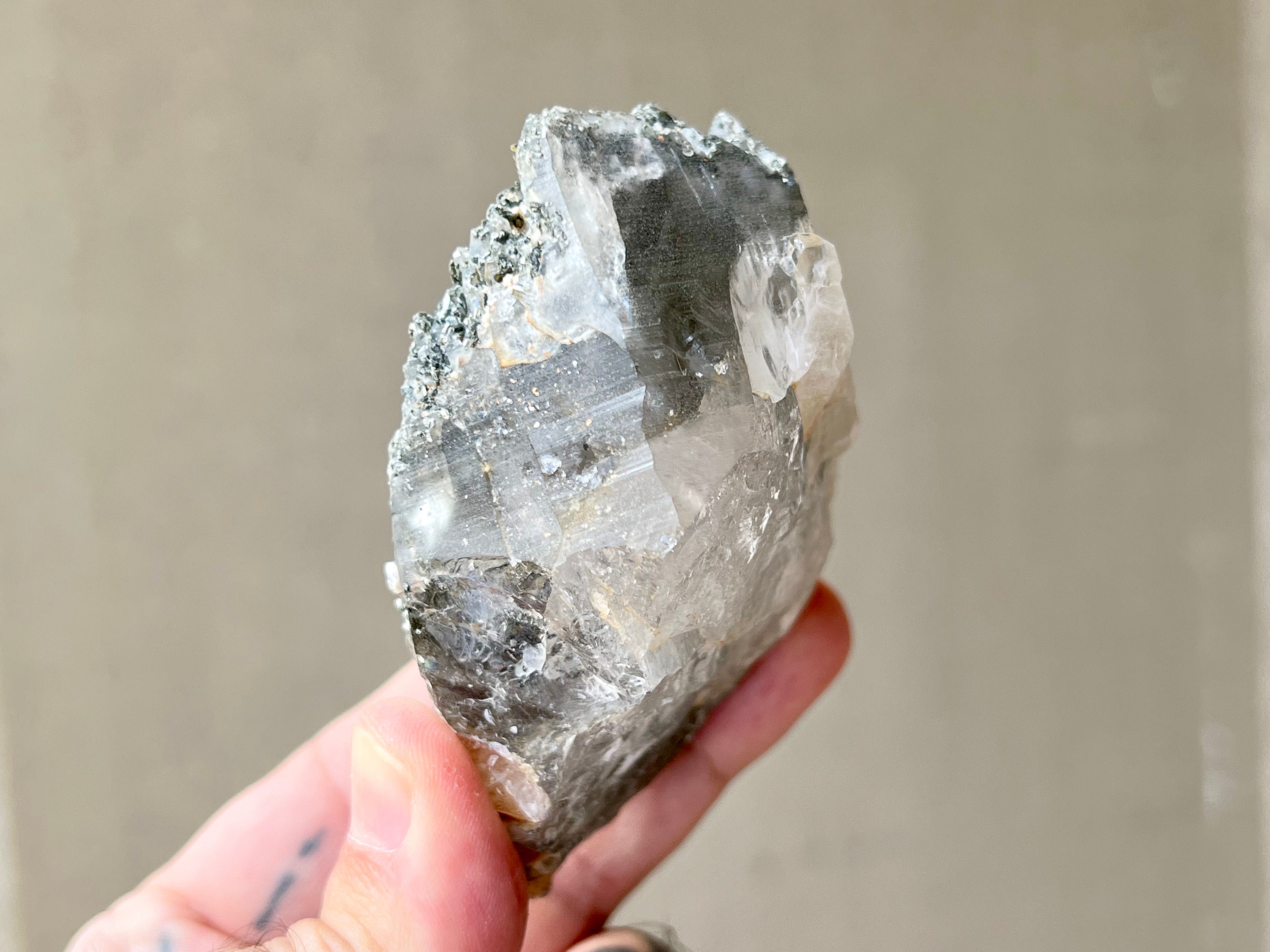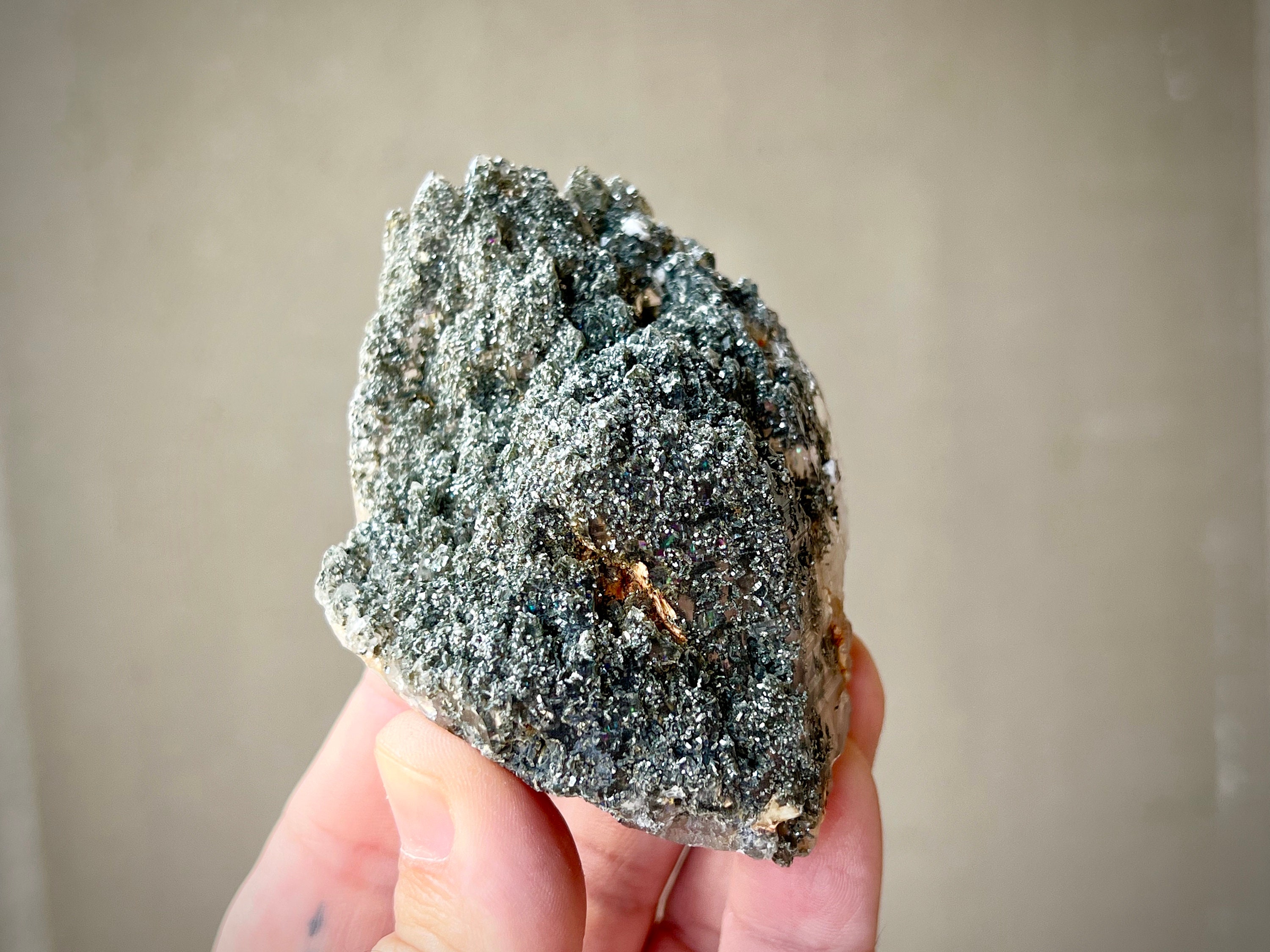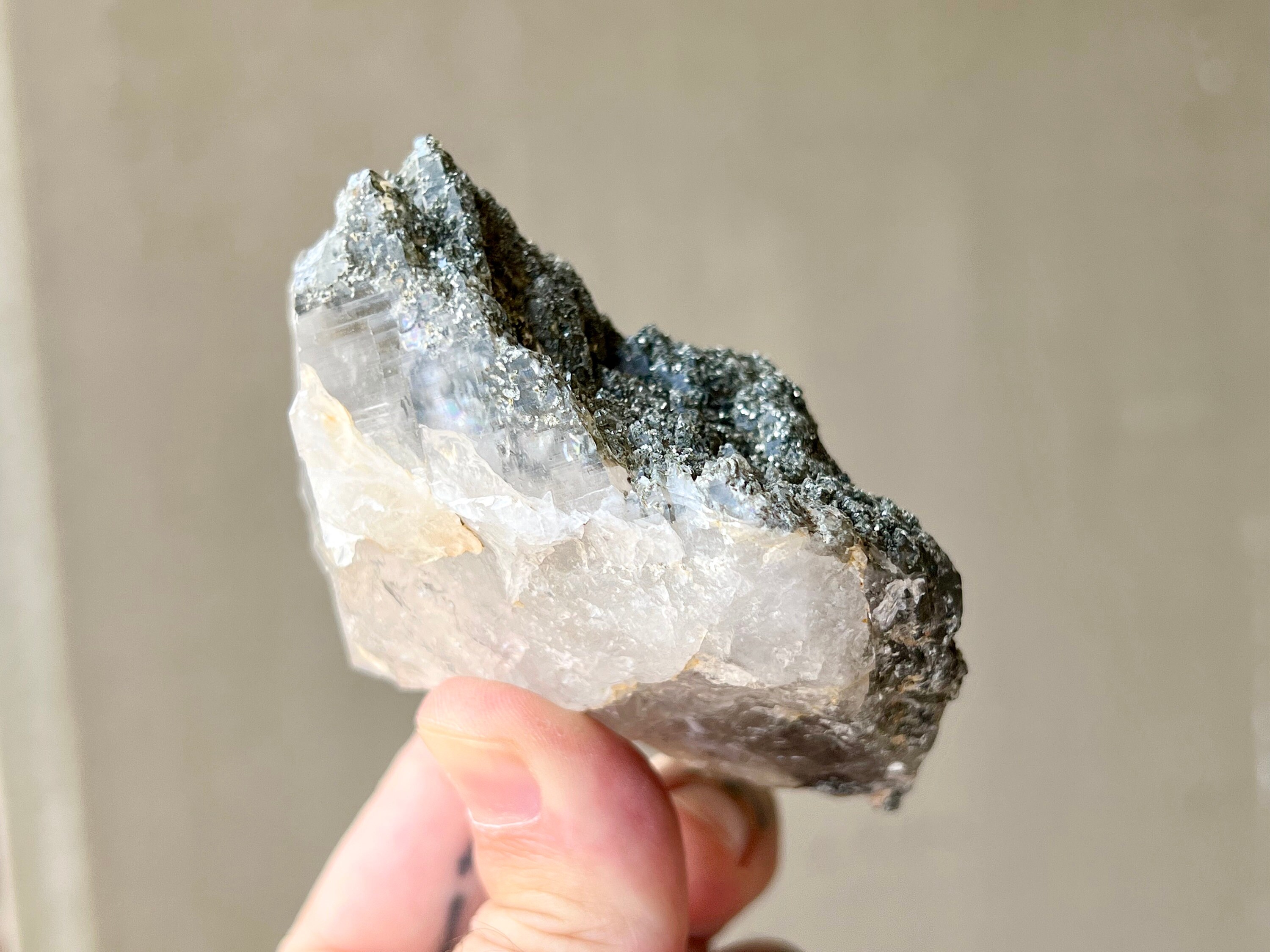 Some of these crystals contain Green Chlorite as well. Green Chlorite is one of the most powerful heart-healers and purifiers in the mineral kingdom. Known as a regeneration crystal, it can be used to facilitate contact with high vibrational energies, nature spirits, angelic guides, and the energetic vibration of the Earth itself. When combined with quartz, its purification and detoxification properties are amplified, in both the physical body and auric body.