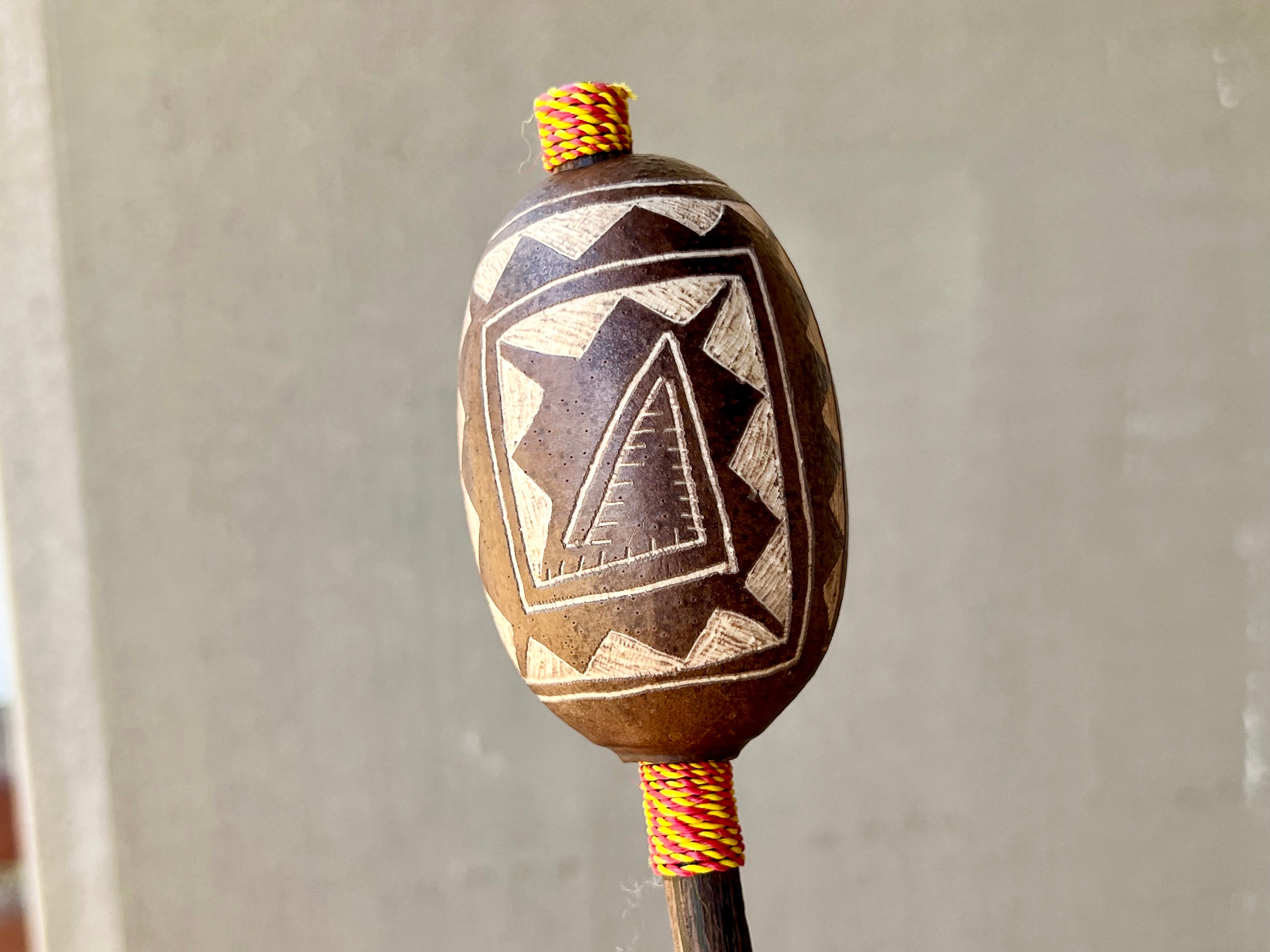 Tone: Mid-Range / Unique tone, as this rattle has fewer seeds inside, giving it a much more sparse and resonant sound, but very beautiful and wonderful for accompanying singing or music.