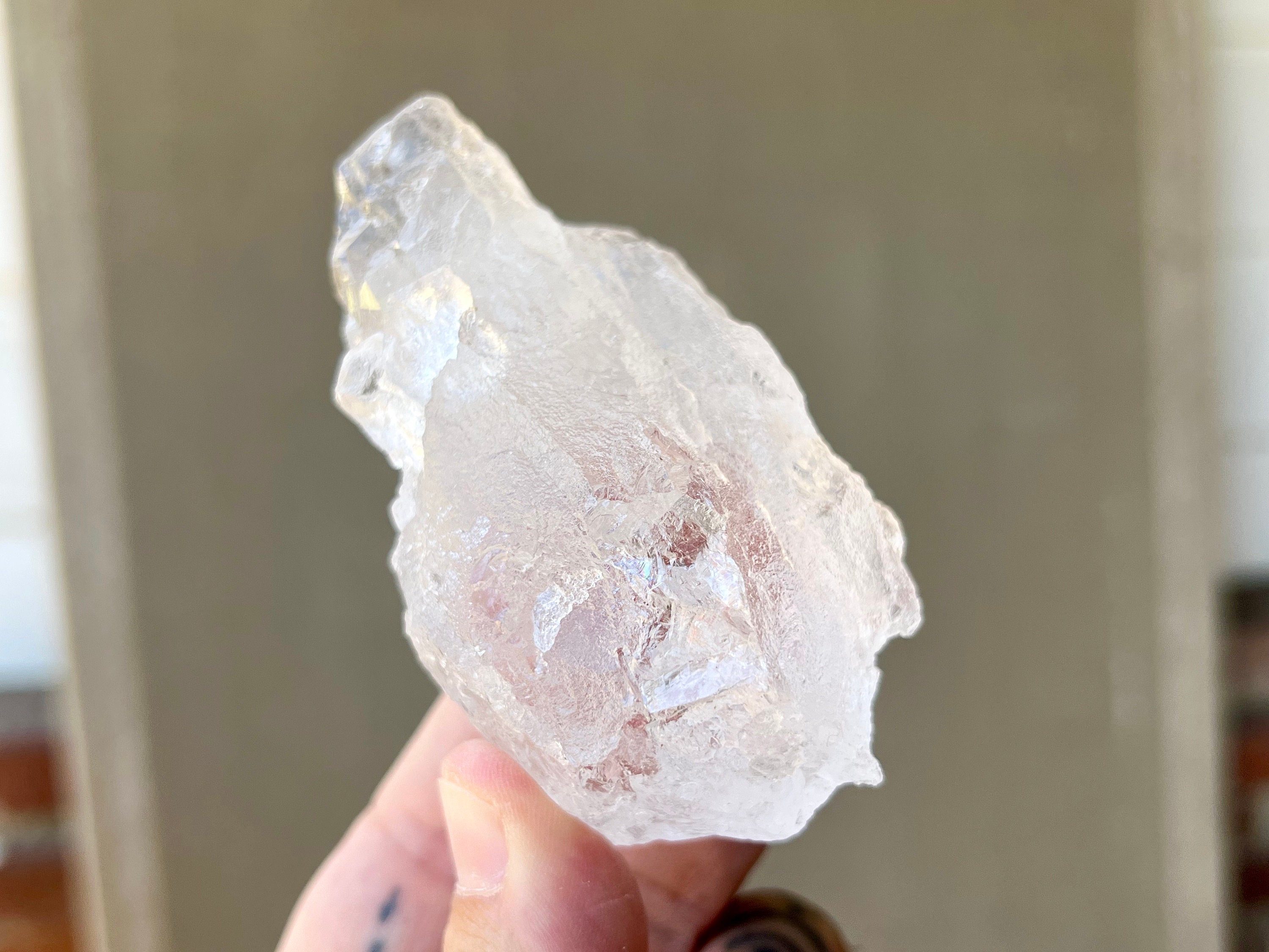 Because of their many facets, these crystals are not "unidirectional" like crystal points are. These crystals emanate their healing energies in all directions. Ice Quartz carries an energy that is *incredibly* powerful in drawing challenging emotions that need to be resolved to the surface in order for them to be expressed, felt and healed. These crystals are recommended for those interested in deep emotional healing work and trauma healing. They carry one of the most powerful and unique vibrations of any crystal we have ever worked with.