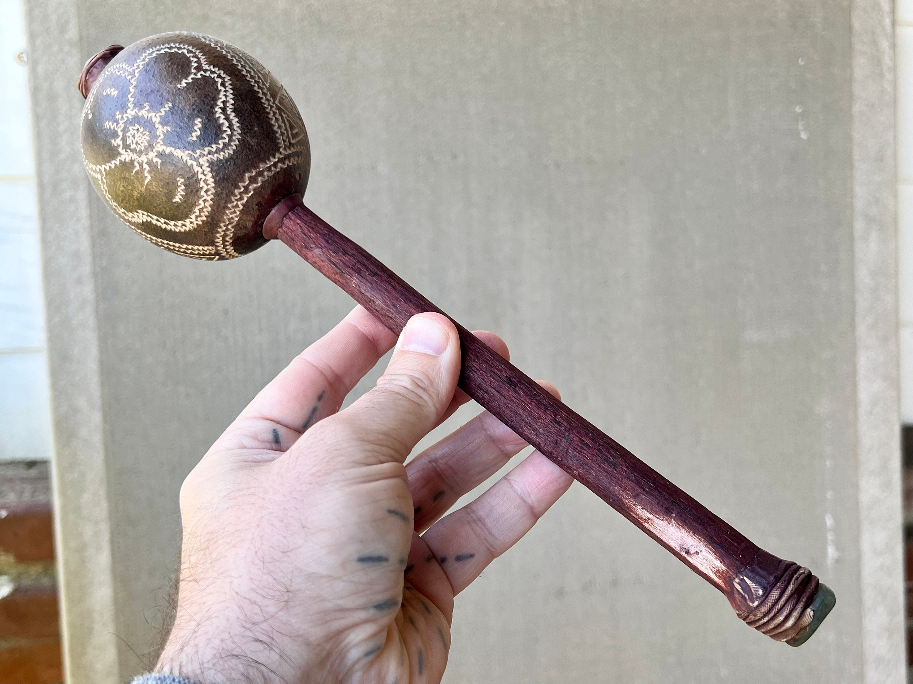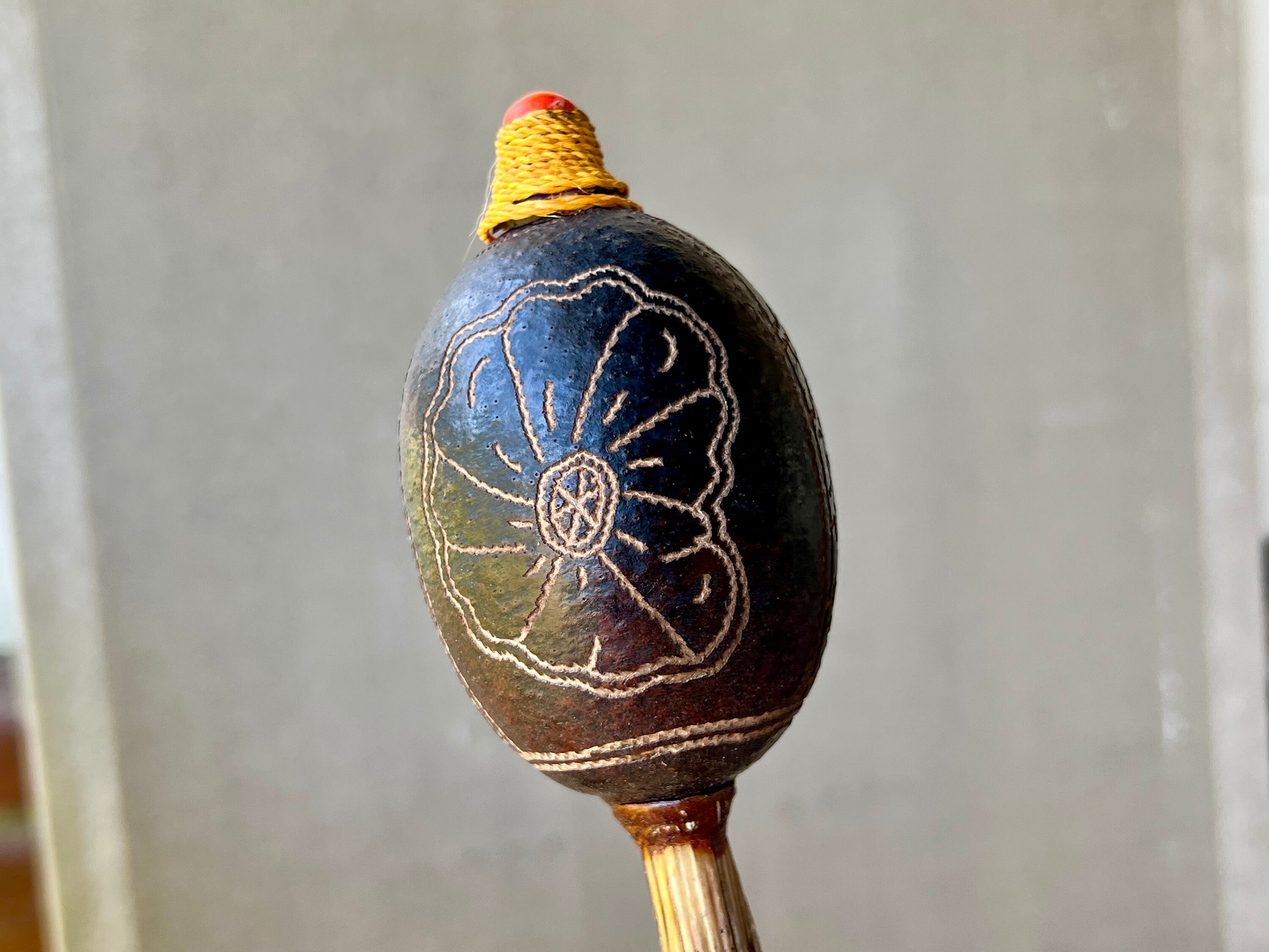 Here is a selection of beautiful, hand-carved shamanic rattles, made by our artisan friends outside of Iquitos, in the Peruvian Amazon. These traditional rattles are a key element in both core shamanism as well as in Peruvian Shamanism and in plant medicine ceremonies. Each rattle has a different pitch (which we do our best to describe) as well as a different hand-adorned design. Most are filled with small seeds and/or small ceramic beads, and made of a natural Gourd and Chonta or Palo Sangre Wood handle. Once we receive them here, we seal the bottoms (if necessary) with a strong sealant to enforce their strength and ensure that no beads will be lost during use. These are some of the nicest rattles we've come across in our travels.