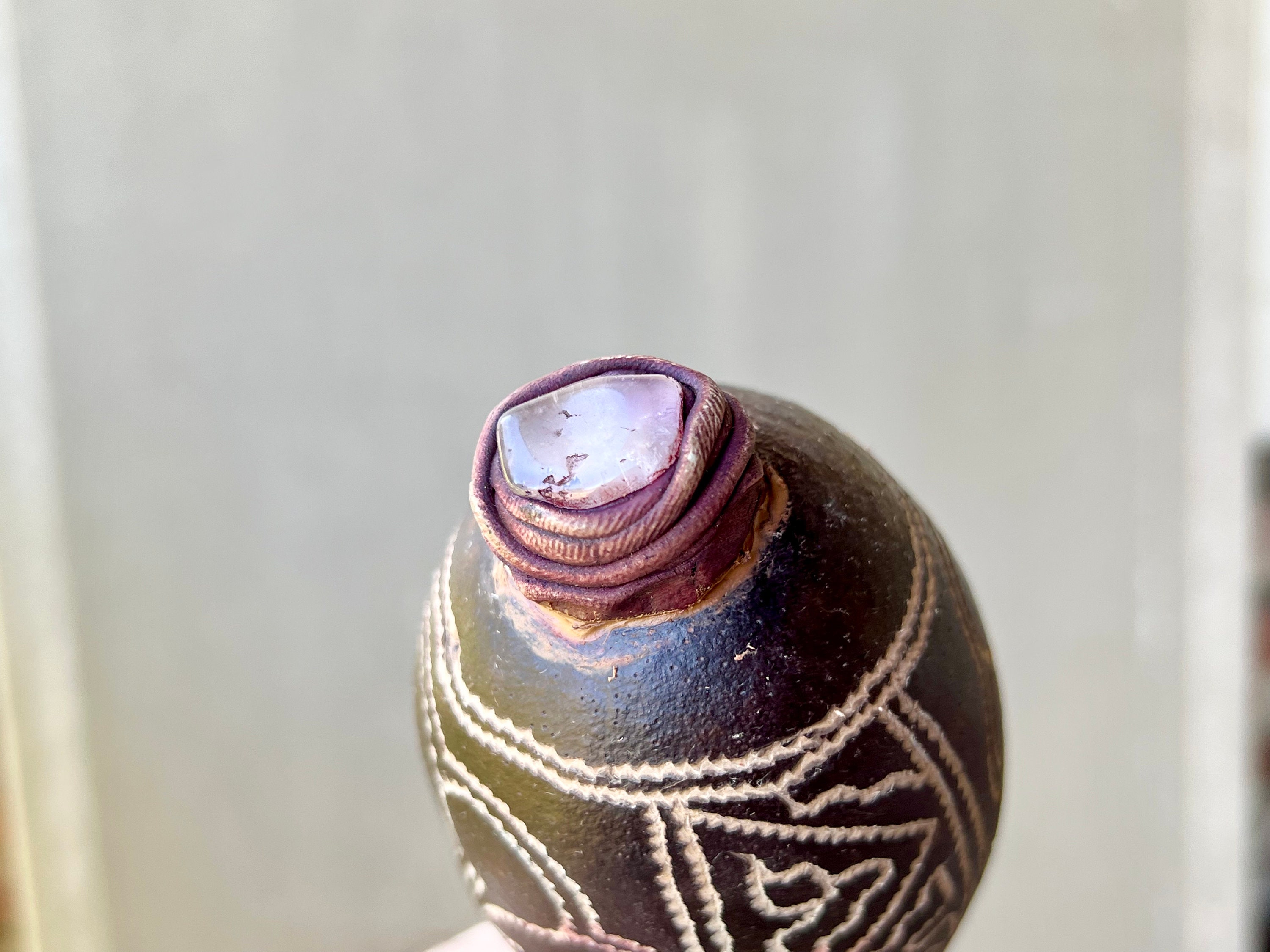 Additional ornamentation: Aventurine stone at base of handle, clear Quartz at top