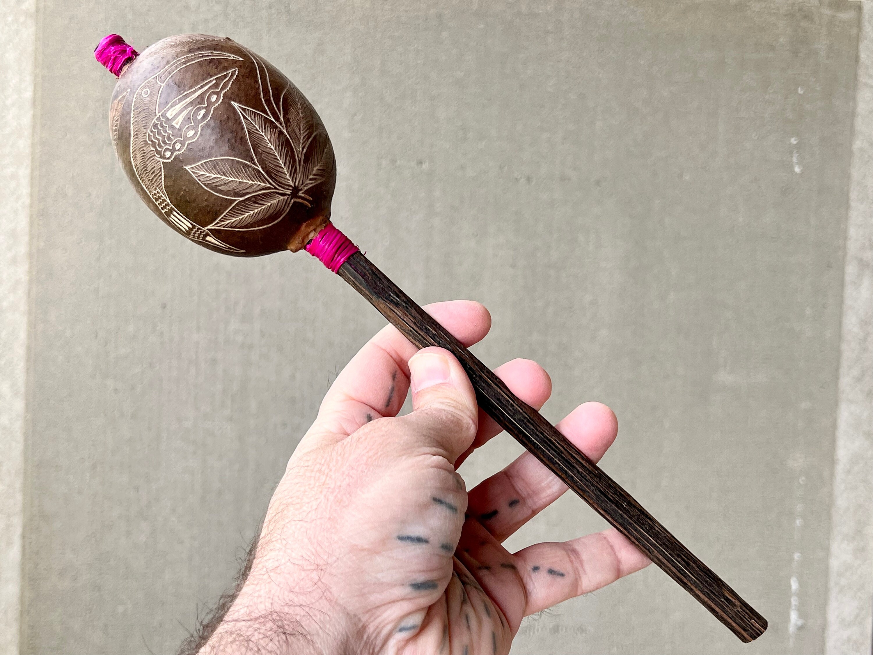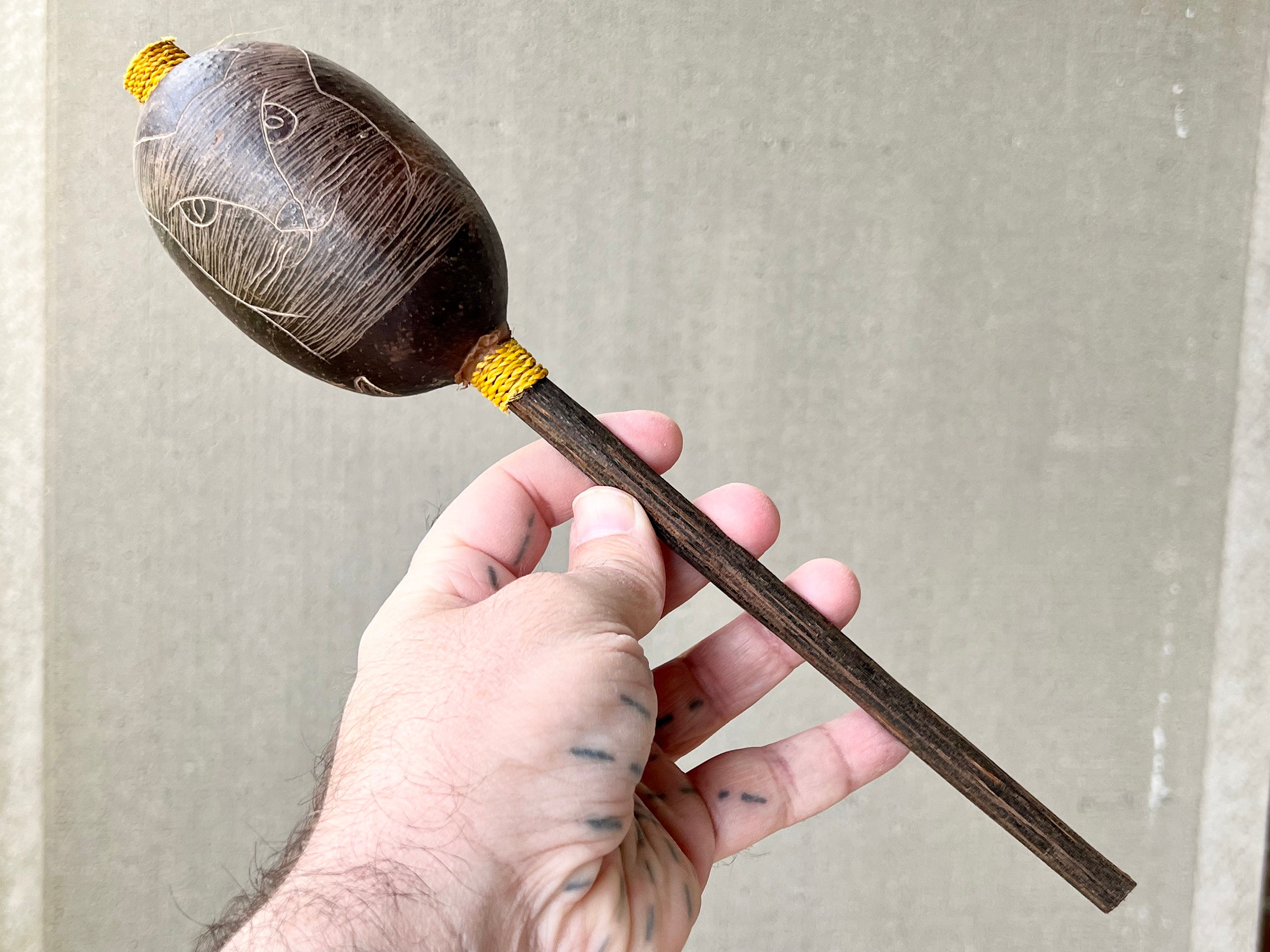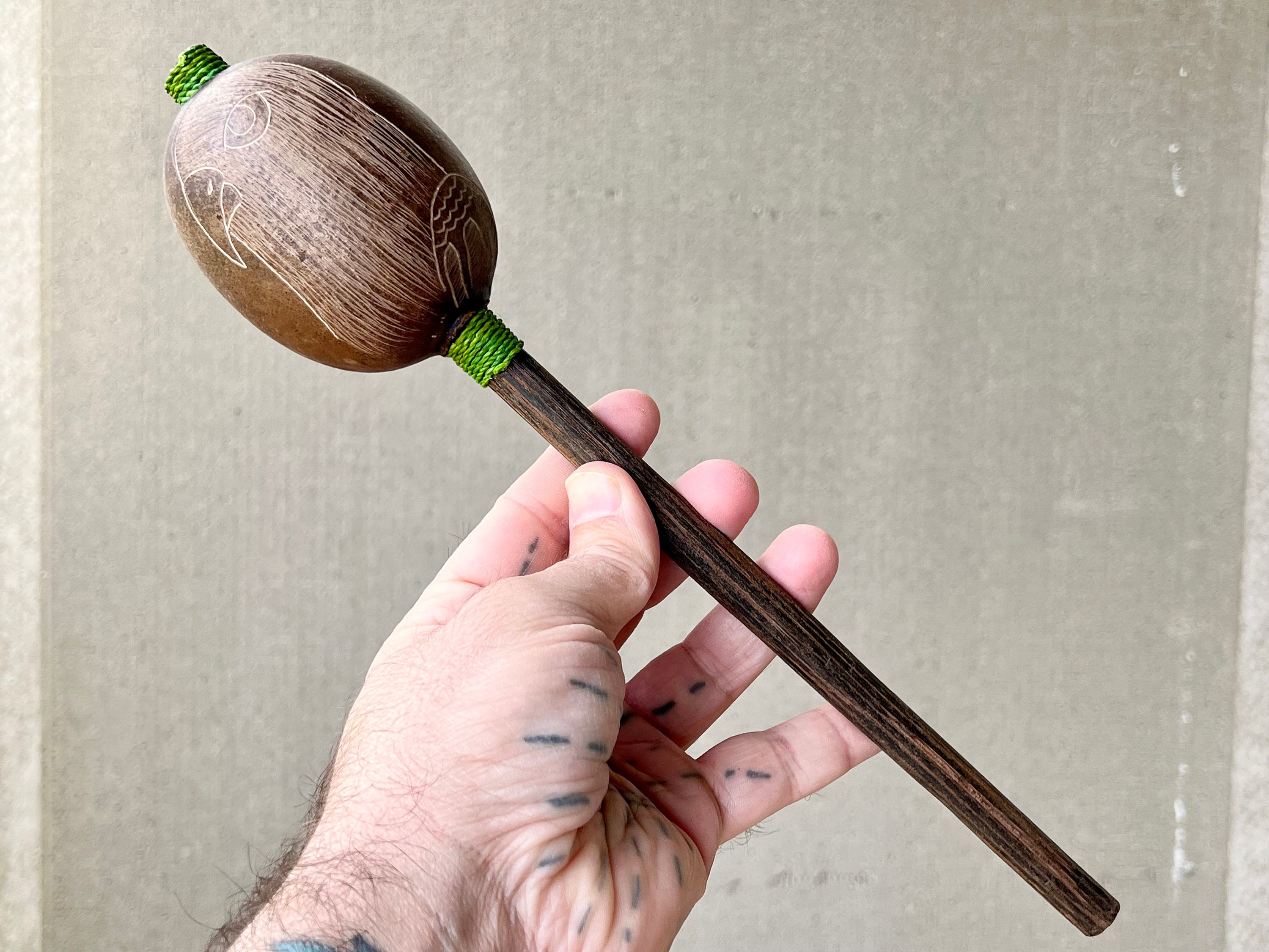 Tone: Mid-Range / Gentle, Muted, Pleasant. This rattle has a unique tone, almost as if the seeds/beads inside are a bit lighter, giving it a pleasantly muted tone. Ideal for accompanying music or singing.