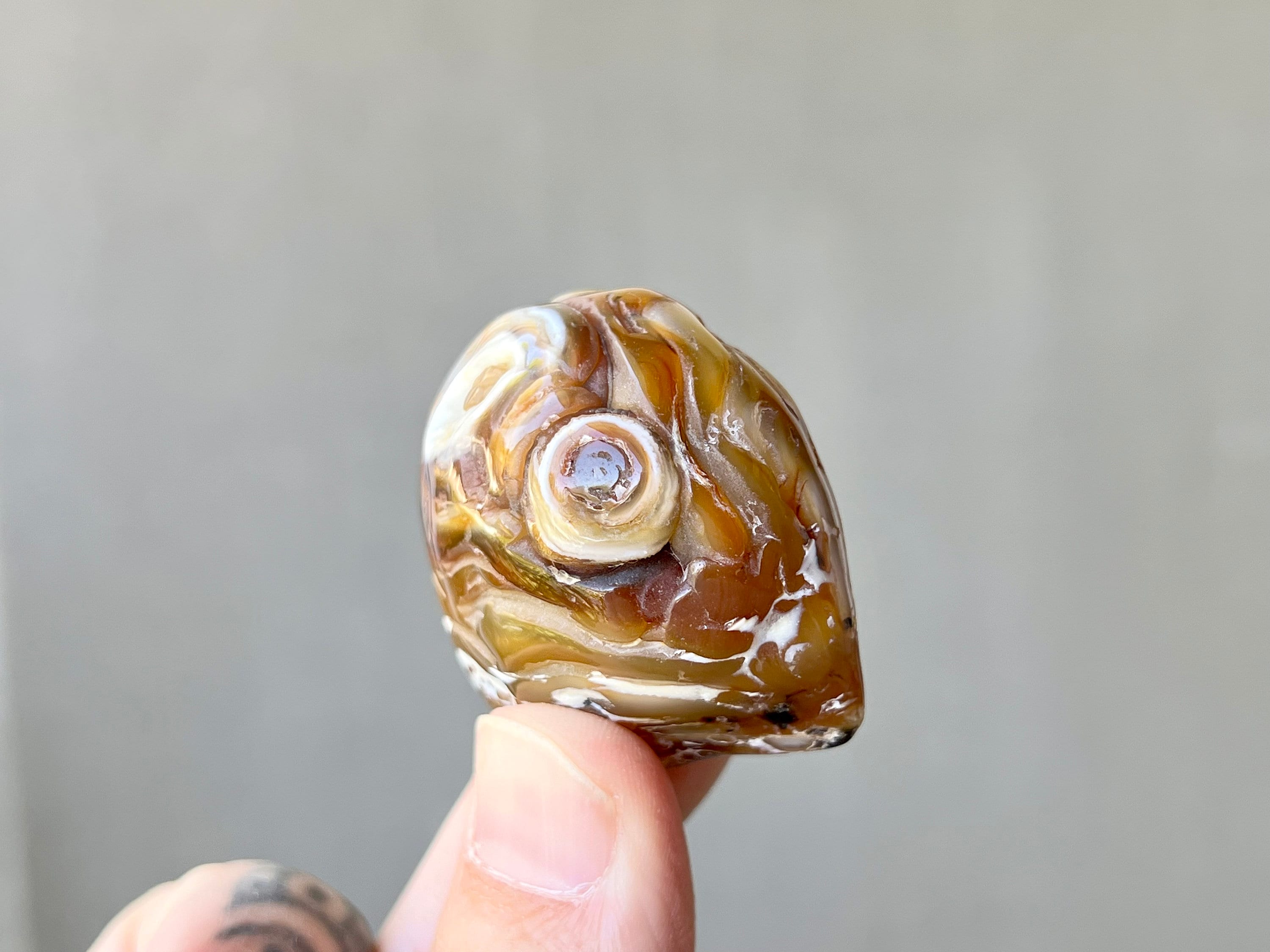 Stunning! This is one of the more unique Enhydro Agates we have offered as it has a very beautiful textural exterior with layered ridges, displaying its vibrant colors of oranges and whites. This aquatic Agate is absolutely FULL of water, and when backlit you can see the water movement (see the video). This will be a bit easier to see in person, and because the exterior is a bit thick, we advise using a bright light (like that of an iPhone flashlight) in a darkened space to appreciate the water movement at its best. What's more, if you shake this stone vigorously next to your ear you will actually HEAR the water moving around within. It's a spectacular and one of a kind piece, really special.
