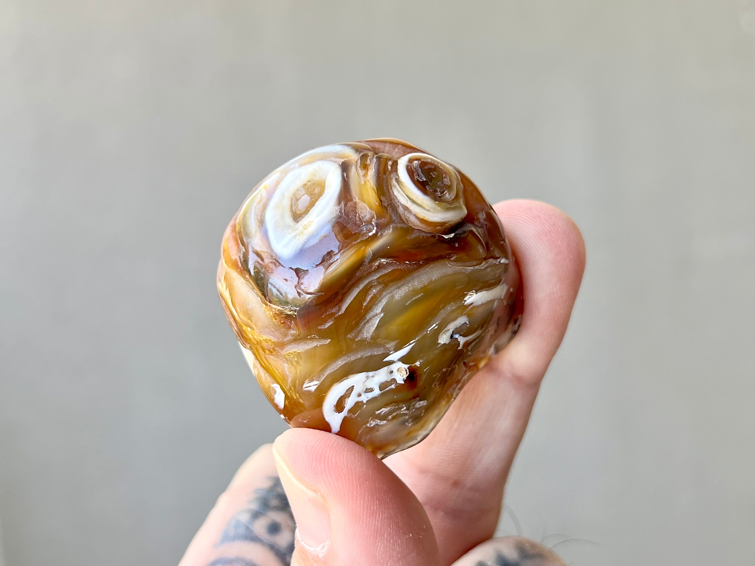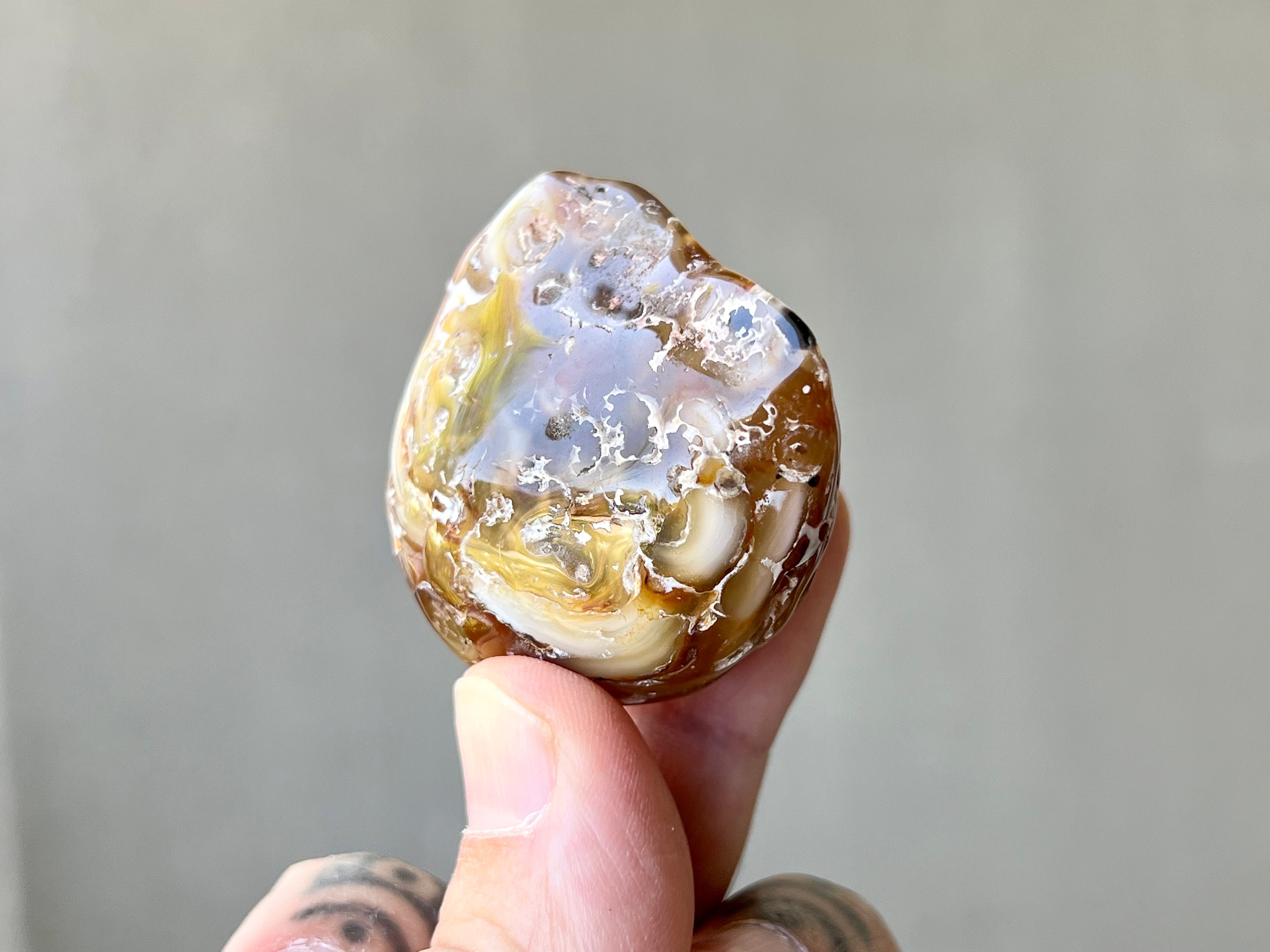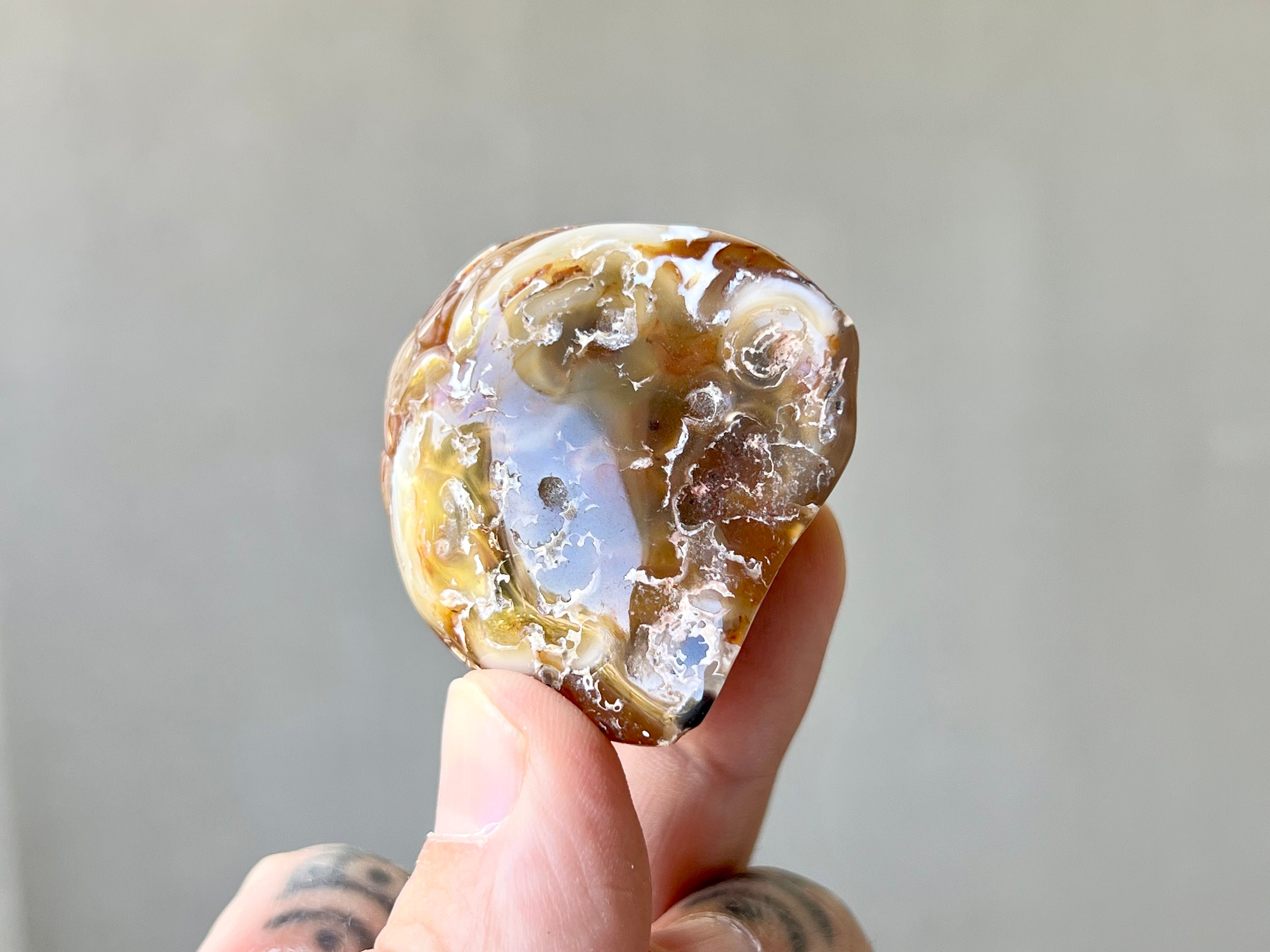 This stunning Ocean Agate is from a recent find in Rio Grande do Sul, Brazil. While it is absolutely beautiful to look at from a glance, it has a secret within that makes it incredibly special and rare: it contains quite a large amount of water inside! The term for this natural phenomenon is "Enhydro" and it occurs when water is trapped inside of an Agate (or crystal) during its millions-of-years development. These Agates have been polished so that one can see the water moving within when backlit (with a flashlight, for instance). In many cases, you can actually hear the water swishing if you shake it next to your ear. This is an incredibly rare phenomenon, as most Enhydro crystals contain only the smallest drop of water. These very special stones bring a balance between the elements of Earth and Water, increased spiritual receptivity and balance.