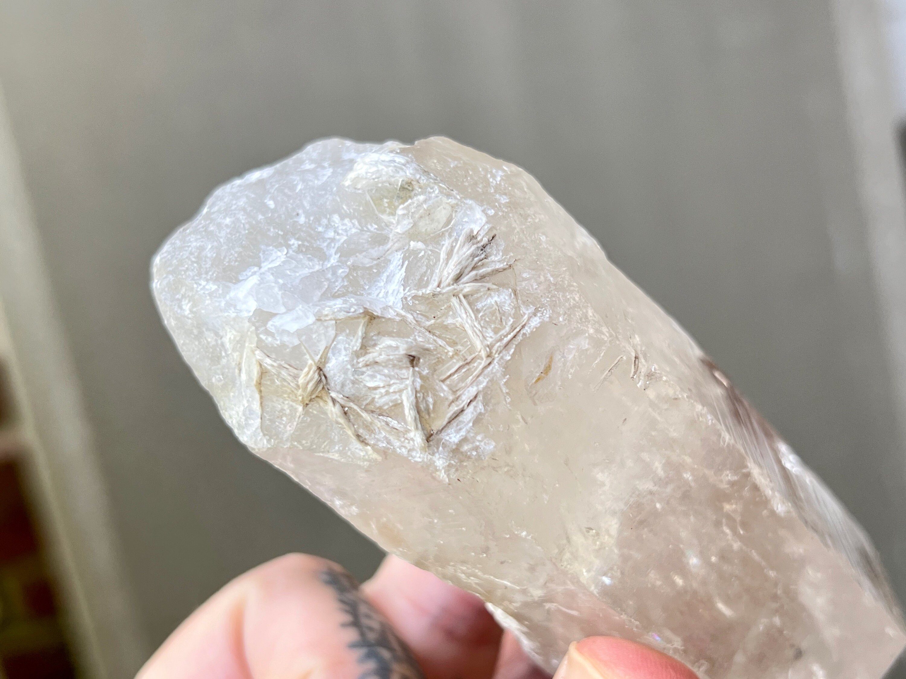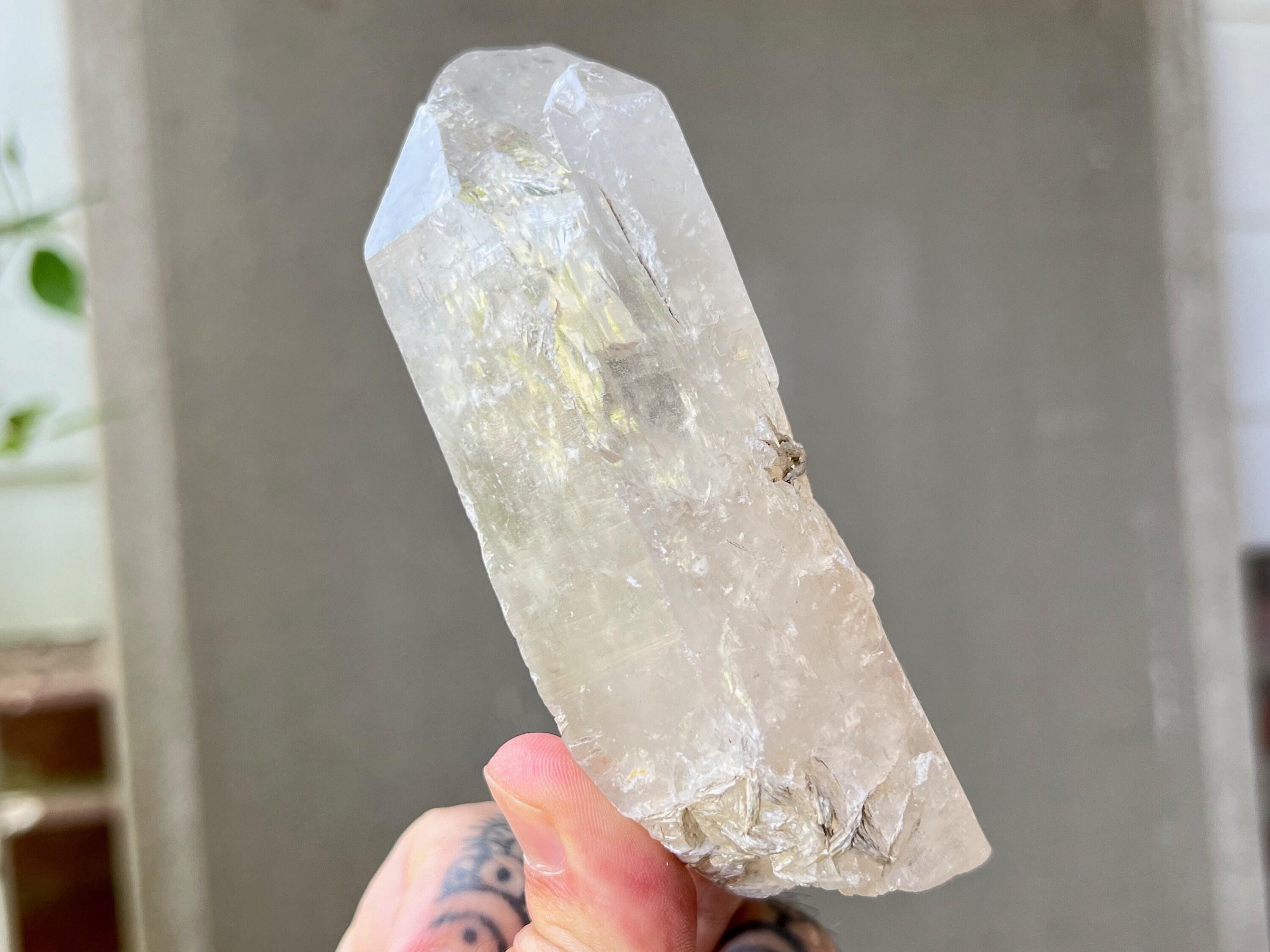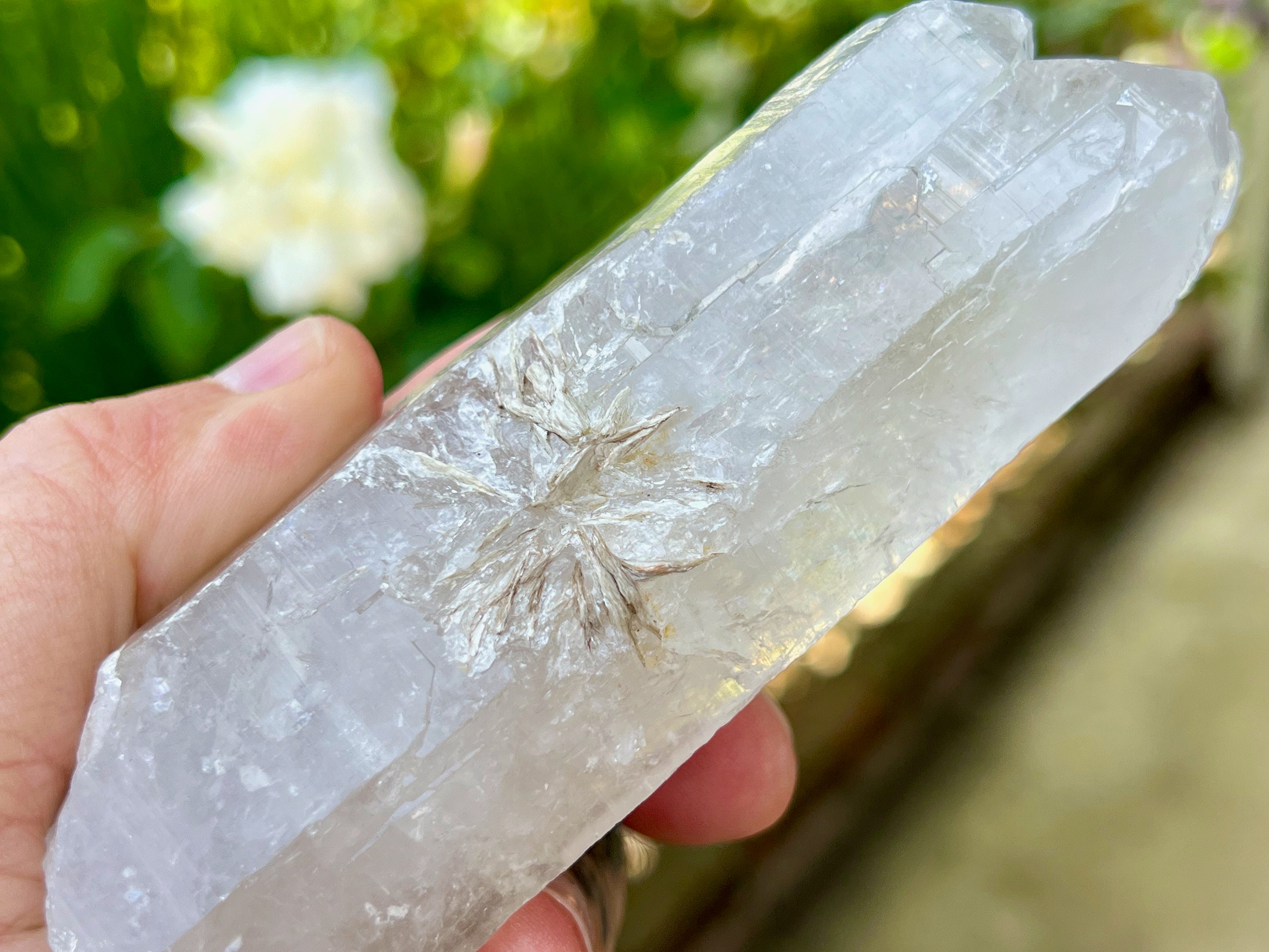Nice luster to this rather large Elestial Quartz crystal with a pretty white Mica "flower" inclusion just below the midsection, as well as some additional Mica inclusion at the base. These "flower" impressions are very cool and a bit fossil-like in nature. This crystal also has an array of foil-like, self-healed inclusions in the main facet area that produce some mild rainbows (see Photo 3 and Video). There is a minor chip to the termination, though regardless it's a beautiful piece and quite unique.