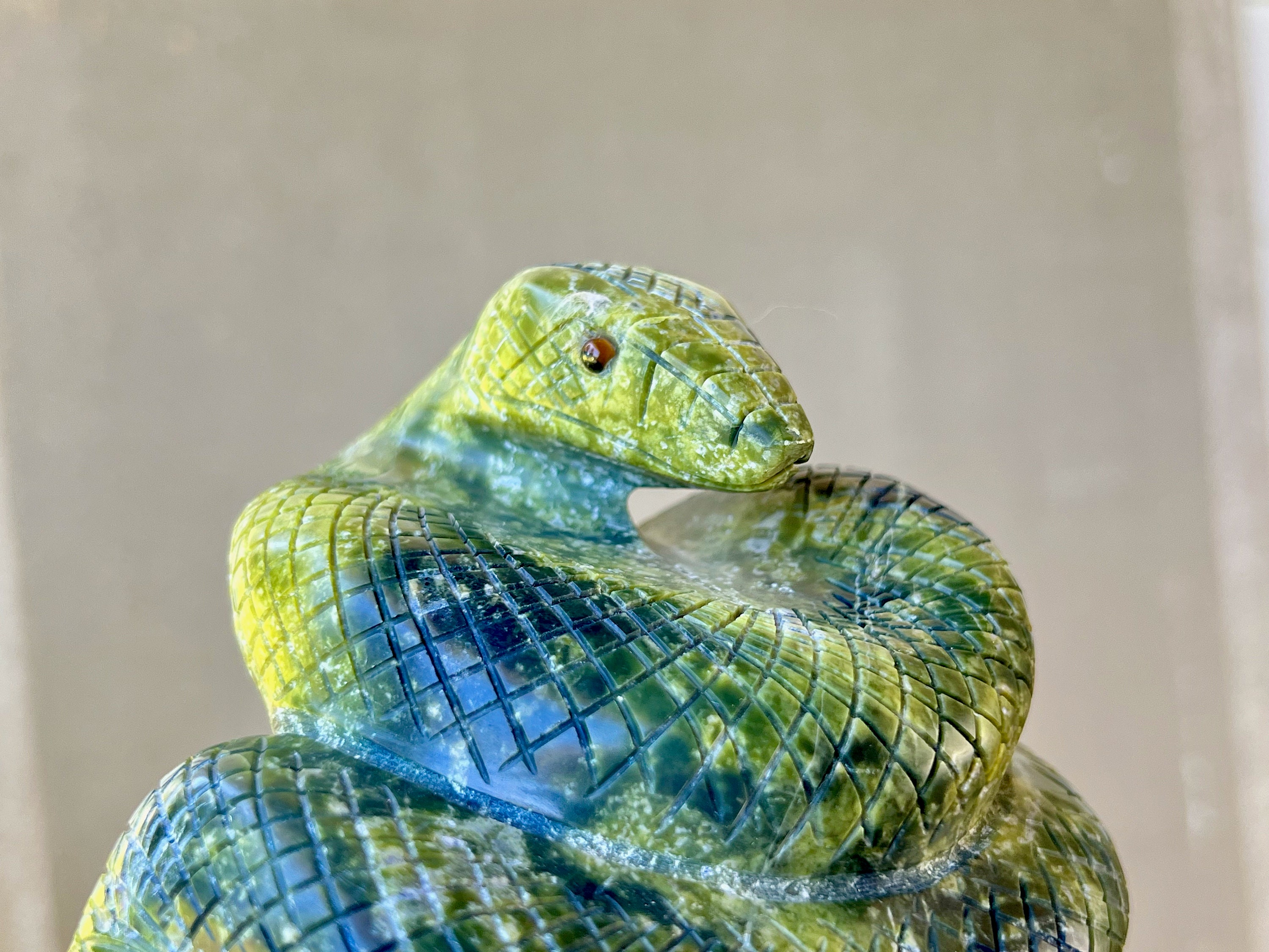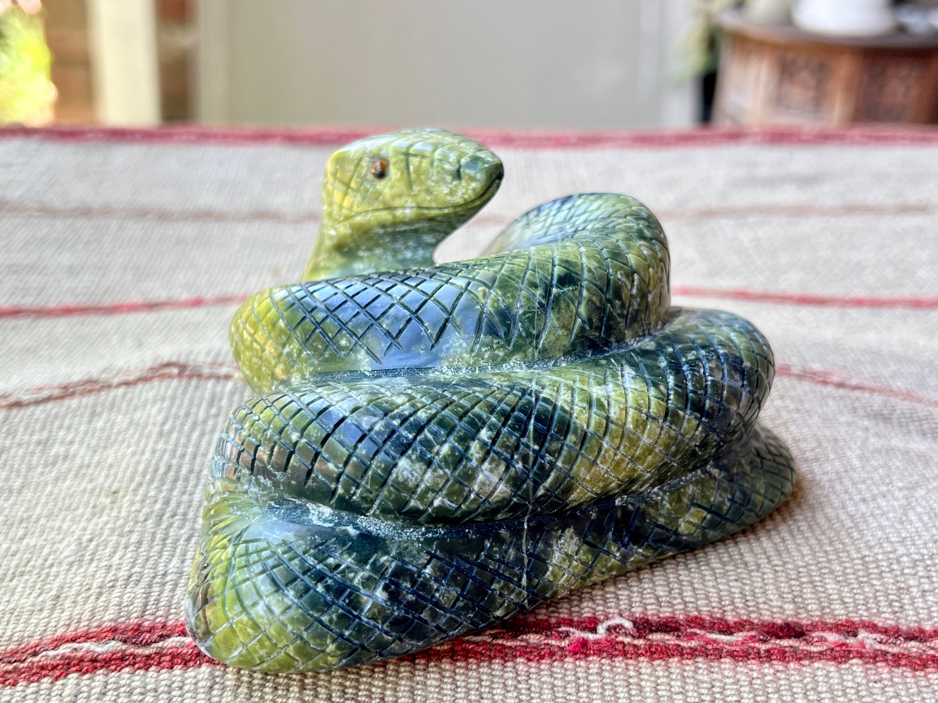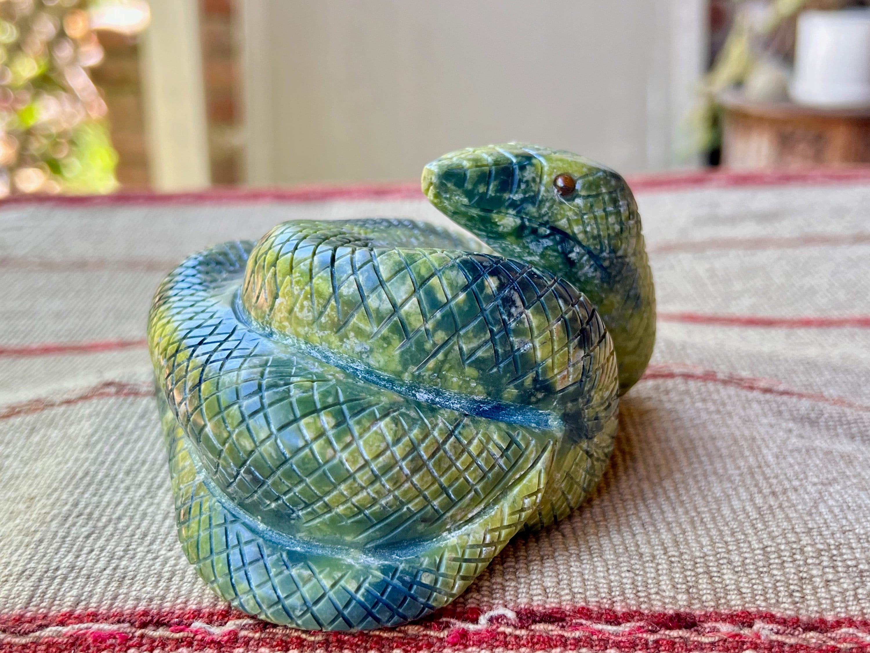 This exquisite Snake totem statue was hand carved from native Andean Serpentine Stone by Artist Ozwaldo Perez in Peru's Sacred Valley.