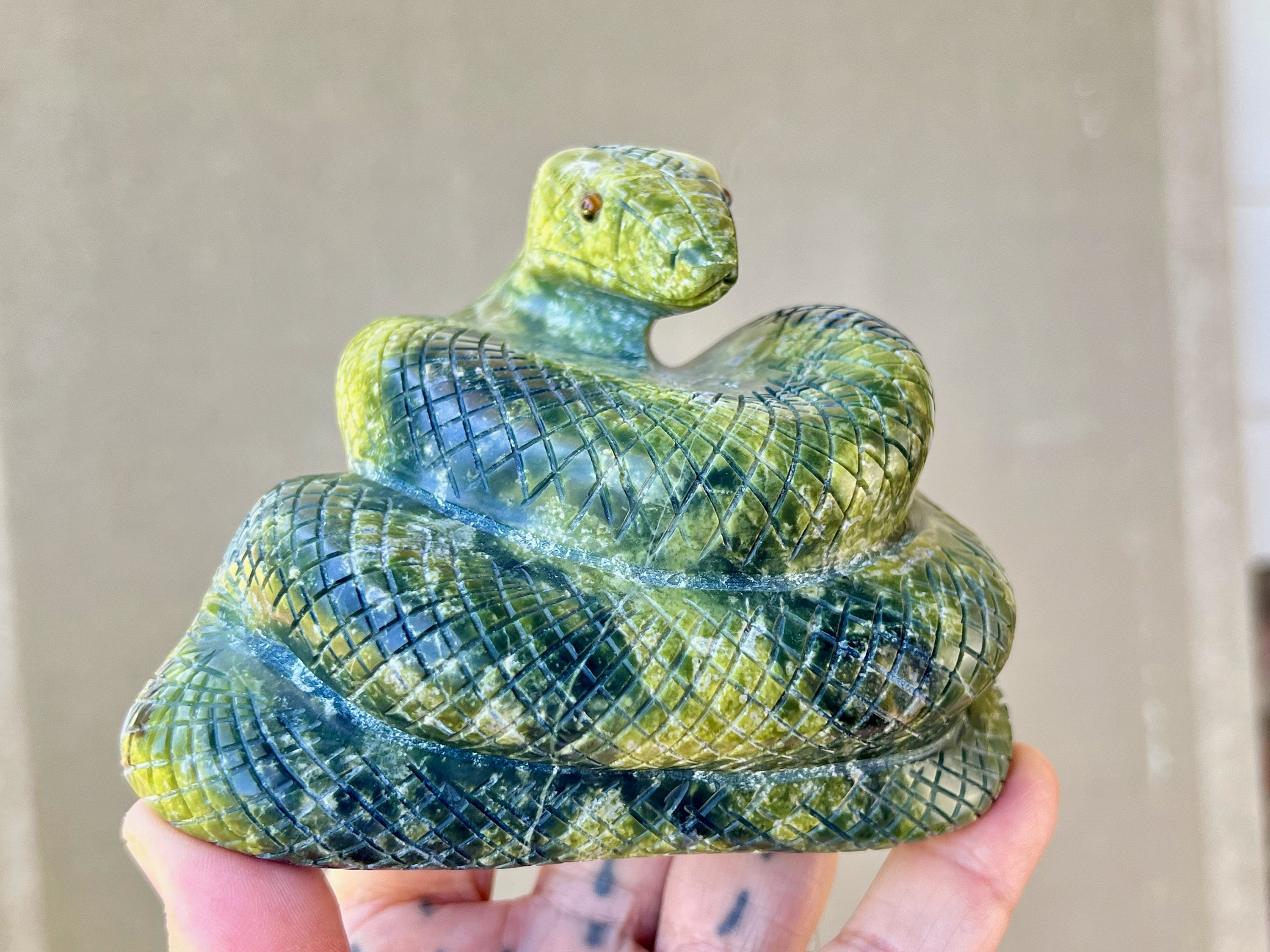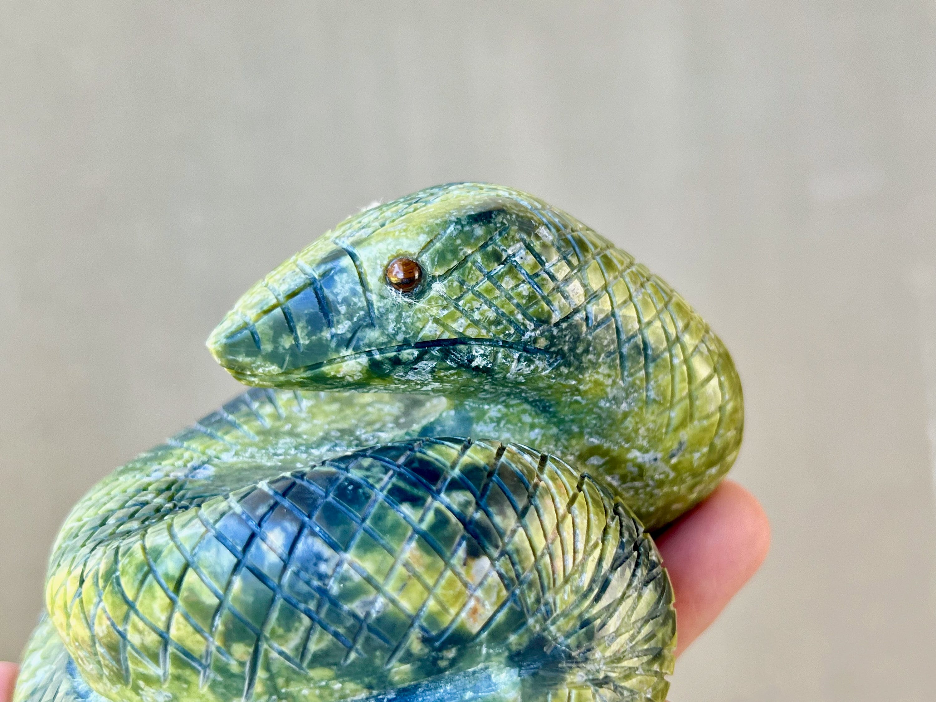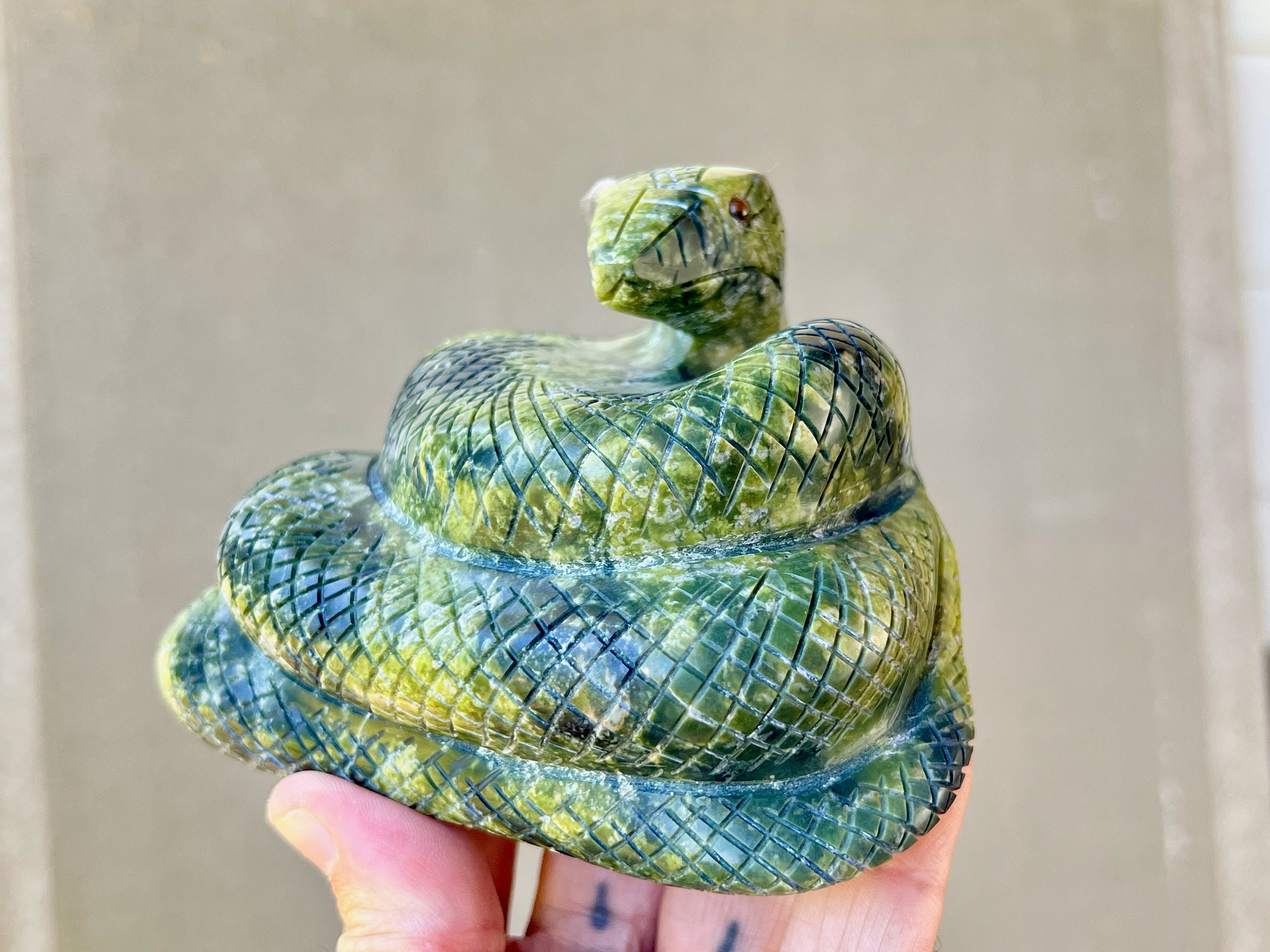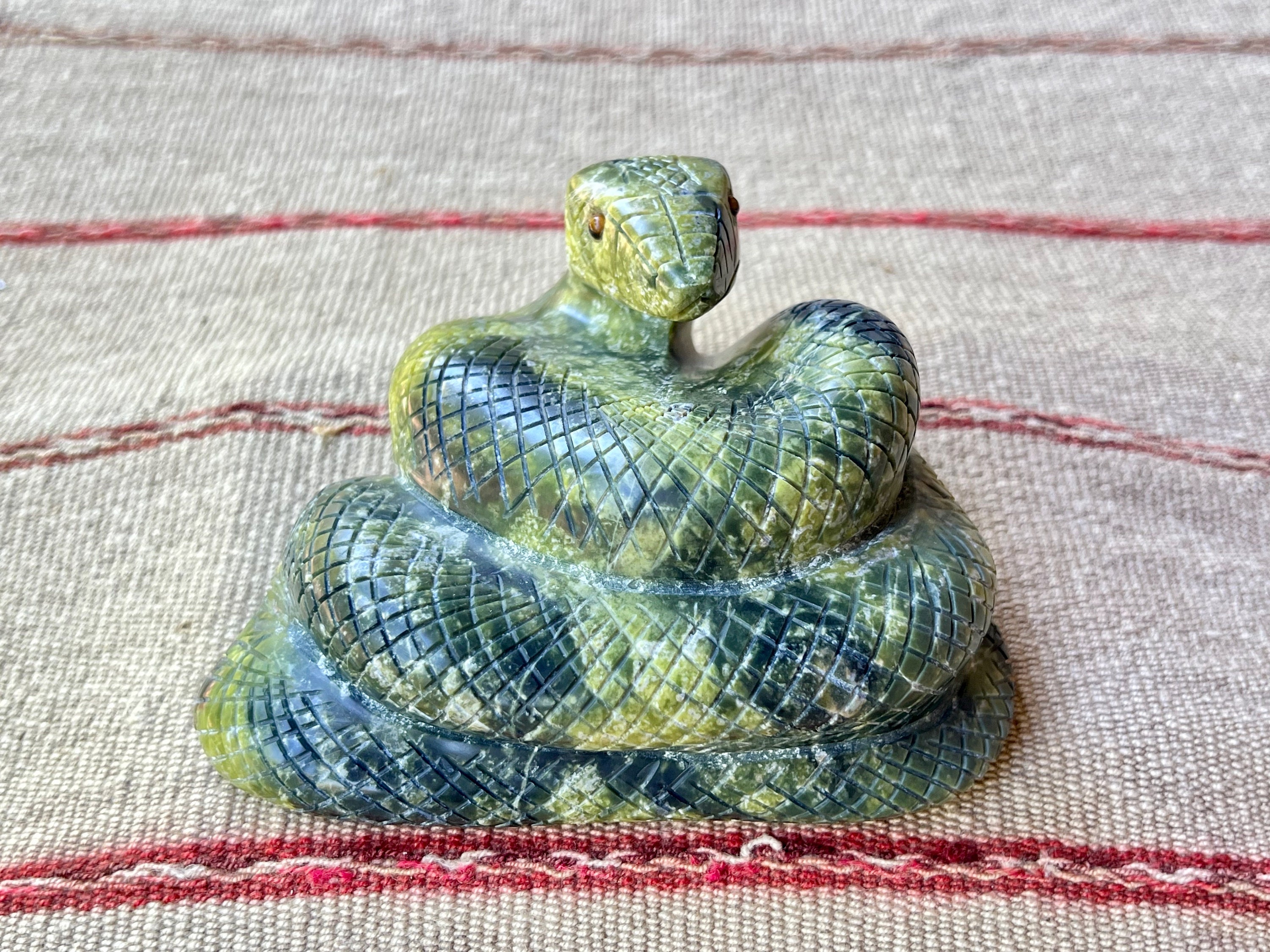 This exquisite Snake totem statue was hand carved from native Andean Serpentine Stone by Artist Ozwaldo Perez in Peru's Sacred Valley.