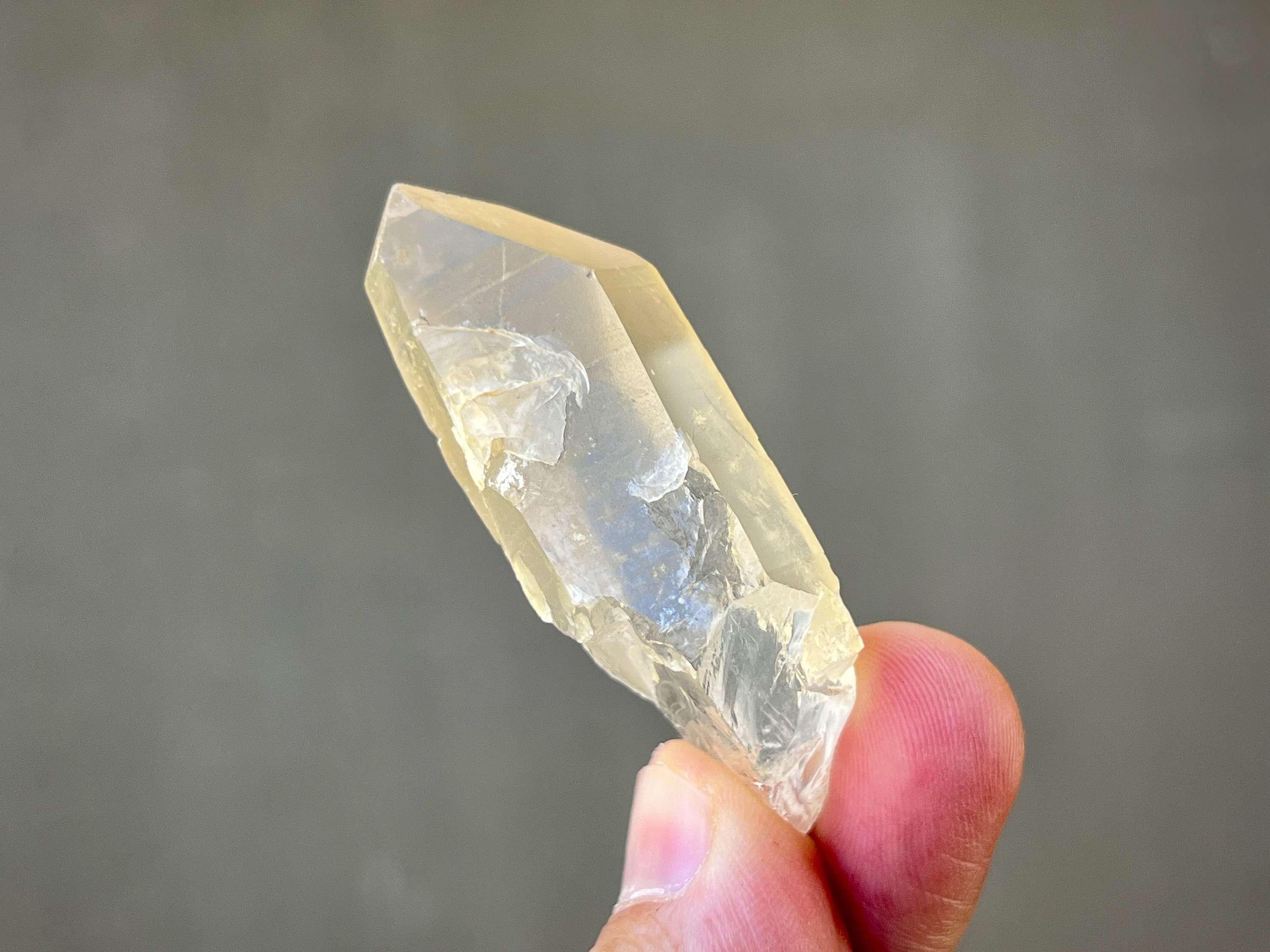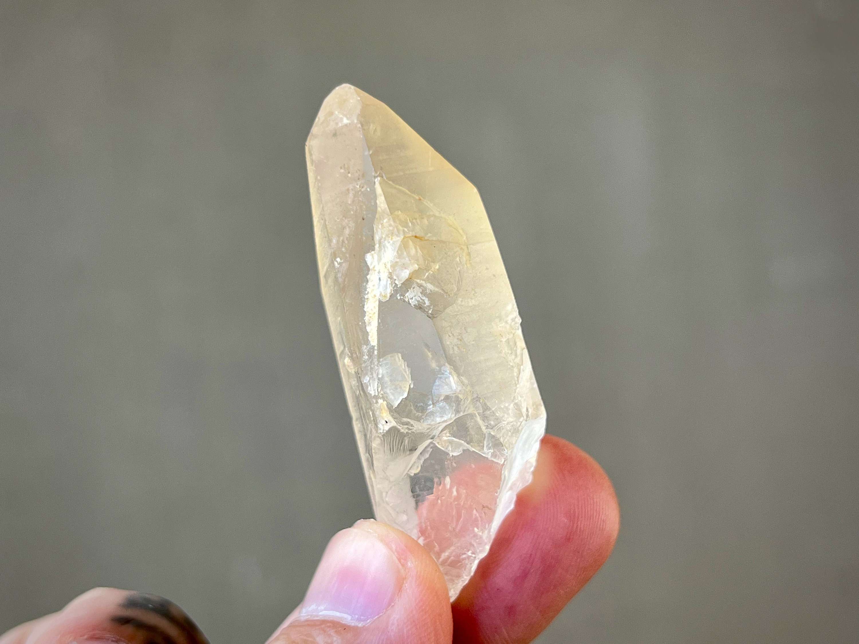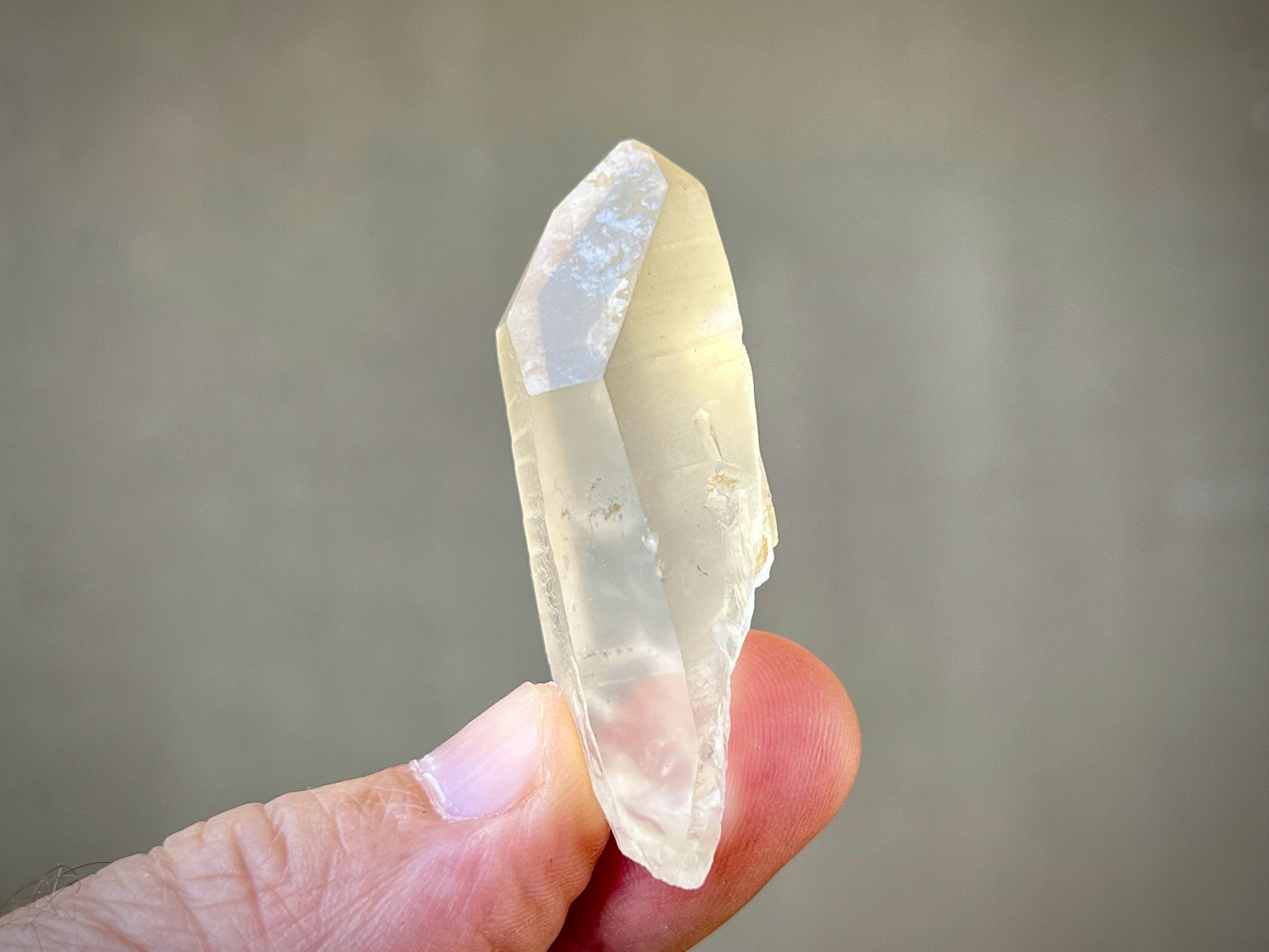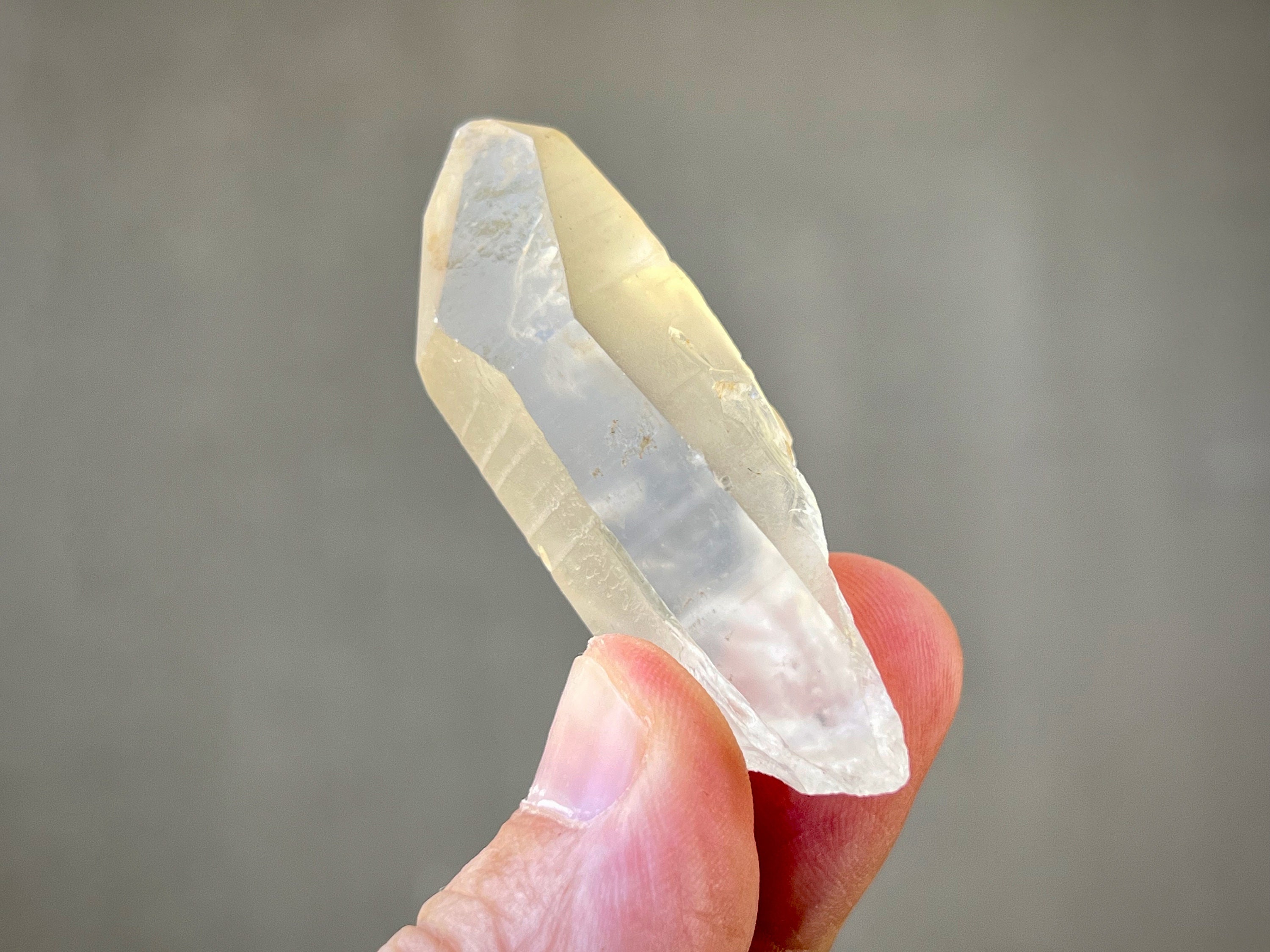 Lovely clarity and a mild golden hue to this pretty Golden Healer Lemurian Quartz point with nicely defined Lemurian lines on its sides. This crystal has a 7-sided main facet opposing a 3-sided facet making it a Channeling Crystal (see more on this below). Nice termination as well.