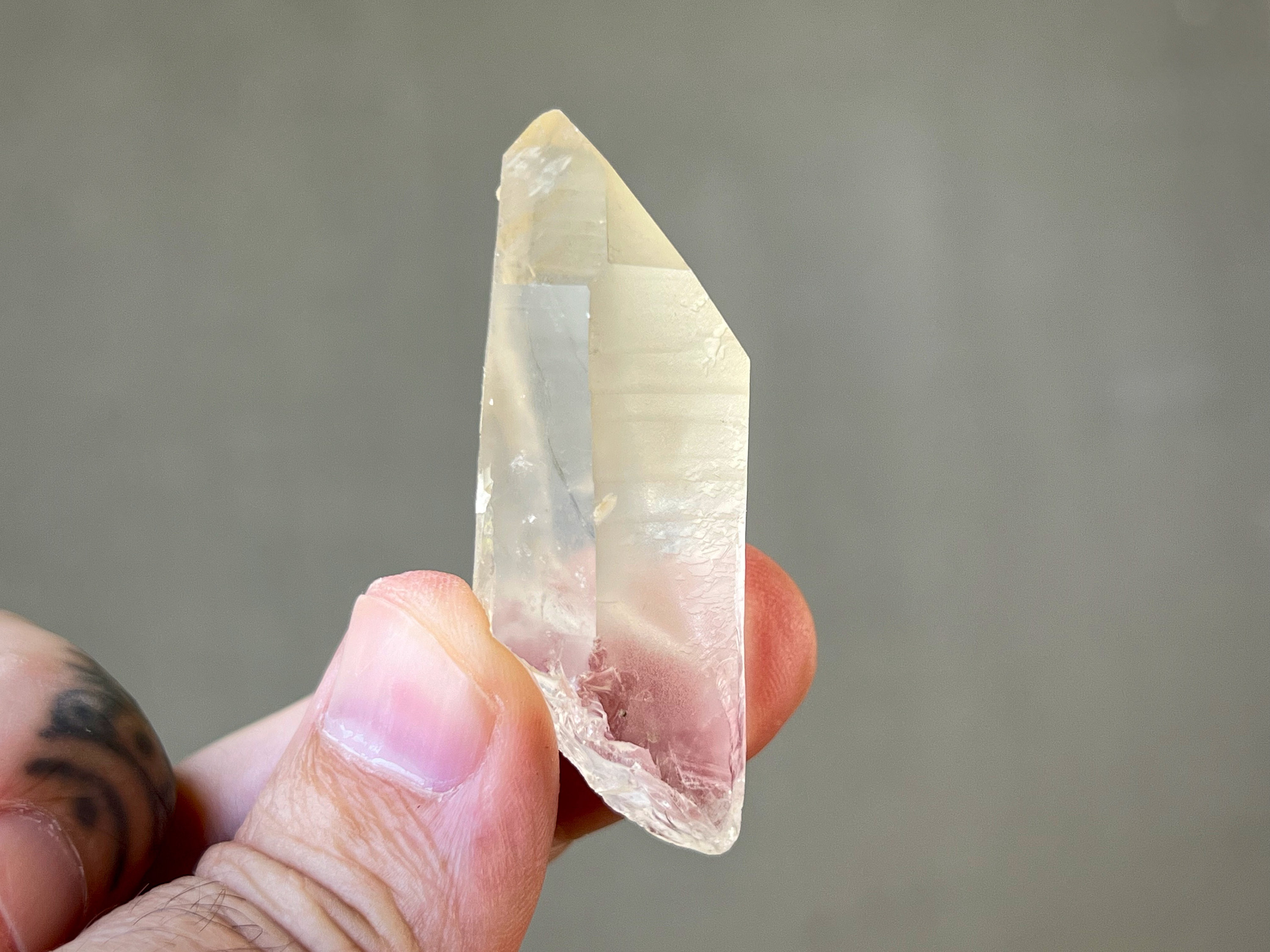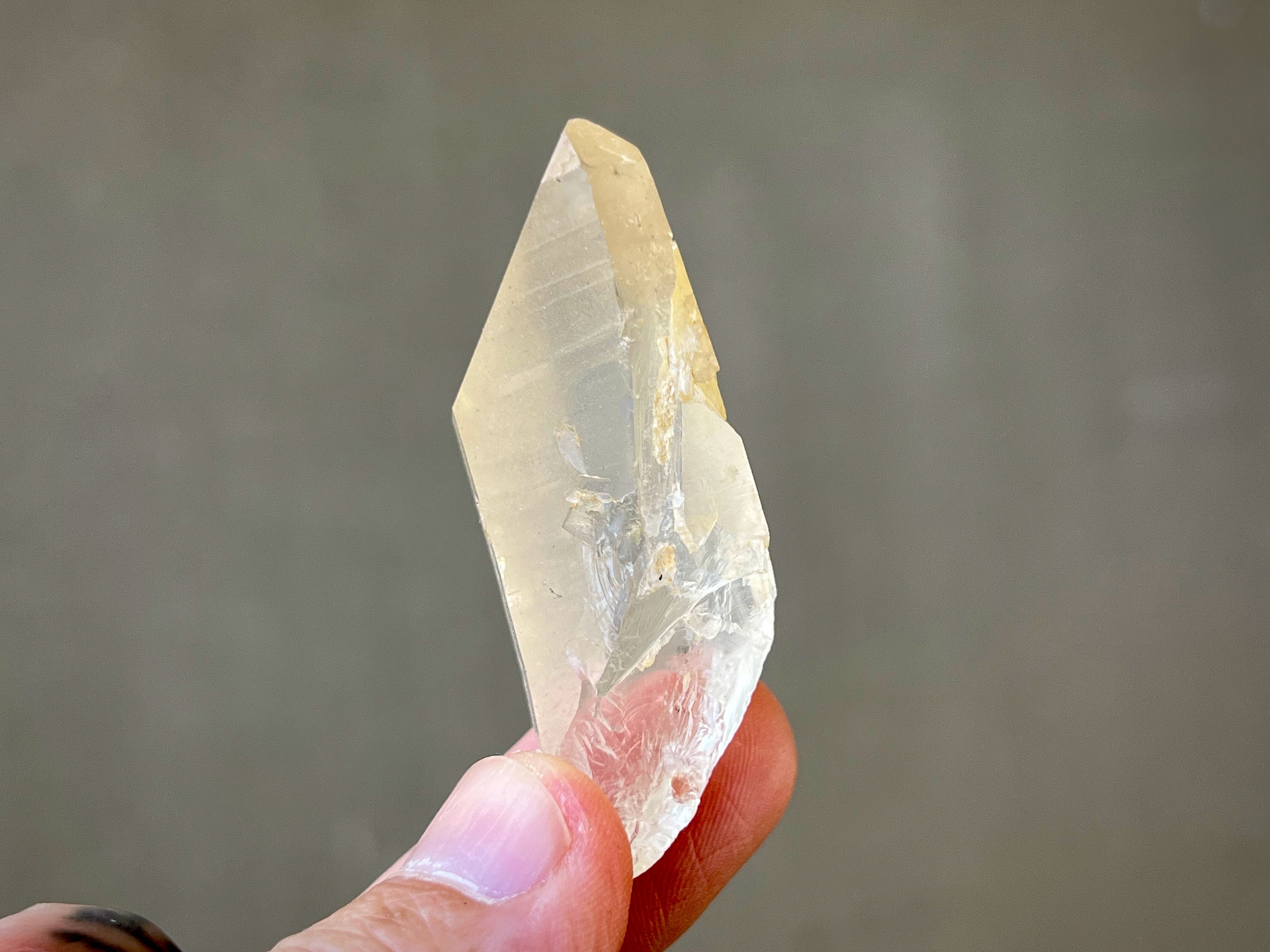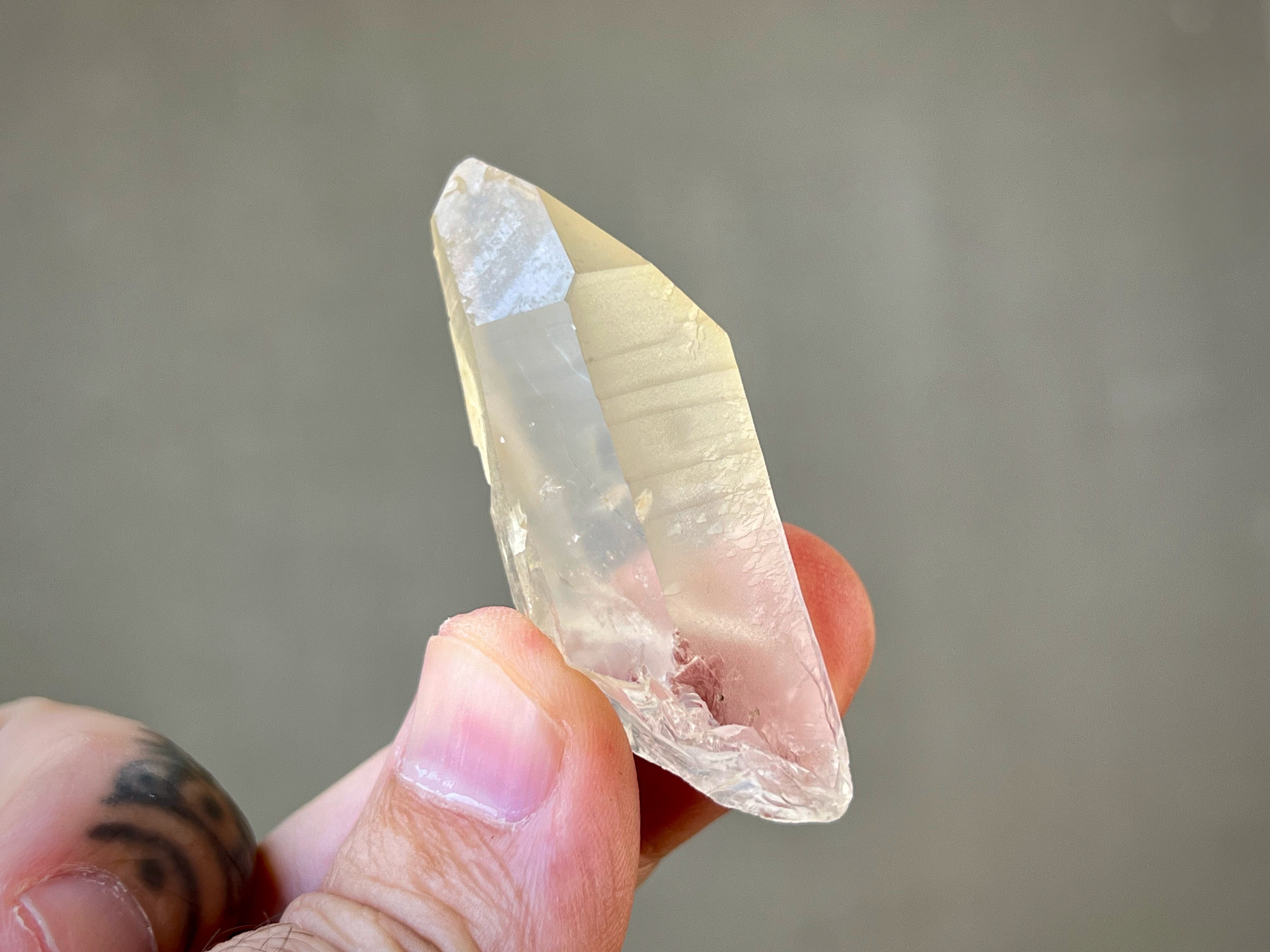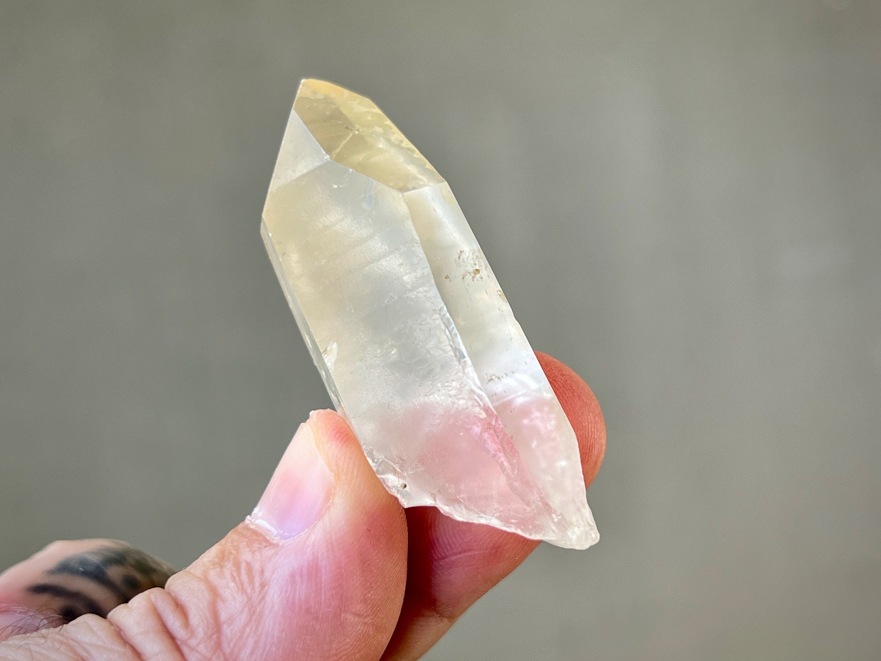 Lovely clarity and a mild golden hue to this pretty Golden Healer Lemurian Quartz point with nicely defined Lemurian lines on its sides. This crystal has a 7-sided main facet opposing a 3-sided facet making it a Channeling Crystal (see more on this below). Nice termination as well.