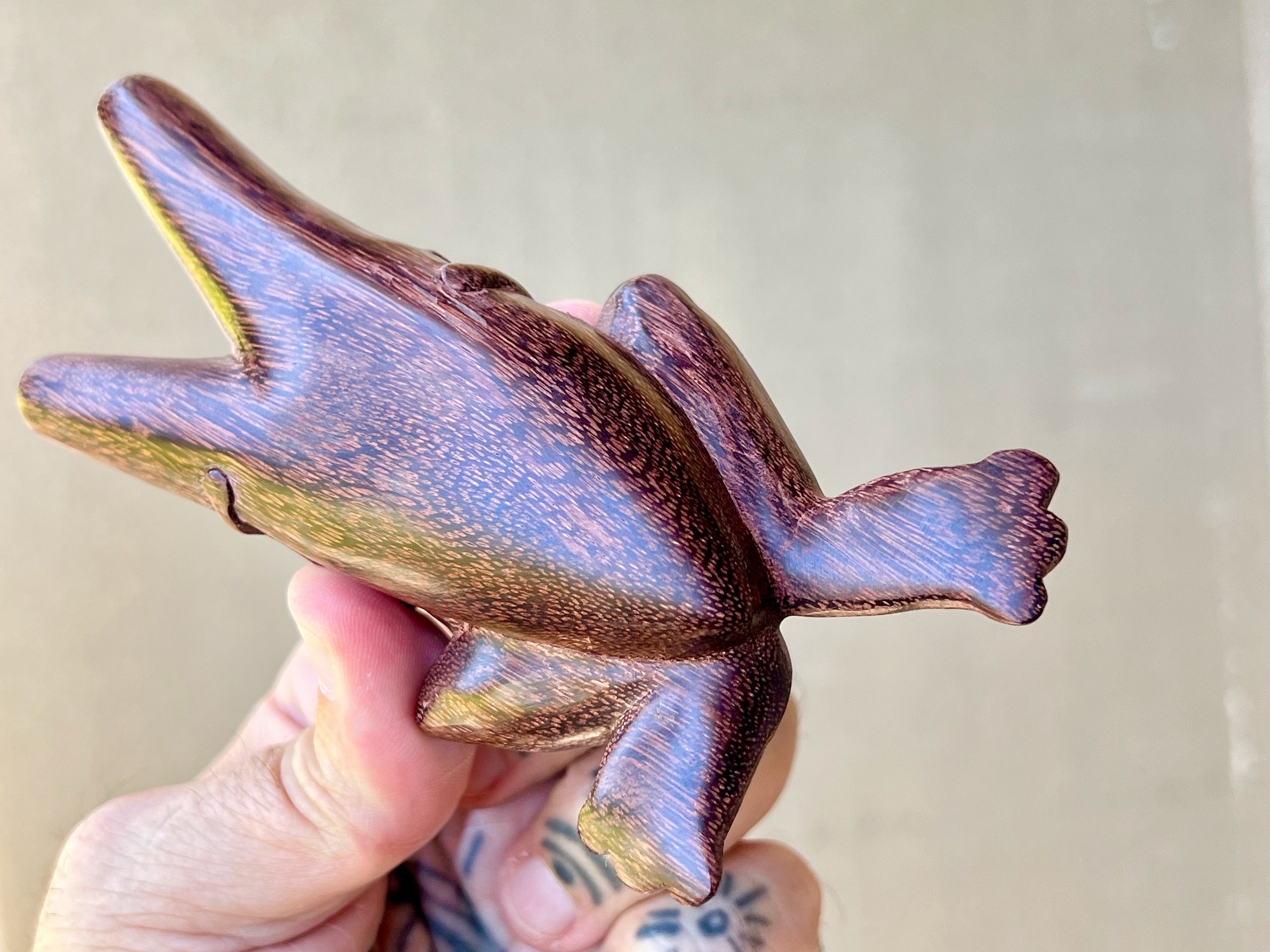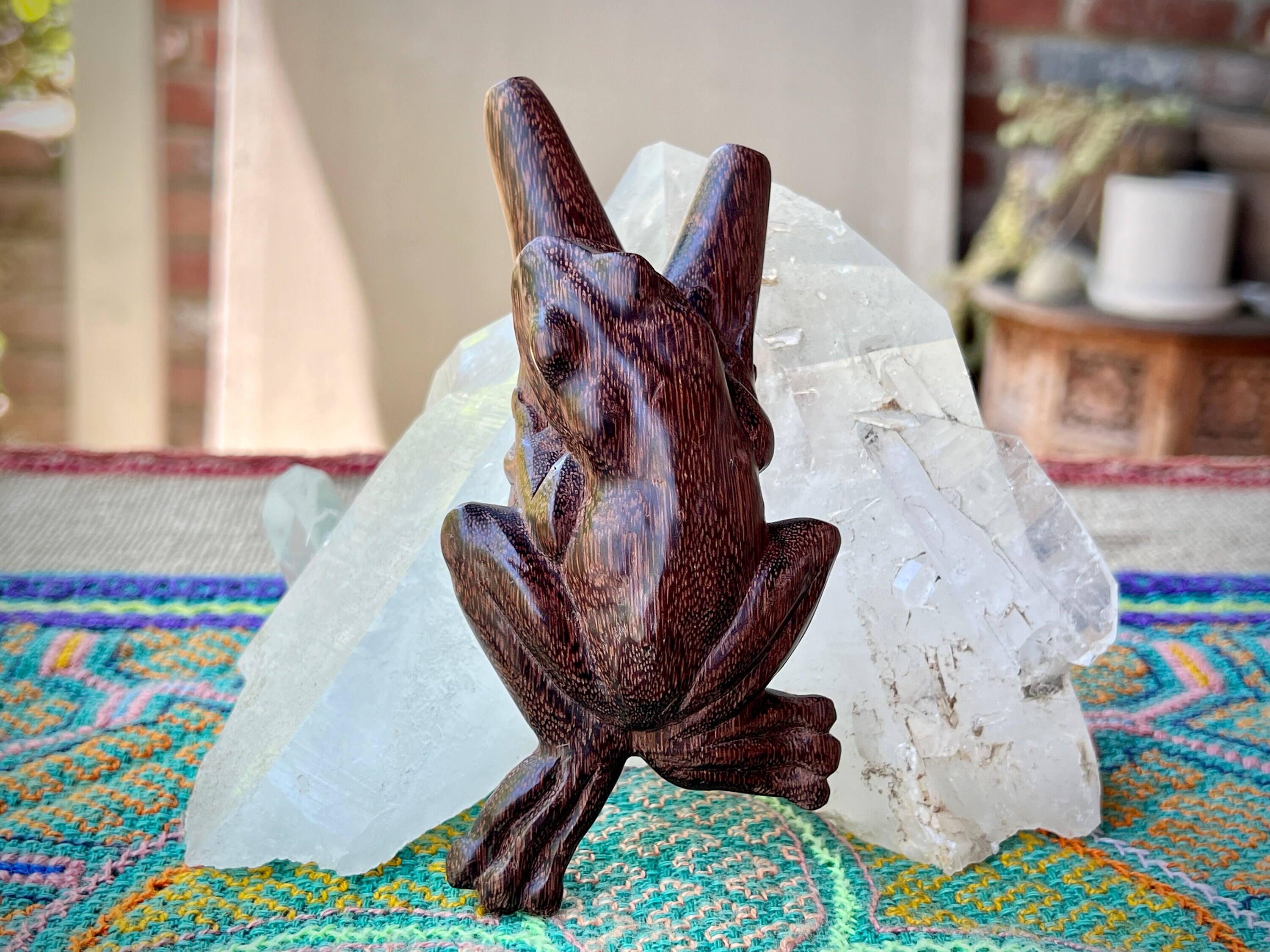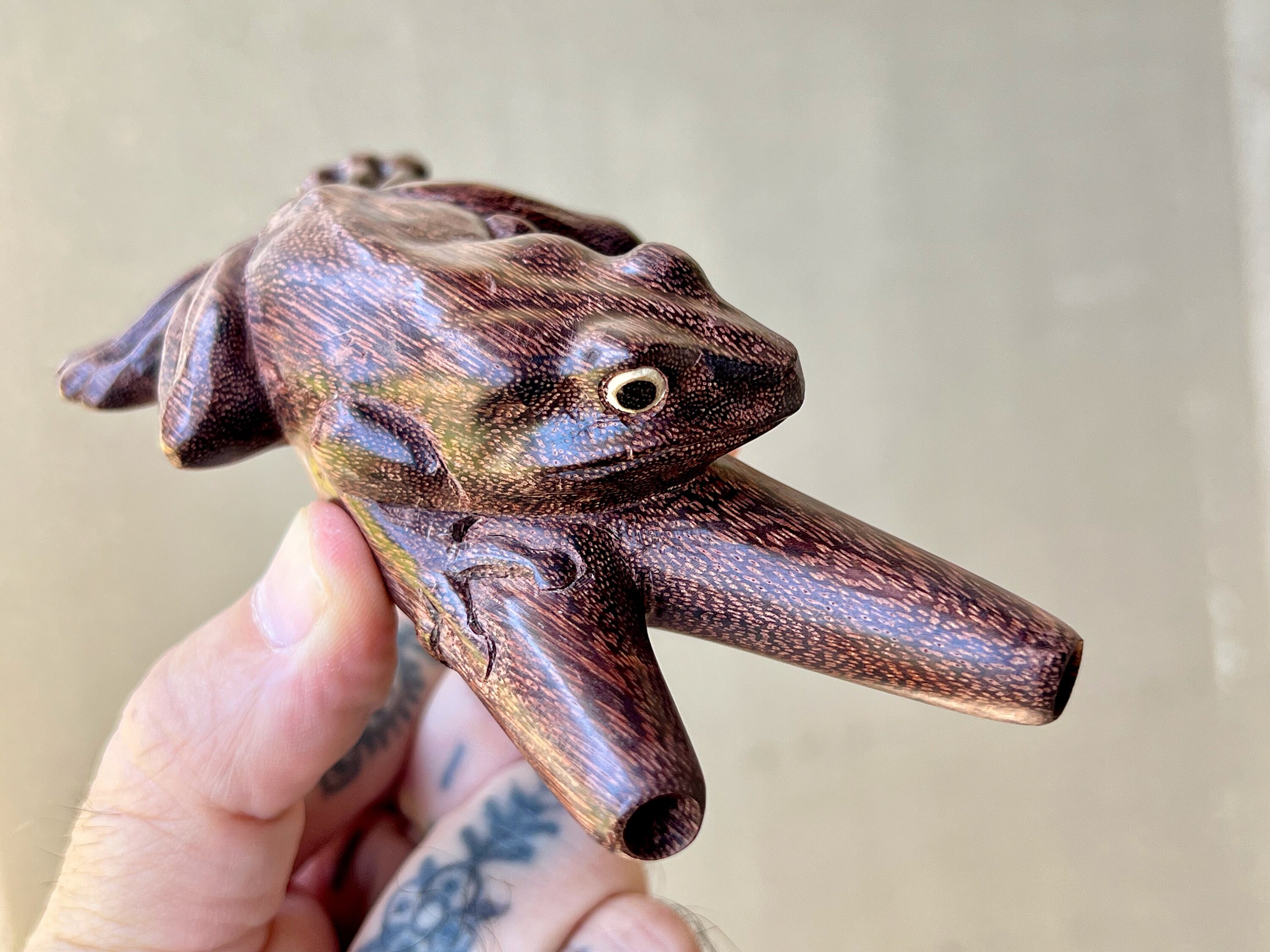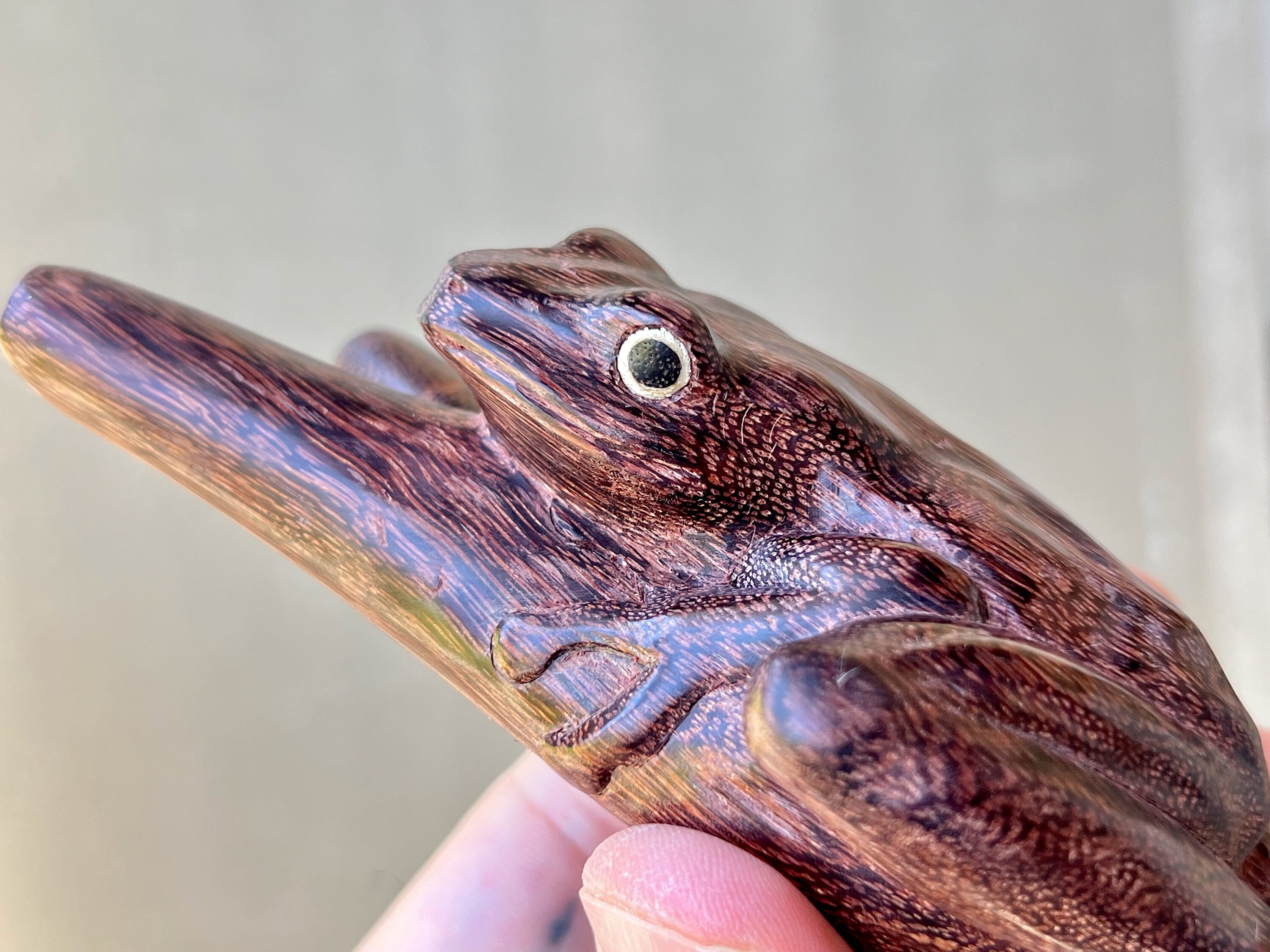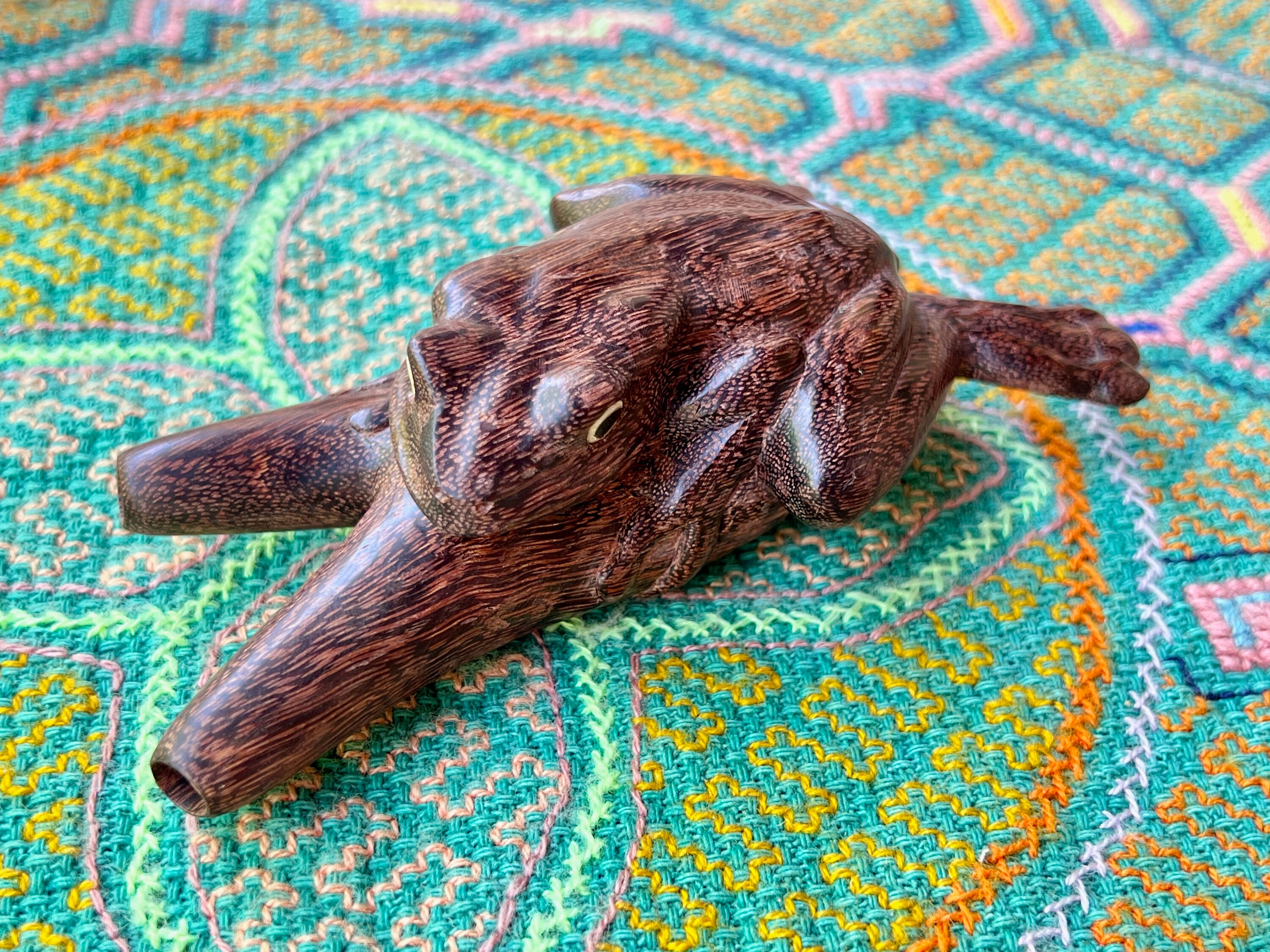 This kuripe features the most charming carving of a giant Monkey Tree Frog, an Amazonian frog whose secretions are used in healing ceremonies. It is carved from a single block of dark Tamarind Wood, a very hard wood that is weighty and dense like stone. Wonderful craftsmanship and functionality on this great kuripe.