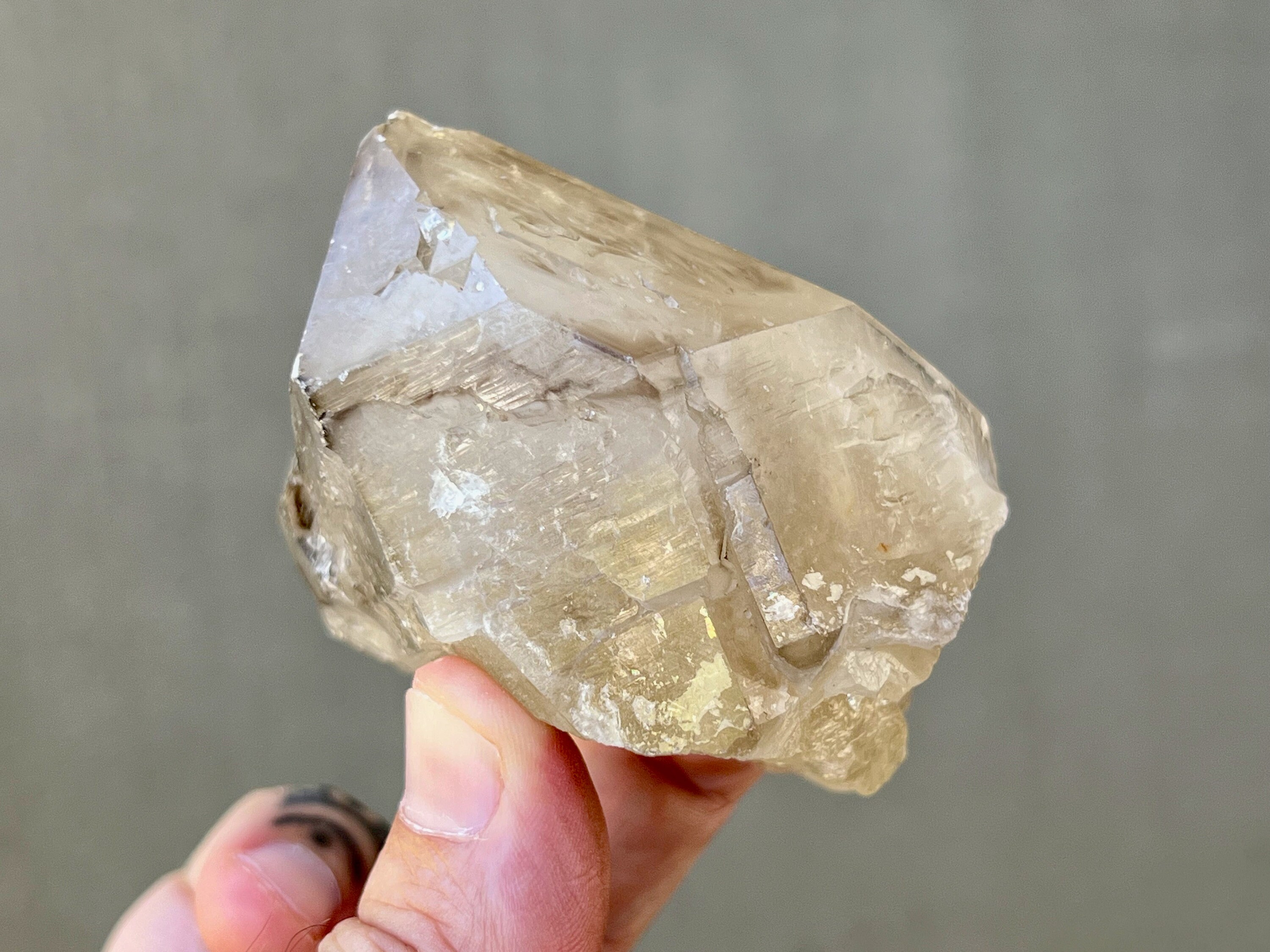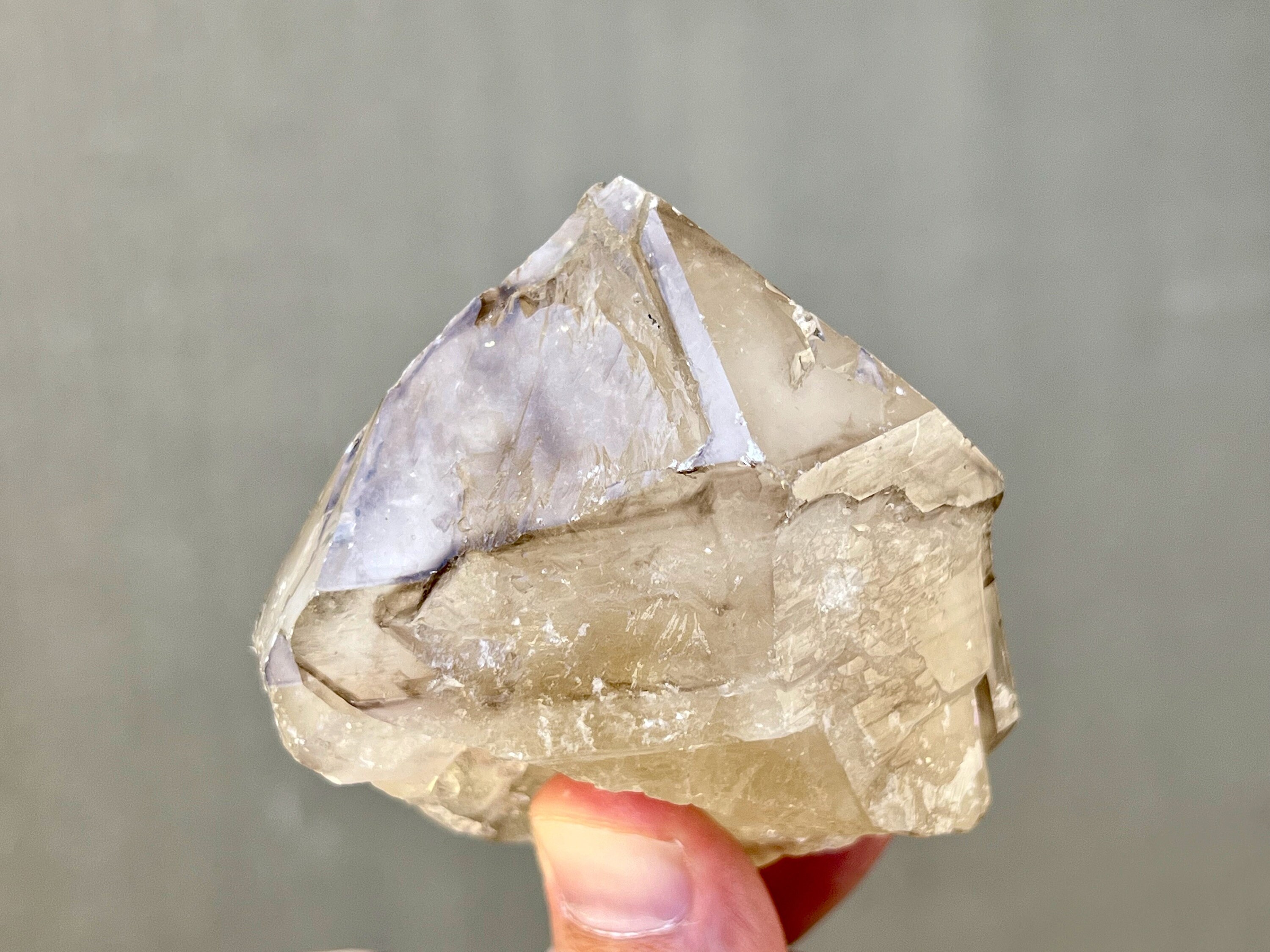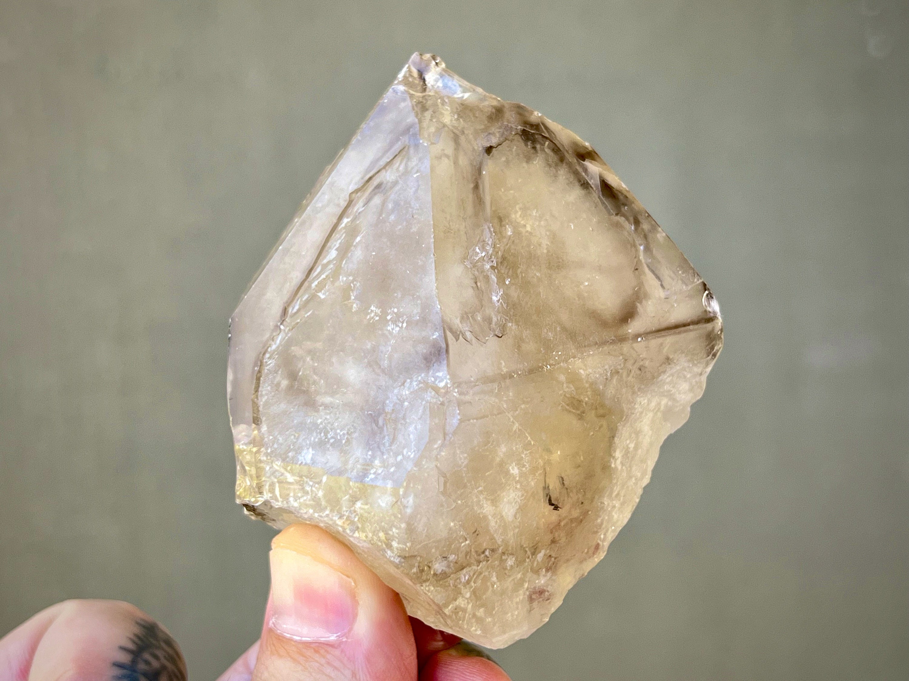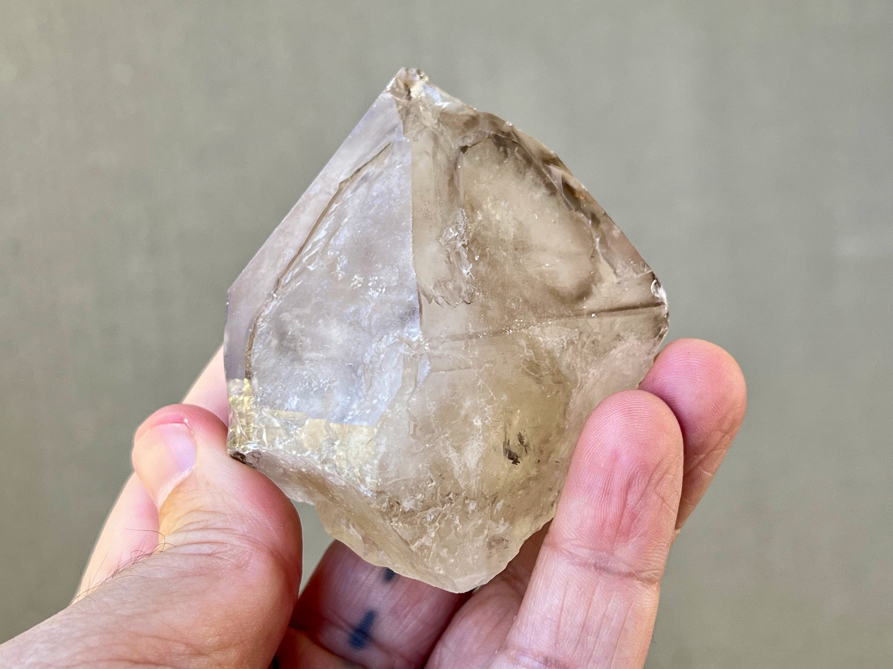 Lovely diamond shaped Elestial Quartz with some smoky highlights and a mild golden glow from Citrine inclusion. This crystal has some triangular impressions on the main facets that are akin to what we see in "skeletal quartz," specifically on the back main facet, as well some milder etchings throughout as well. The quartz itself is a mix of a milky core with a bit more of a clear overgrowth. There is a minor chip to the top of the right main facet that mildly "kisses" the termination. This crystal has a naturally flat base so it will sit upright nicely for display.
