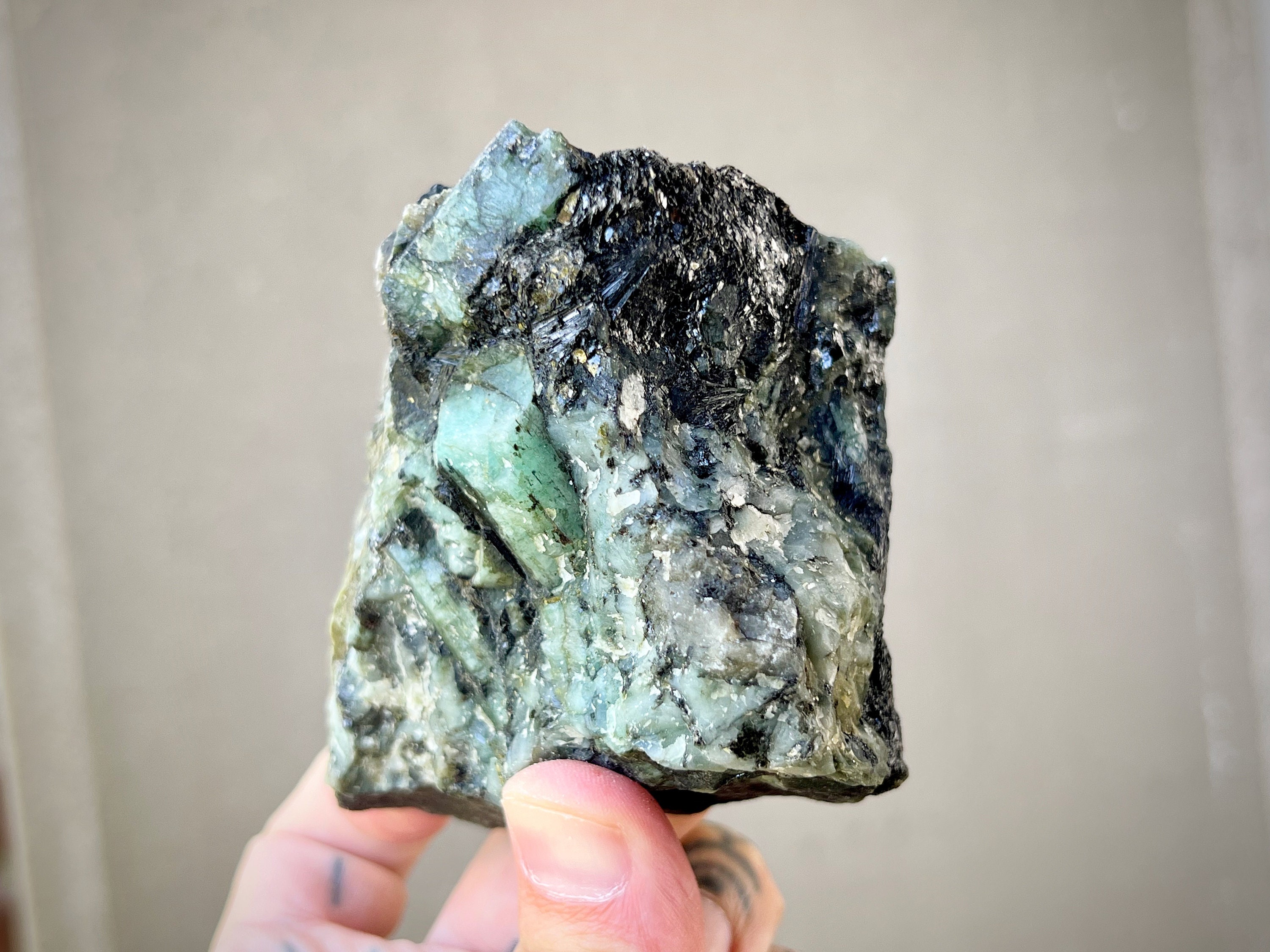Such a large and beautiful raw Emerald, in its natural form, with a vibrant green hue, against a deep black matrix. The contrast of colors make this a real stunner, and there is so much actual Emerald in here (versus matrix) it is really lovely.