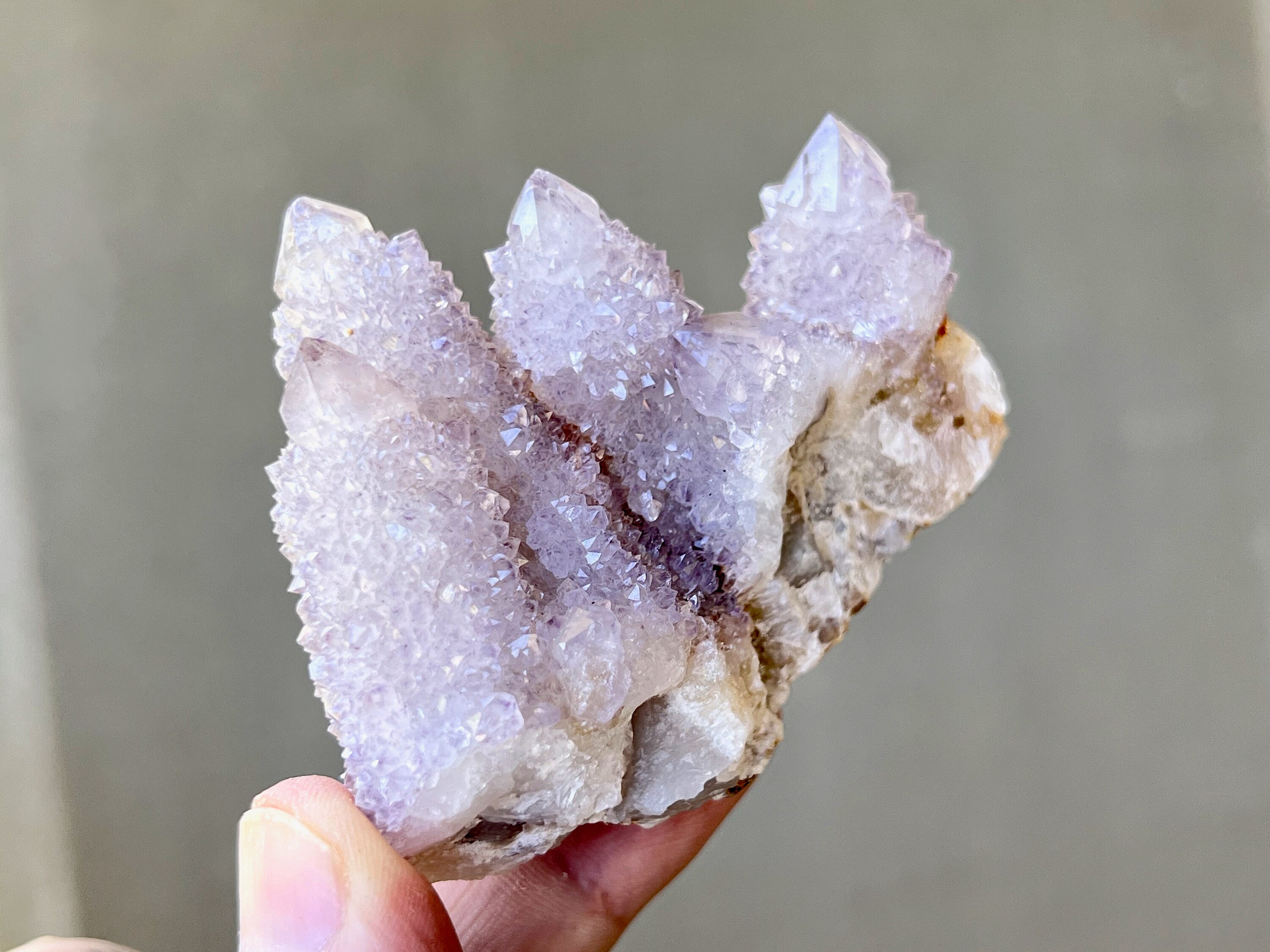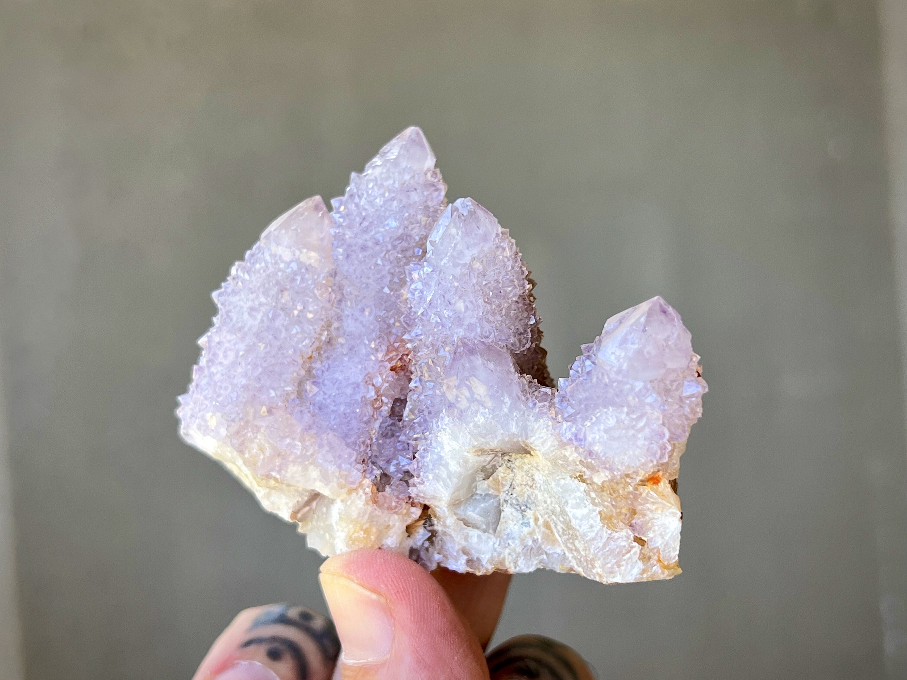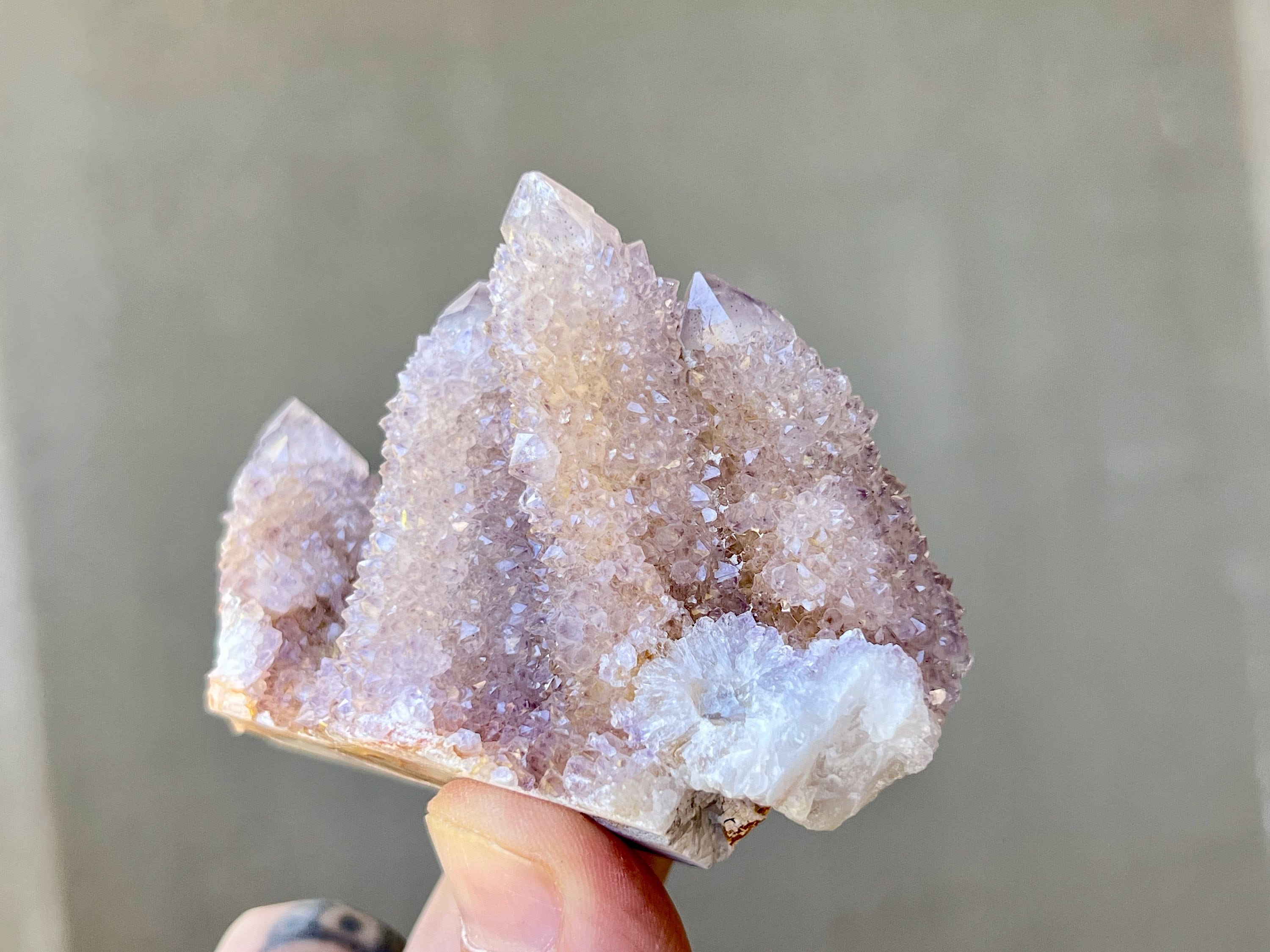 Sometimes called “Cactus Quartz” due to their unique growth pattern or even "Fairy Quartz," these ethereal crystals are entirely natural and include a combination of Quartz and Amethyst (as well as Citrine in some instances), and are characterized by tiny, druzy crystals covering the entire shaft of the primary crystal. Spirit Quartz is a crystal associated with the Crown Chakra, though it activates all chakras. It is a wonderful crystal for dream work, astral travel, protection and shamanic journeying.