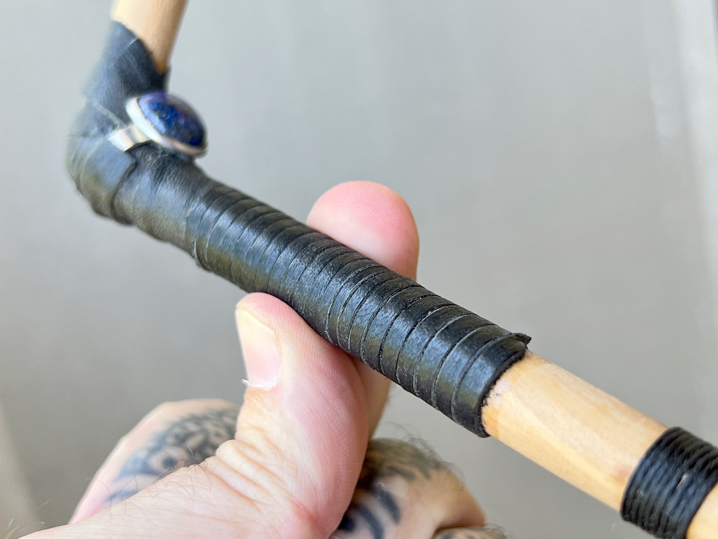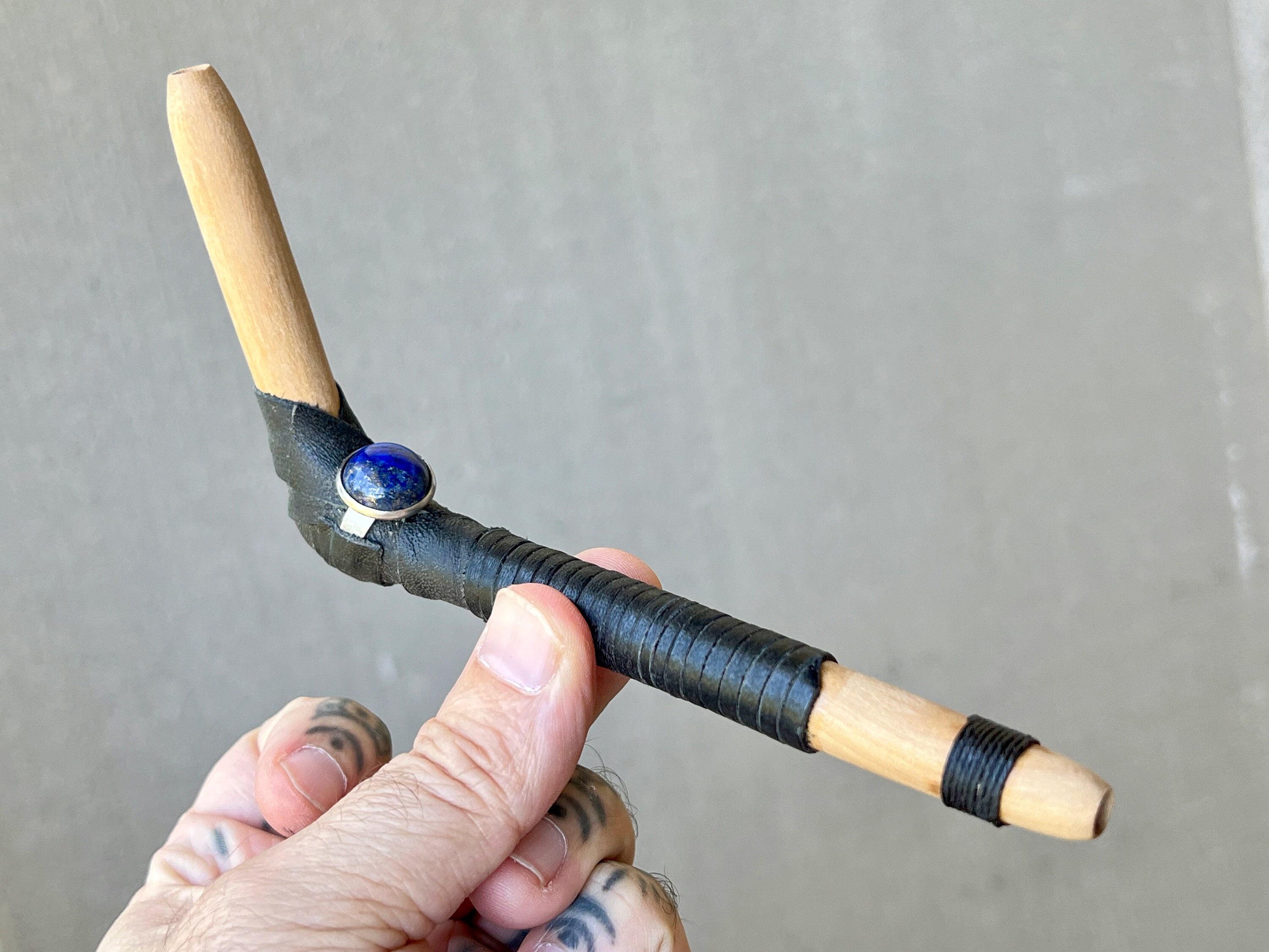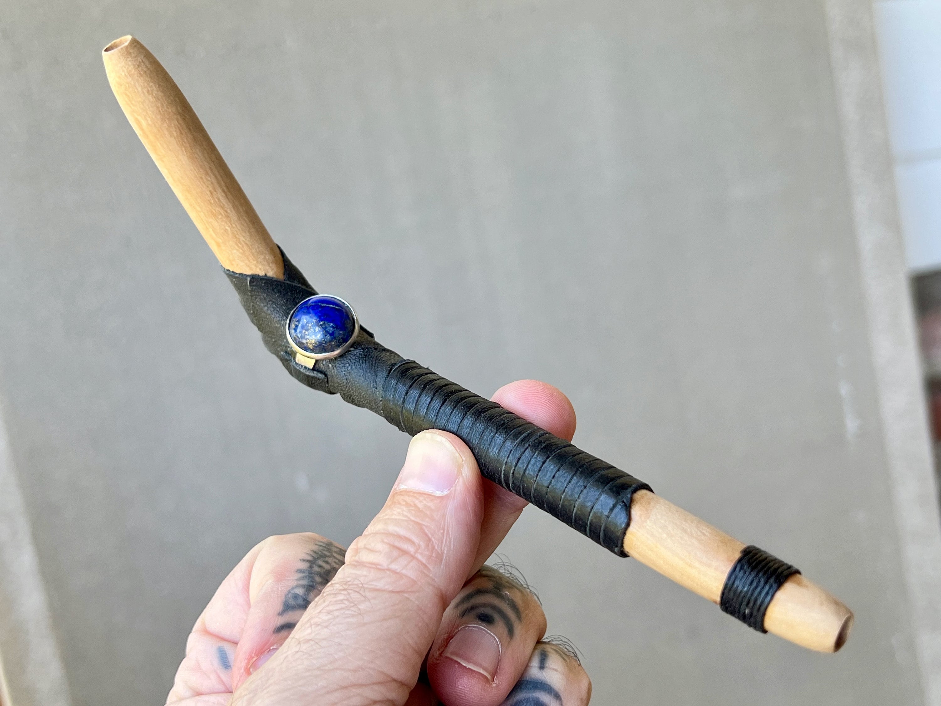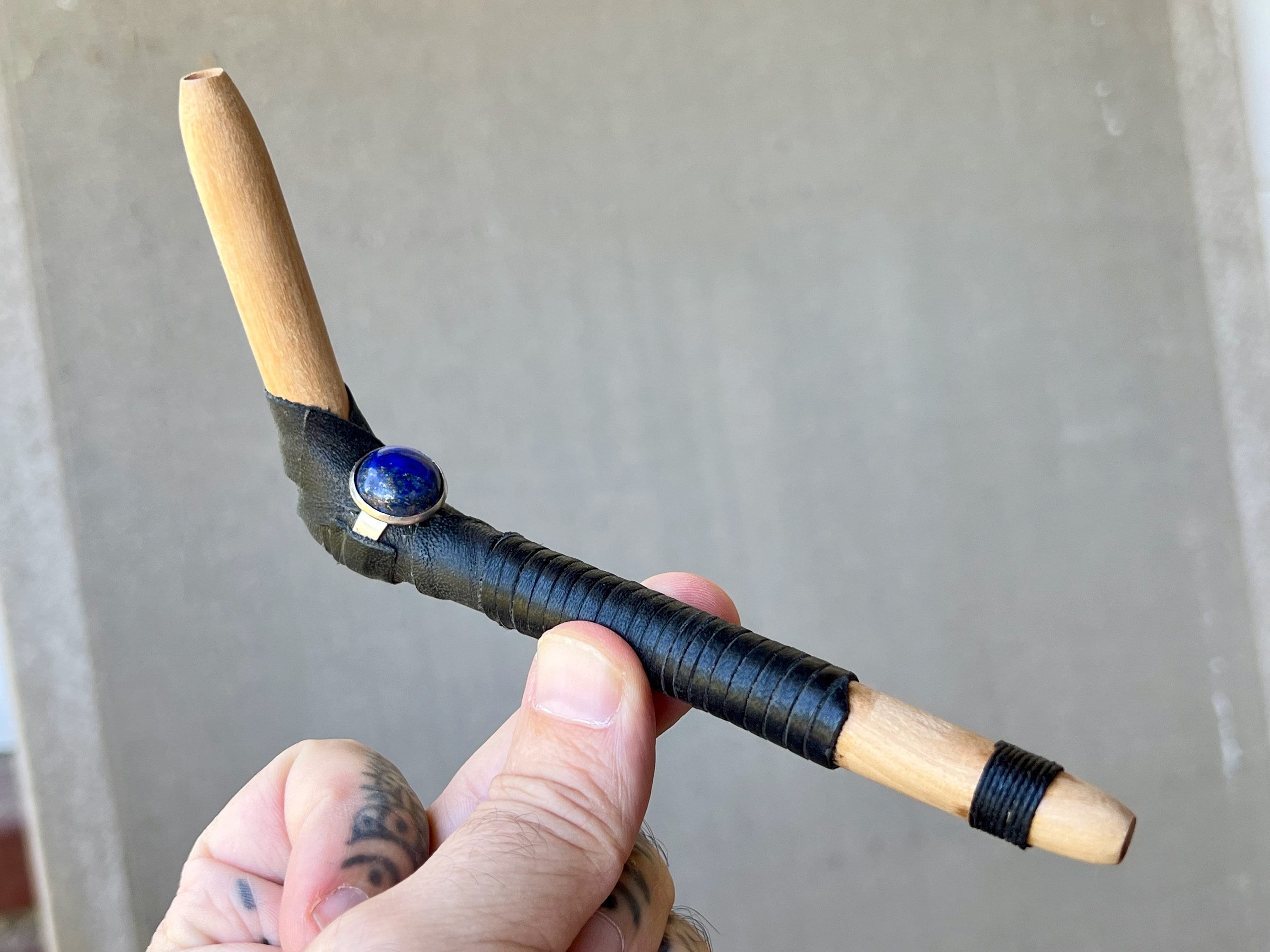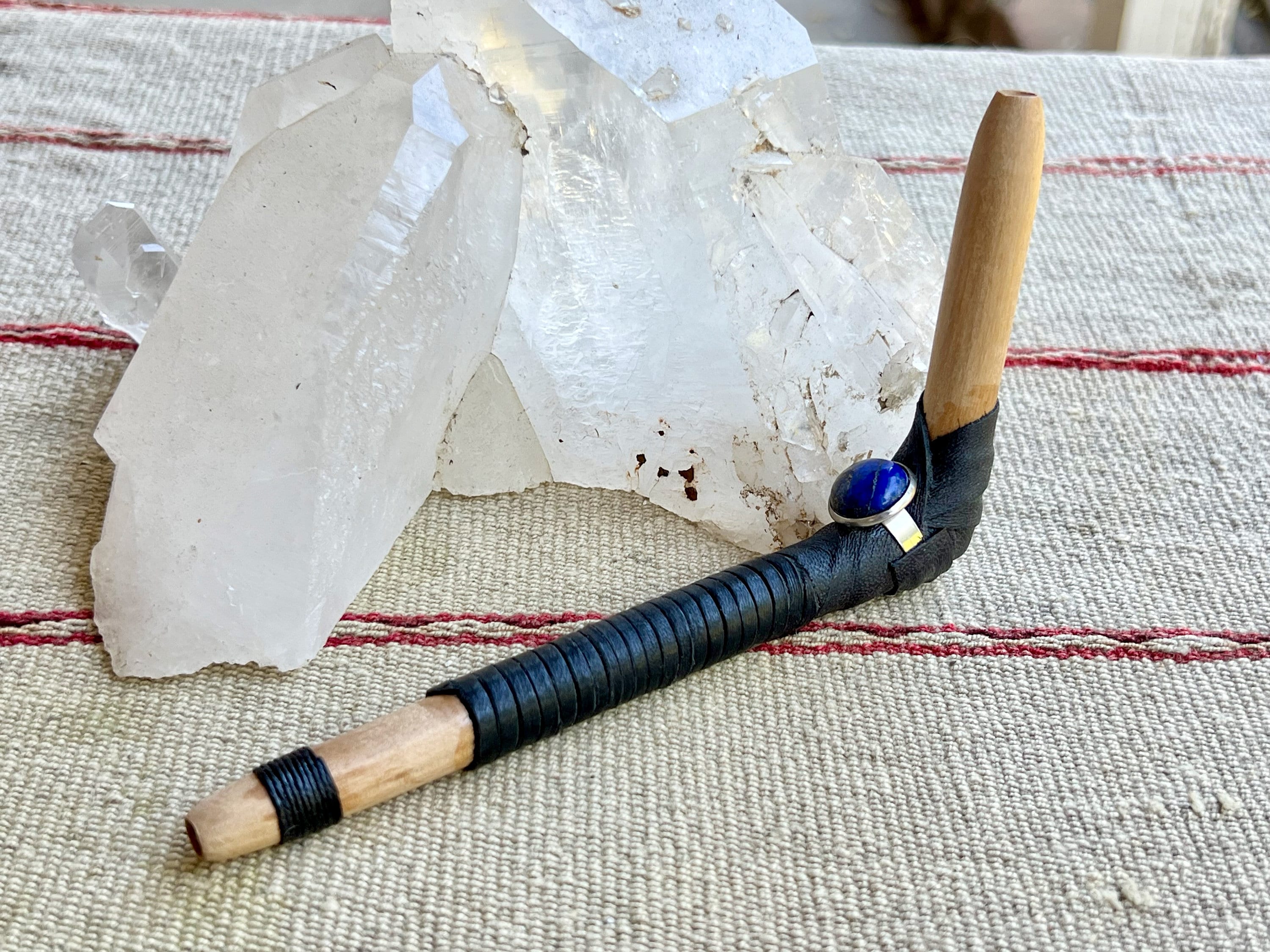 This tepi pipe has been hand crafted from natural Beech wood, adorned with leather and waxed Irish linen threading, and a Lapiz Lazuli stone inlay.