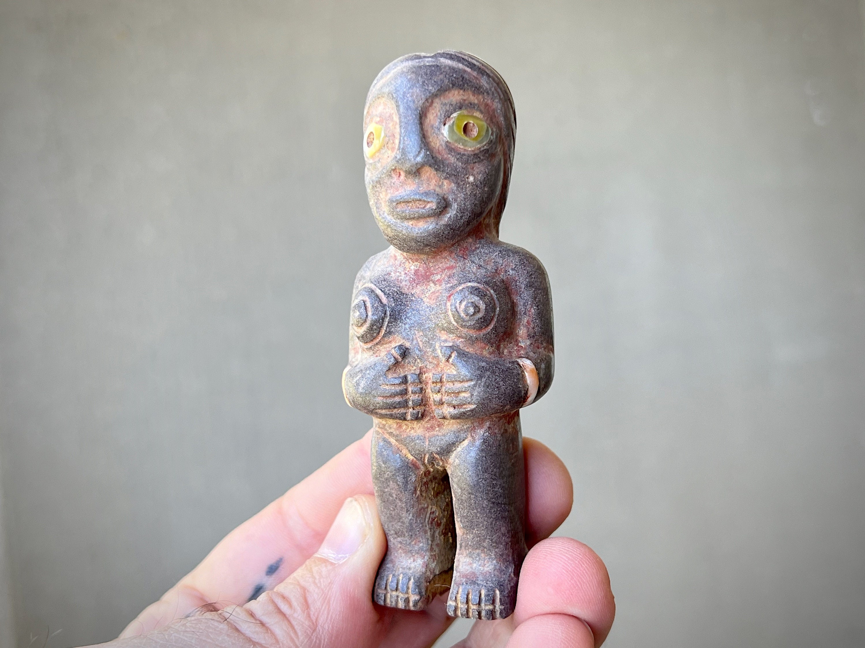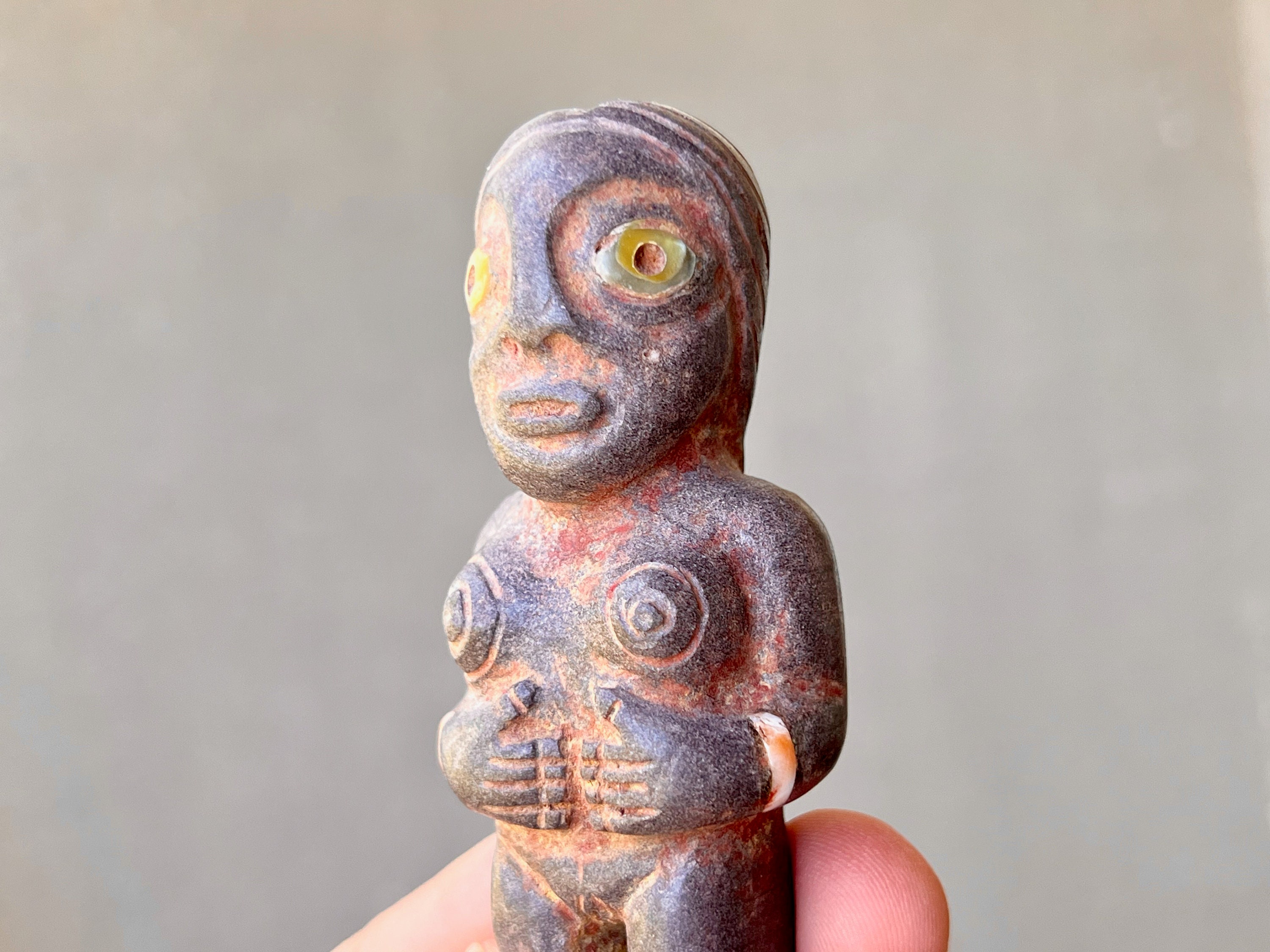 It is masterfully carved from solid native stone, found in the areas surrounding Machu Picchu in Peru's Sacred Valley, and weathered to perfection to give it an ancient patina. It is a charming and magical characterization, she really comes to life in the details here. This statue stands perfectly upright on its own natural base and would make a powerful statement piece for home, meditation room or plant medicine altar.