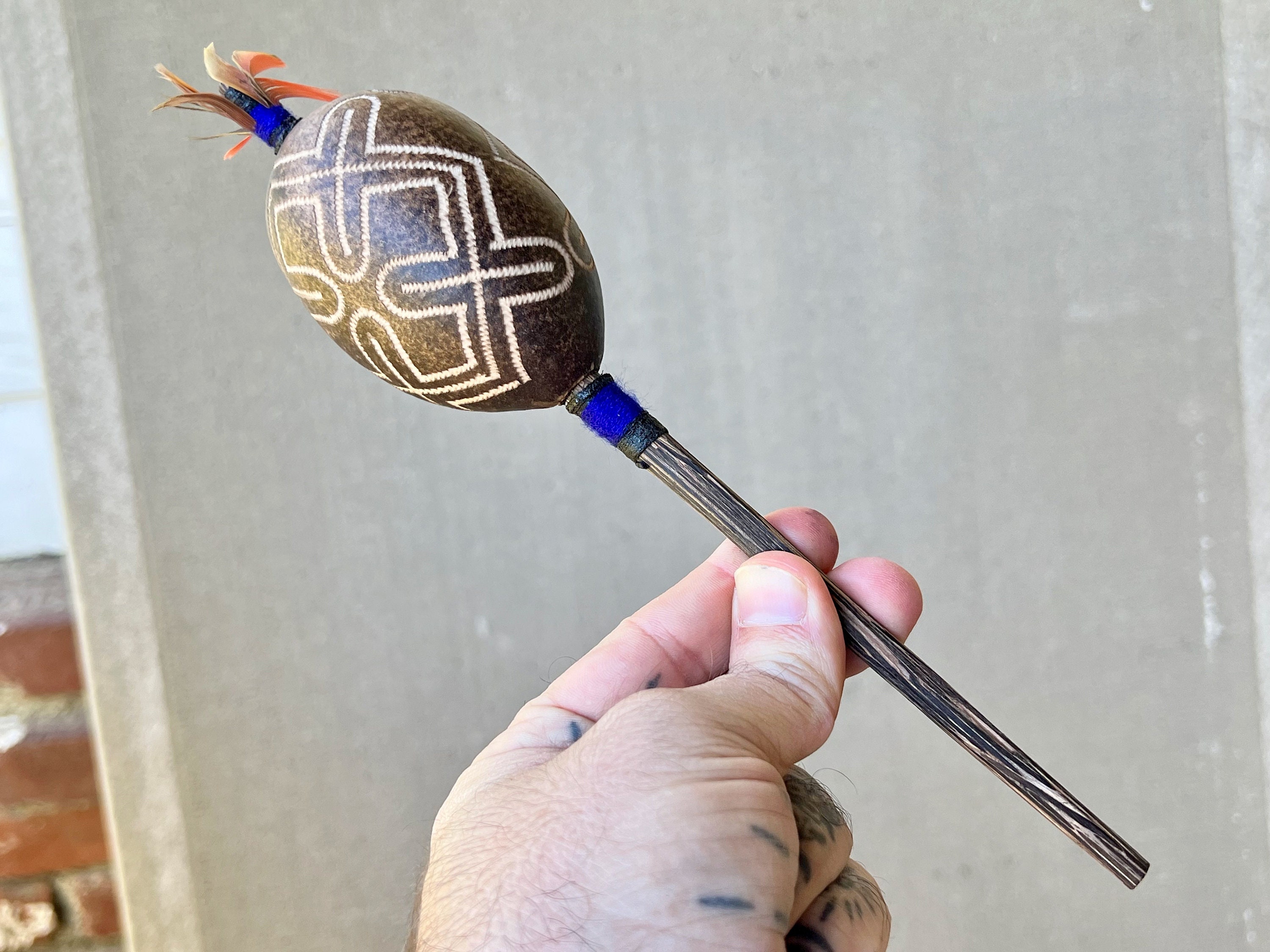 Tone: Mid-to-High Range / Quiet, muted, gentle. Because it's a smaller rattle, the tone is a lot more gentle and muted. It's a pretty tone for quiet songs and intimate healings.