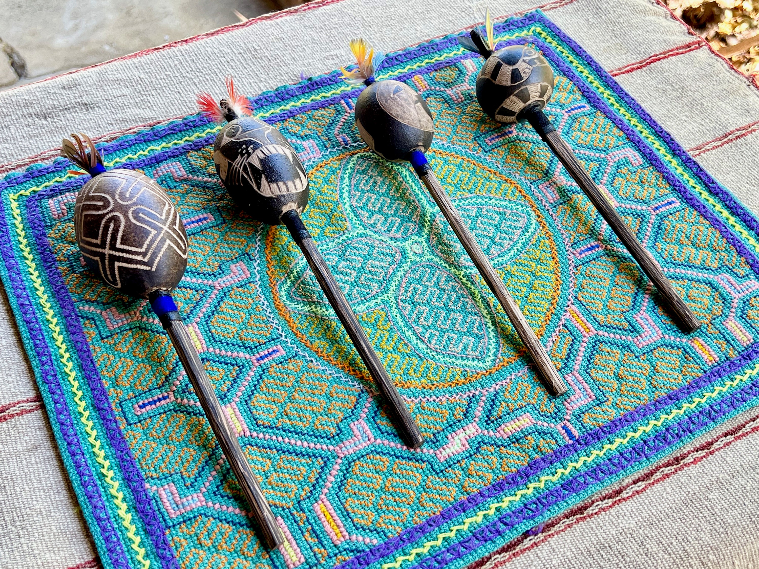 These traditional rattles are a key element in both core shamanism as well as in Peruvian Shamanism and in plant medicine ceremonies. Each rattle has a different pitch (which we do our best to describe) as well as a different hand-adorned design. Most are filled with small seeds and/or small ceramic beads, and made of a natural Gourd and Chonta Wood handle. Once we receive them here, we seal the bottoms (if necessary) with a strong sealant to enforce their strength and ensure that no beads will be lost during use. These are some of the nicest rattles we've come across in our travels.