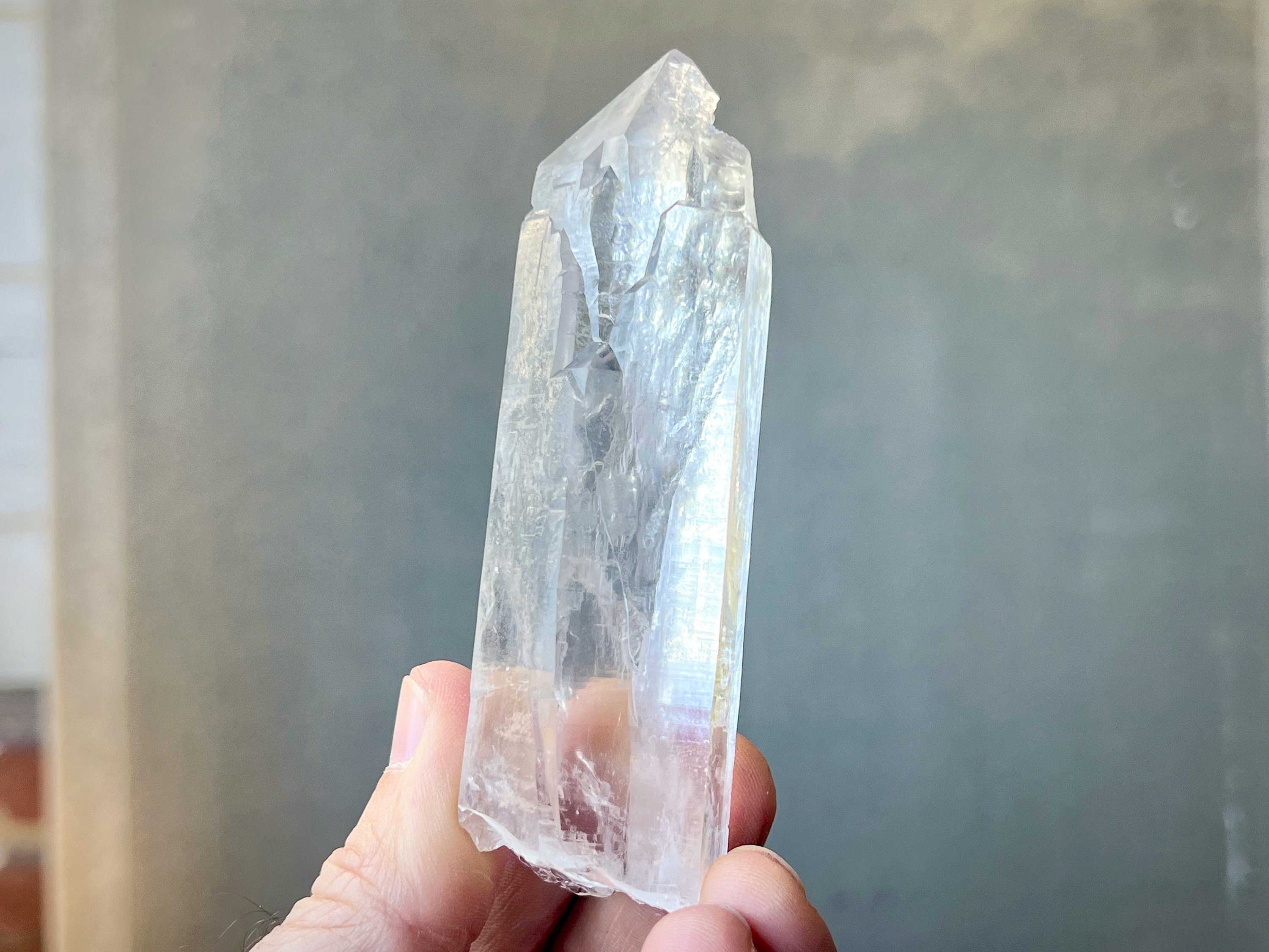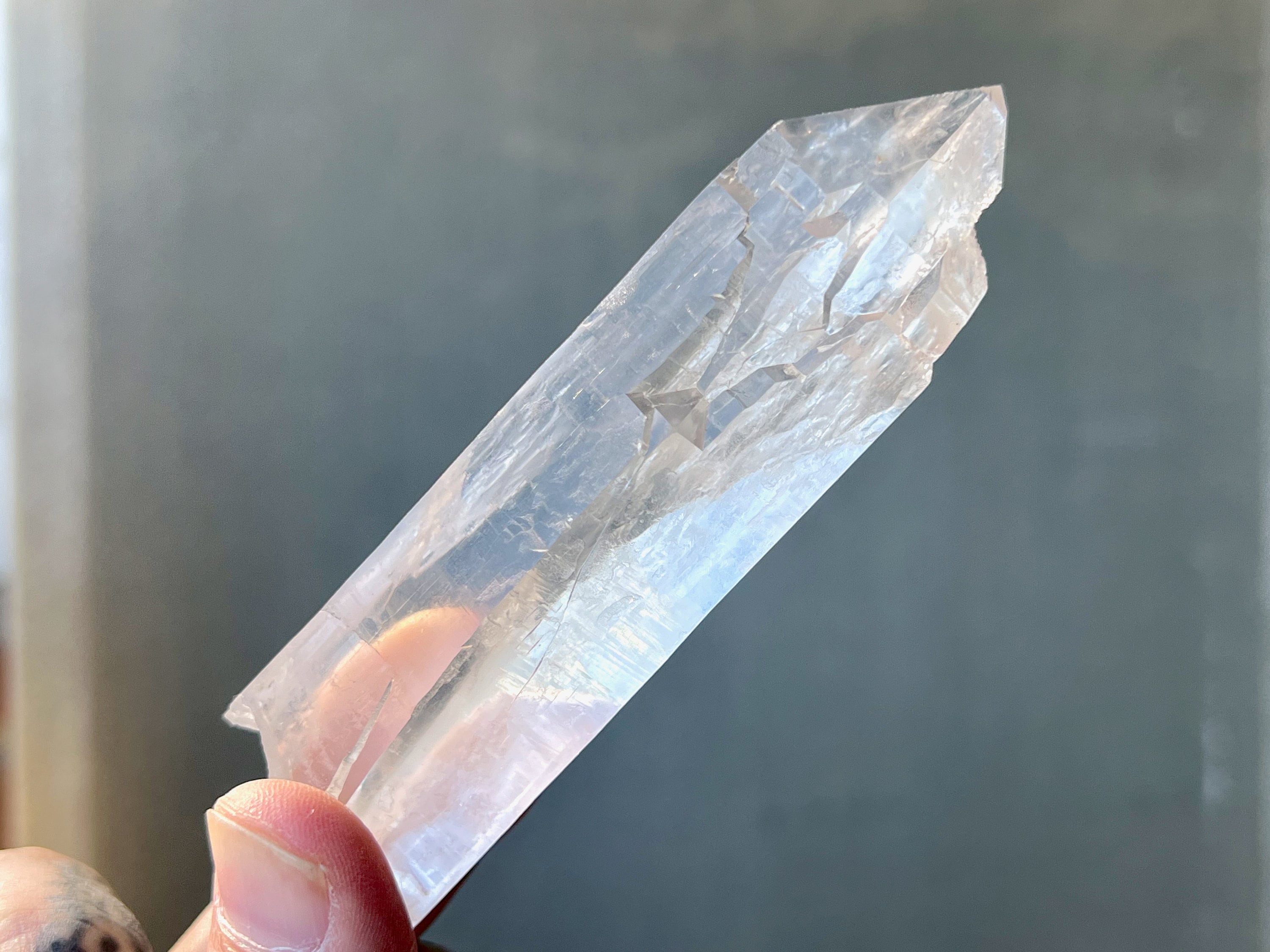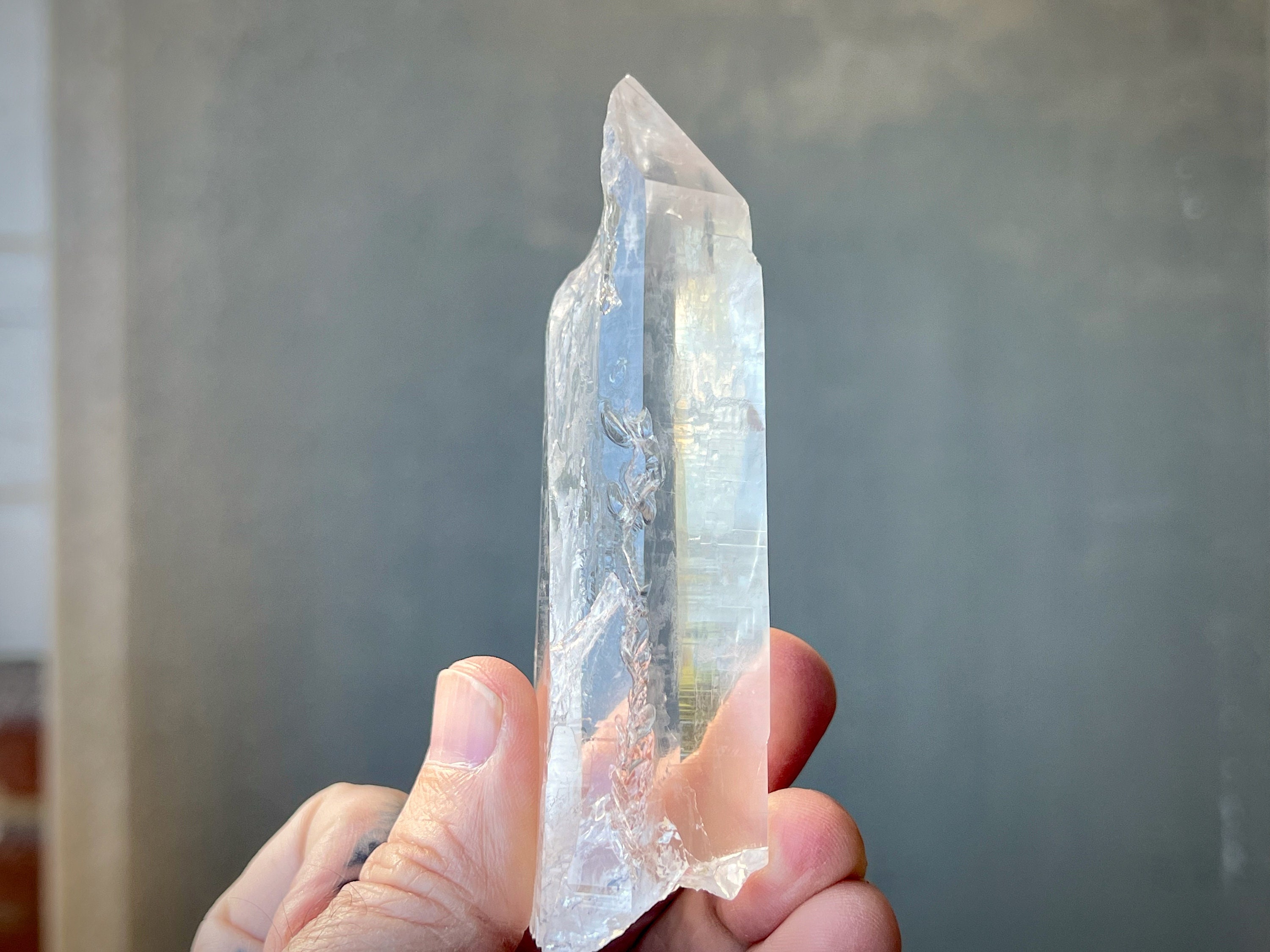 Outstanding quality to this very special Cathedral Quartz crystal with water-clear clarity and brilliant luster. This crystal happens to have an extremely prominent Lighting Strike marking on its back that begins at the base and extends upward the entire length of the crystal.