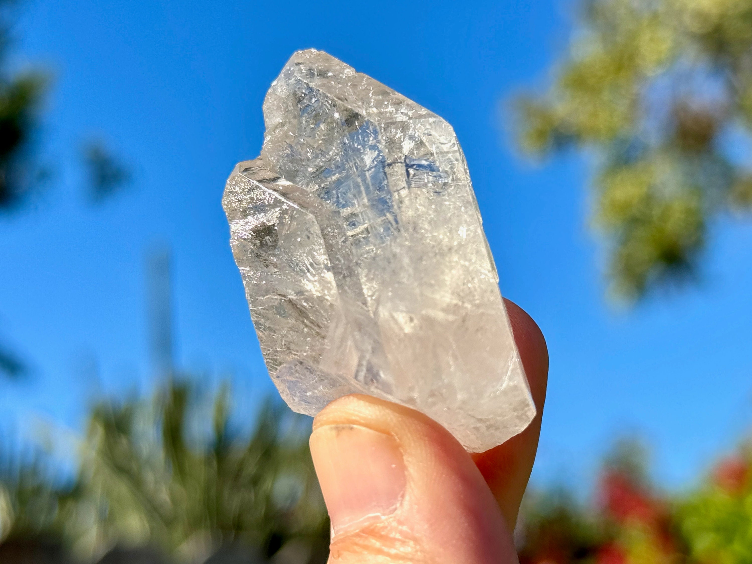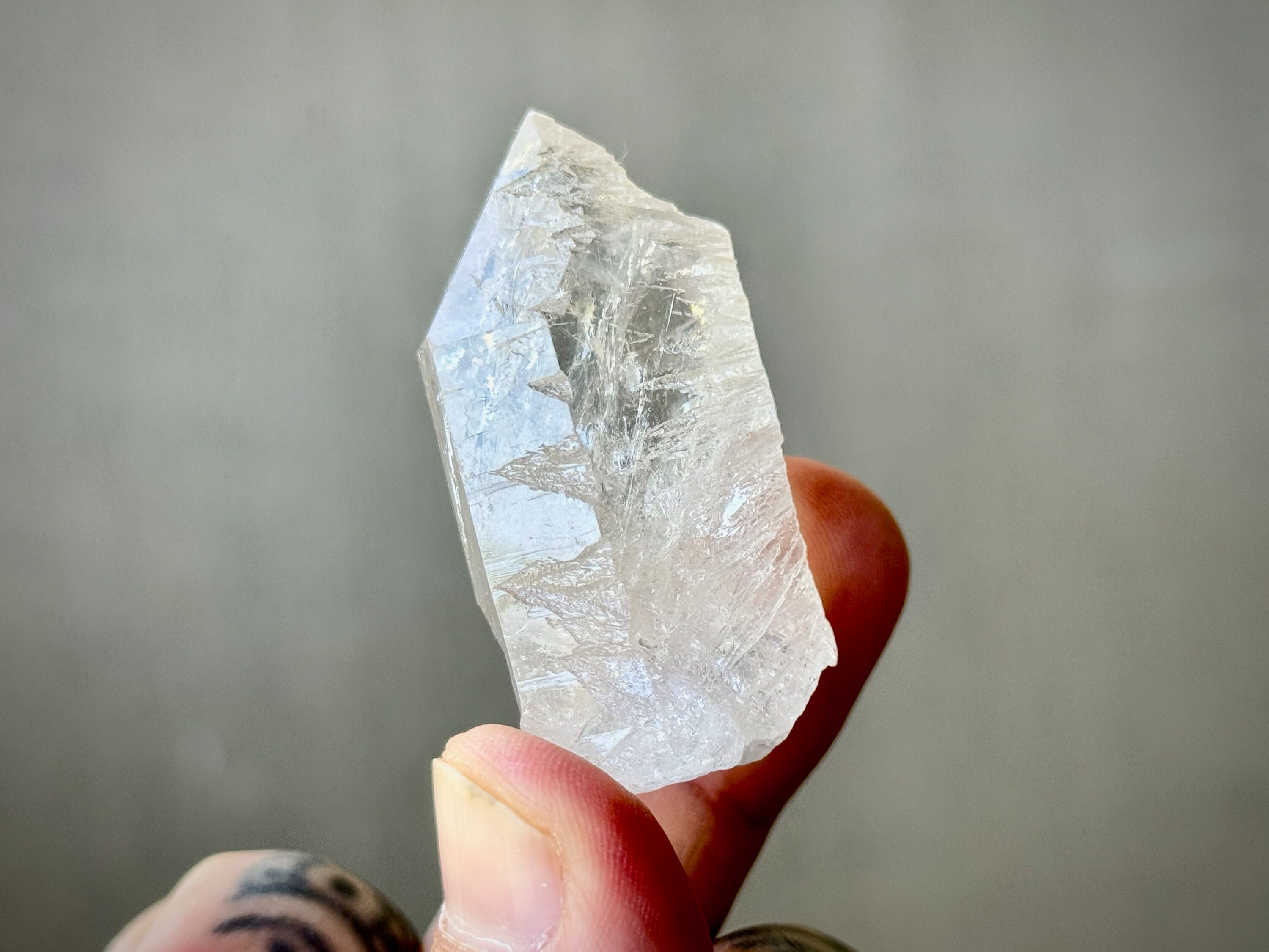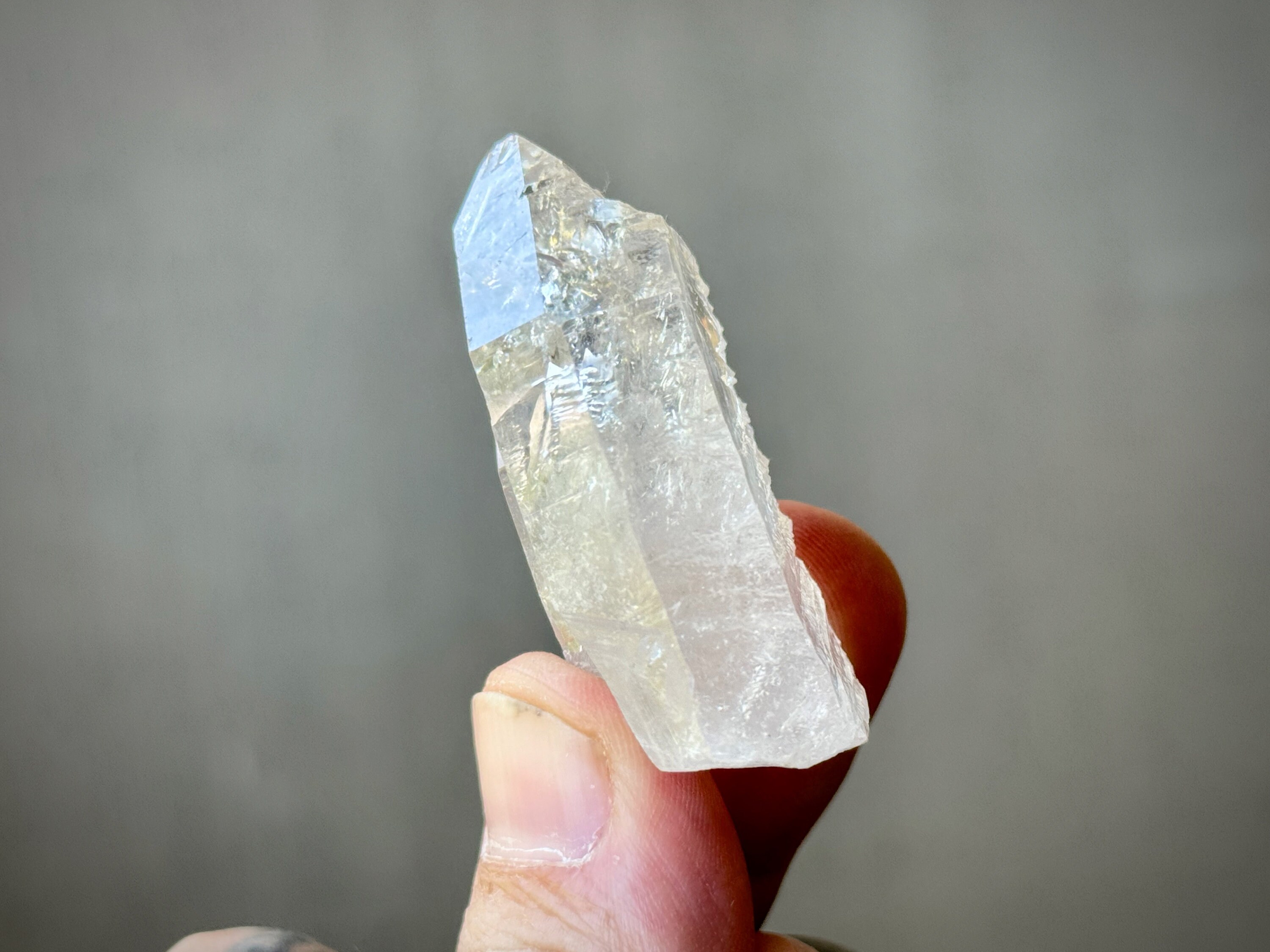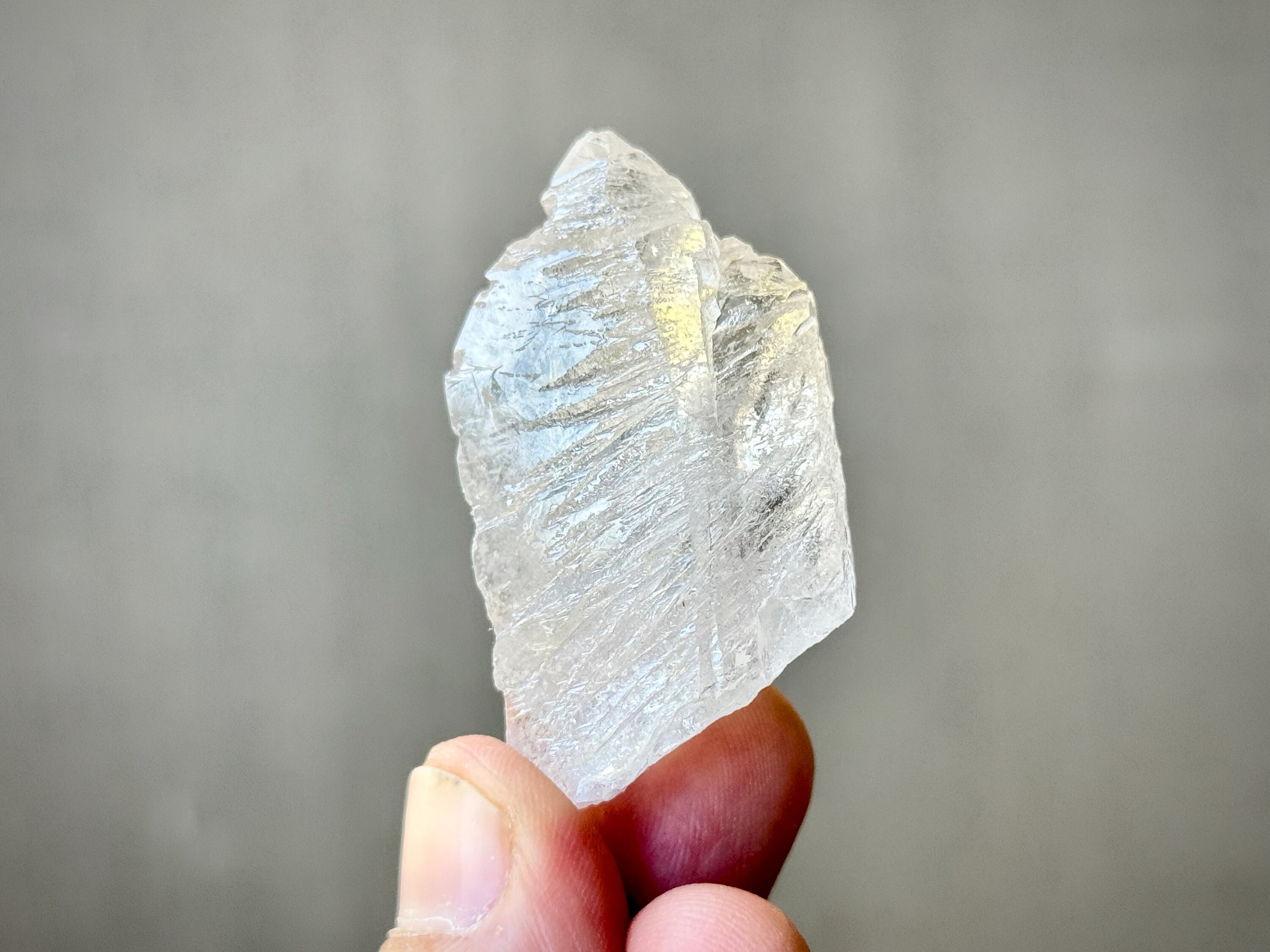 Exquisite clarity to this beautiful Dissolution Quartz crystal in a bit of a cathedral formation. This crystal exhibits some of the most unique hydrothermal etchings we've seen on these crystals on its right side, with a "spray" of linear etchings (see Photos 1-2). Excellent termination as well.