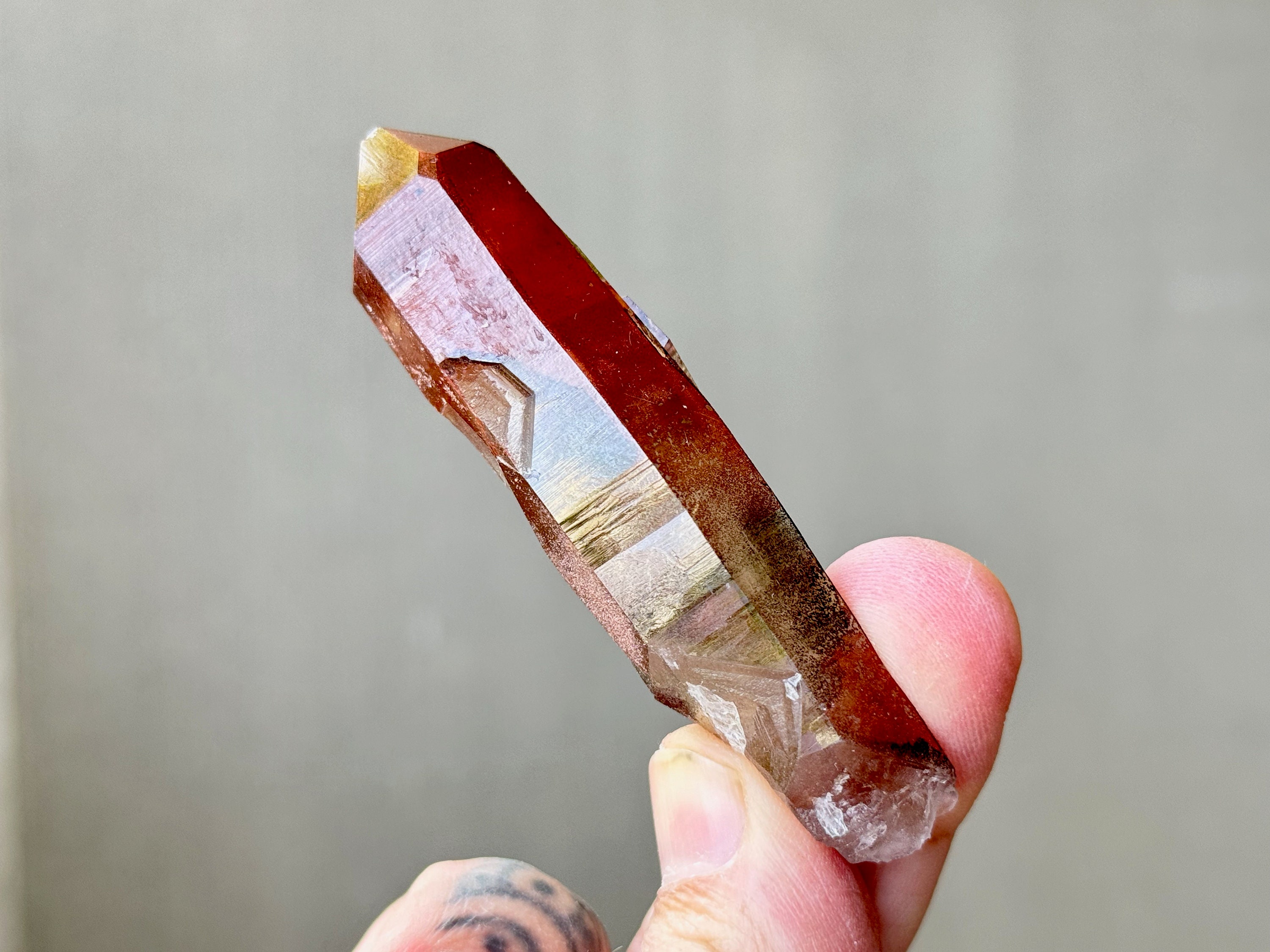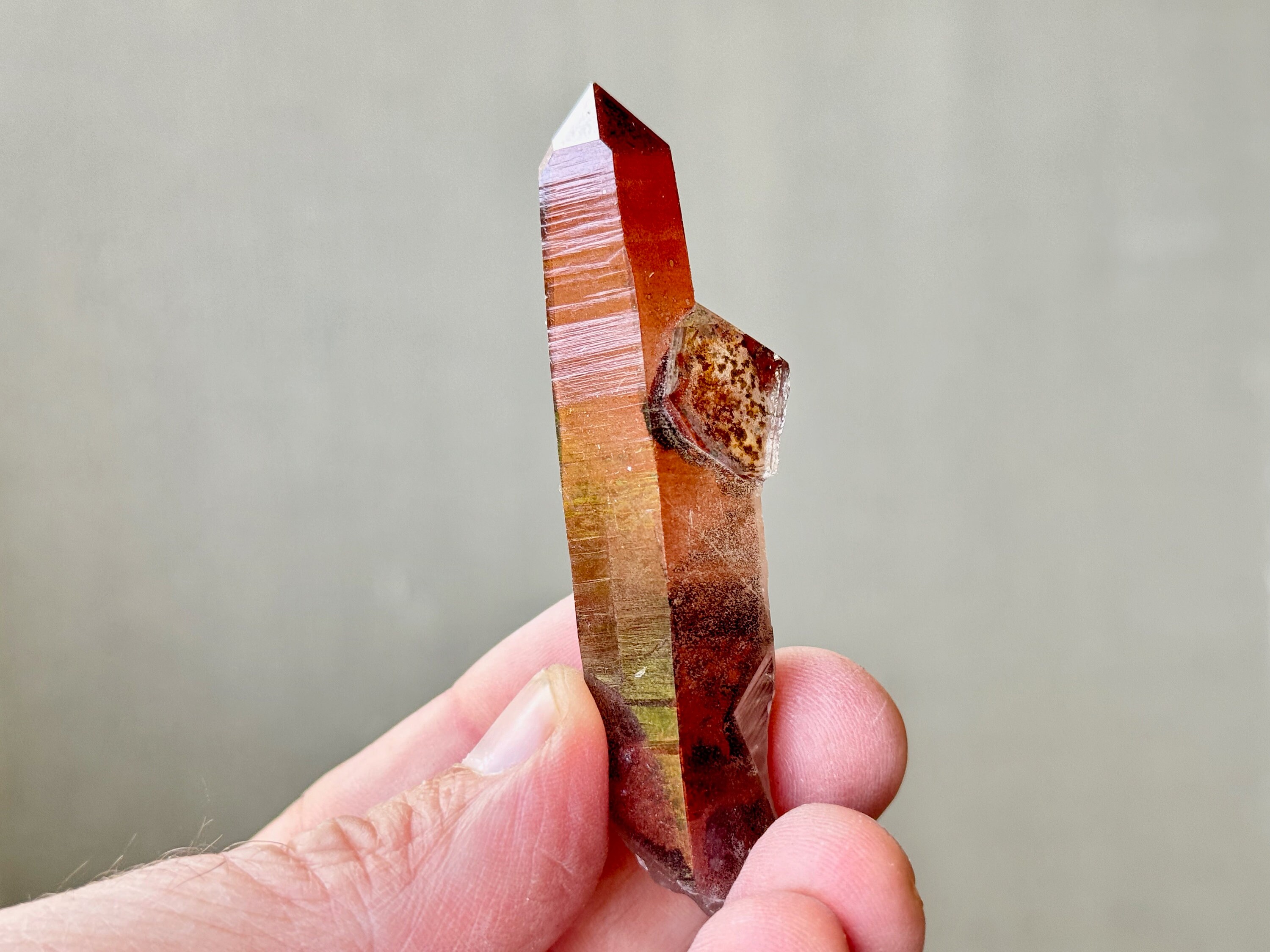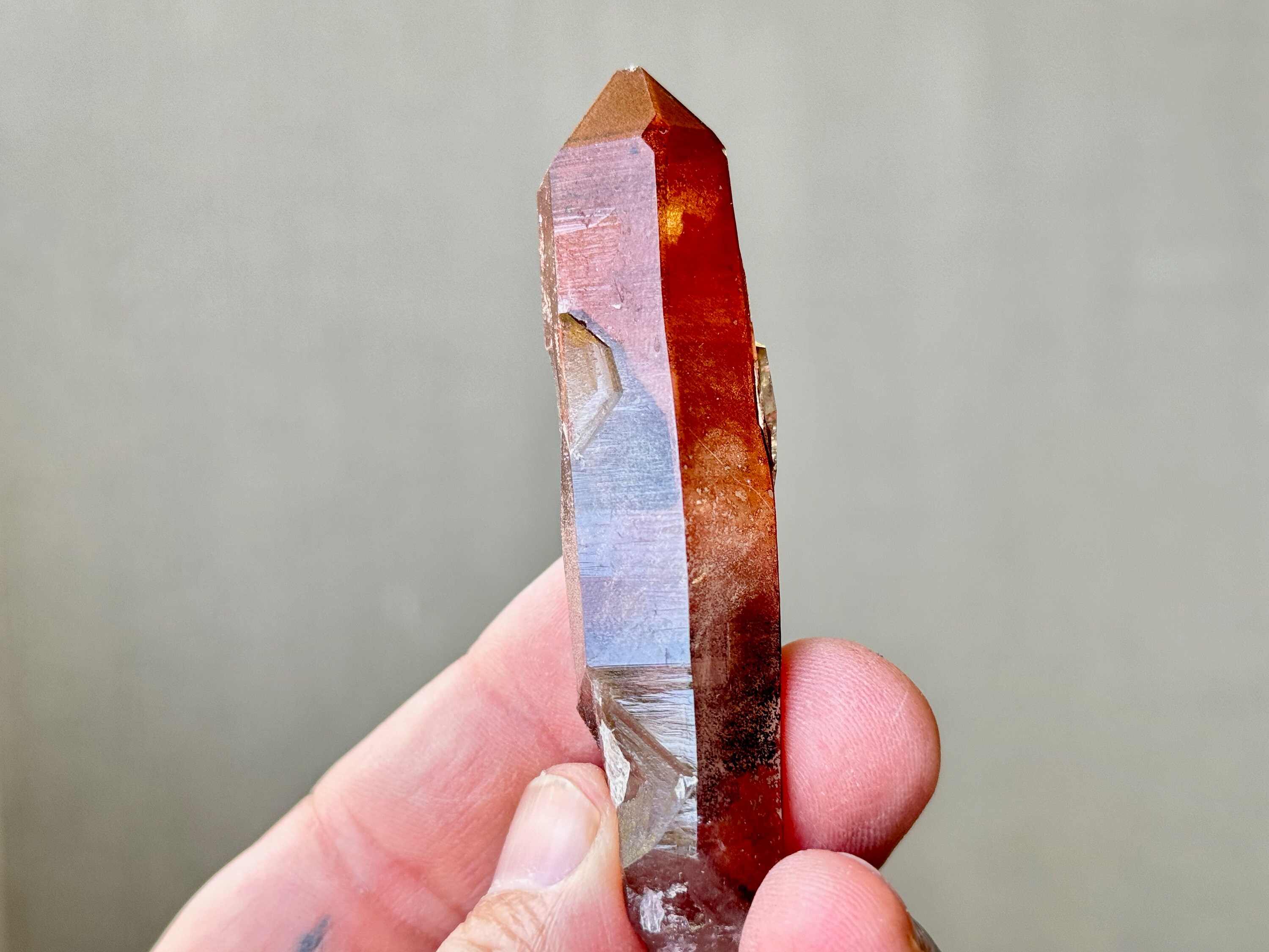So lustrous and so vibrant! This is a beautiful Red Hematite Quartz crystal point with a truly outstanding deep red hue and reflective complexion. There are a number of textural "key" imprints on one side, and above those is a partial crystal embedded within the primary. The termination is excellent. An awesome and unique piece from this find.