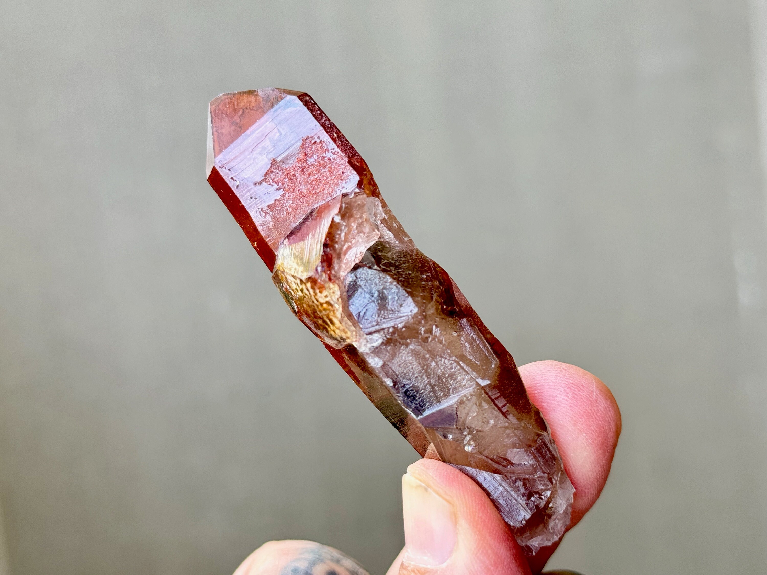 The crystals from this find have exceptional clarity and beautiful deep red and plum hues due to Hematite inclusion. Hematite is a powerful stone that absorbs negative (heavy) energy and recycles it into a more positive vibration. It is a wonderful grounding stone to correlate to the Root Chakra, and its properties are amplified by the quartz it encases.