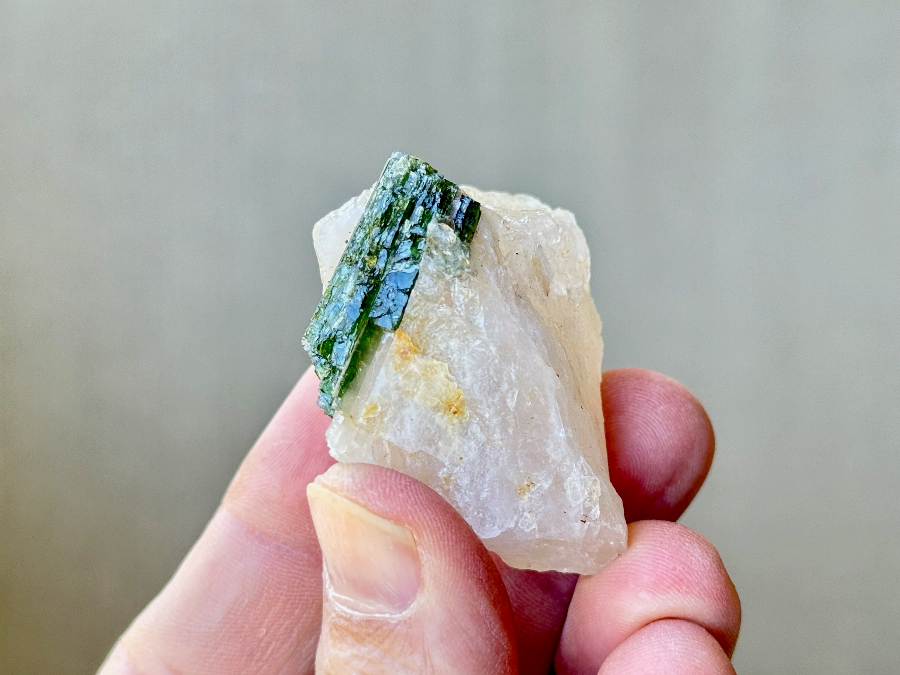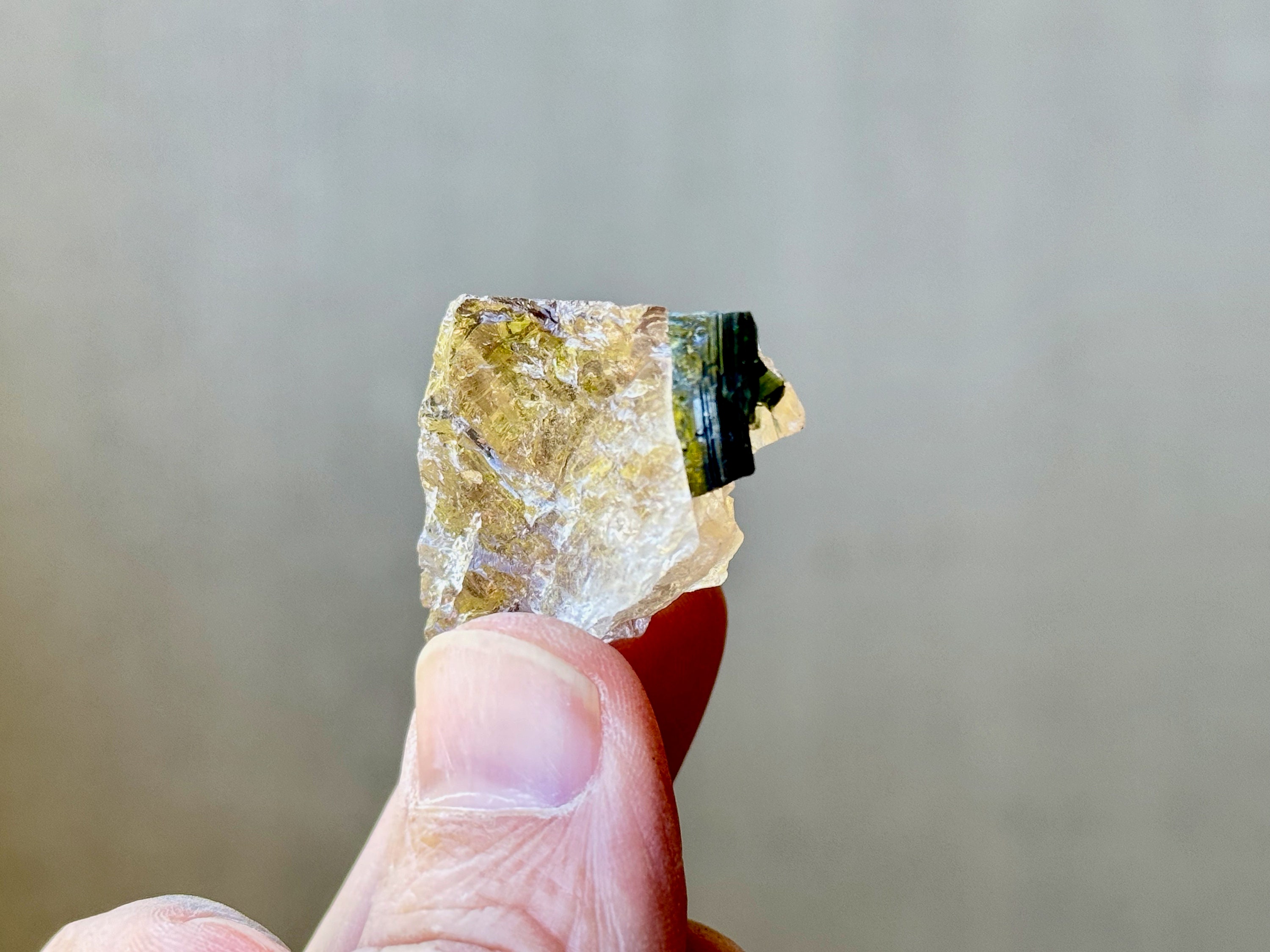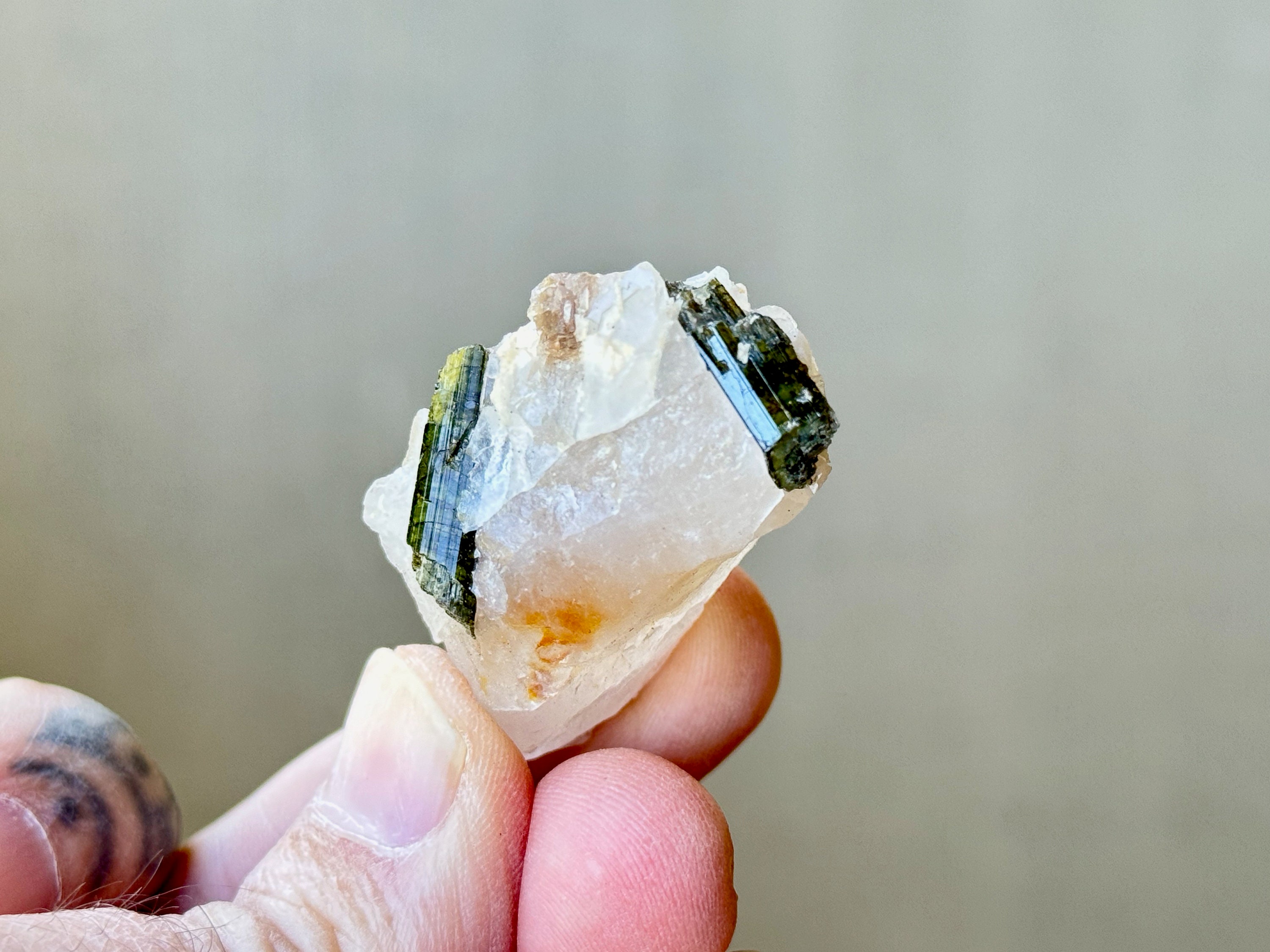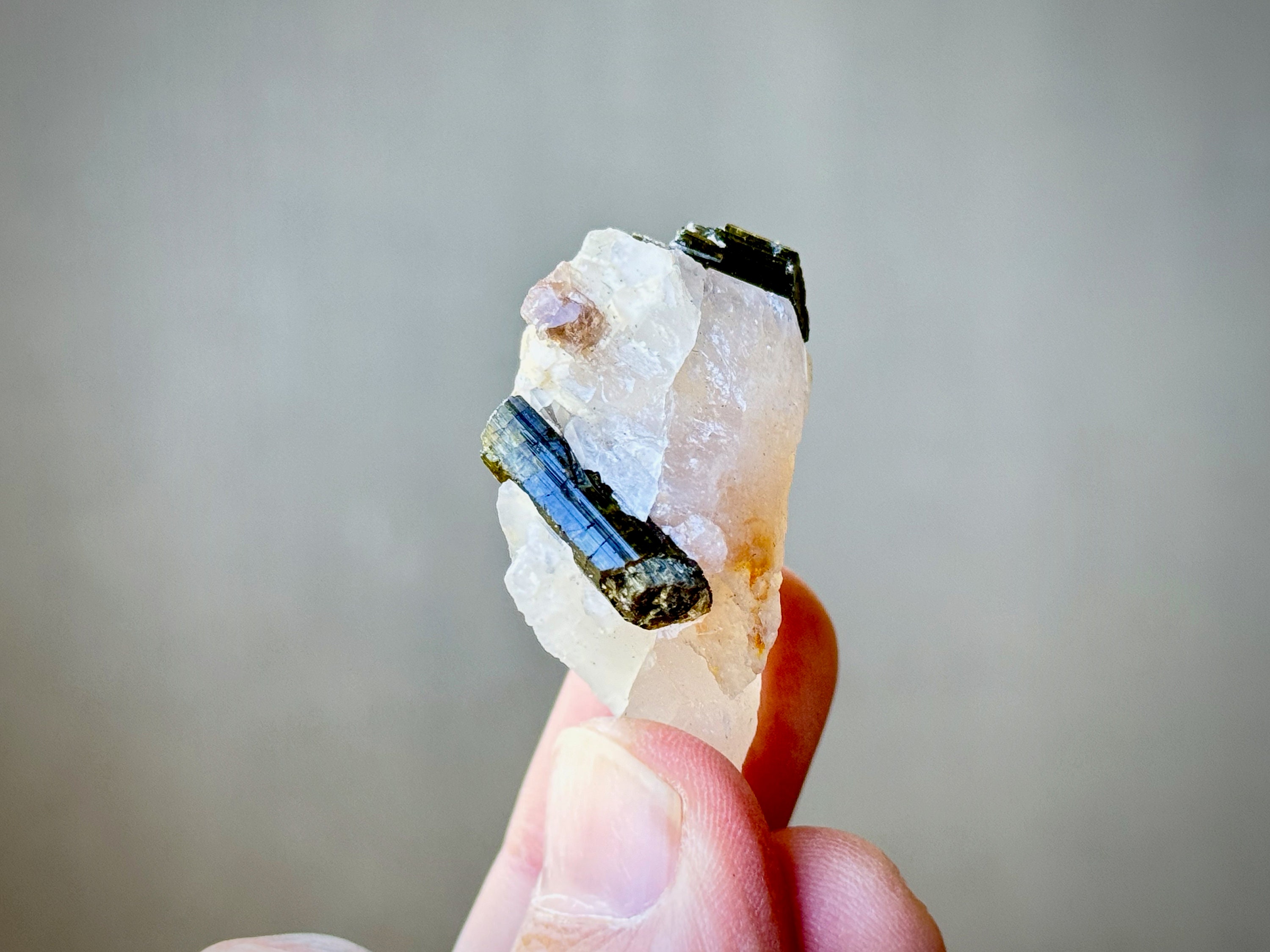 These are not traditional "point" formations, but rather "chunky" in formation. A few of these pieces have very gemmy and vibrant Green Tourmaline inclusions, while others feature darker or Black Tourmaline.