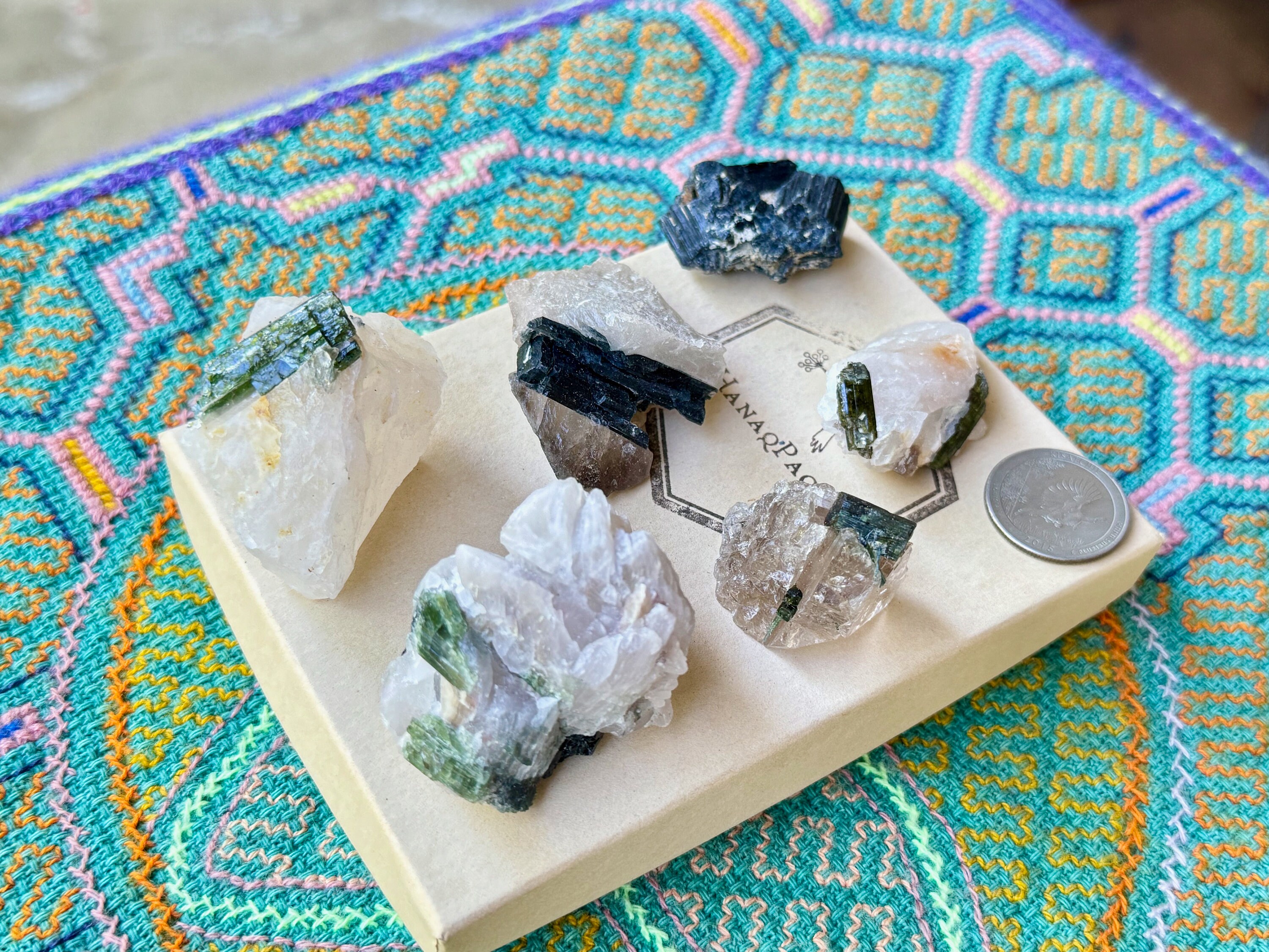 This is a nice collection of chunky and substantially sized Quartz crystals, each with various inclusions of either Green or Black Tourmaline. One crystal in the set is not a Quartz crystal, but simply a Black Tourmaline crystal on its own. One crystal is actually a golden Citrine.