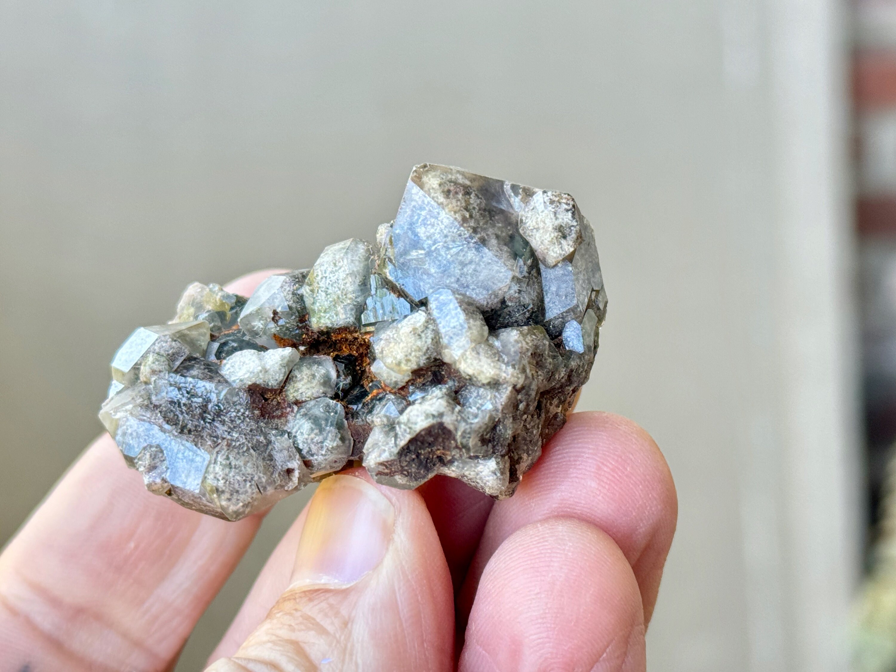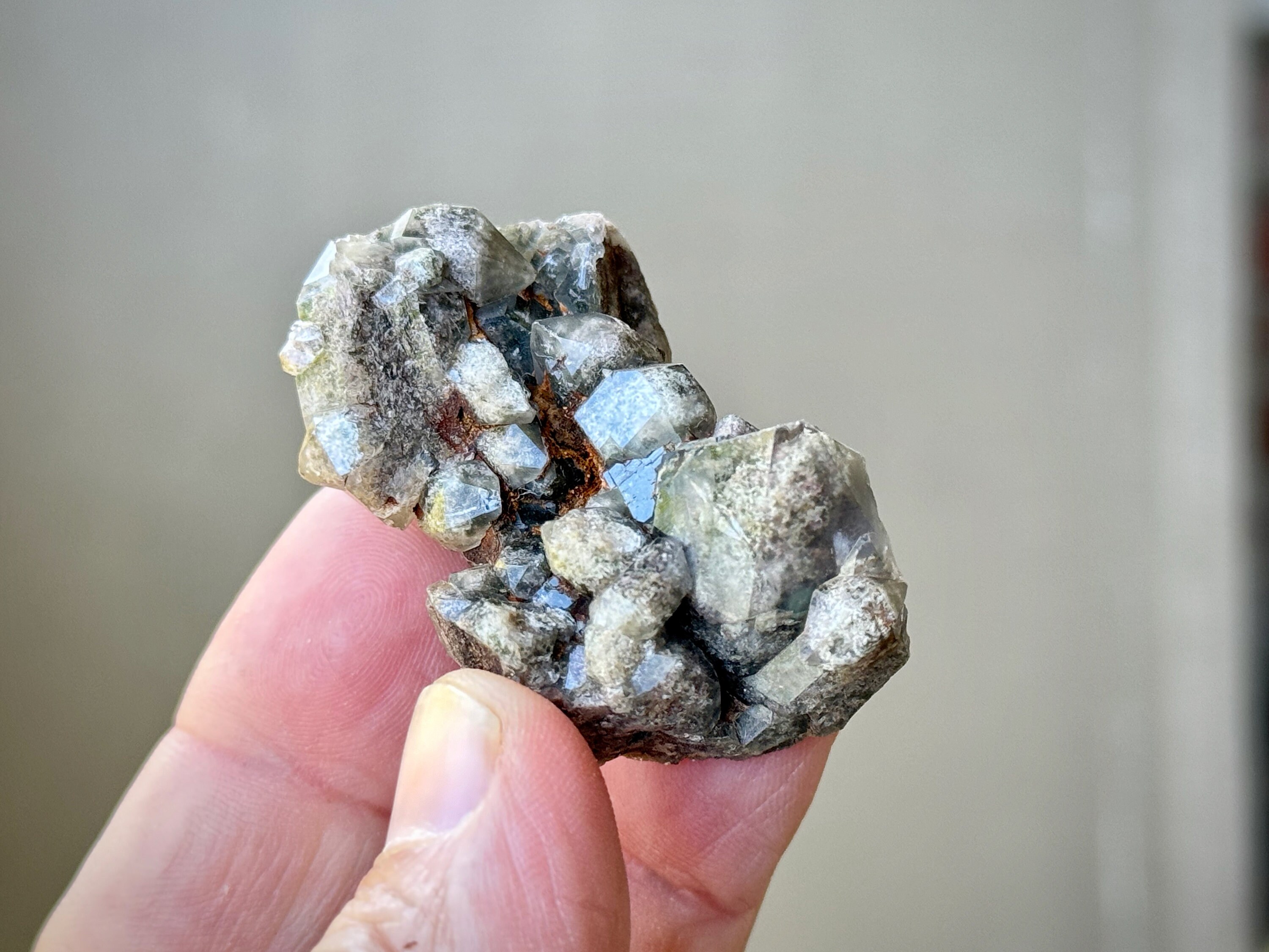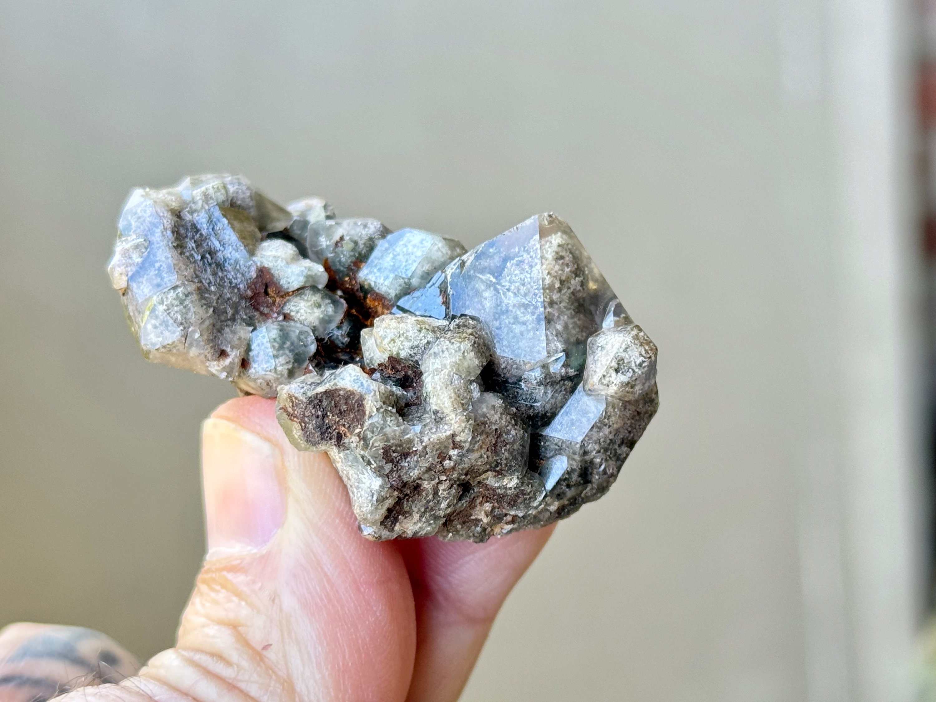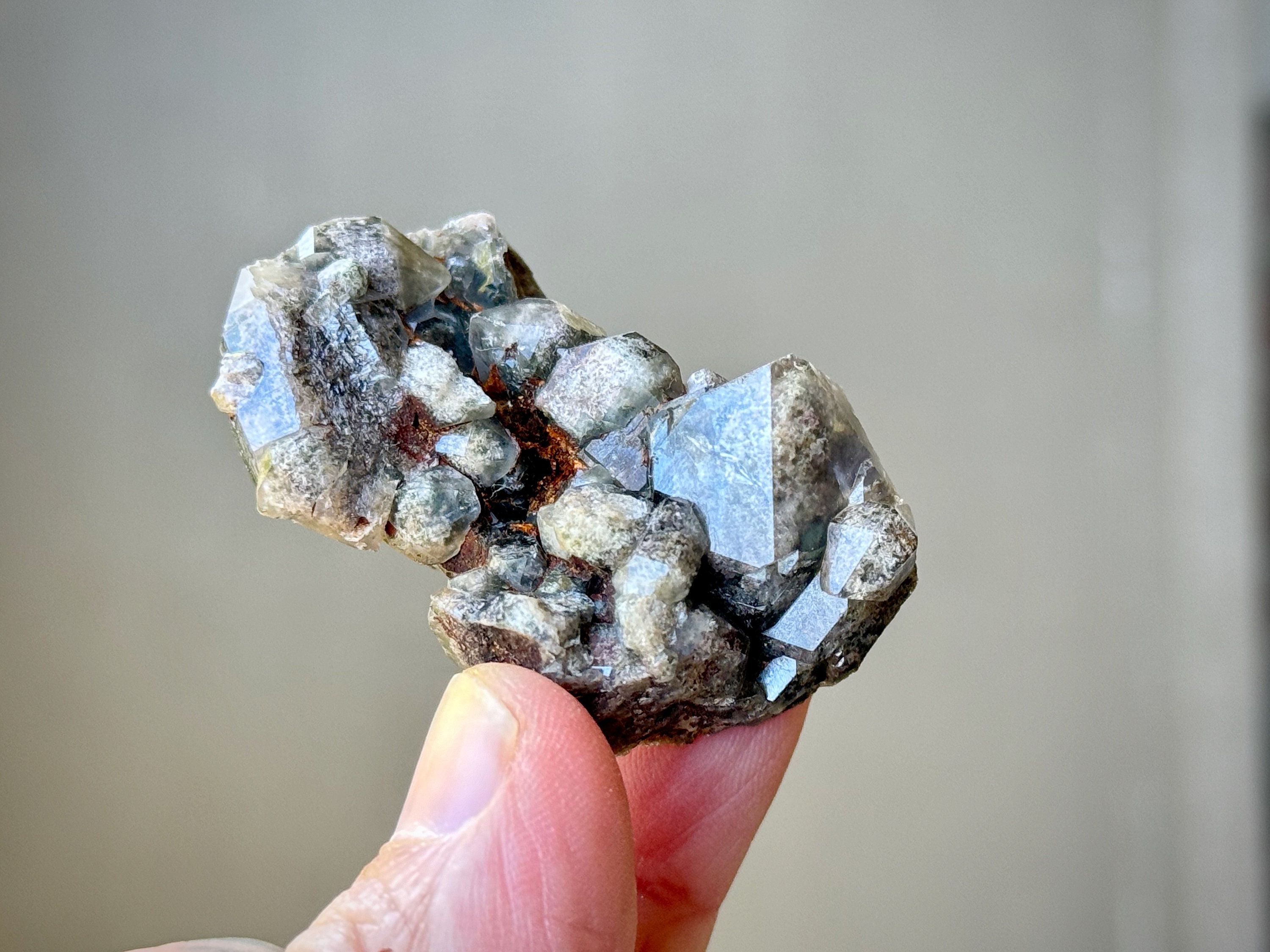 Brilliant luster and such a beautiful cluster formation to this lovely Shaman's Dream Quartz with rich inclusions of white Kaolinite and Green Chlorite. So many individual facets to see here! Really nice quality to this sweet crystal.