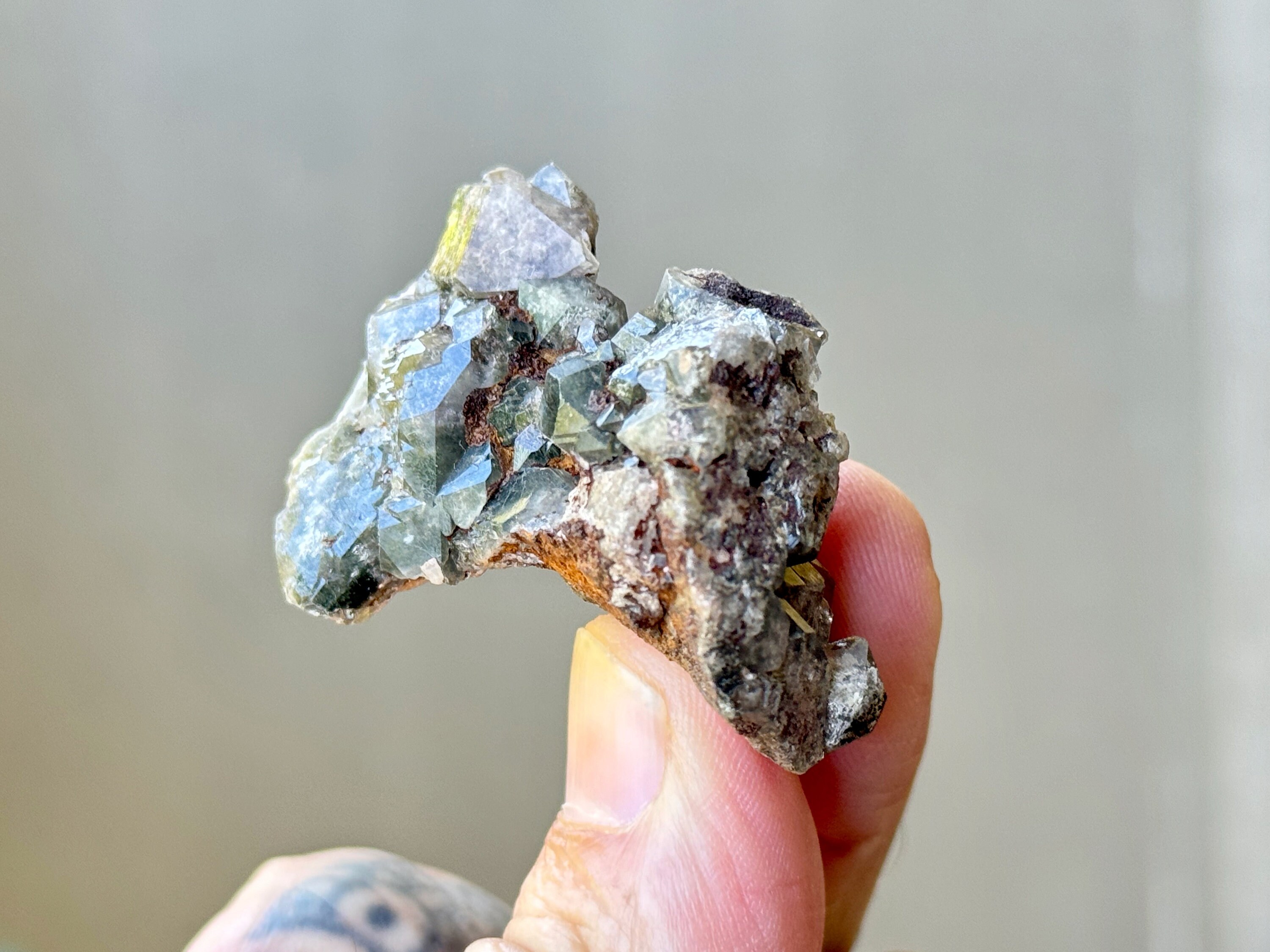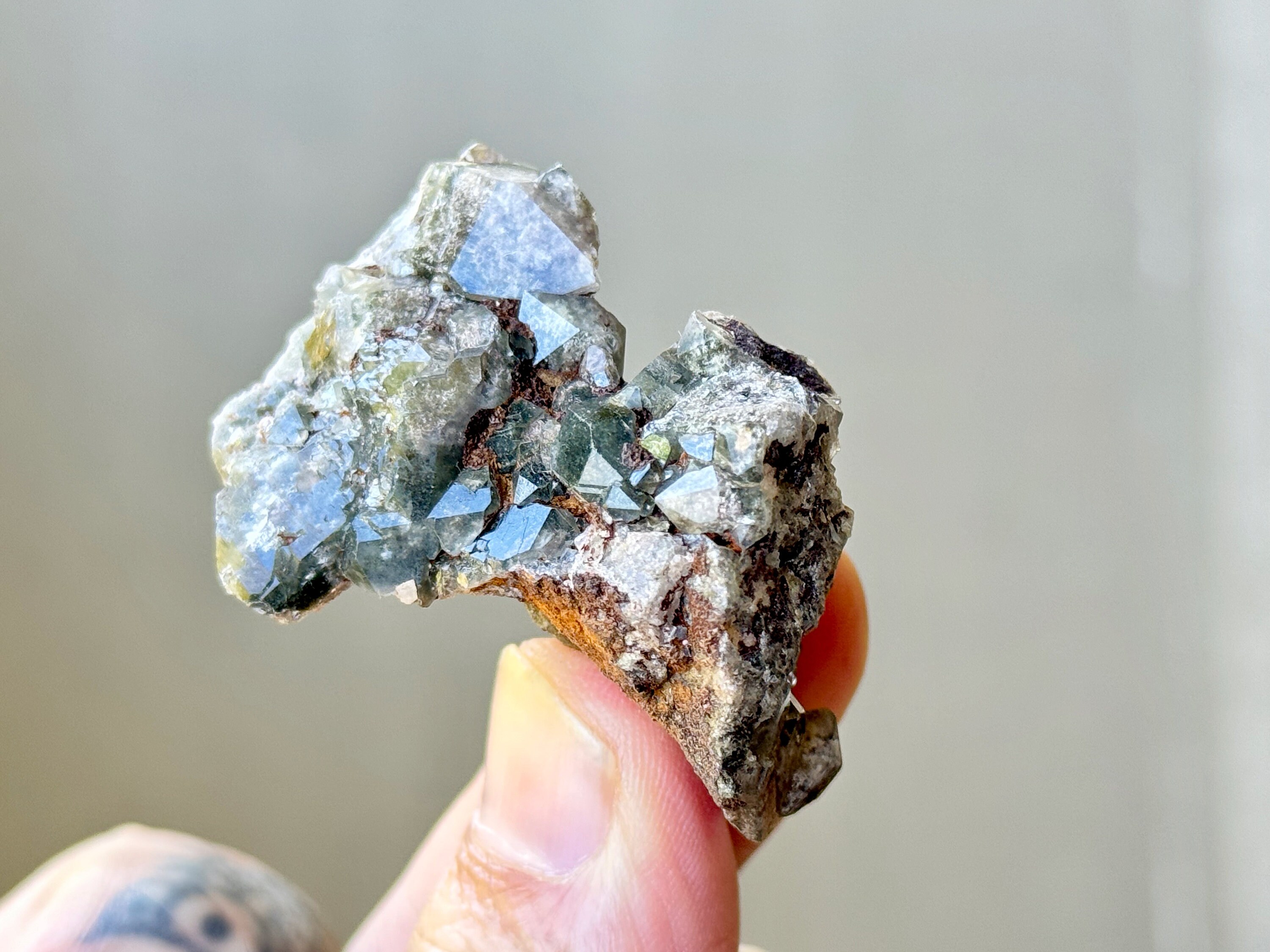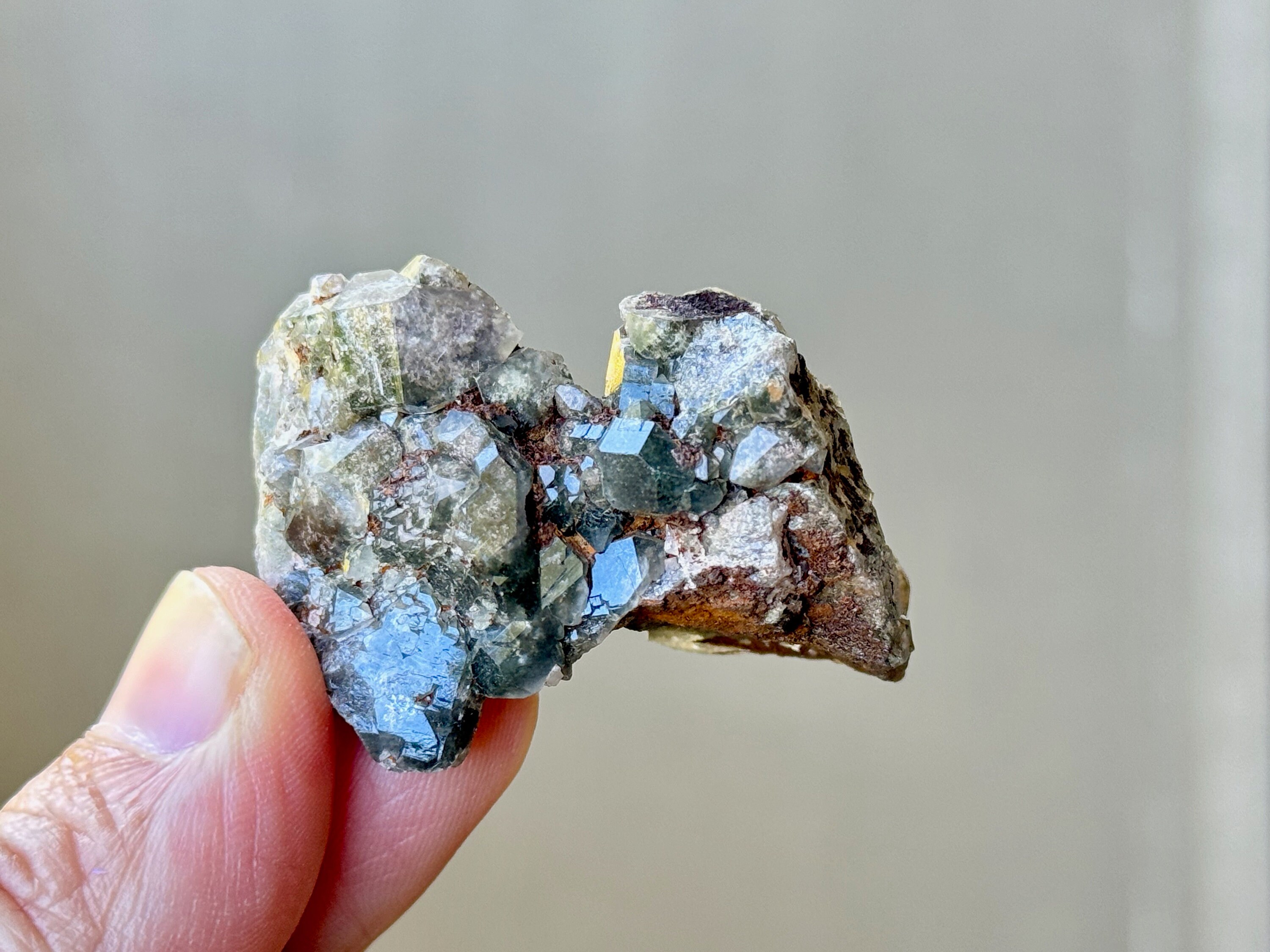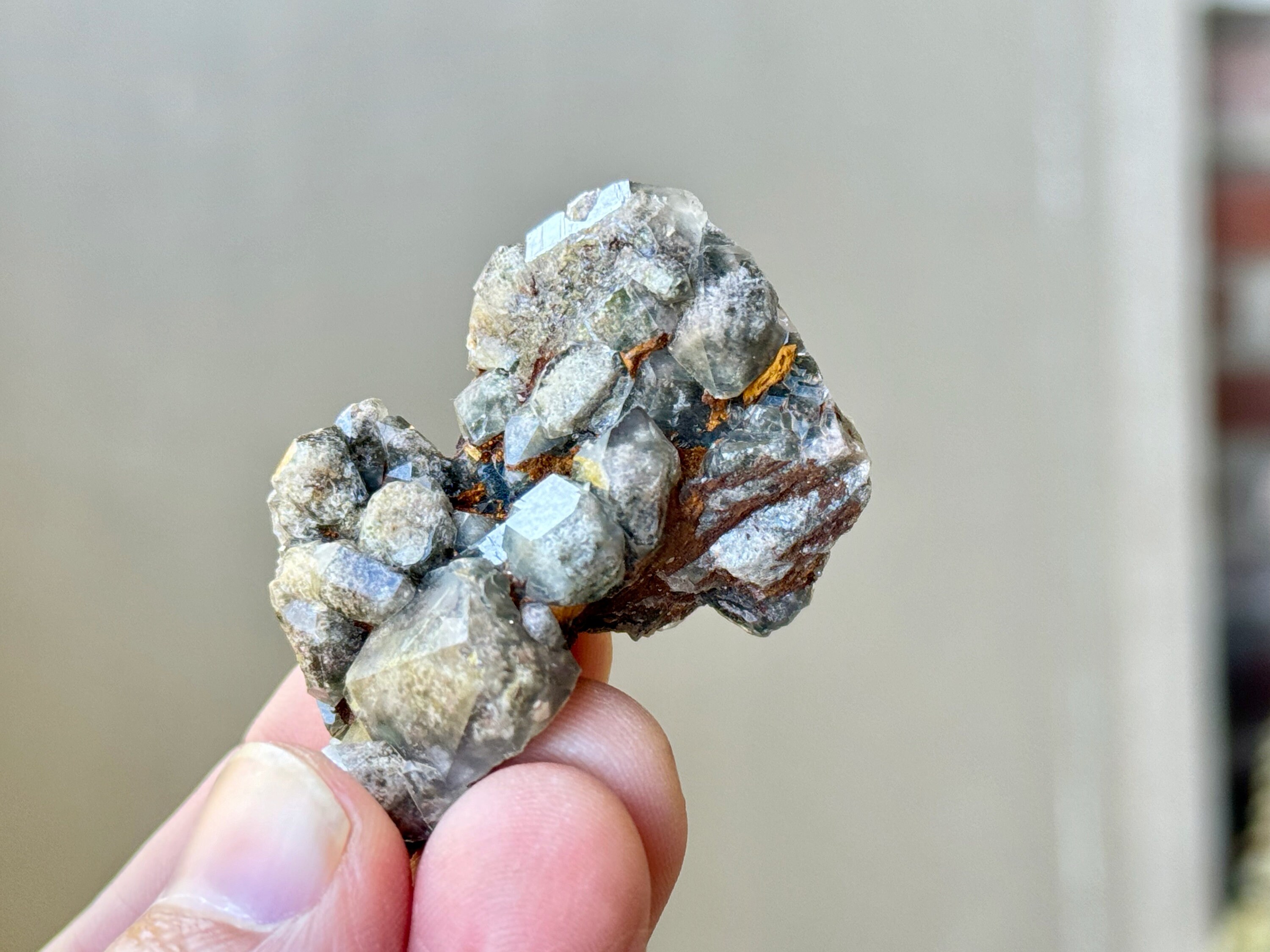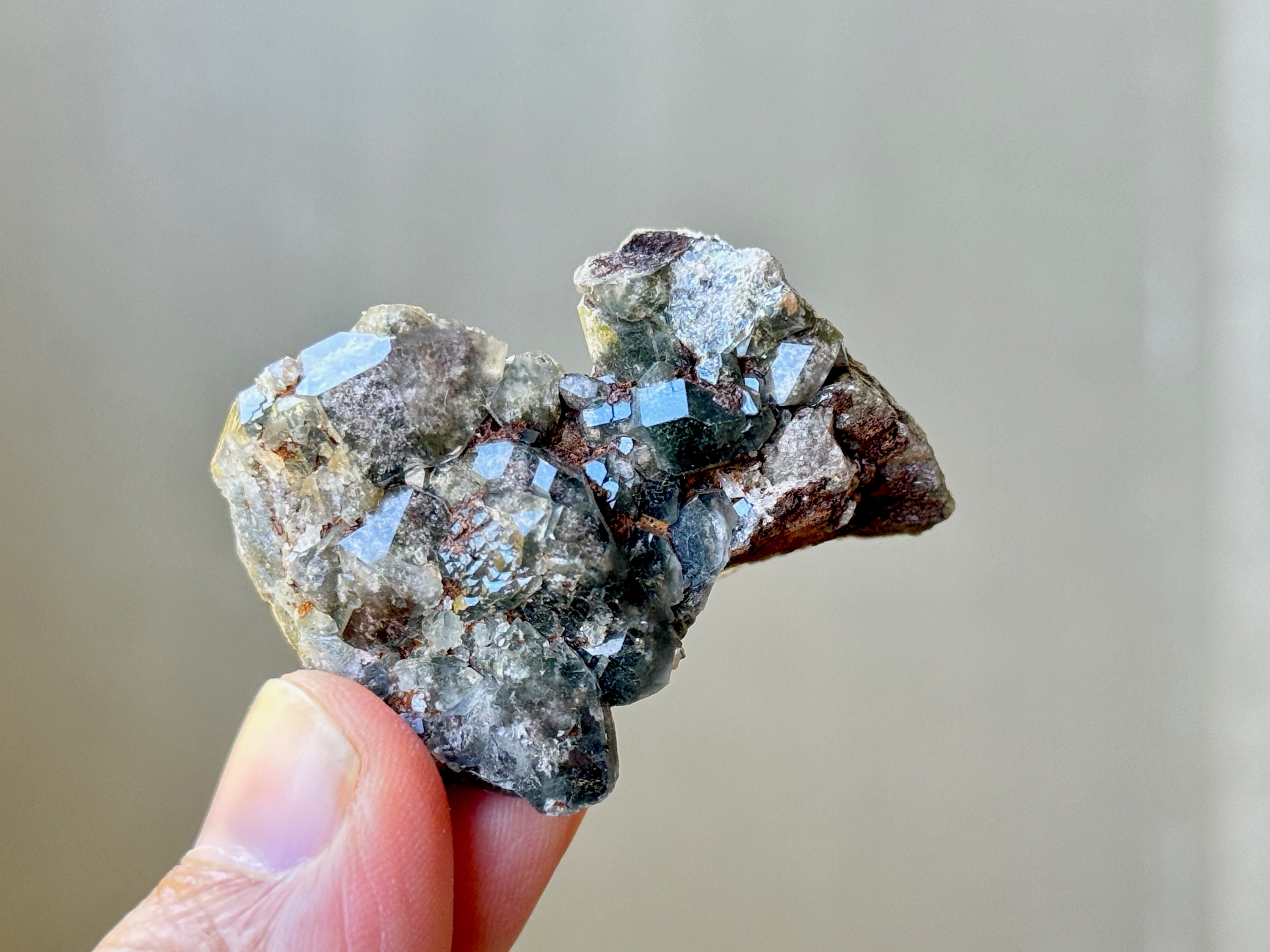 Brilliant luster and such a beautiful cluster formation to this lovely Shaman's Dream Quartz with rich inclusions of white Kaolinite and Green Chlorite. So many individual facets to see here! Really nice quality to this sweet crystal.
