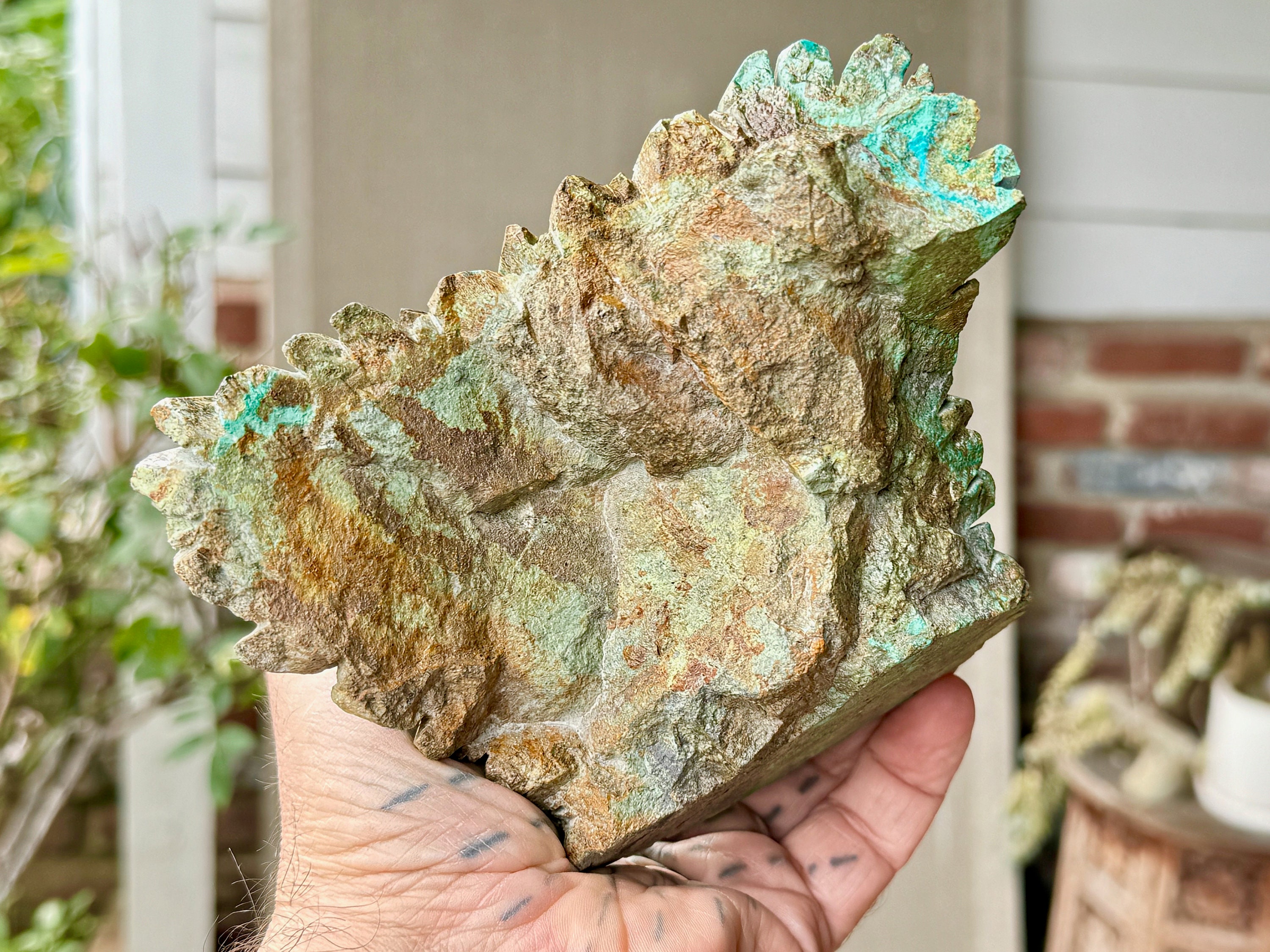 Carved from a single piece of native Peruvian Chrysocolla, the color to this piece is so vibrant, and we can see how the artist incorporated the natural form of this stone, leaving the back portion entirely natural so we can envision the transformation of this piece.