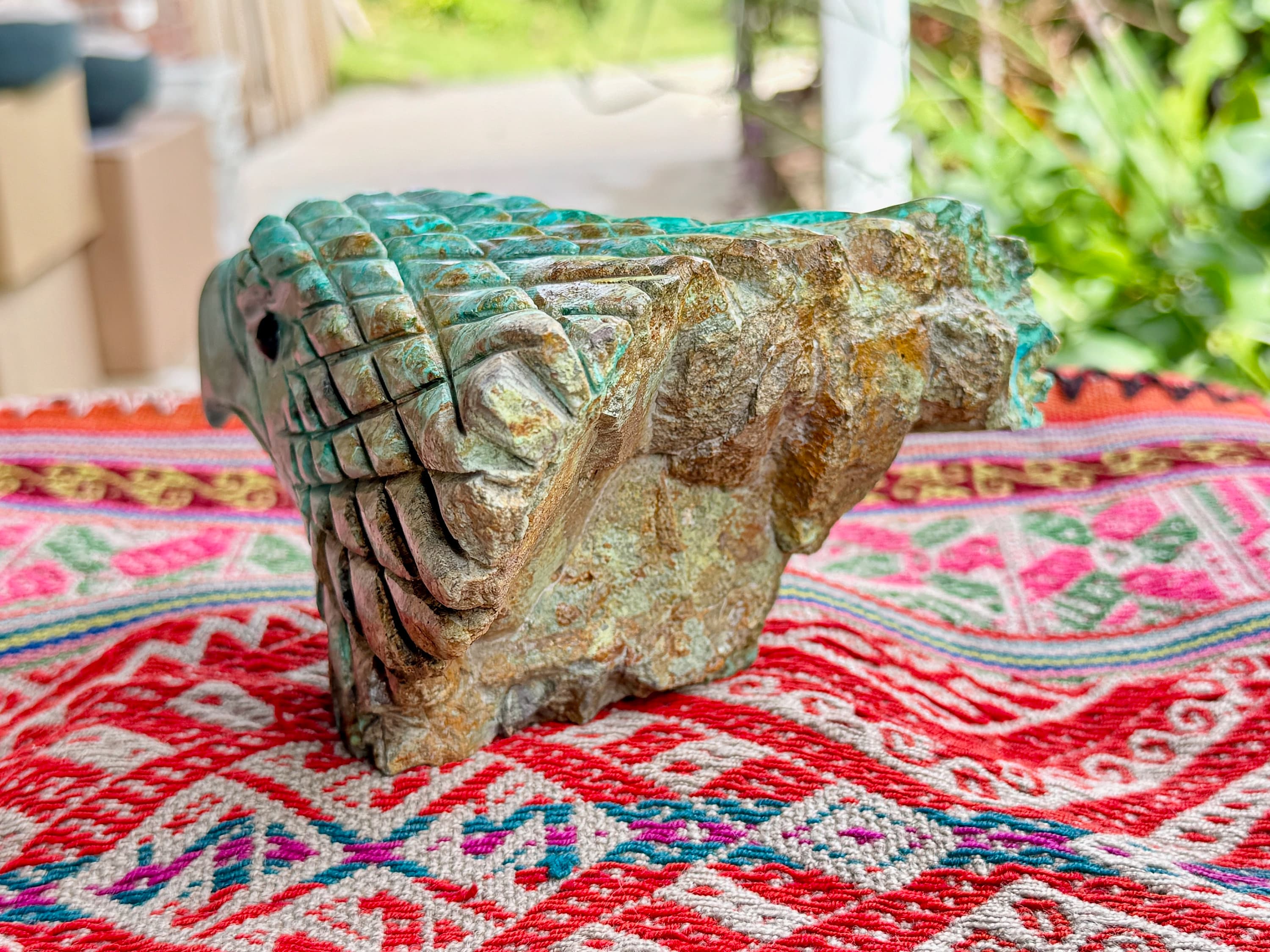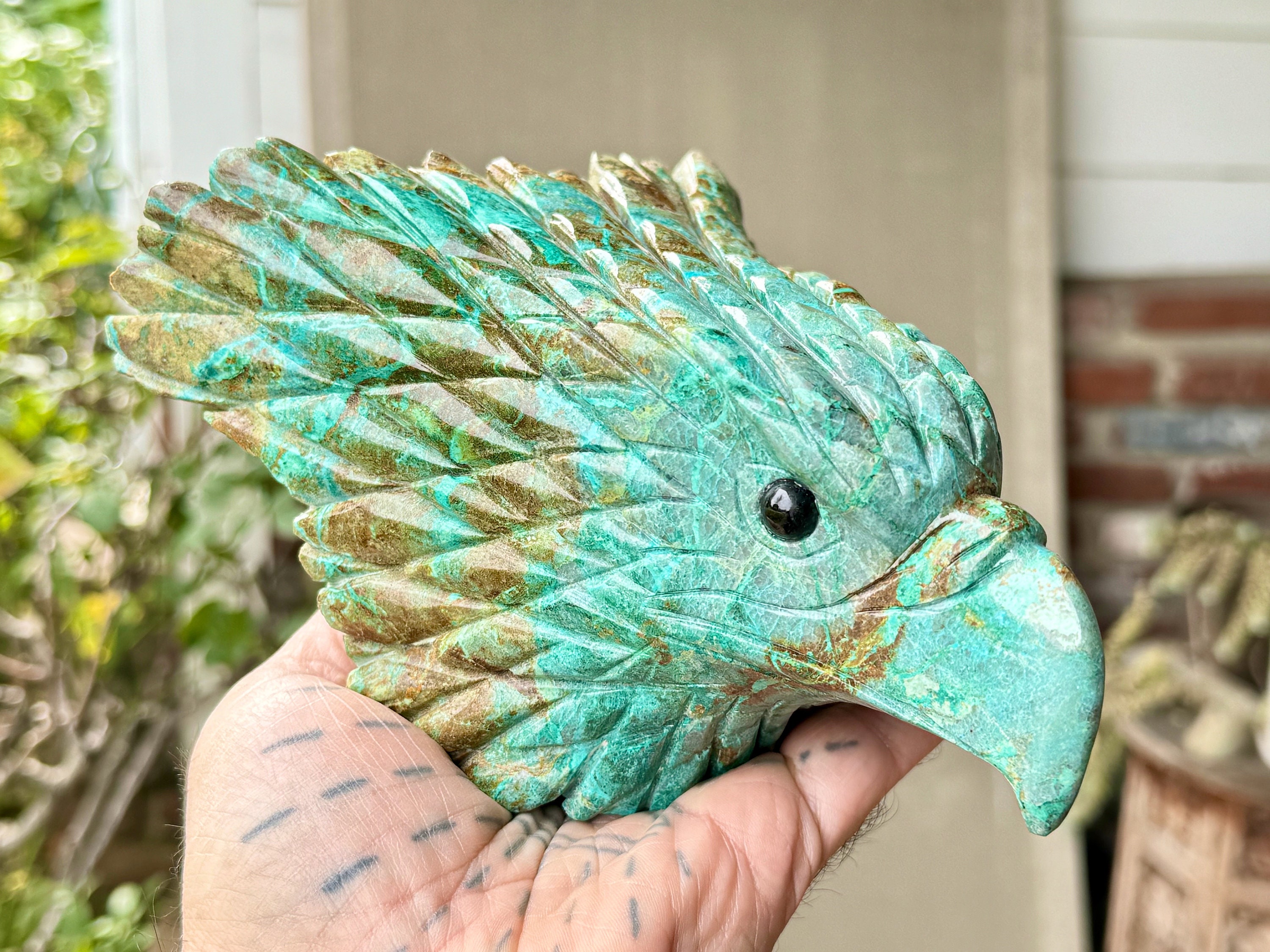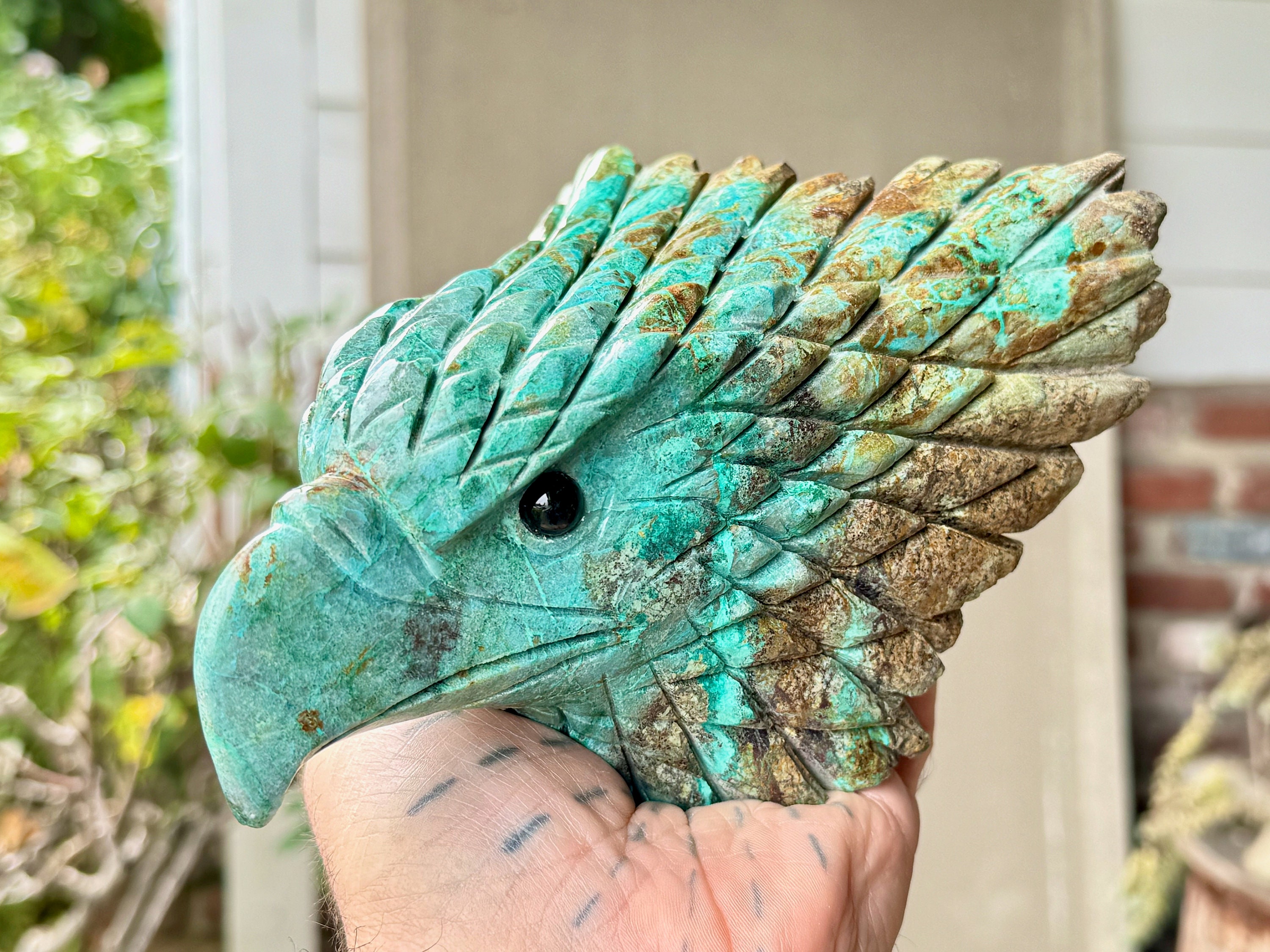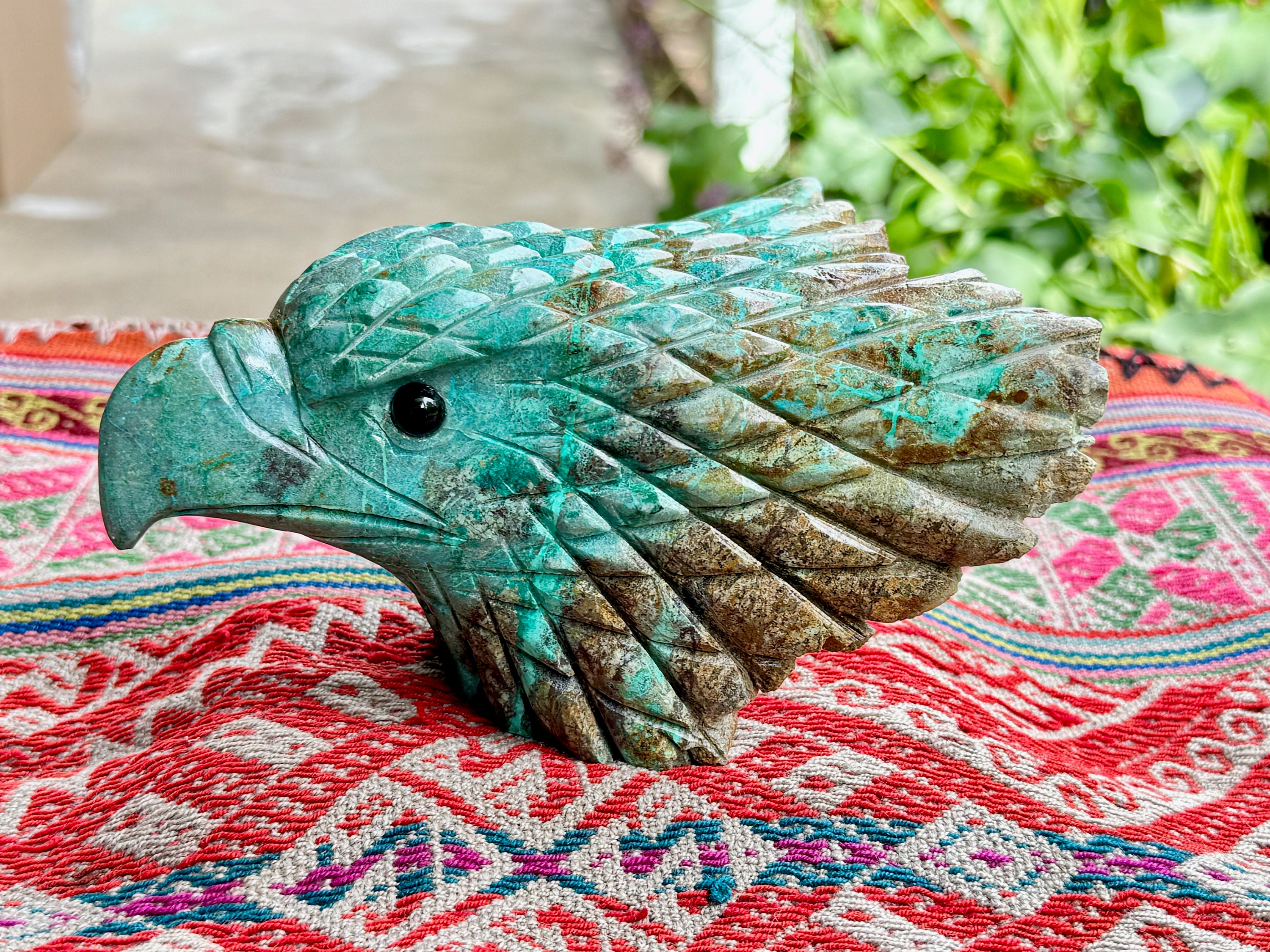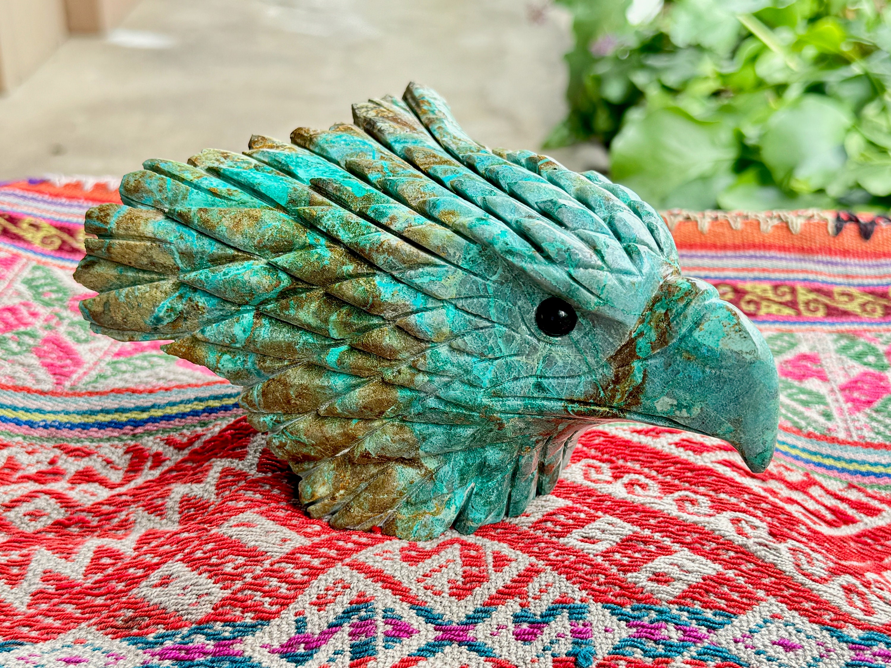 Here is a magnificent Eagle Head Statue, hand-carved out of native Chrysocolla by artisan Jacob Sullka in Peru's Sacred Valley.