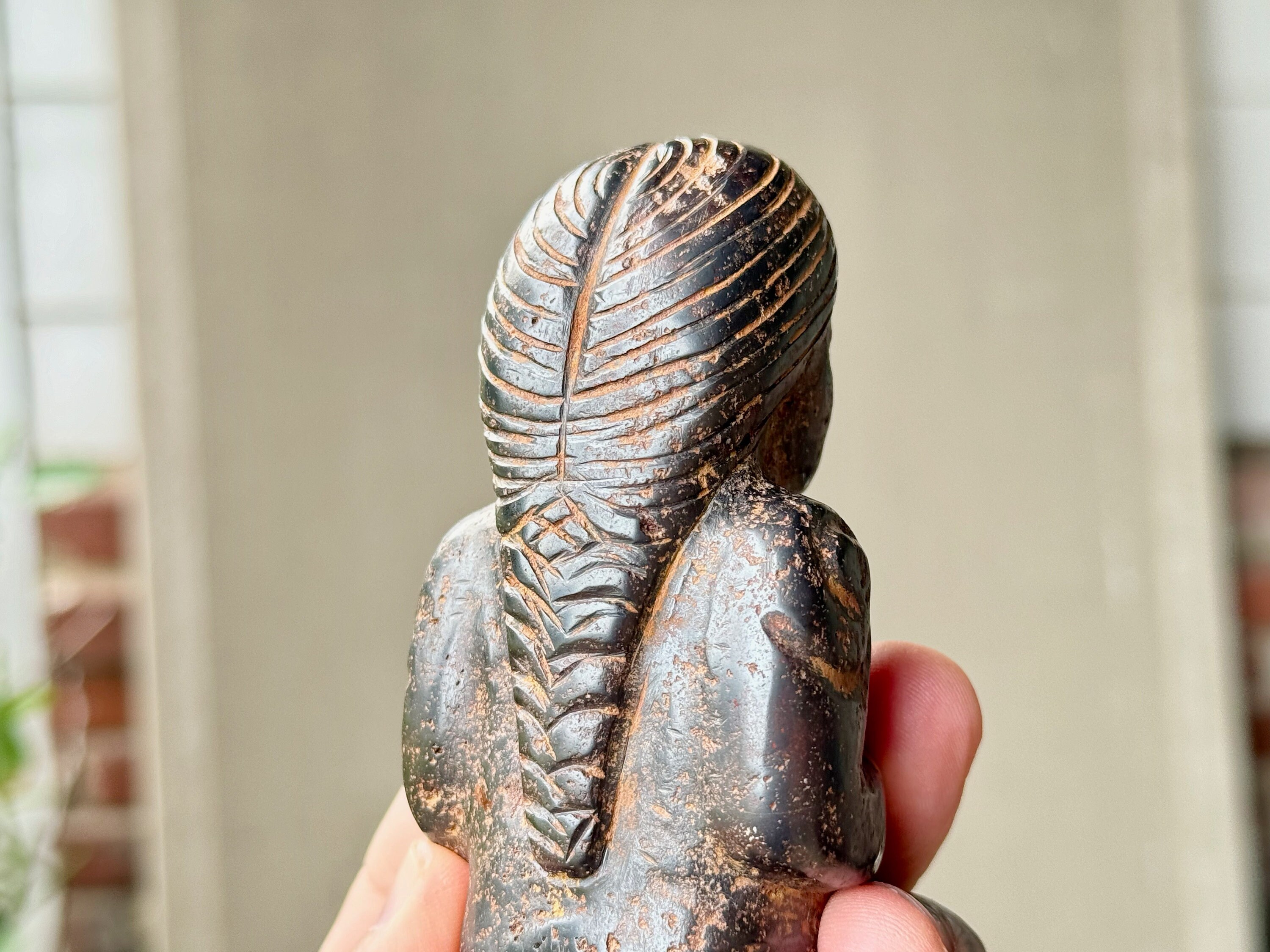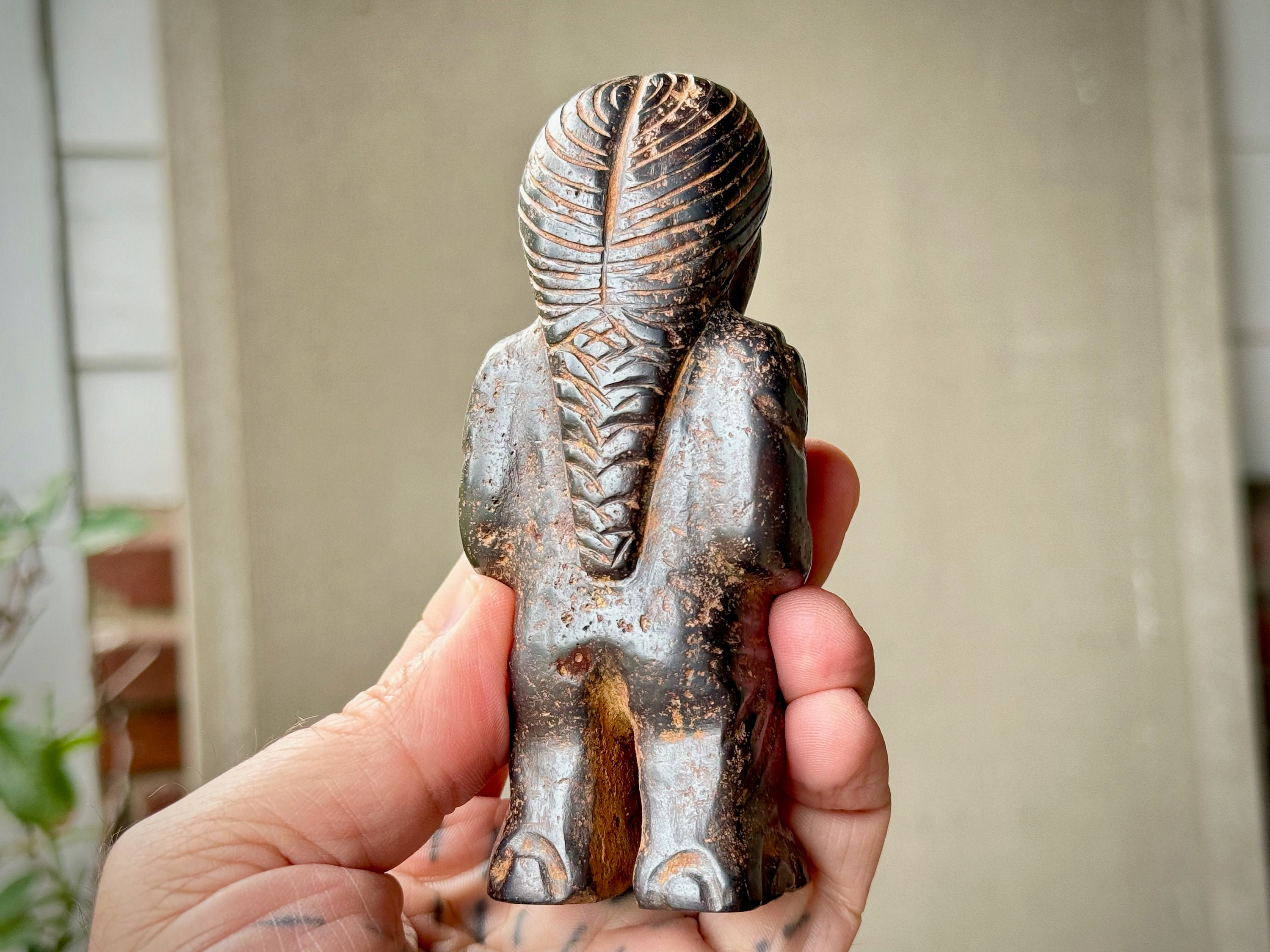 **PLEASE NOTE - This piece is quite special in that the material is an extremely dense black metallic stone that feels like iron. Our source in the Sacred Valley tells us that it is carved from a "meteor found in the highest altitudes of the mountains" there. Without a lab test, we cannot verify this for certain. However, we have done a "streak test" on this piece, where we rub it against white paper. It is said if it is Hematite, a red streak will appear, and if it is Magnetite a black streak will appear. In this case, no streak appears. It is also magnetic. This piece comes from a trusted source of ours that is well-respected throughout Peru's Sacred Valley, so we do trust his word. However, for full transparency and out of respect for our customers we did want to include this disclaimer that we cannot be fully certain of the actual material, thus we've indicated here as "alleged" meteoric rock.