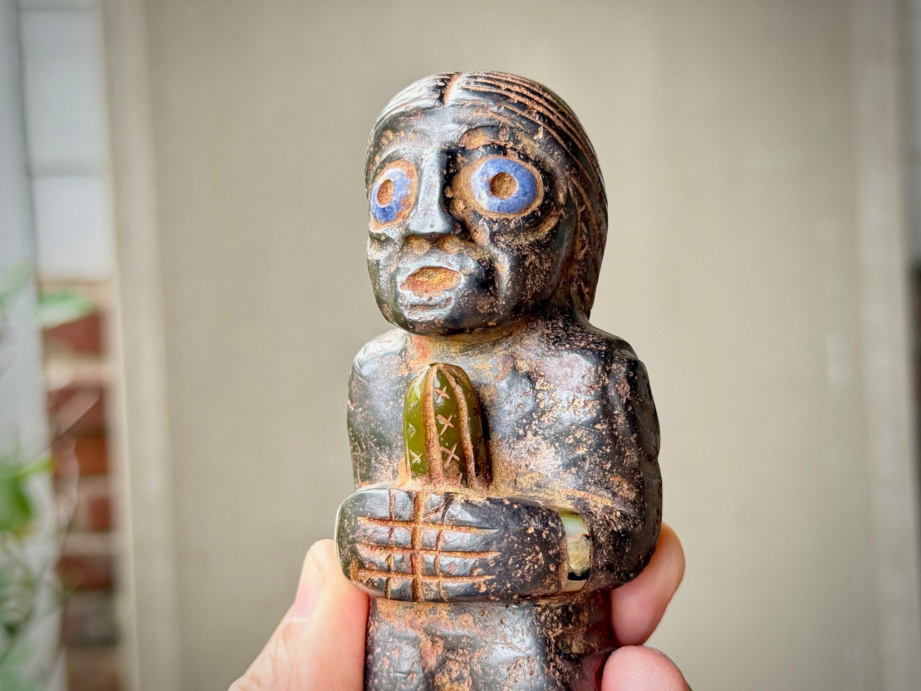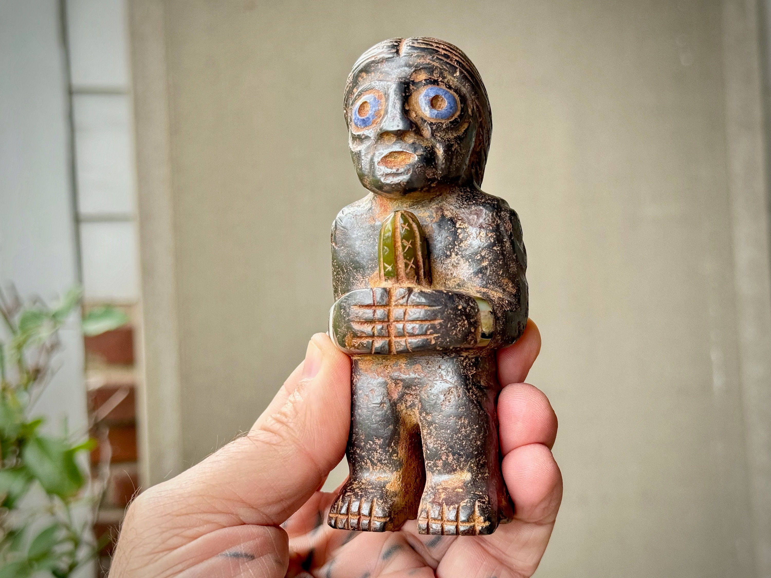 It is masterfully carved and weathered to perfection to give it an ancient patina. It is a charming and magical characterization, she really comes to life in the details here. This statue stands perfectly upright on its own natural base and would make a powerful statement piece for home, meditation room or plant medicine altar.