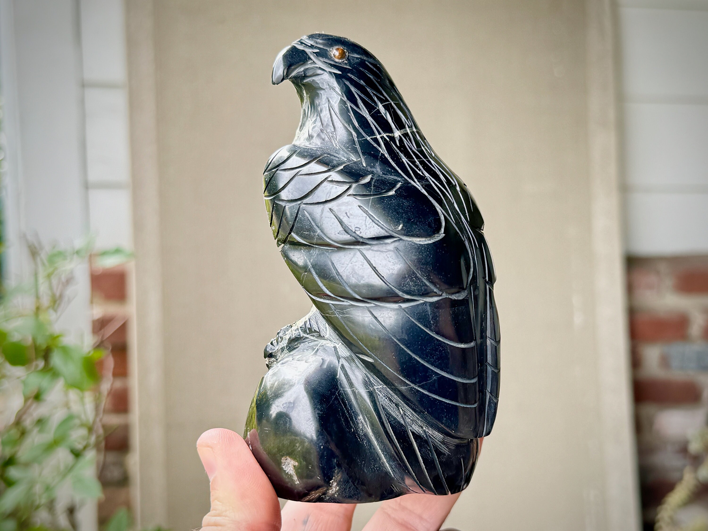 This is a truly masterful work of art, so weighty and powerful in its presence, and striking in its composition. The attention to detail is quite amazing, as we see in the eyes, where the artist used Tiger's Eye inlays. The veining on the Onyx provides wonderful contrast and the detail to this figure are remarkable.