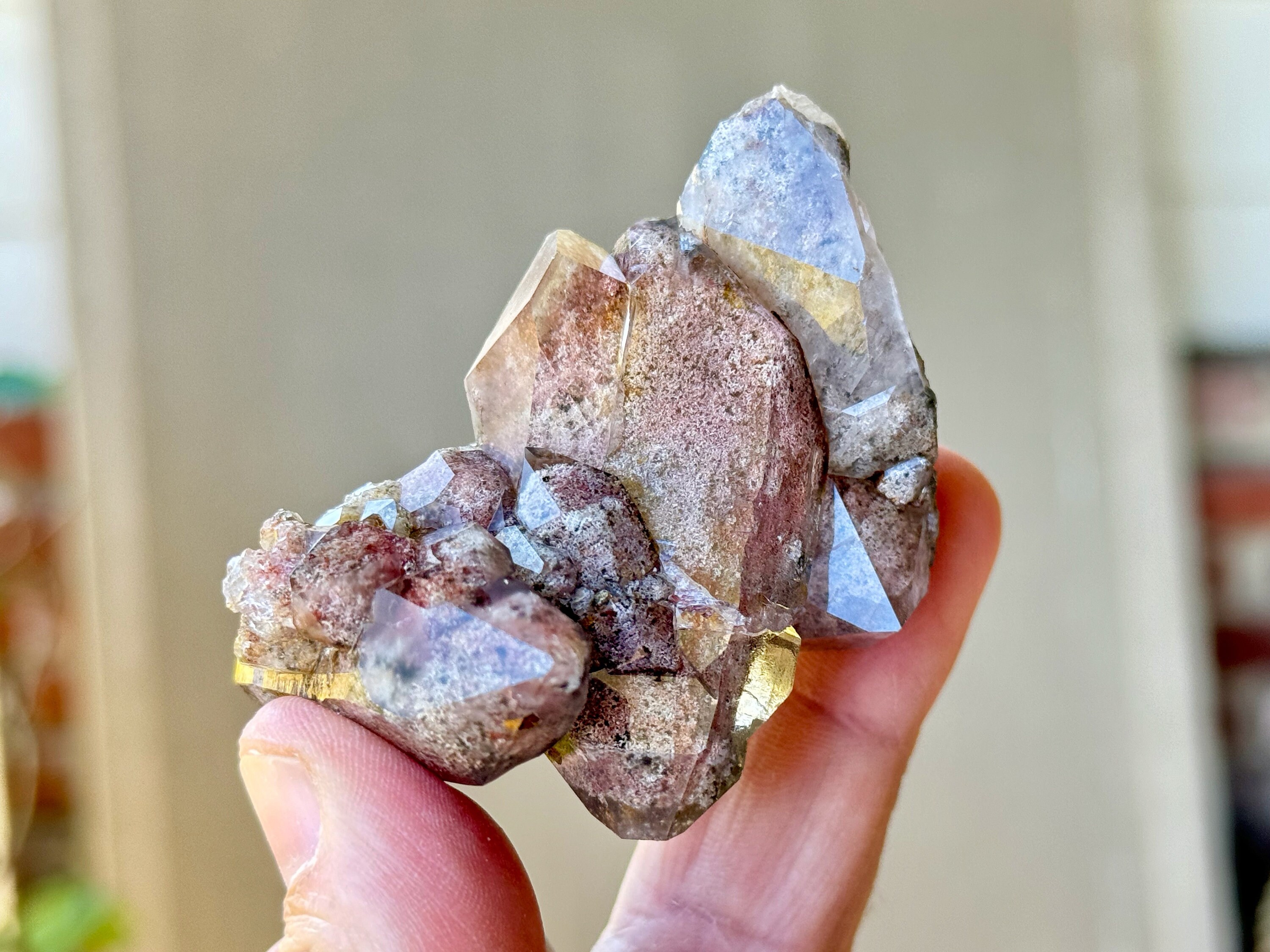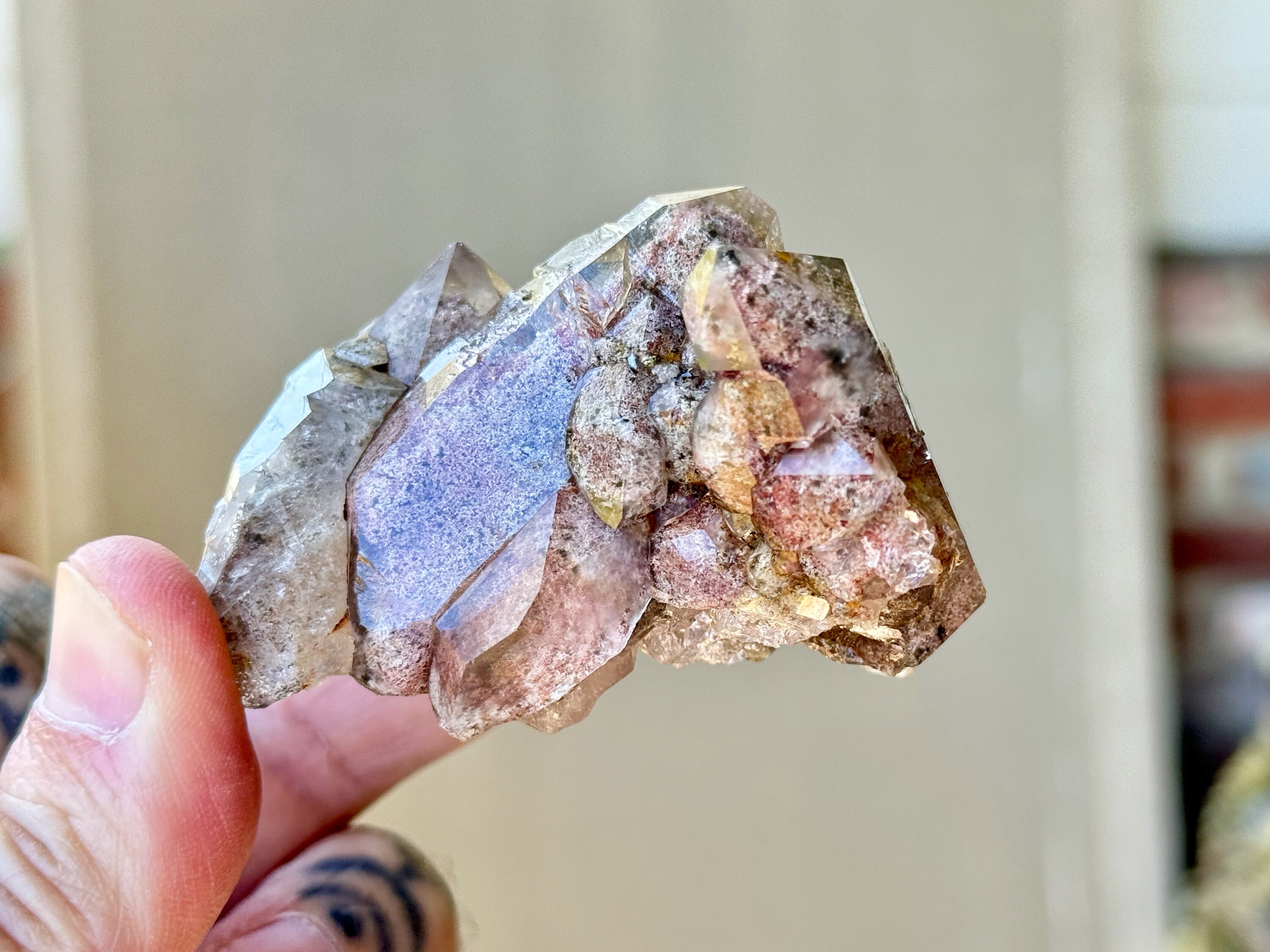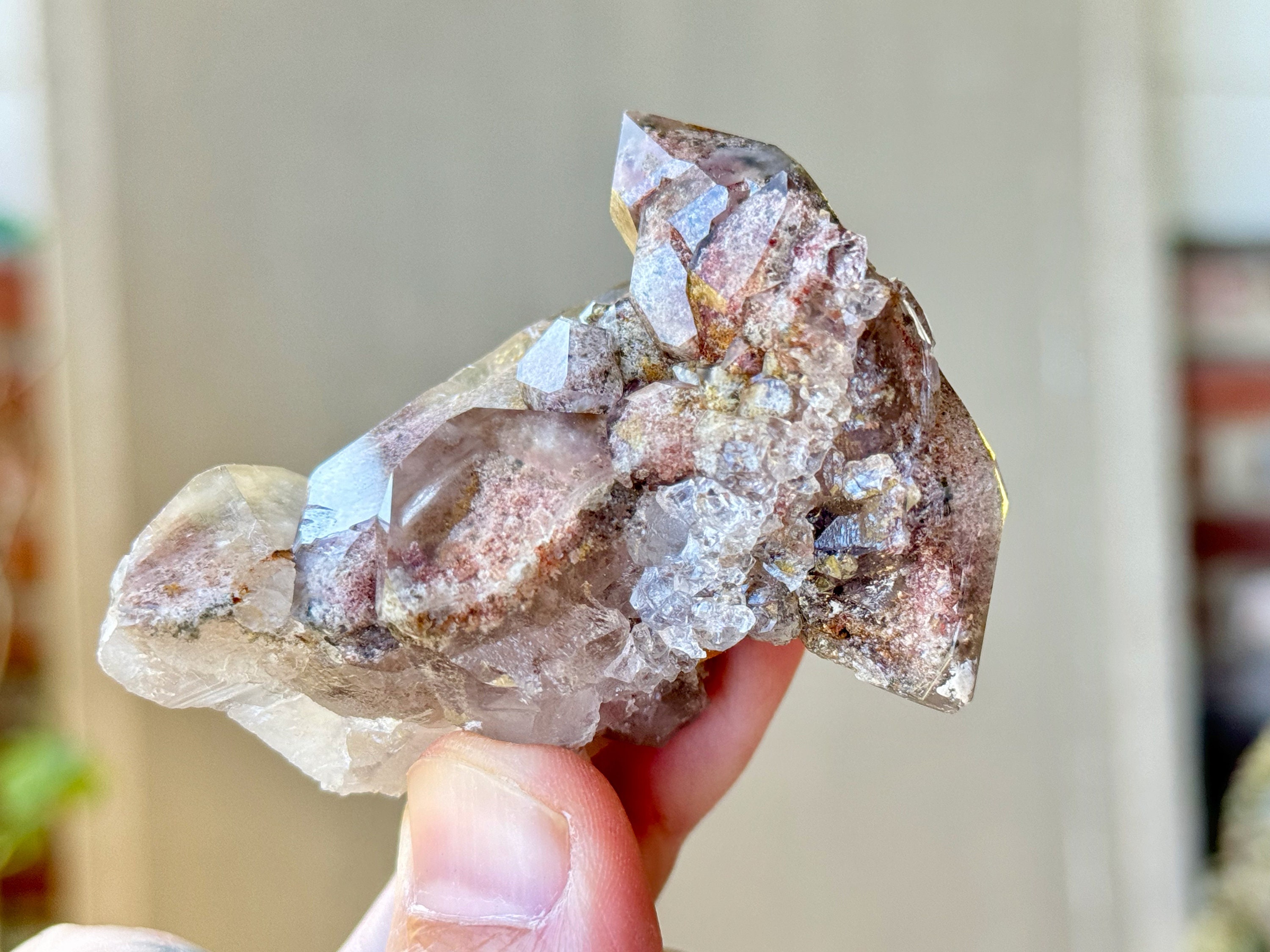 Exquisite quality and a gorgeous aesthetic presentation to this Quartz Cluster that is filled with a stunning array of colorful Lodolite inclusions, presenting in hues of pinks and grays, with specks of dark Green Chlorite as well. The clarity is wonderful, allowing us a great view at all the inclusions within.