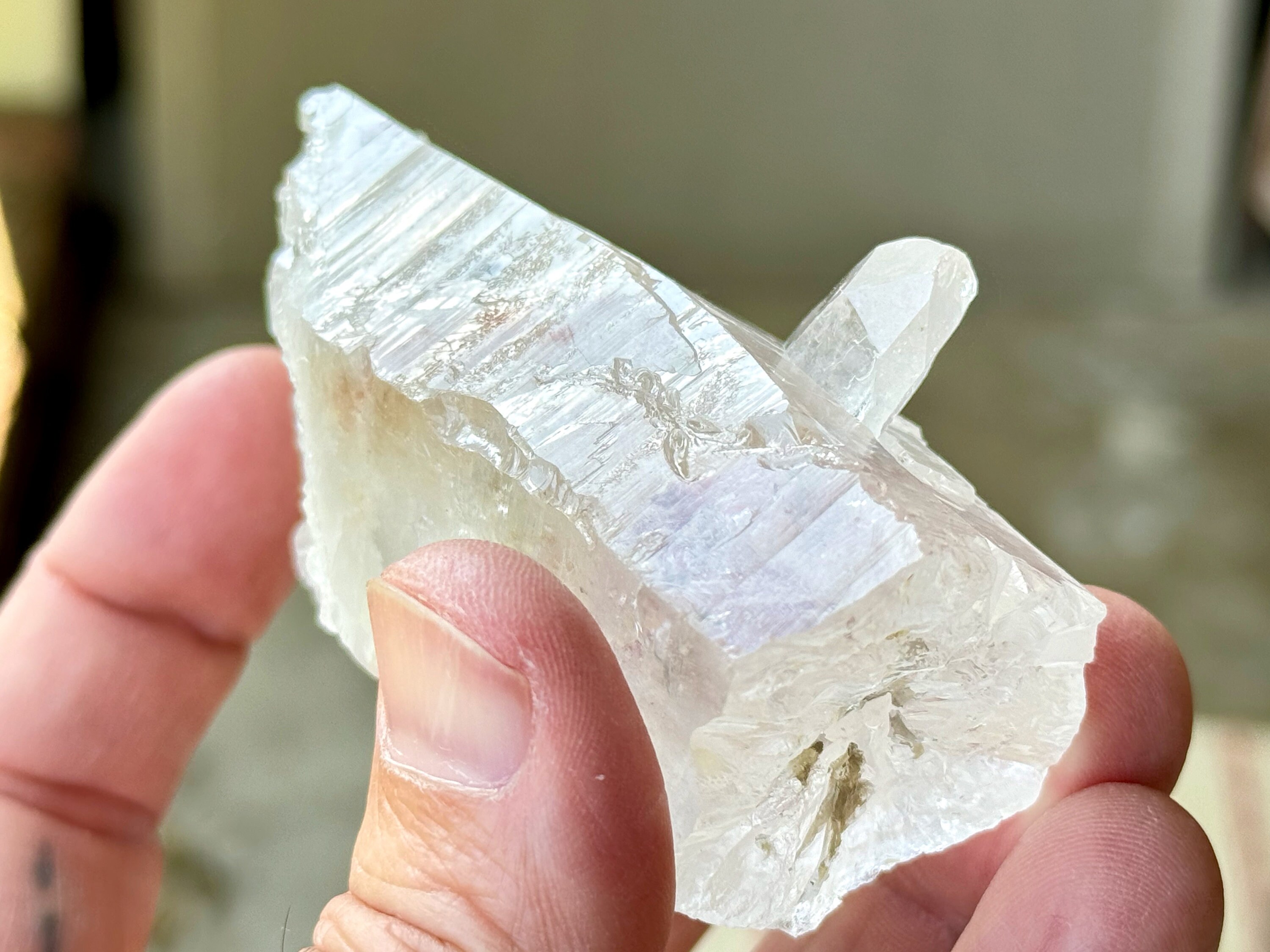 These incredibly rare and powerful crystals bear distinctive marks (typically a zig-zag pattern that runs the length of the crystal) that indicate the quartz was struck by lightning while still underground in the Earth. Some strikes will cause complete obliteration of the crystal, others will cause breakage at the termination as the lightning energy leaves the crystal, and some will leave behind this distinctive marking of the lightning's path as it traveled through the crystal. These crystals have a palpable "electric" energy (personally, my heart races when I handle them) and are prized by healers for their unique qualities, as they have an enhanced ability to receive, amplify and transmit "prana" or "chi" energy, also known as our Universal Life Force.