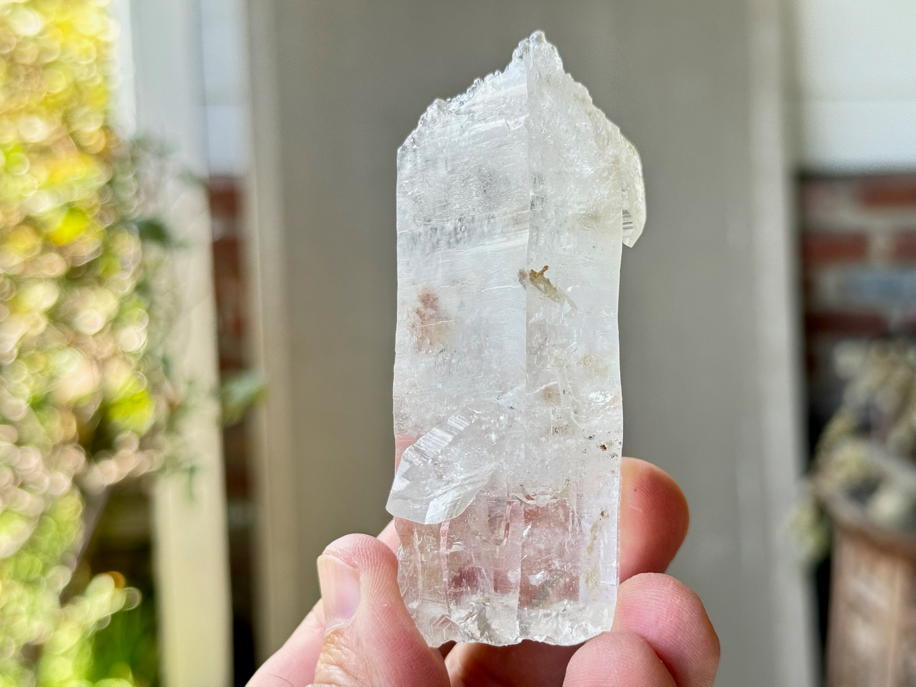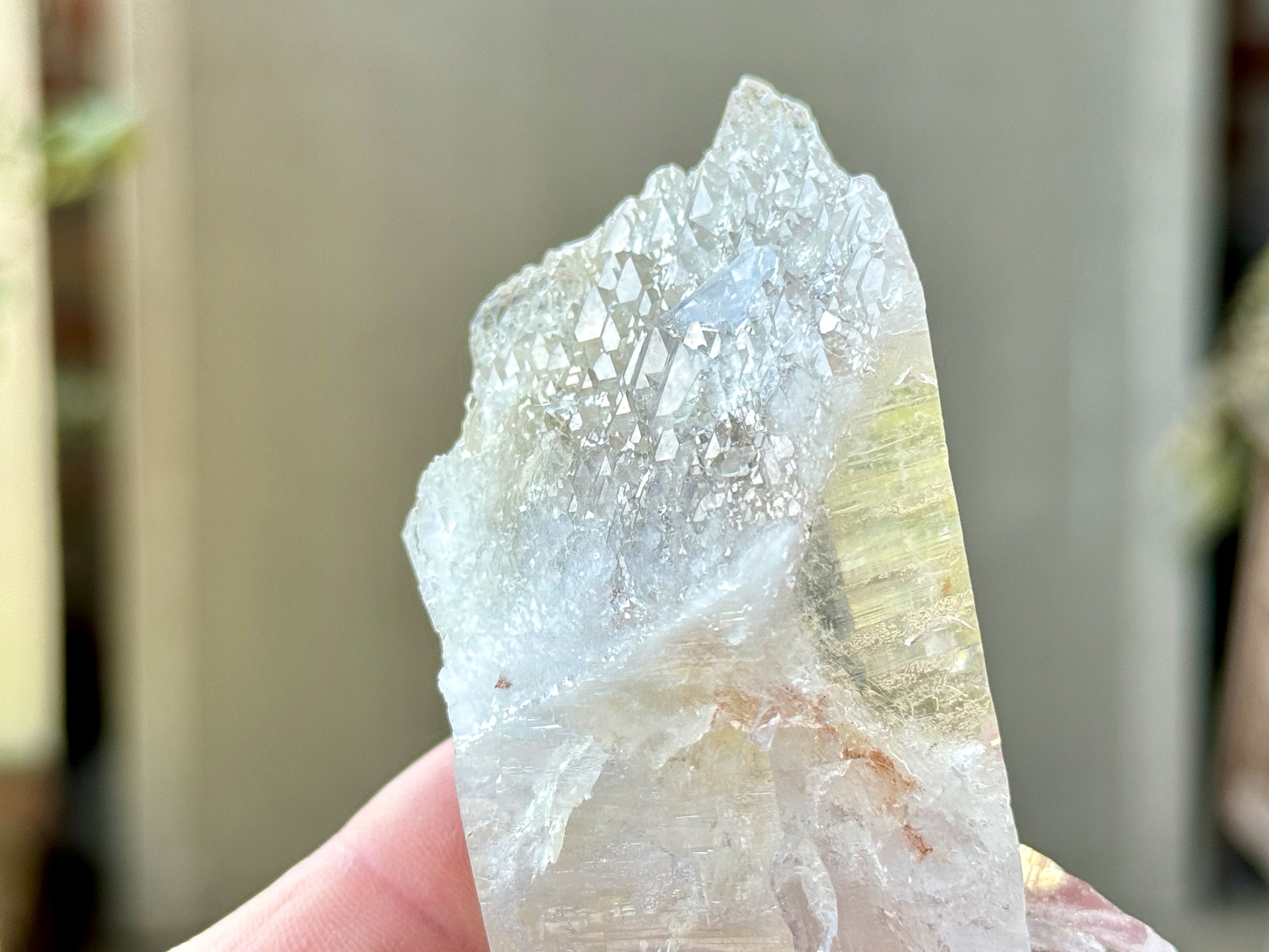 First, we must address the formation of this piece, which is just stunning. The main facet is a brilliant self-healed, Elestial formation, with dozens upon dozens of individual pyramidal facets that sparkle in the light. The body of this crystal features a unique curvature, which indicates where at some point this crystal broke while still in the pocket of the earth due to shifting tectonic plates and managed to heal itself (see more on this formation below). Finally, right around this curved area, this crystal features a prominent "penetrator" crystal growing out from the primary crystal (see more on this formation below).