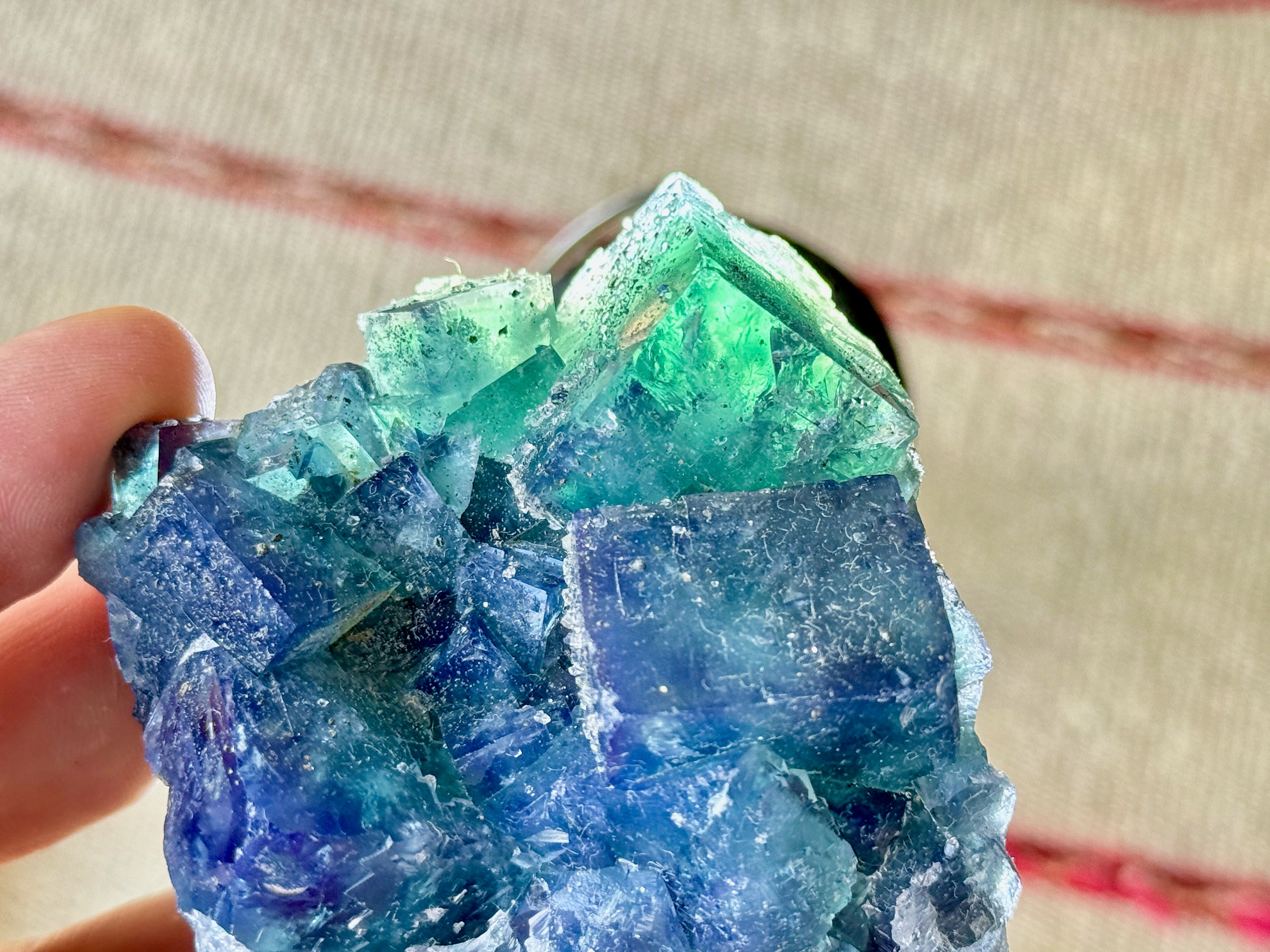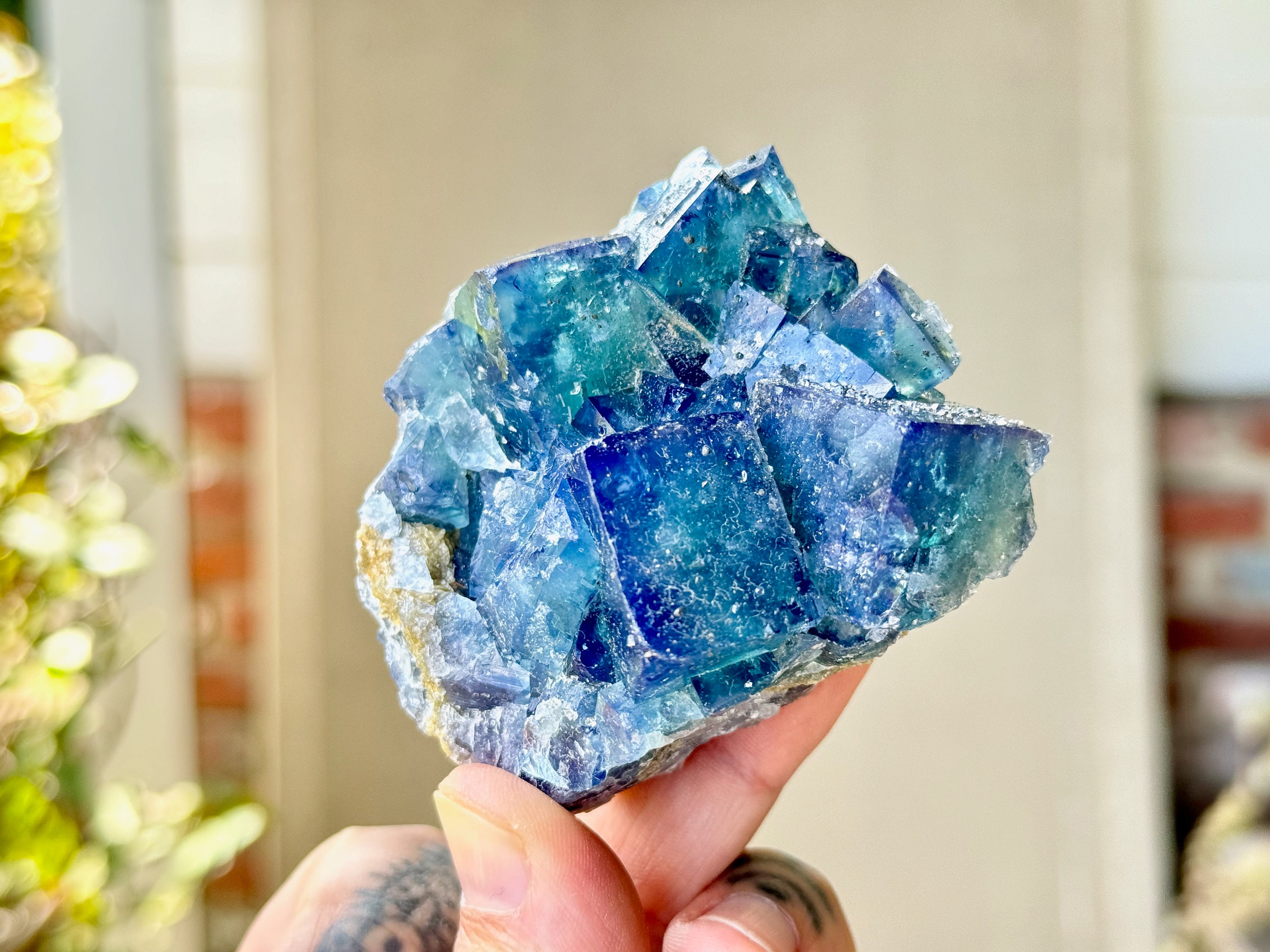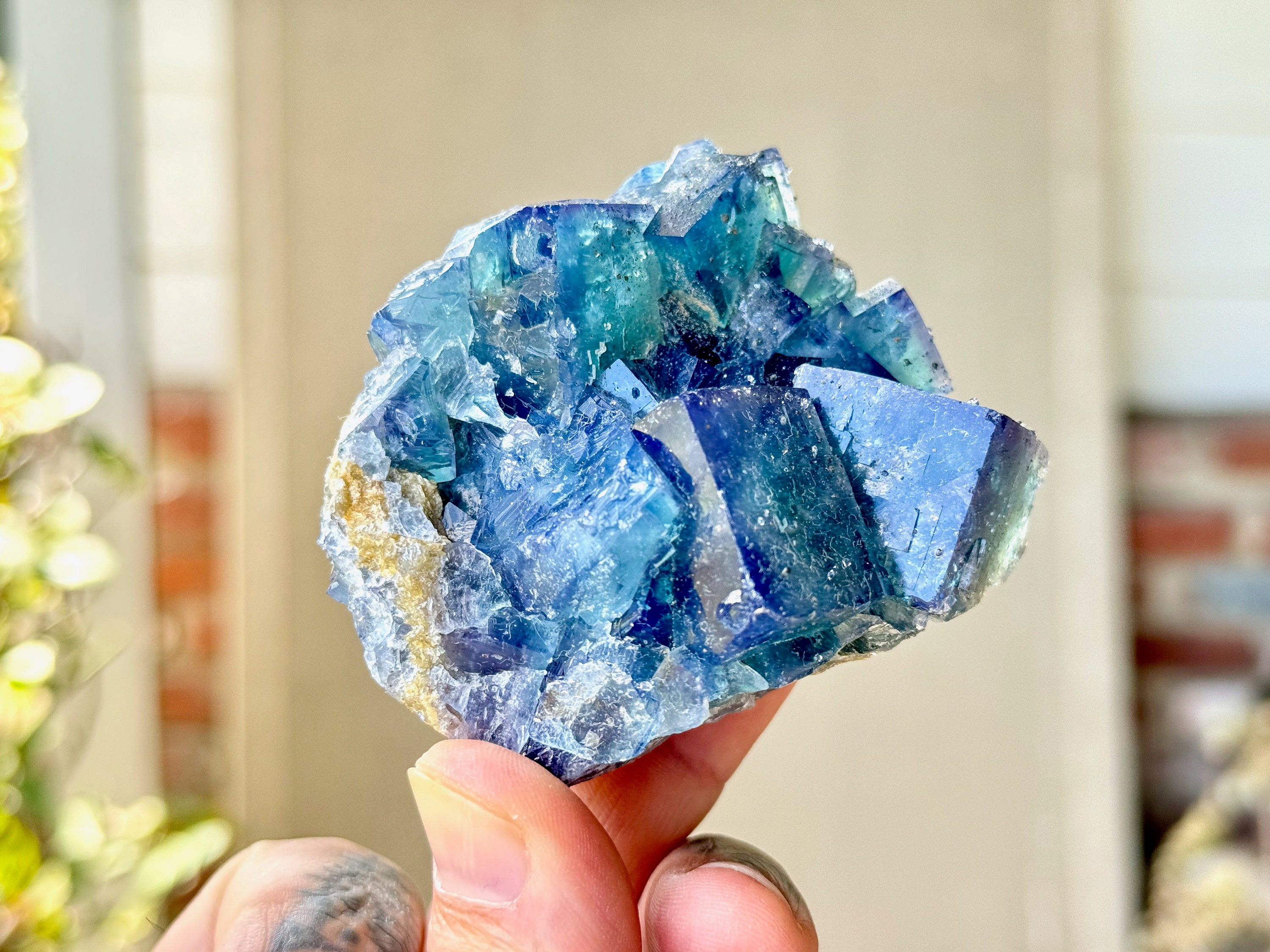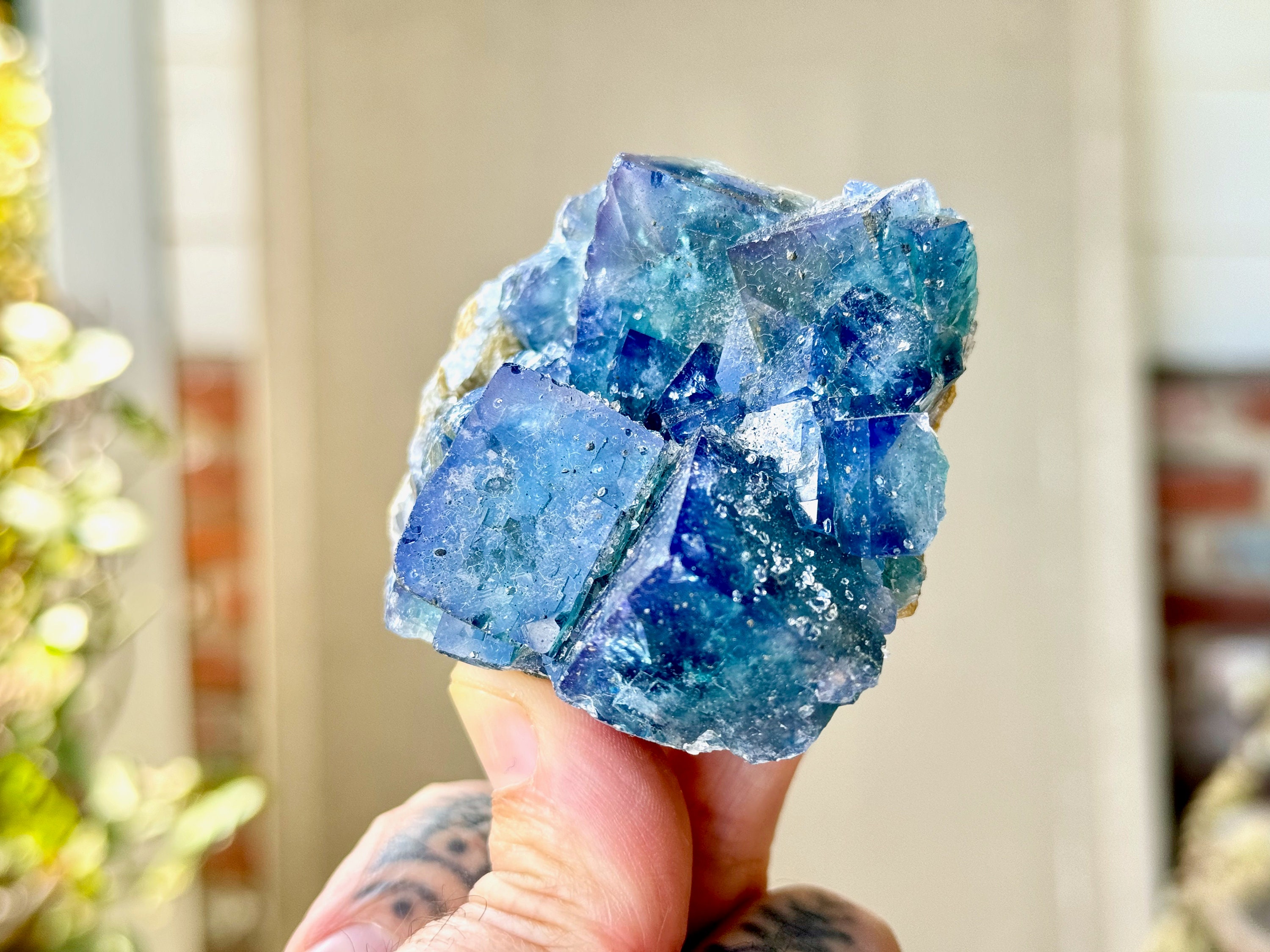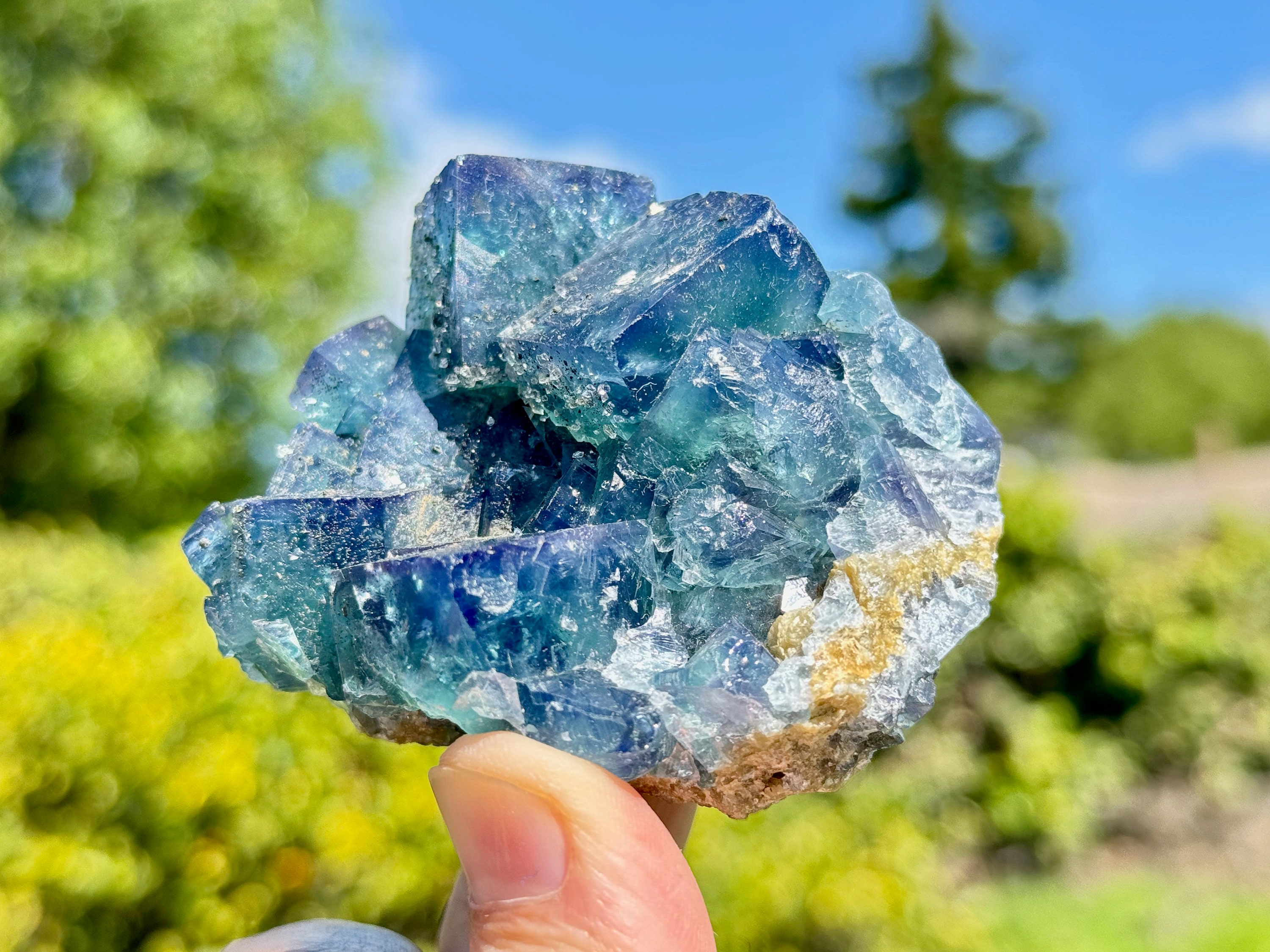 **PLEASE NOTE we've included photos that were taken in 1) partially shaded outdoor lighting 2) natural direct sunlight 3) backlighting to show off their translucency and hues and 4) with direct UV light to show their UV reactivity. We've done our best to faithfully represent these unique crystals in a variety of light environments. Please be aware that these Fluorites can appear differently depending on the environment in which you are enjoying them.