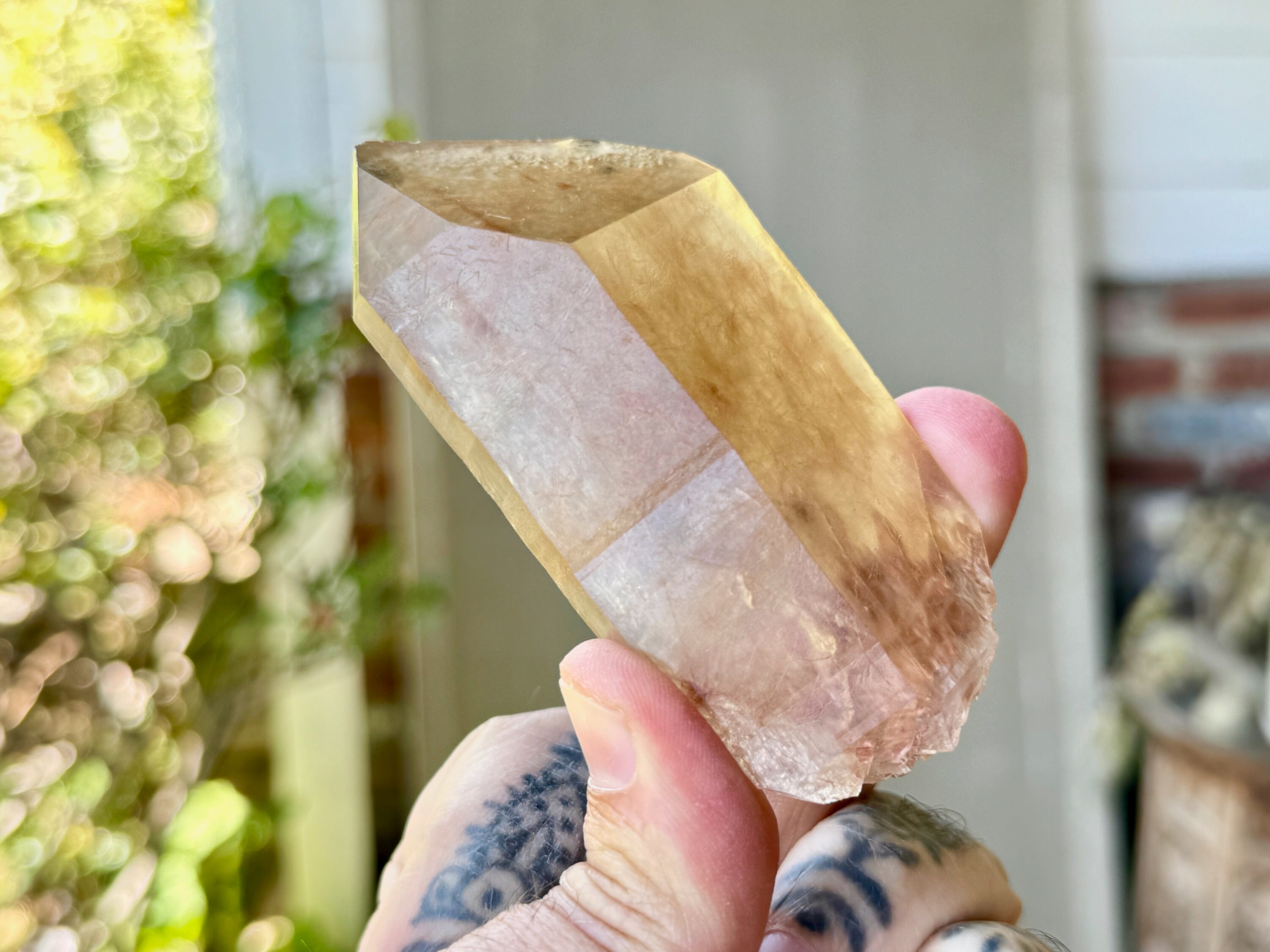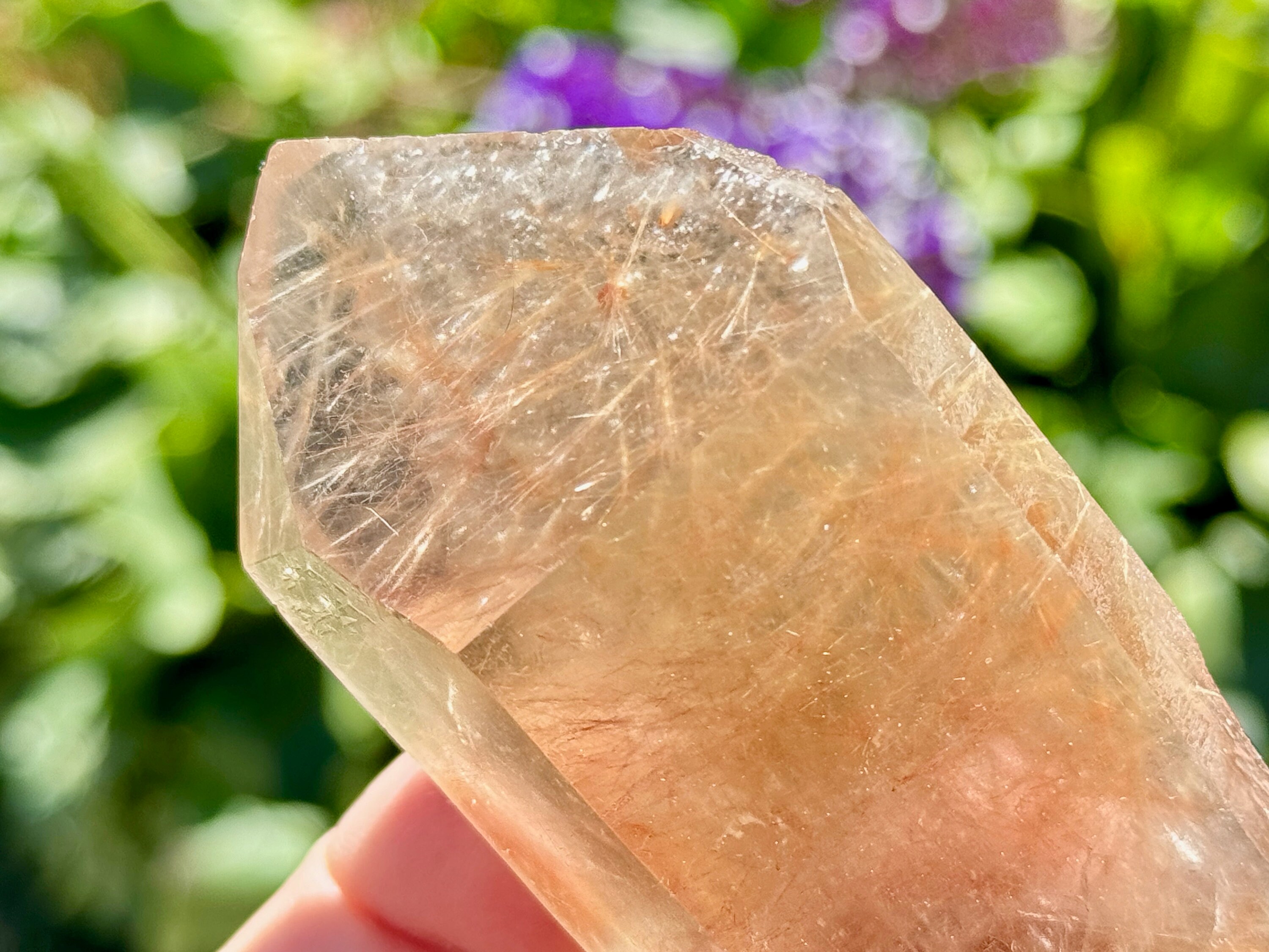 The backside is a contact area and here's where we can see many of these golden inclusions protruding on the exterior. The main facet of this piece is broad and lustrous and the termination is excellent. Beautiful!