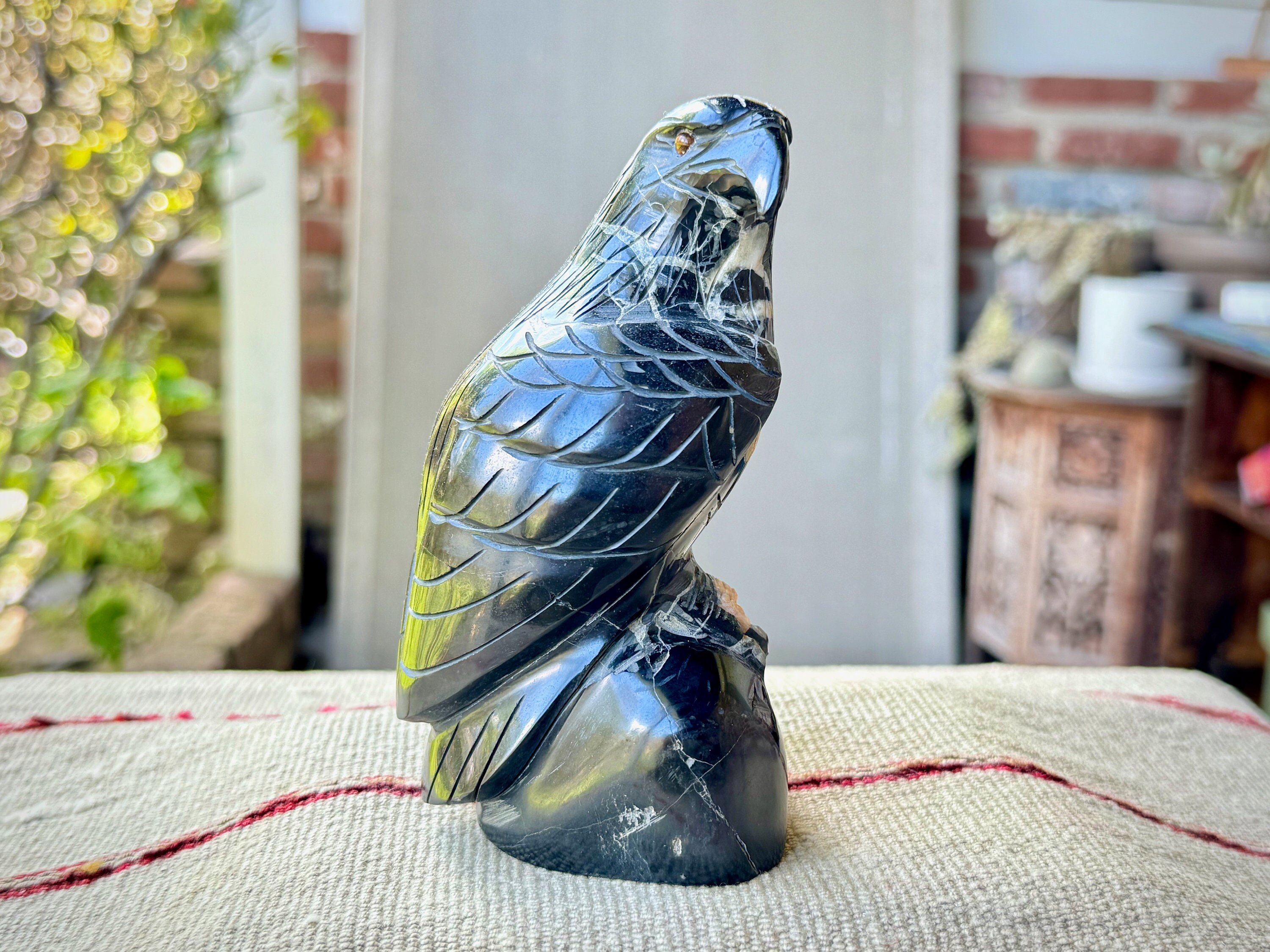 It is truly a museum-grade work of art that is actually very reminiscent of the "Maltese Falcon." It stands perfectly on its own naturally flat base for display. Majestic, powerful and completely magical.
